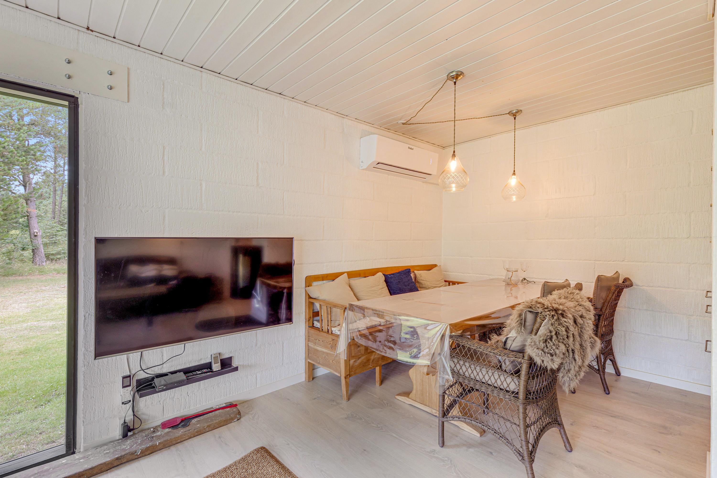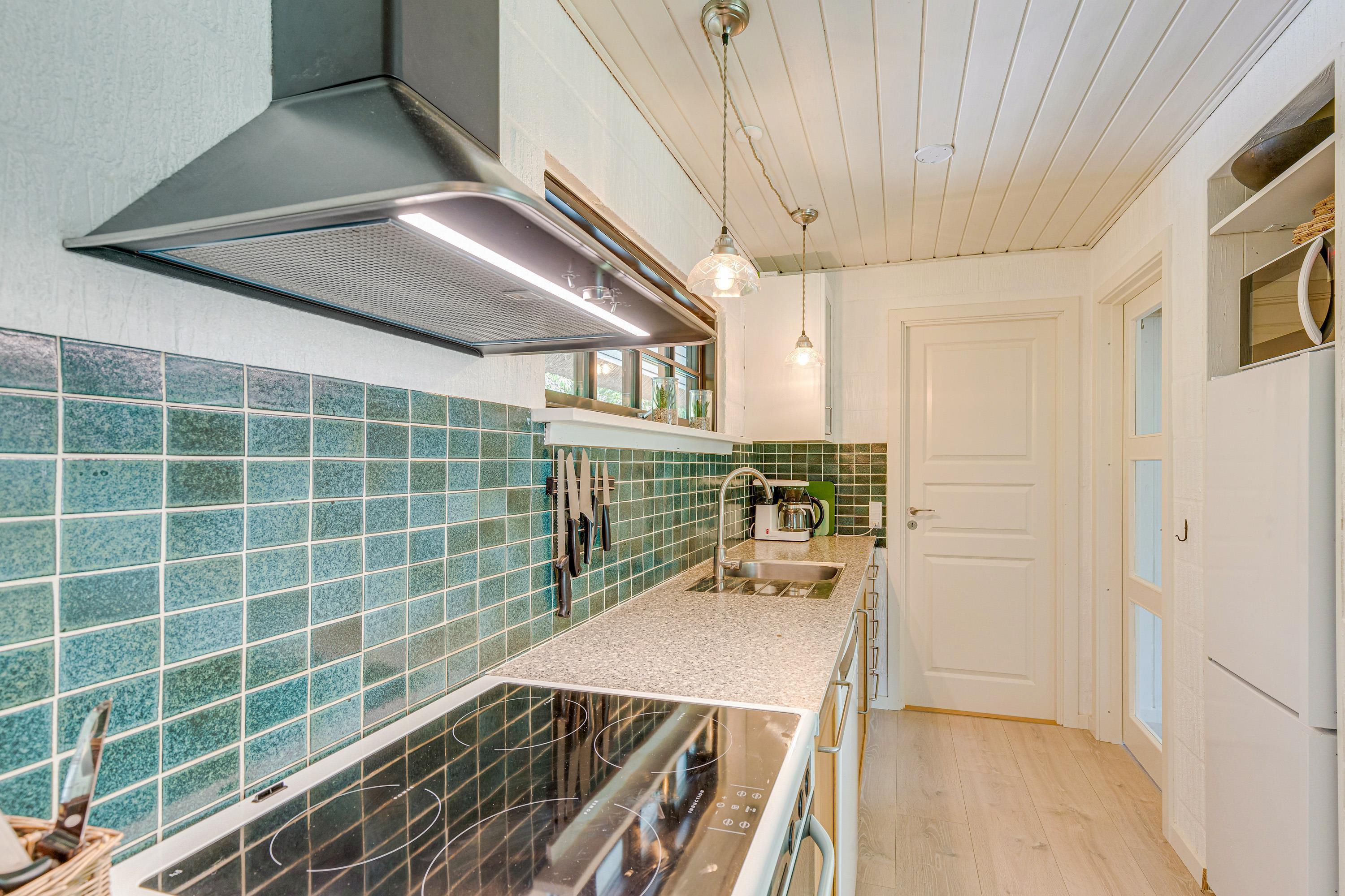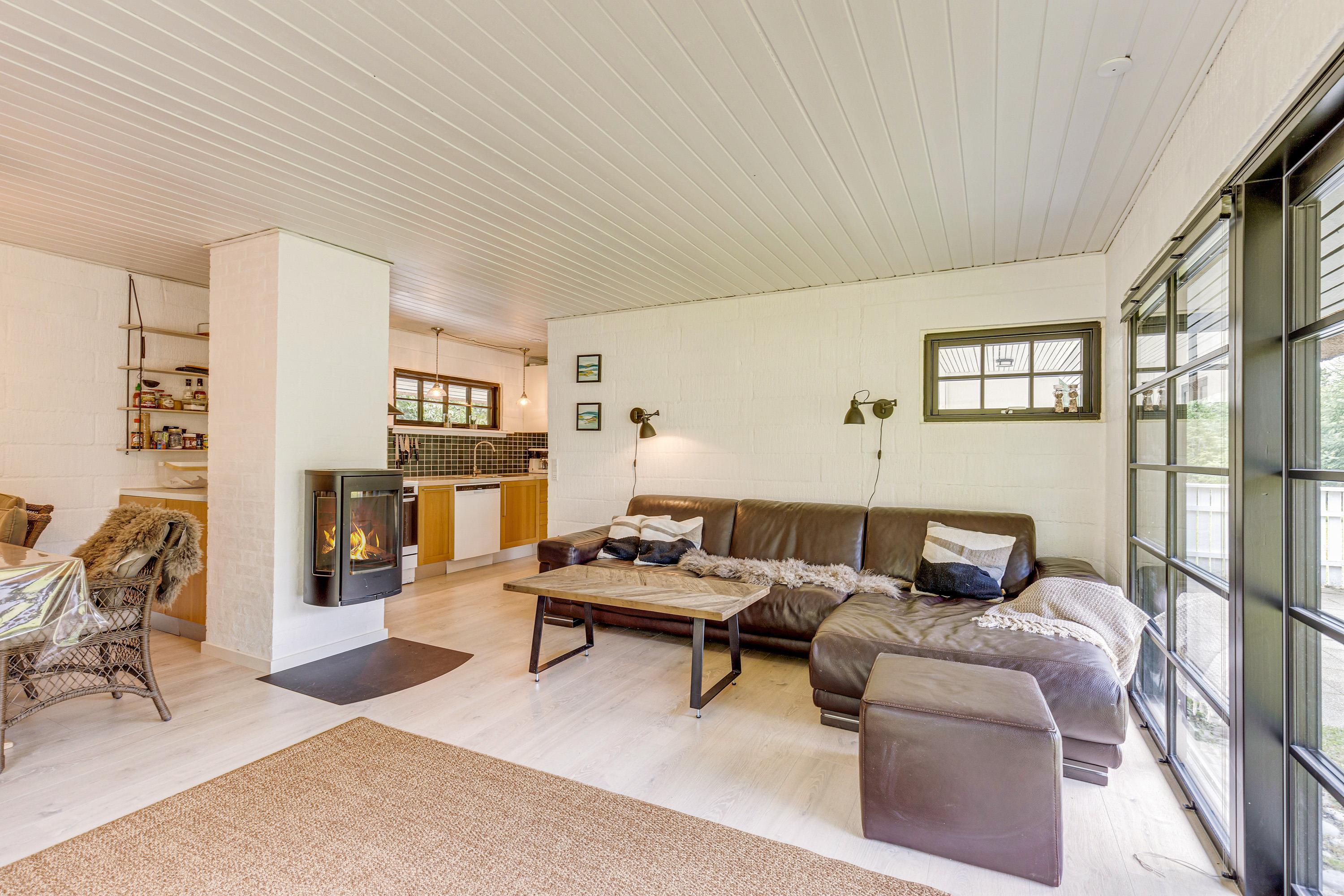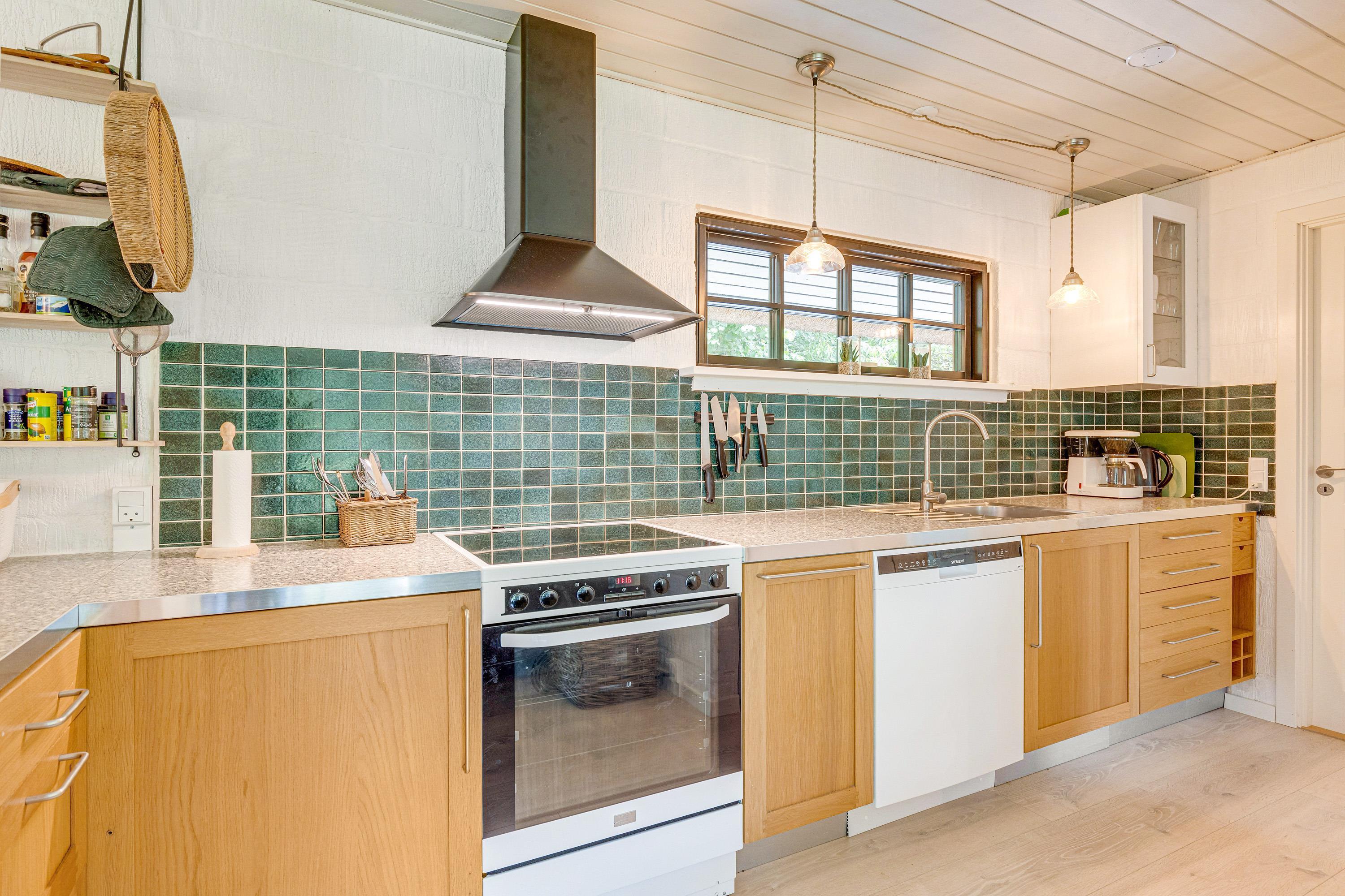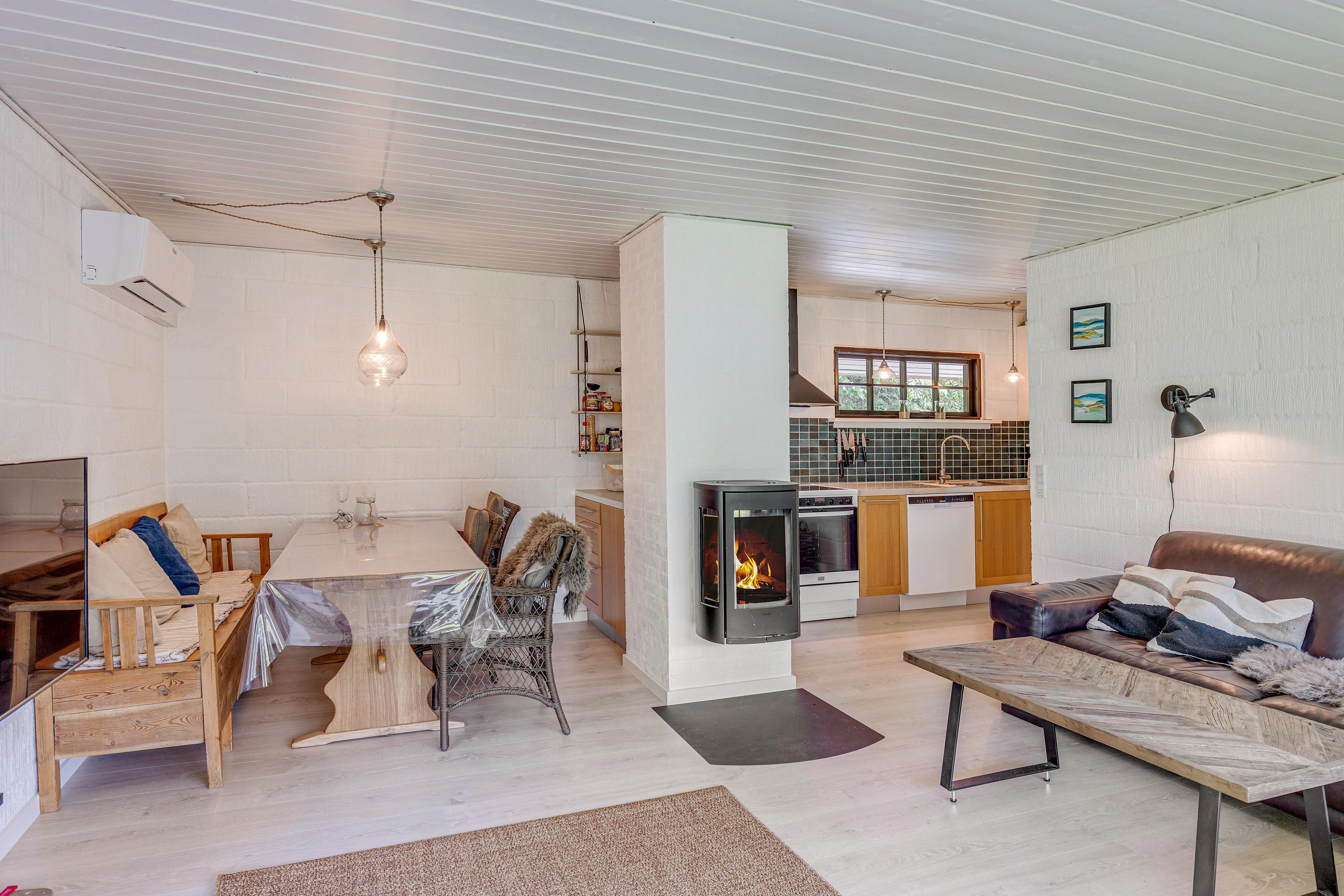 Indenfor i sommerhuset møder I en skøn blanding af klassisk charme og moderne bekvemmeligheder, der udgør det perfekte udgangspunkt for en afslappende ferie. Midtpunktet i huset er et lyst og indbydende køkkenalrum, hvor I kan tilberede måltider og nyde samværet med hinanden. Køkkenet er udstyret med en opvaskemaskine, der gør det let at holde orden. En hyggelig stue med en brændeovn skaber en varm atmosfære til afslappende aftener.