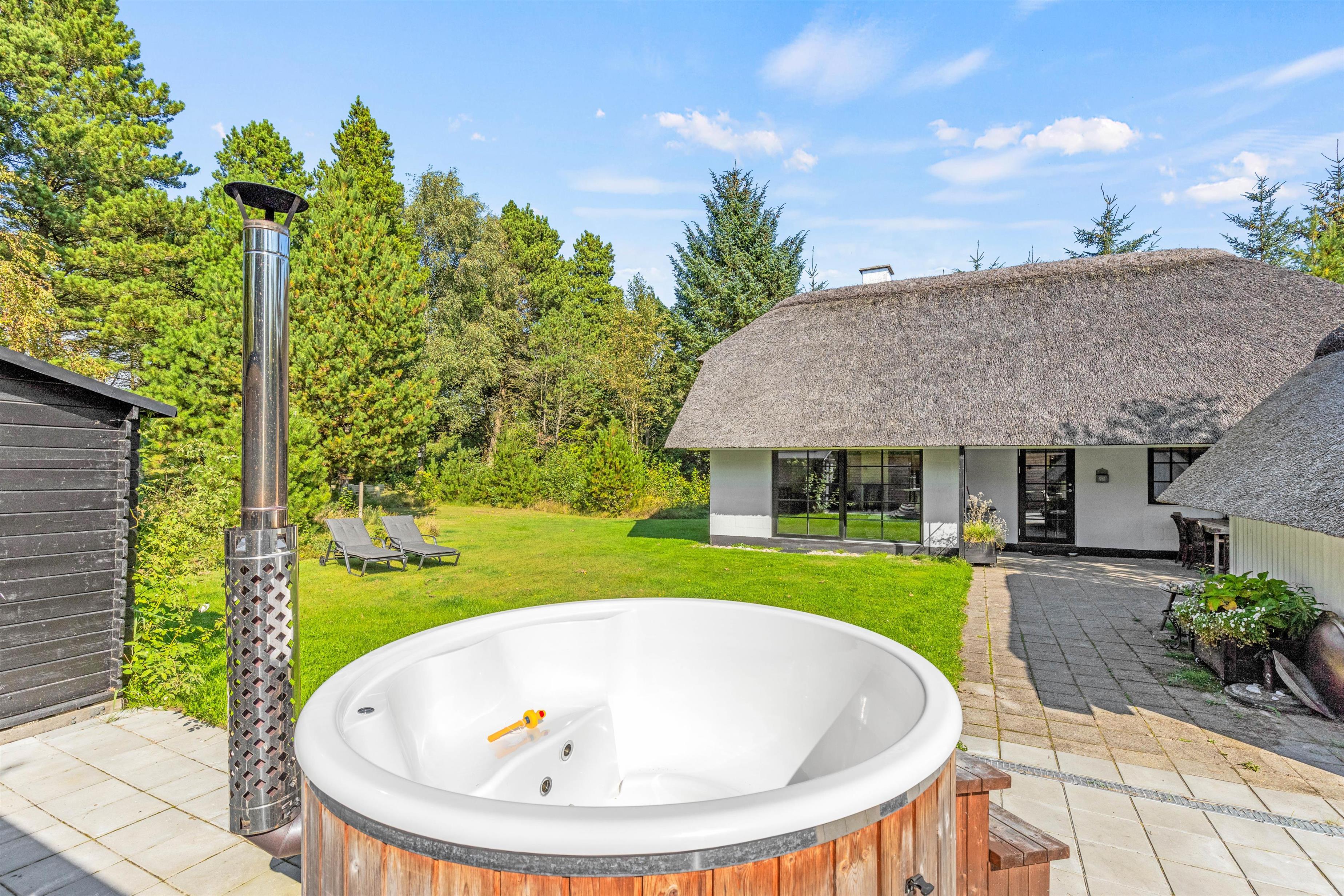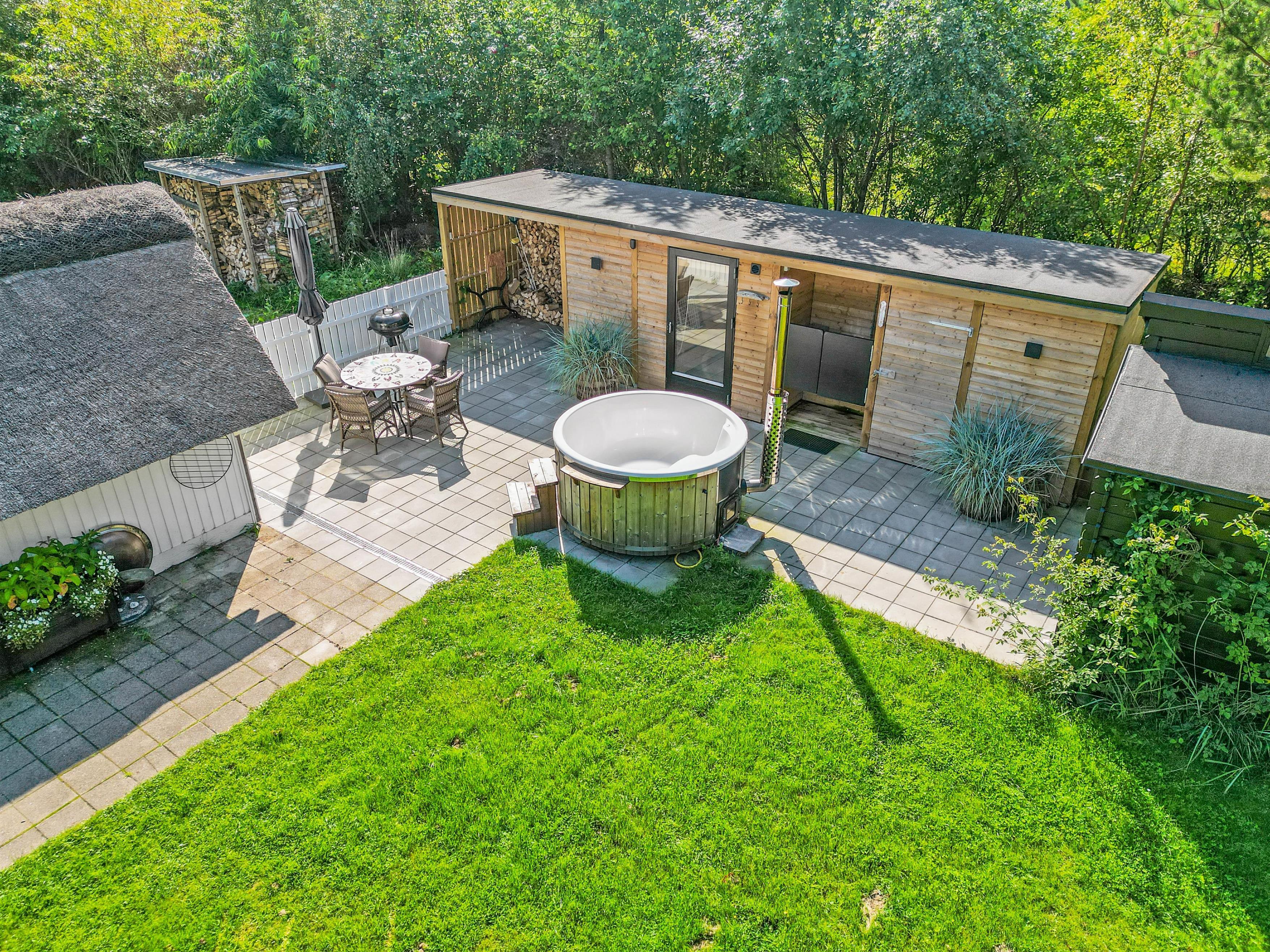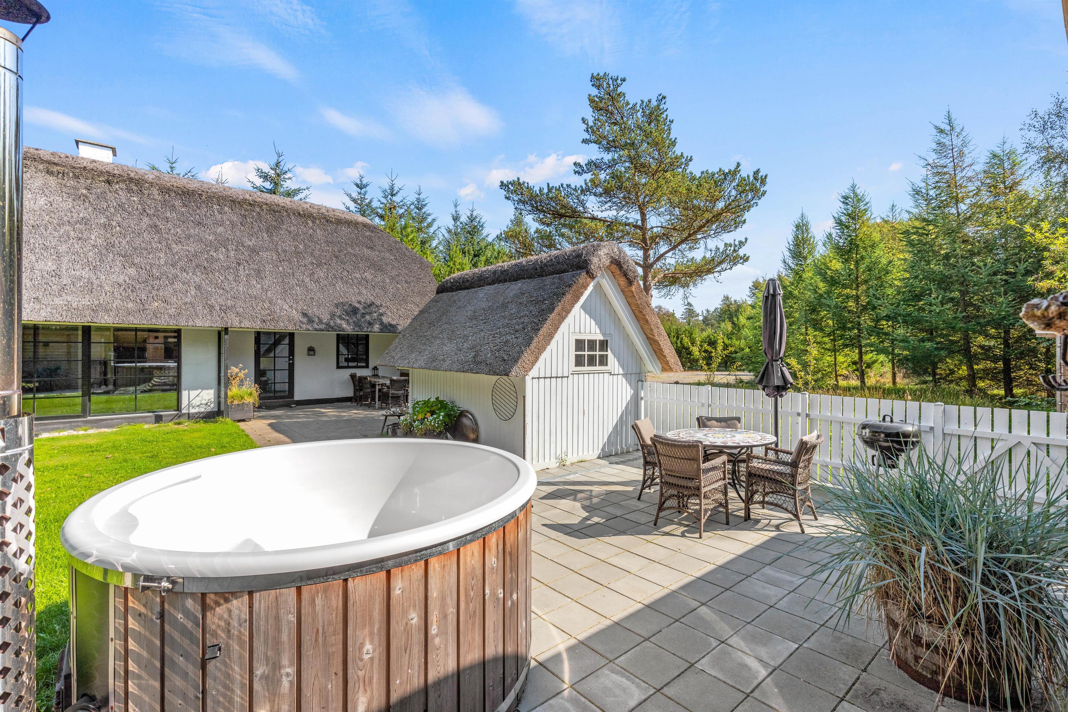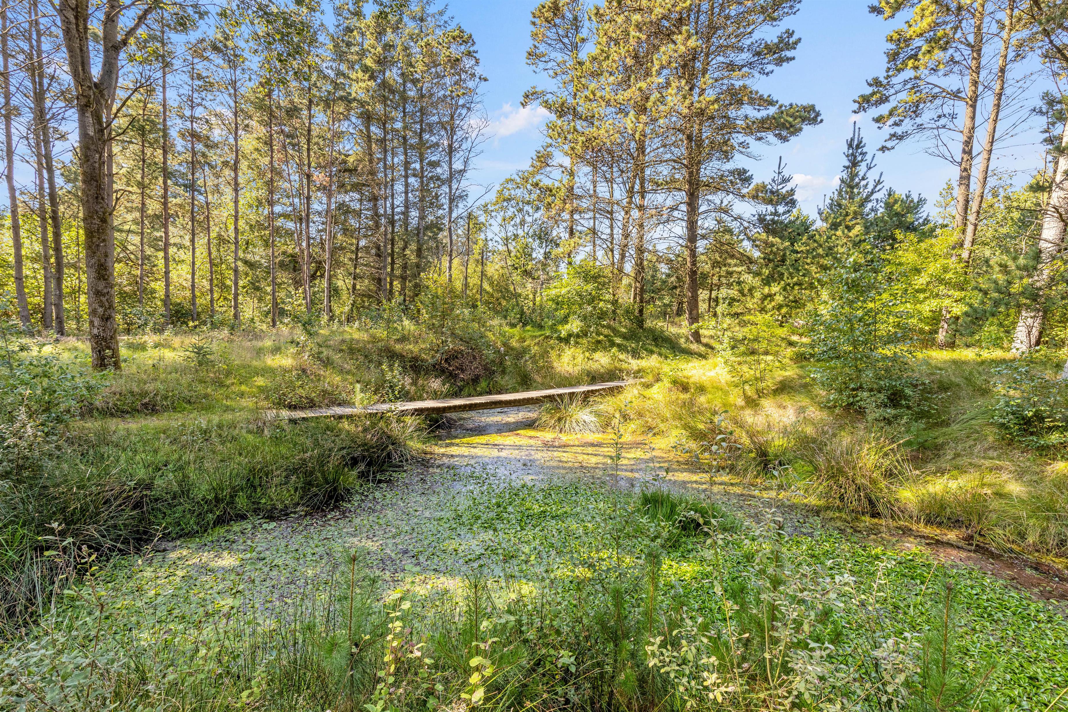 Den store grund sætter rammerne for en ferie midt i den fantastiske natur. De mange hyggekroge og de høje træer, der vokser rundt omkring på grunden, giver jer følelsen af at bo midt i skoven i helt eventyrlige omgivelser. Nyd fuglenes sang og duften af den friske natur, mens I slikker sol på terrassen og ser børnene lege. En del af den skønne terrasse er overdækket, så det er naturligvis også muligt at finde en skyggeplads her eller under de store træer. Til jeres bedste, firbenede ven er der et stykke af grunden ved vandhullet, der er indhegnet.