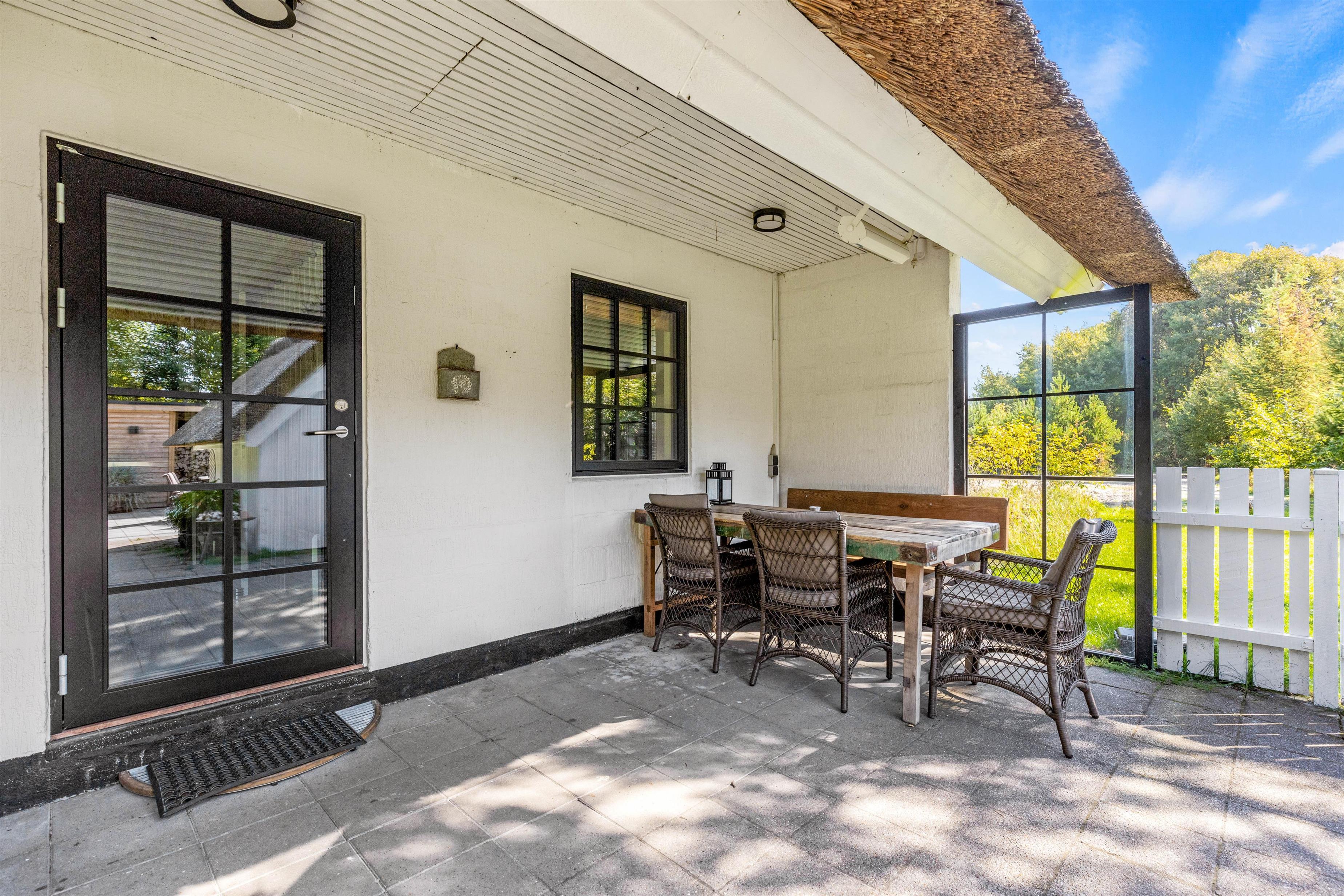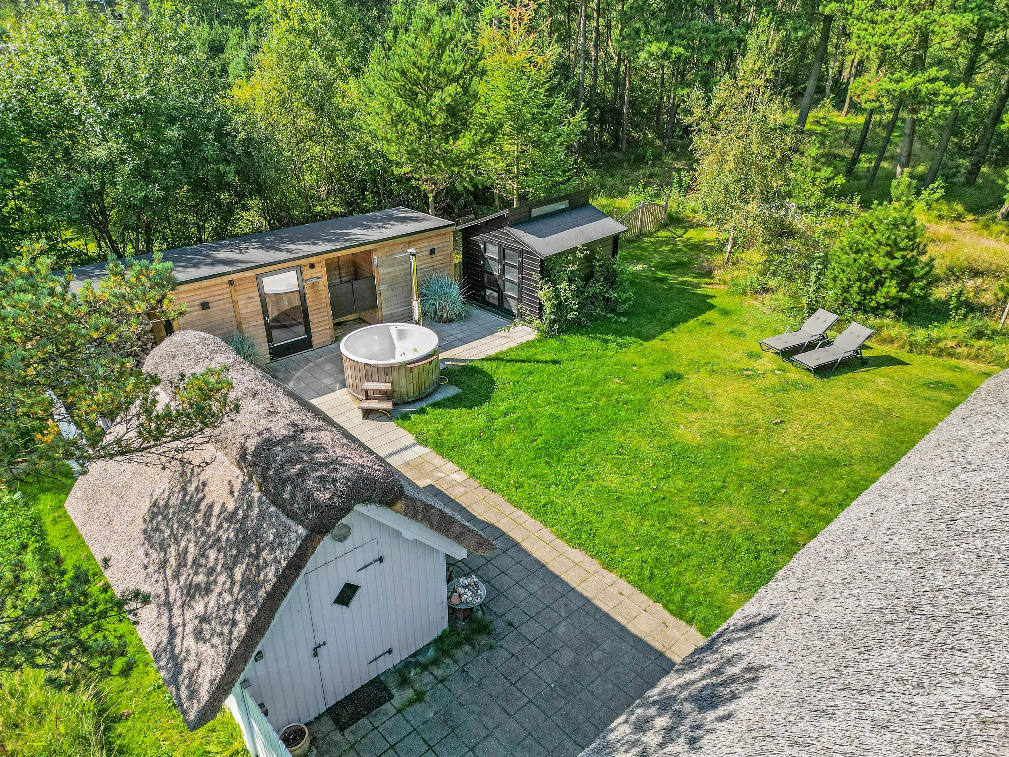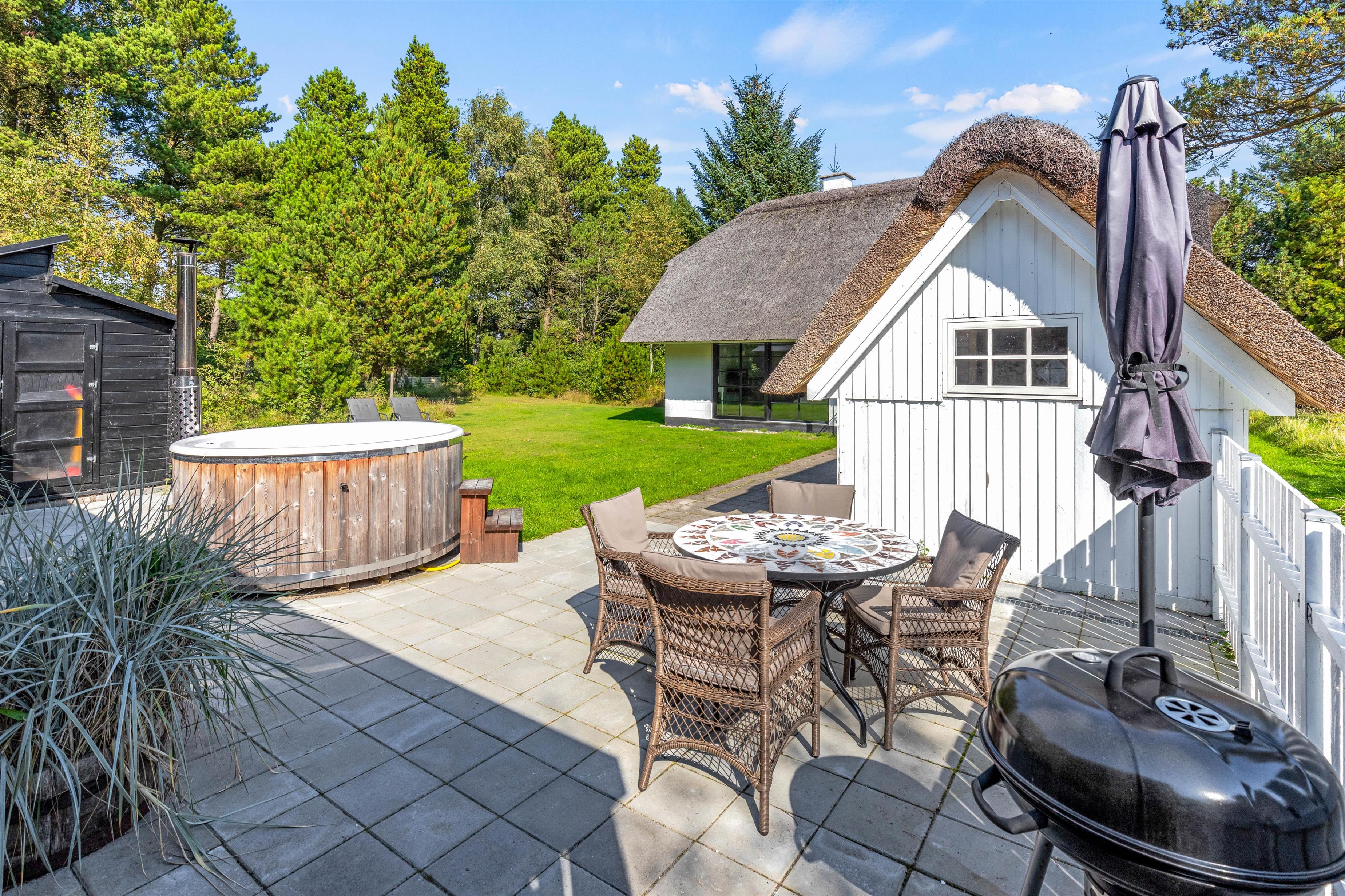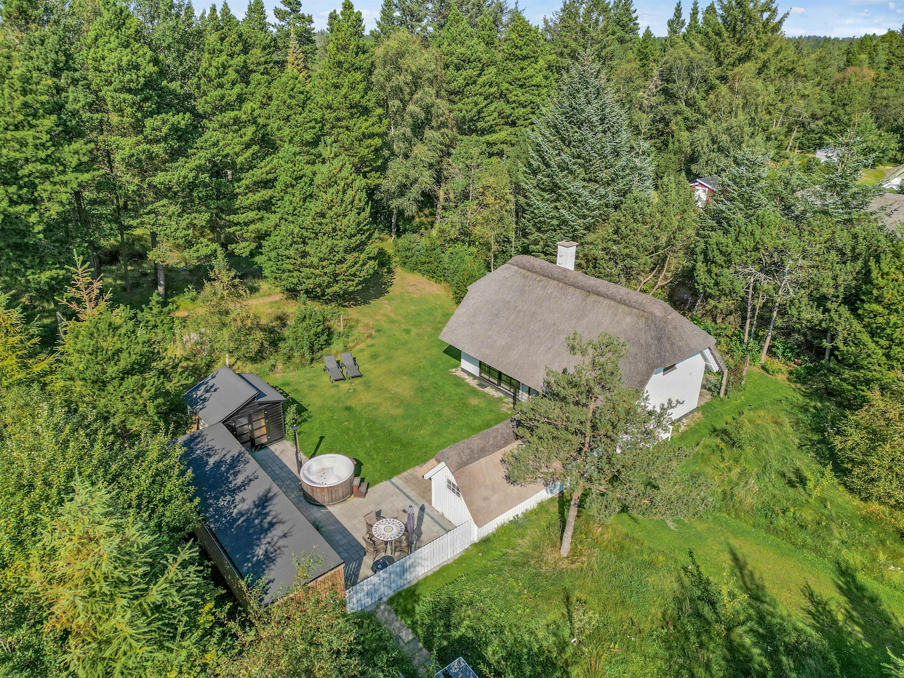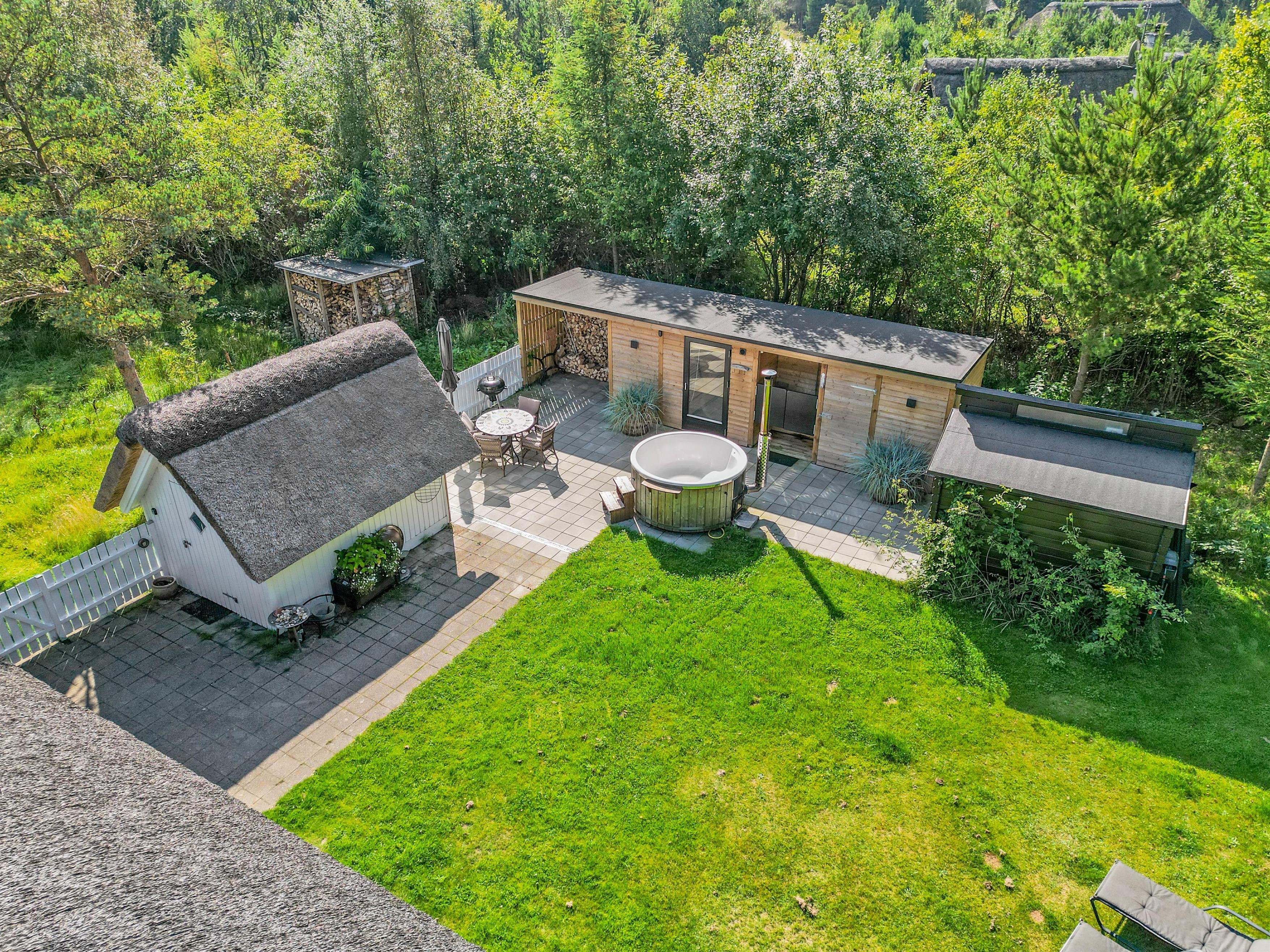 Den store grund sætter rammerne for en ferie midt i den fantastiske natur. De mange hyggekroge og de høje træer, der vokser rundt omkring på grunden, giver jer følelsen af at bo midt i skoven i helt eventyrlige omgivelser. Nyd fuglenes sang og duften af den friske natur, mens I slikker sol på terrassen og ser børnene lege. En del af den skønne terrasse er overdækket, så det er naturligvis også muligt at finde en skyggeplads her eller under de store træer. Til jeres bedste, firbenede ven er der et stykke af grunden ved vandhullet, der er indhegnet.