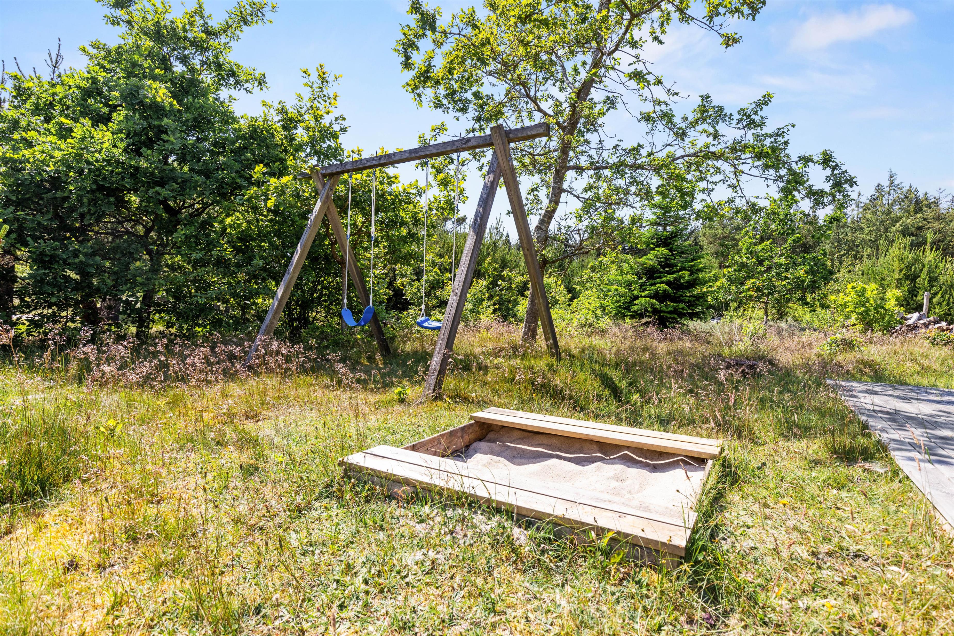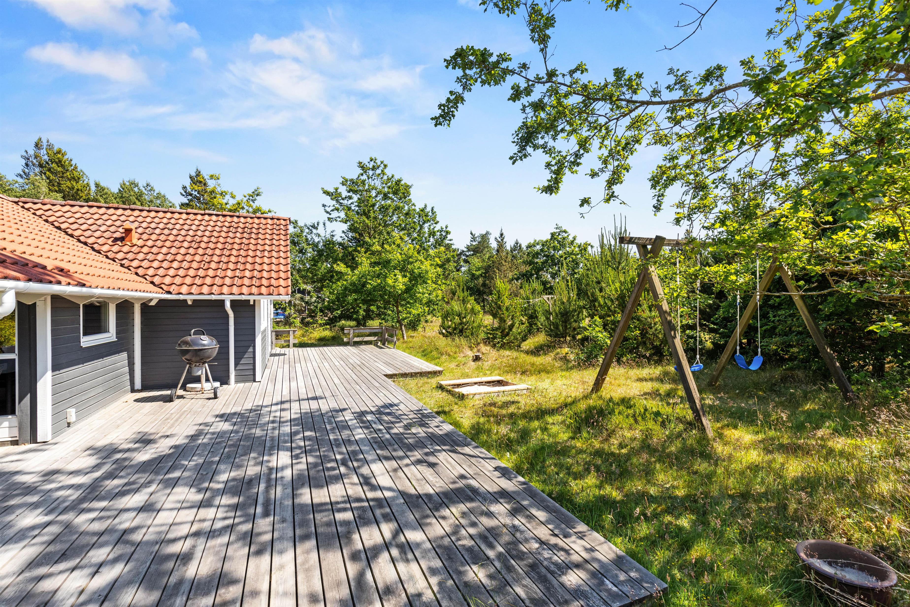 Sommerhuset ligger på en skøn, bevokset naturgrund direkte ved skoven. På den store træterrasse kan I smide fødderne opad i liggestolene, mens børnene leger i græsset, gynger eller bygger sandslotte i sandkassen.