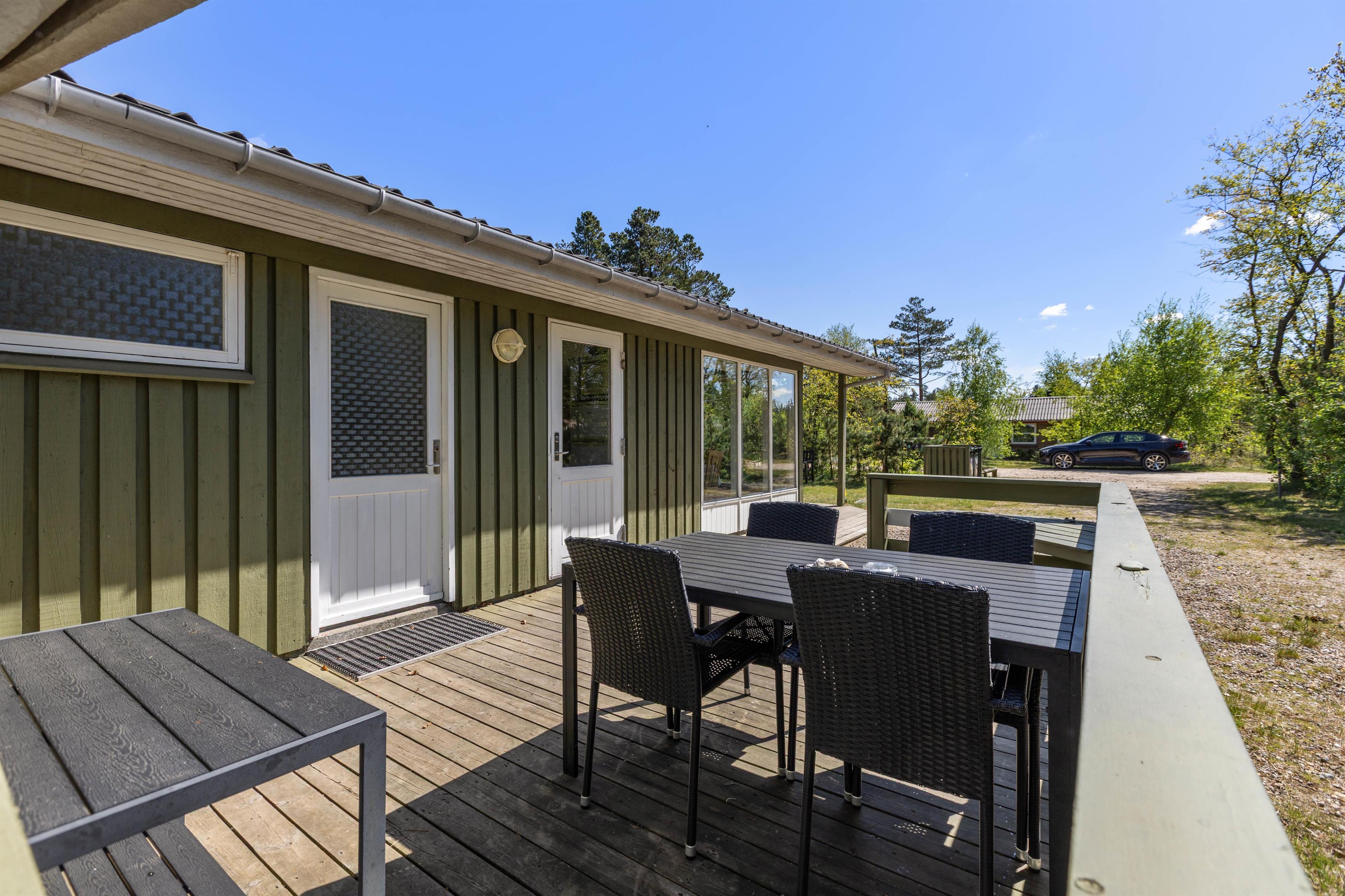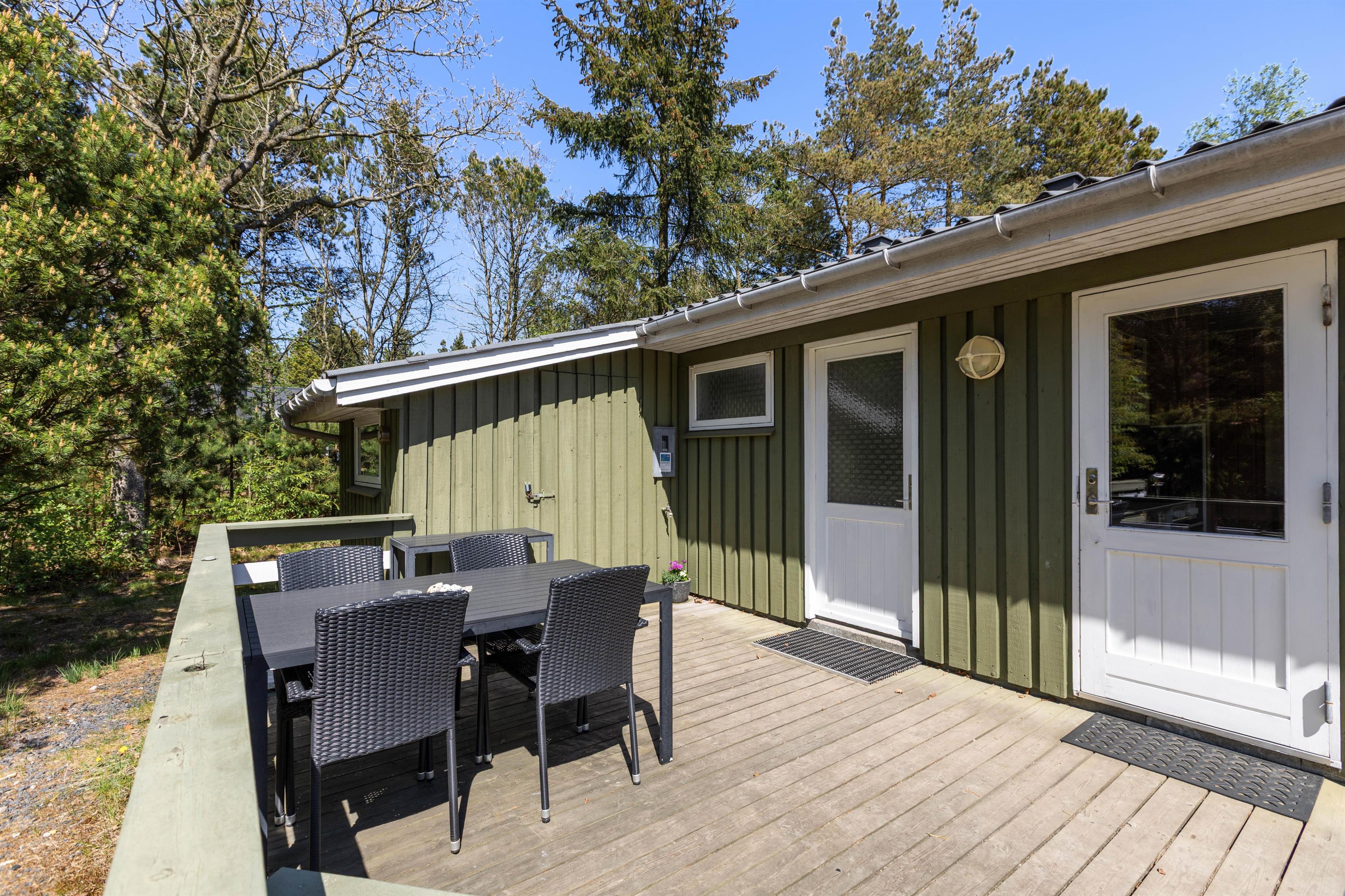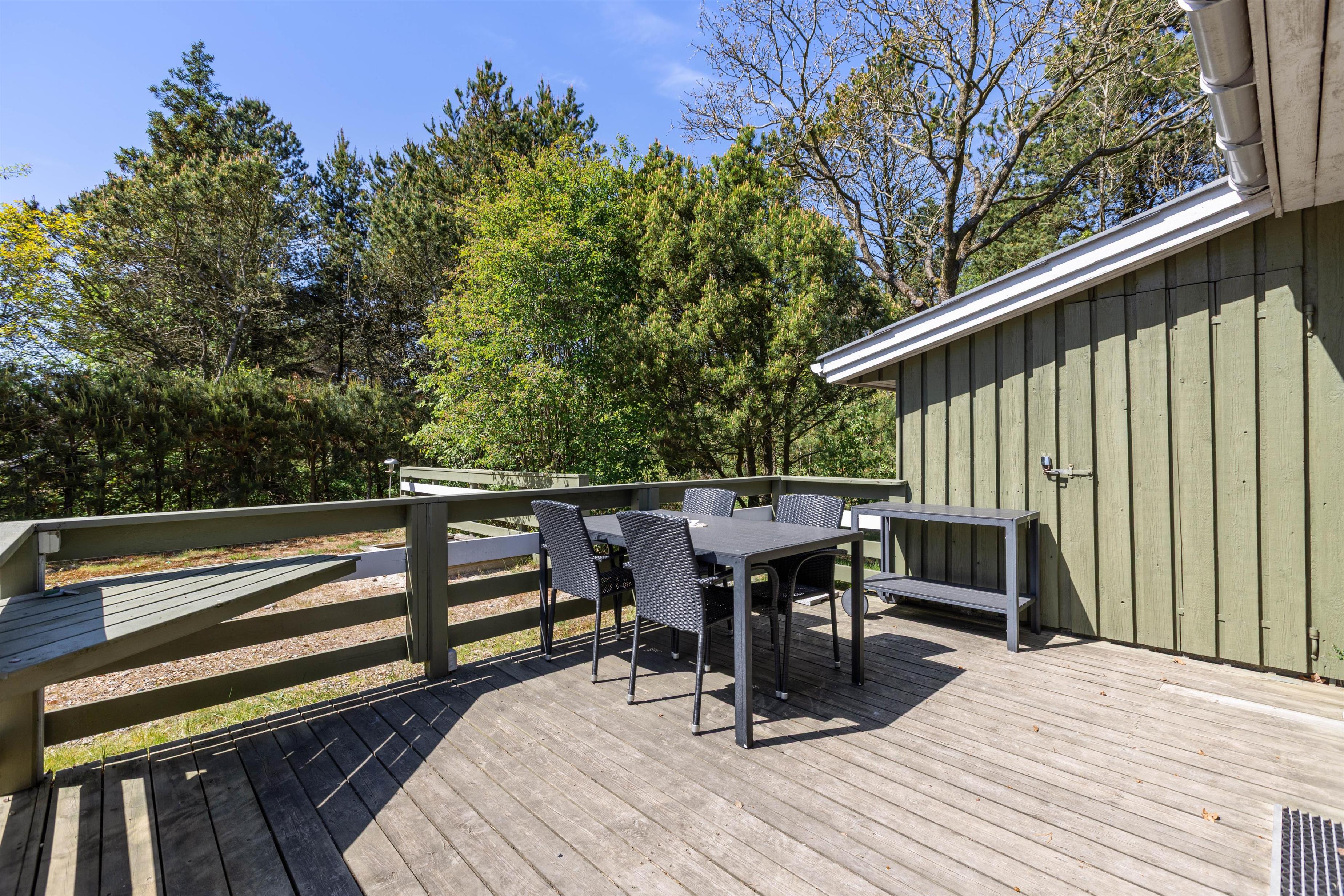 Fra stuen har I ikke kun en god udsigt ud over den omkringliggende natur, men I kan også komme direkte ud på den delvist overdækkede terrasse. Her kan I sidde i god læ om aftenen, tilberede en lækker feriemiddag på grillen og nyde et godt glas rødvin ved siden af.