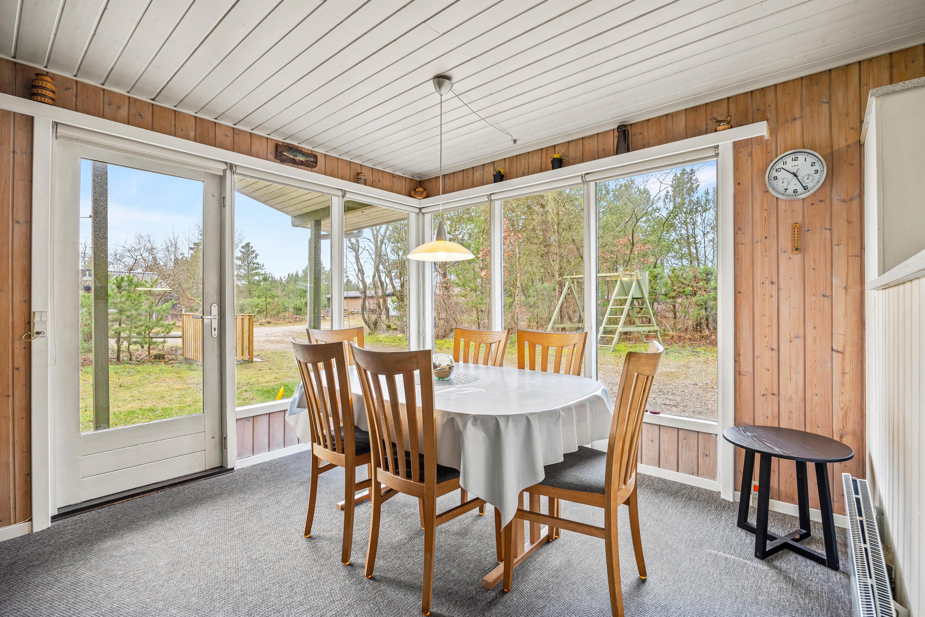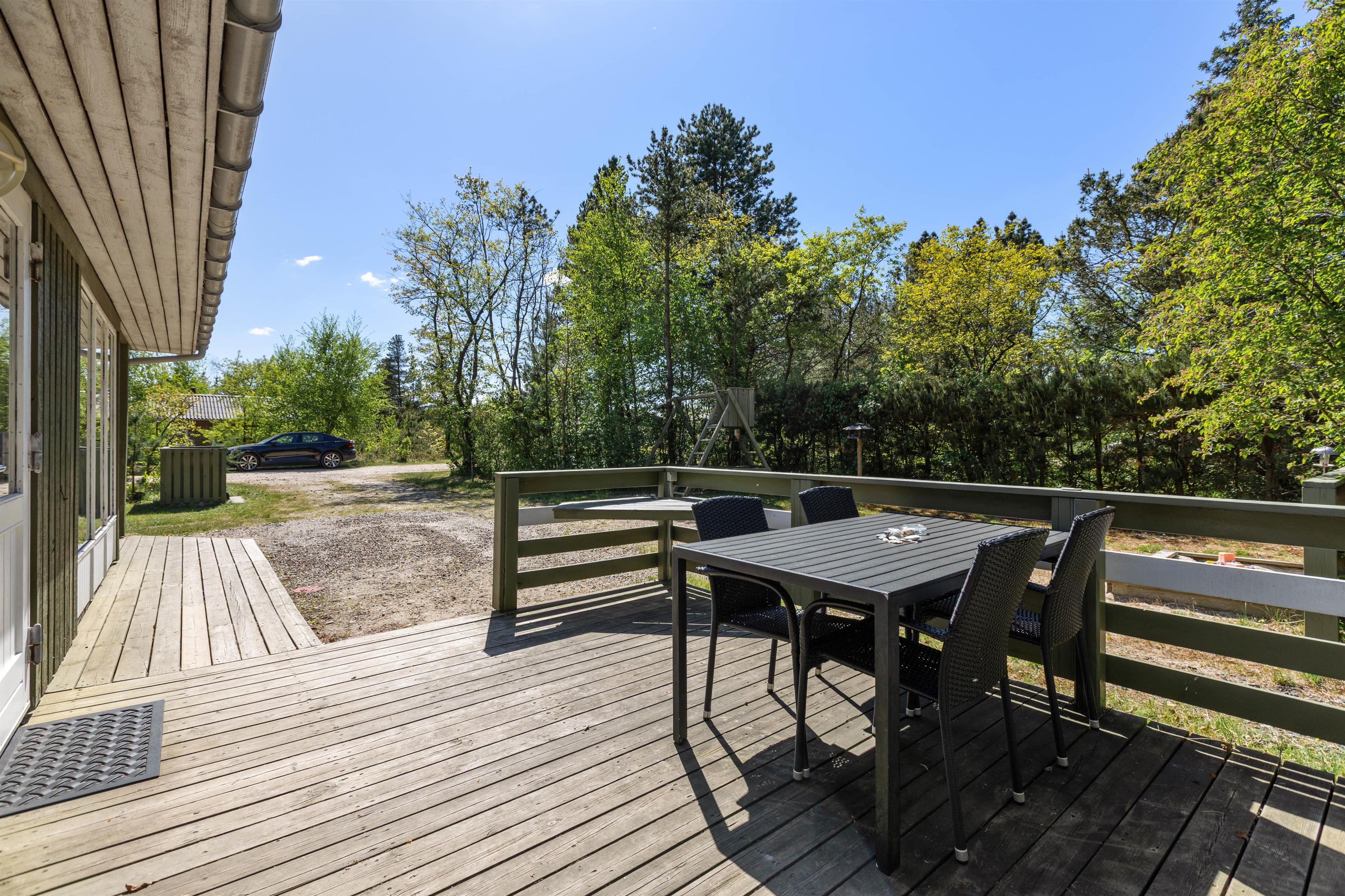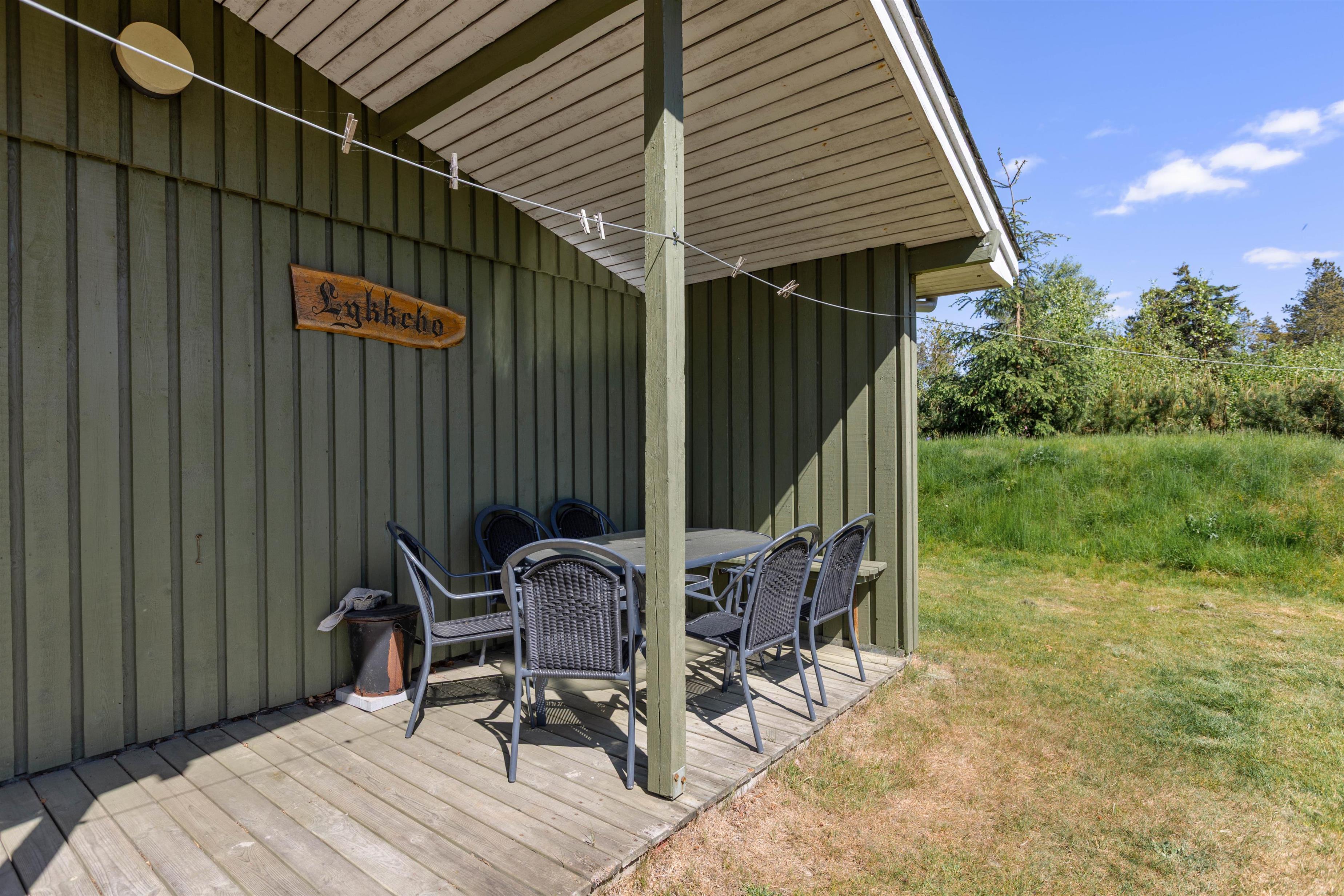Fra stuen har I ikke kun en god udsigt ud over den omkringliggende natur, men I kan også komme direkte ud på den delvist overdækkede terrasse. Her kan I sidde i god læ om aftenen, tilberede en lækker feriemiddag på grillen og nyde et godt glas rødvin ved siden af.