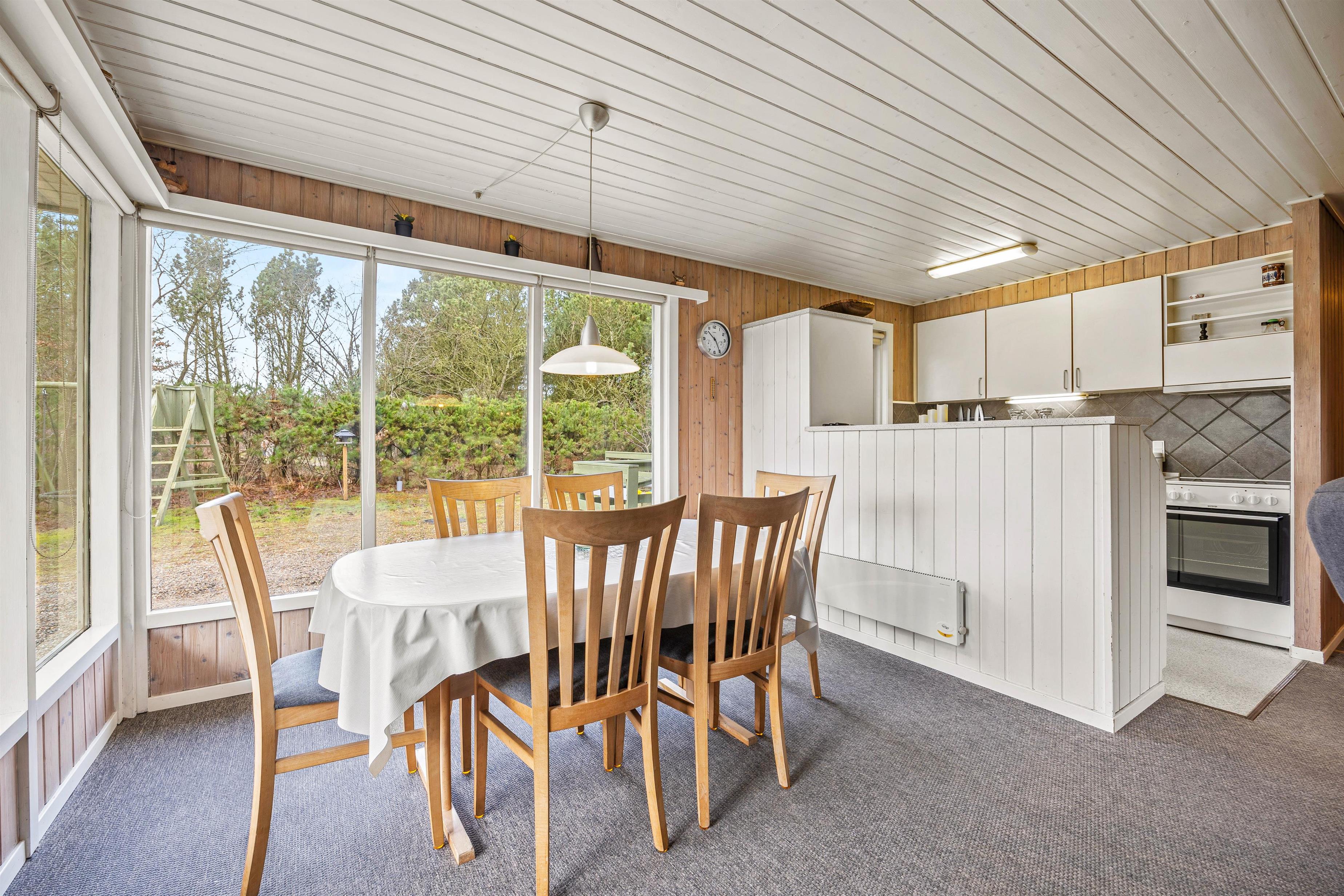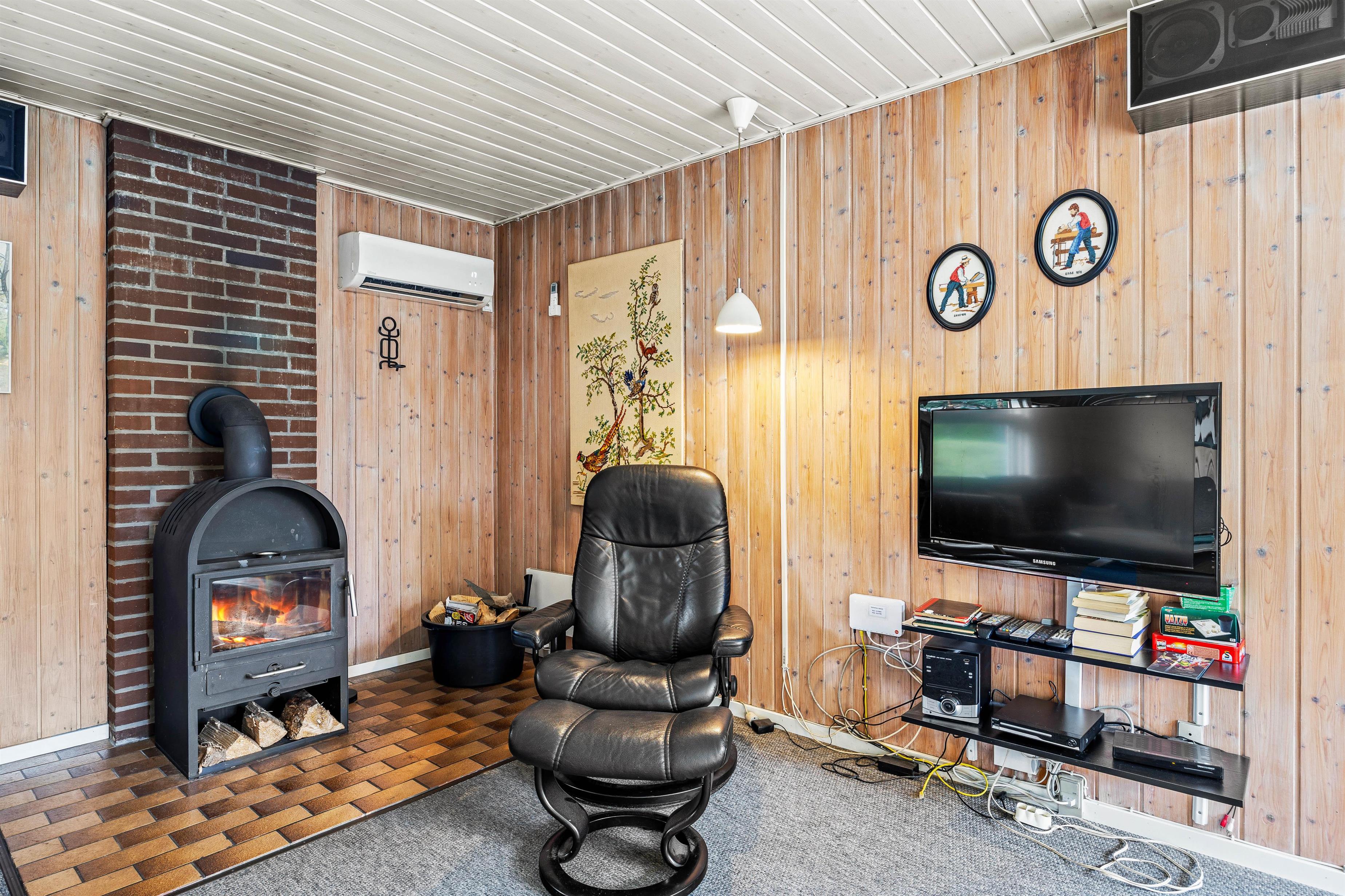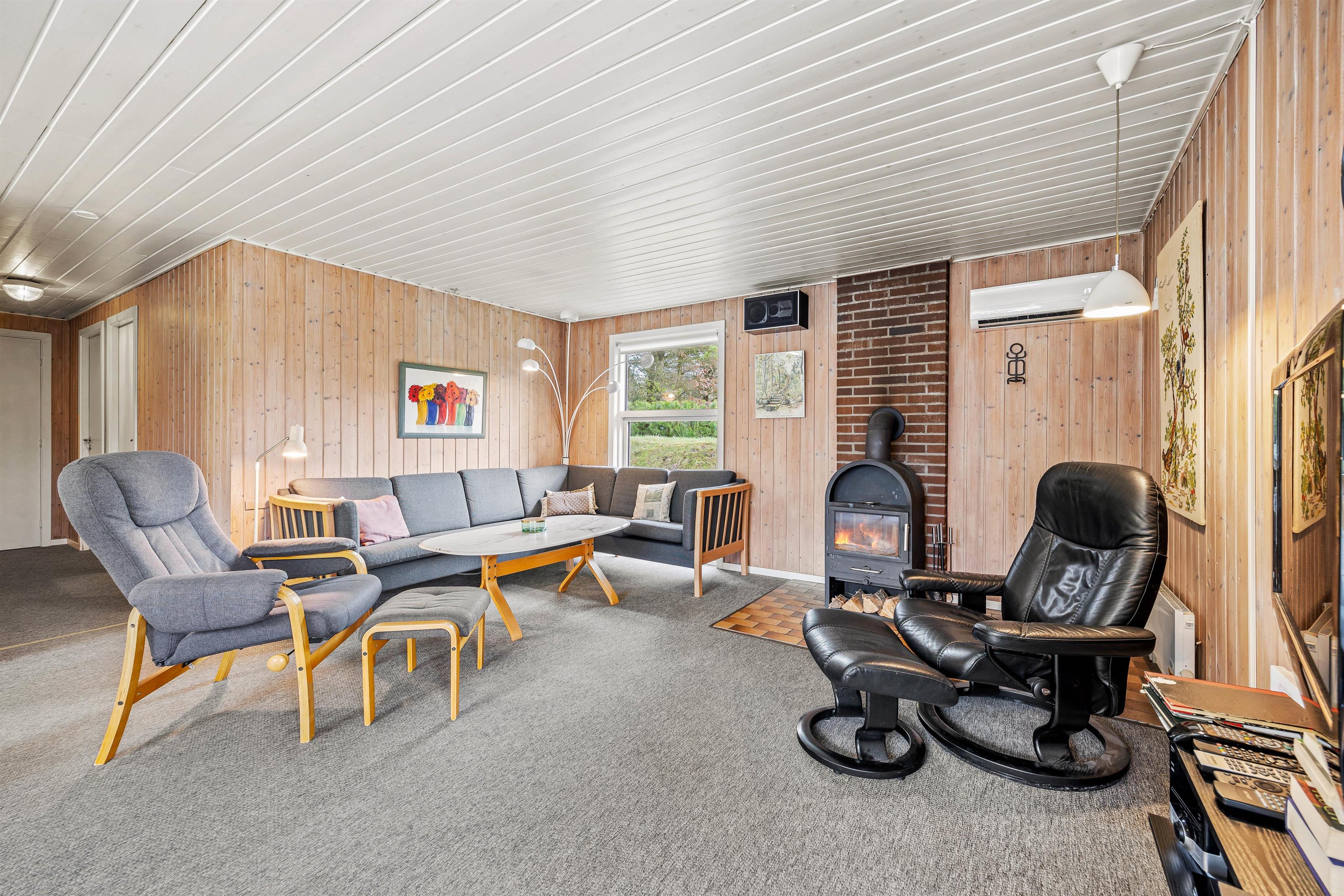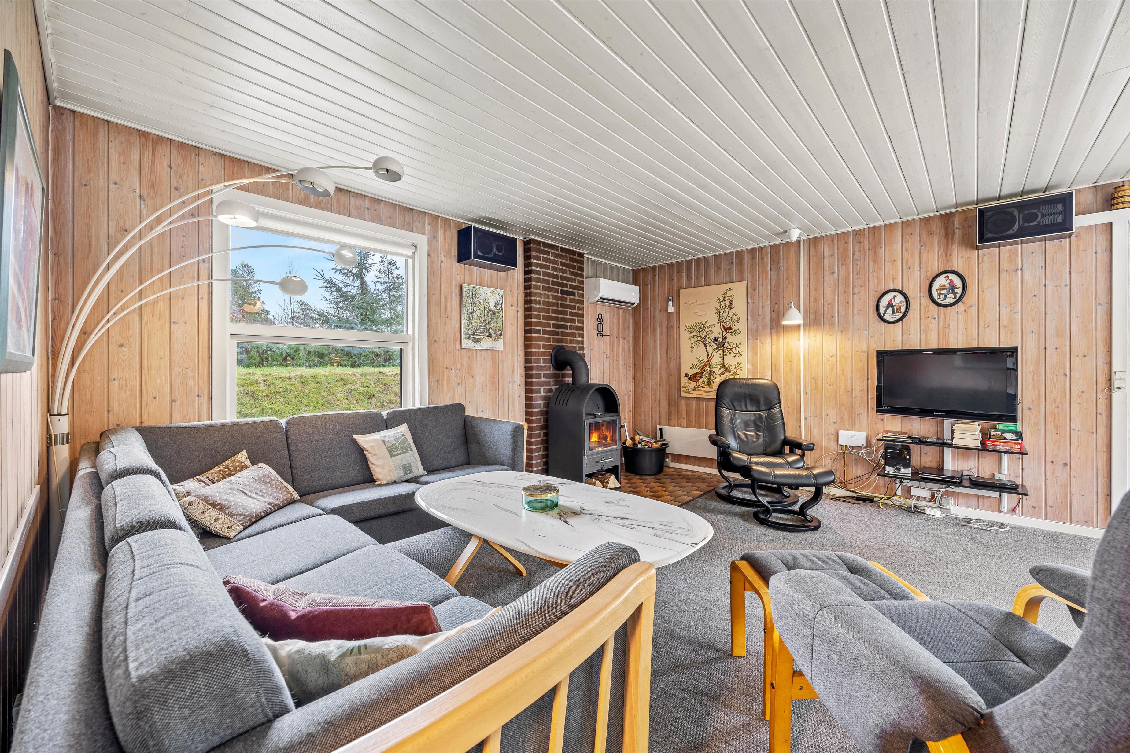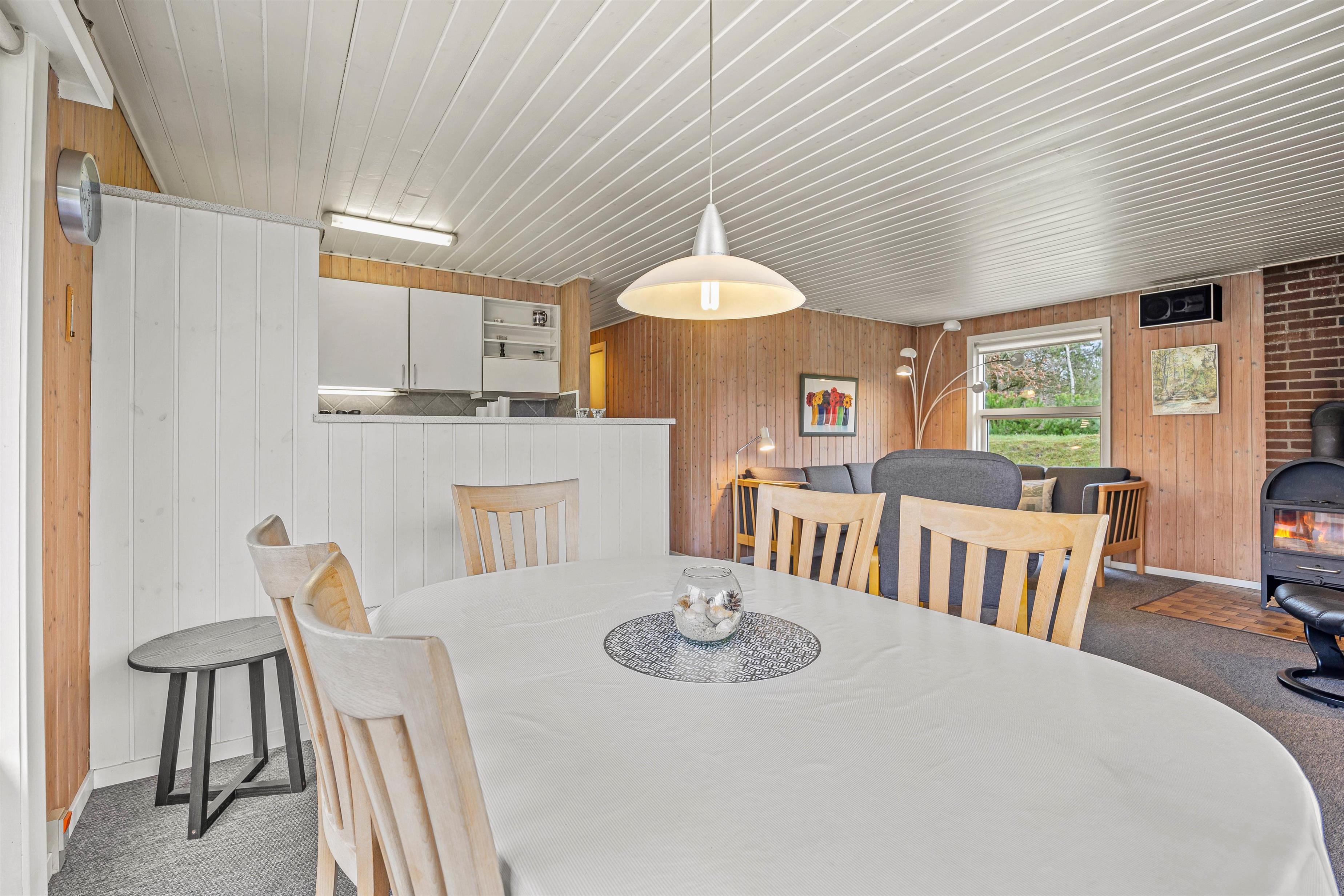 Med ferieadresse på Højsvej 40 kommer I aldrig til at fryse, og ud over den energibesparende varmepumpe, kan sommerhuset varmes op af den klassiske brændeovn, som sørger for en behagelig og stemningsfyldt atmosfære i spisestuen. De store vinduer lader masser af lys slippe ind og giver jer udsyn til fyrretræerne, som omkranser sommerhuset.