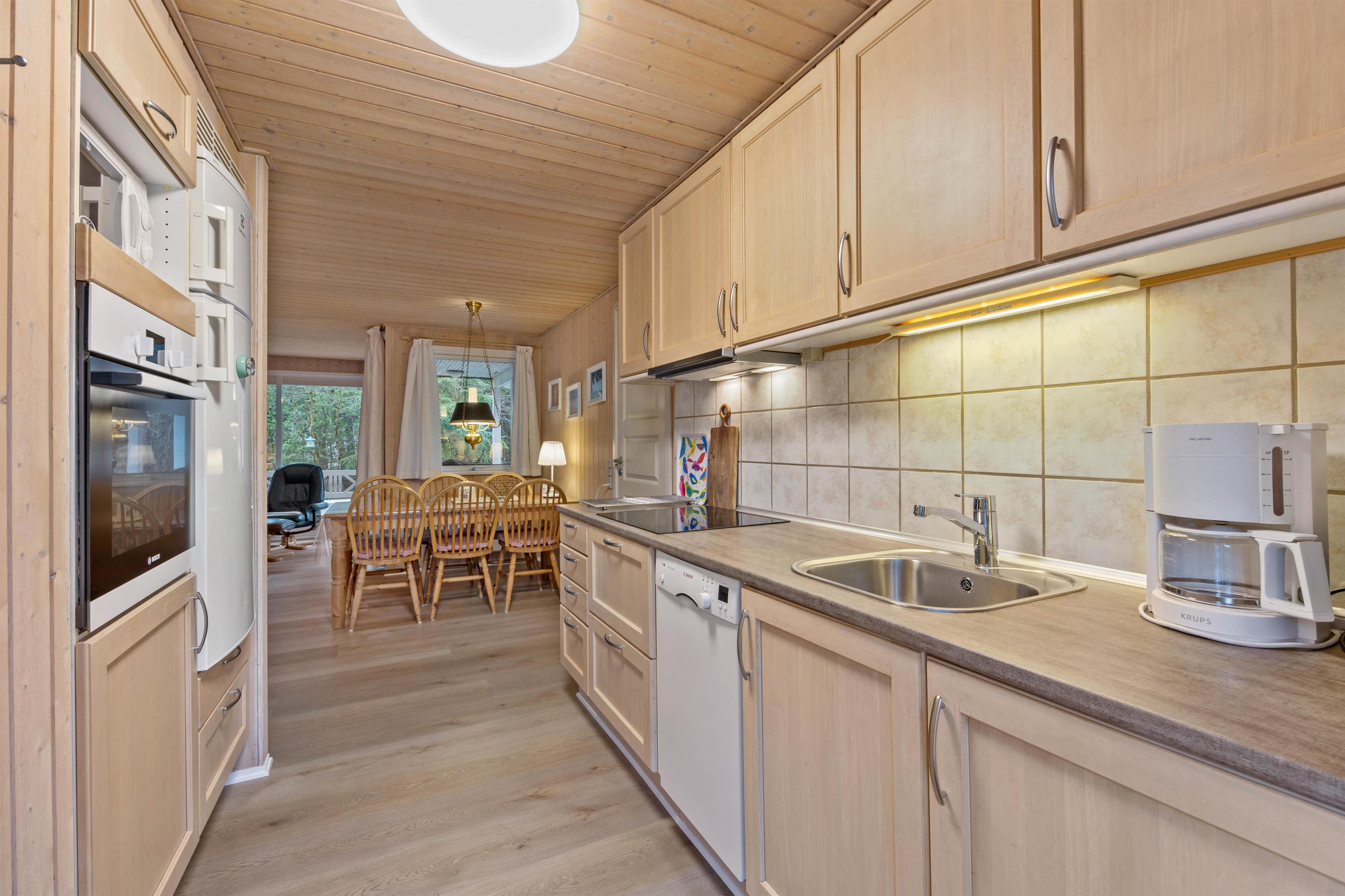 De 75 m² rummer plads til 6 personer og sætter rammerne for en hyggelig sommerhusferie i godt selskab. Husets hjerte er opholdsrummet med kombineret stue og spiseafdeling, som grænser op til det veludstyrede køkken. De store vinduer og de lyse trævægge gør ikke-ryger huset til et venligt feriehjem.