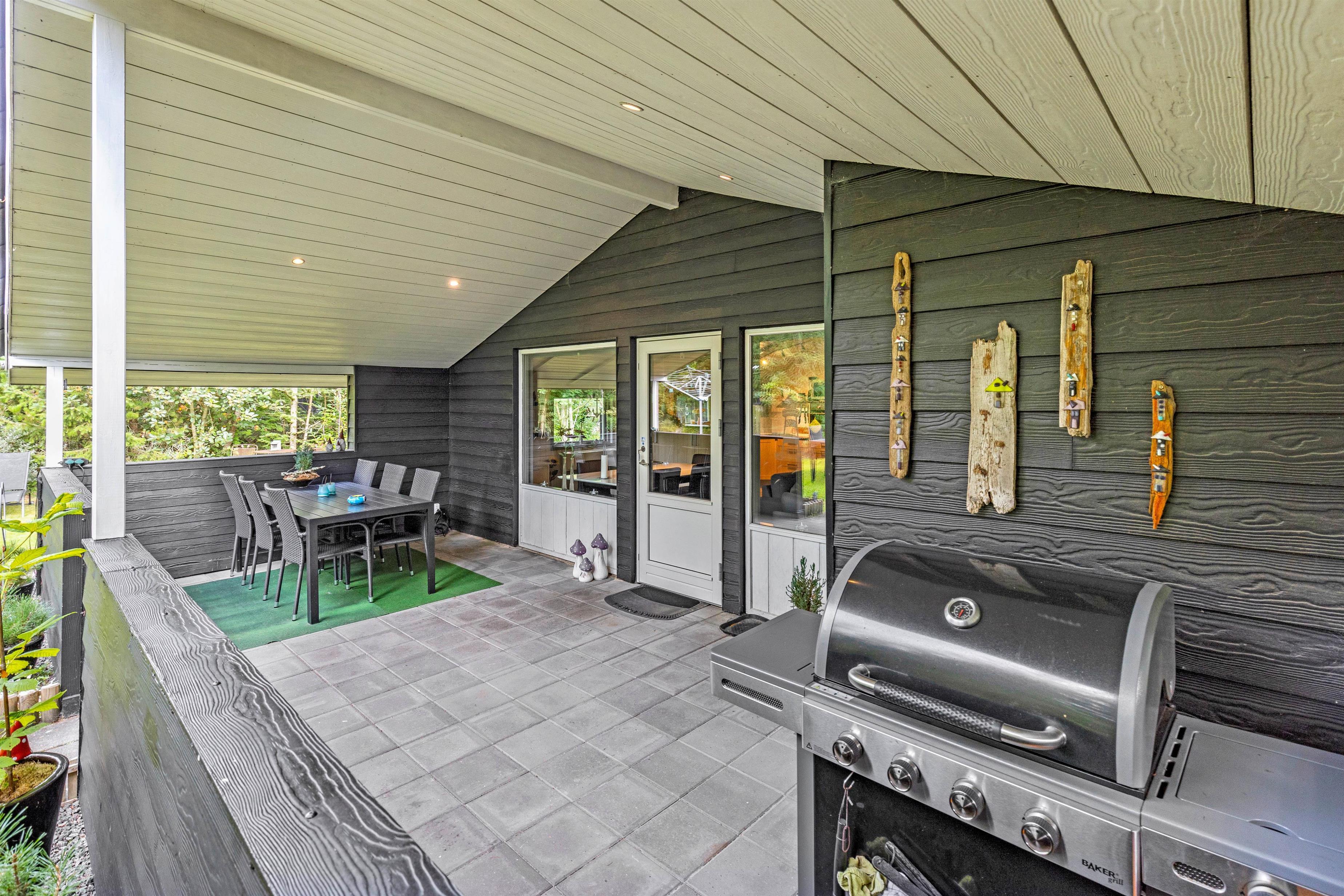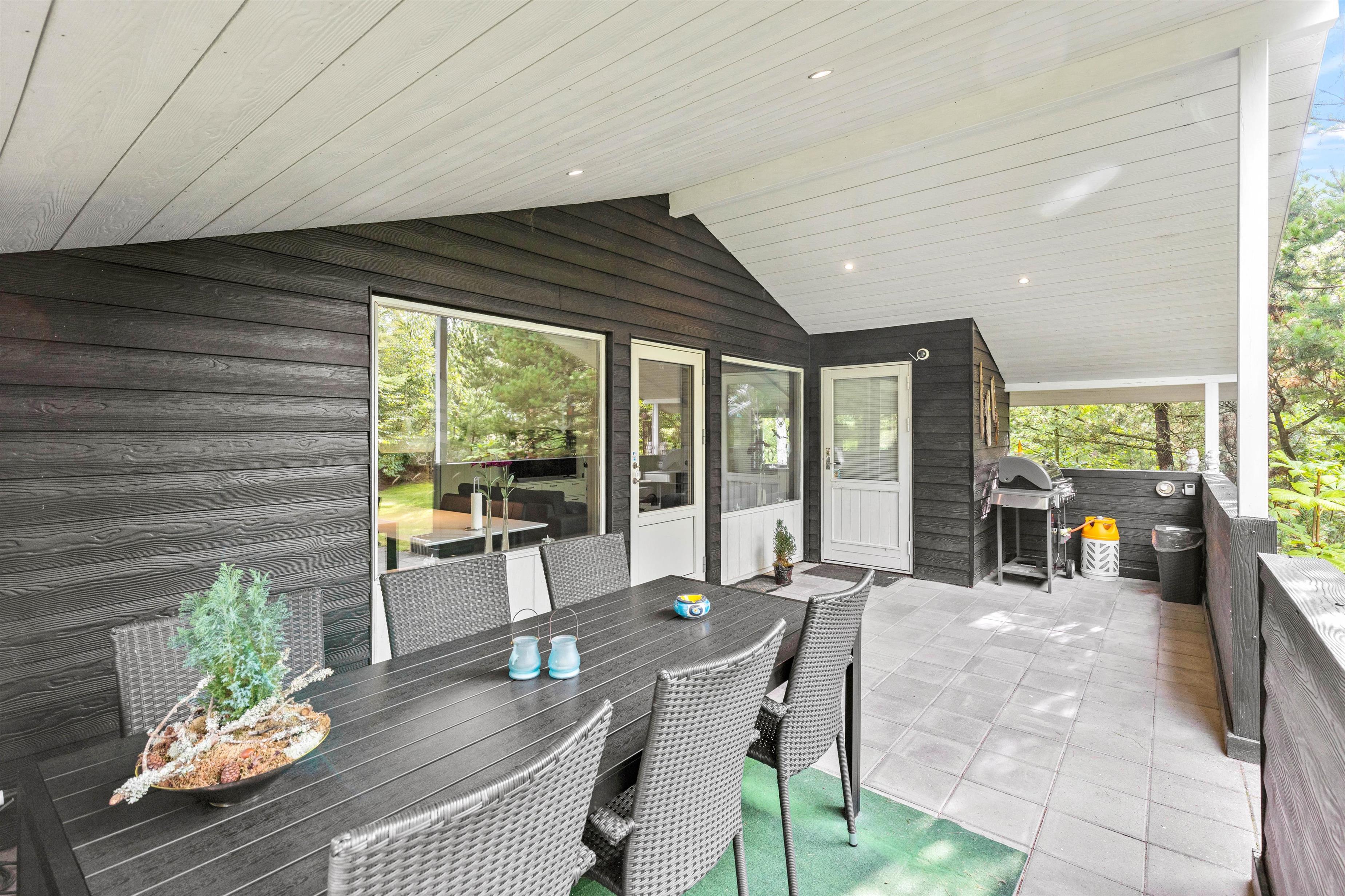 Fra sommerhusets alrum kan I træde direkte ud på den sydvendte terrasse. Her står der både havemøbler og liggestole klar, som I kan læne jer godt tilbage i og slappe helt af. Terrassen er afskærmet og overdækket, så her kan I altså sidde i både ly og læ. Fra terrassen kan I desuden bevæge jer videre ud i haven, som jeres hund helt sikkert vil elske.