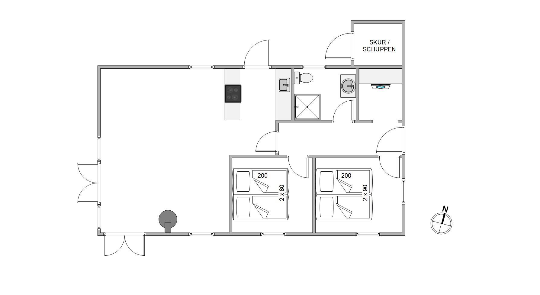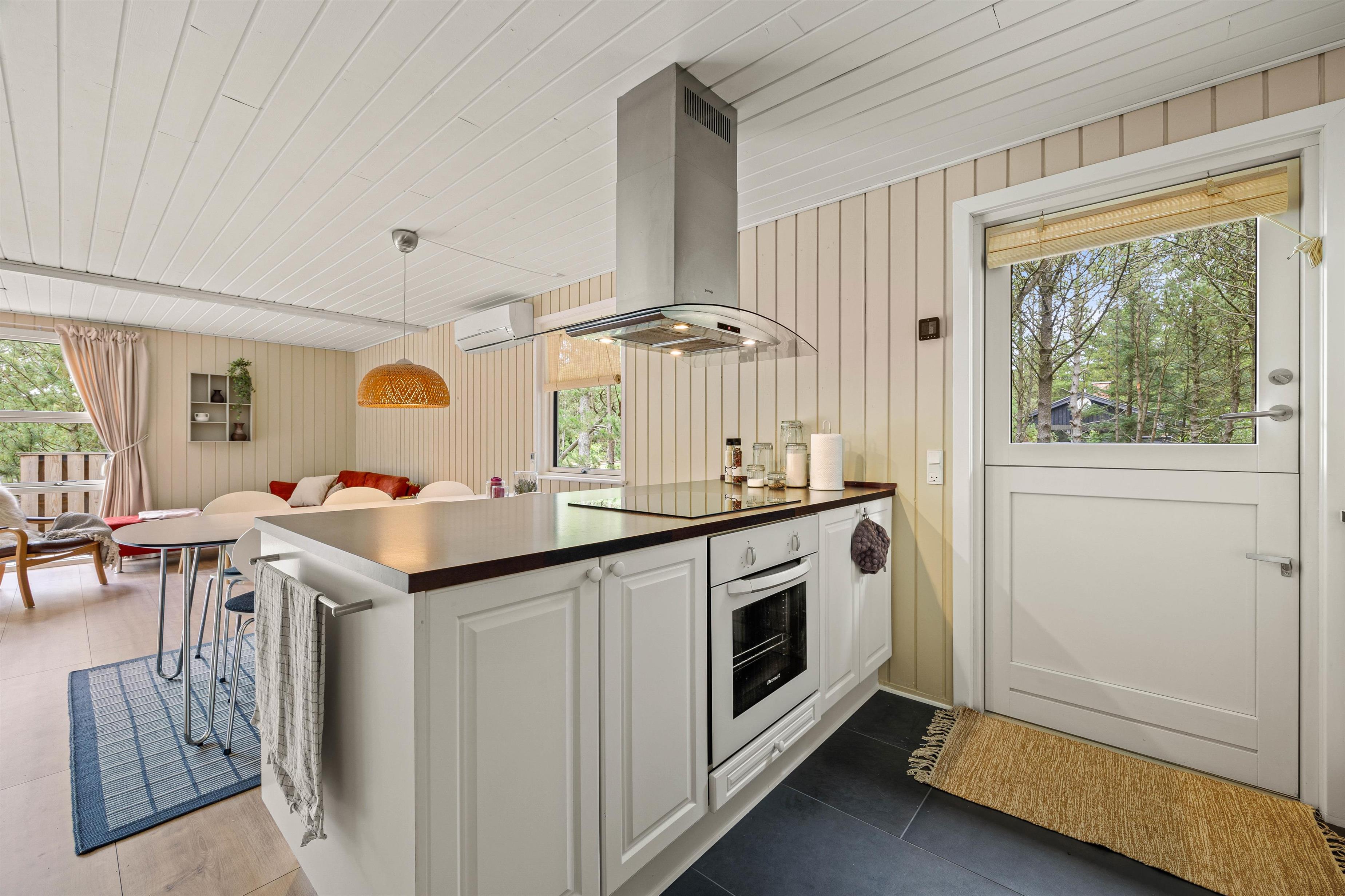 Sommerhusets hjerte er køkkenalrummet, hvor det åbne køkken er i forbindelse med spiseplads og sofagruppe, her sætter brændeovn feriestemningen i top. Køkkenet indeholder alt, hvad I skal bruge for at forkæle hinanden med lækre, hjemmelavede måltider. Ved spisebordet kan I dække pænt op eller spille et brætspil om opvasken. Der er dog opvaskemaskine til rådighed, så det behøver ikke være den helt store omgang. Efter middagen kan I trække jer til bage i den komfortable sofagruppe med en kop kaffe – eventuelt se en film sammen. Tænd op i brændeovnen, hvis aftenen er kølig – det bliver det bare endnu mere hyggeligt af.