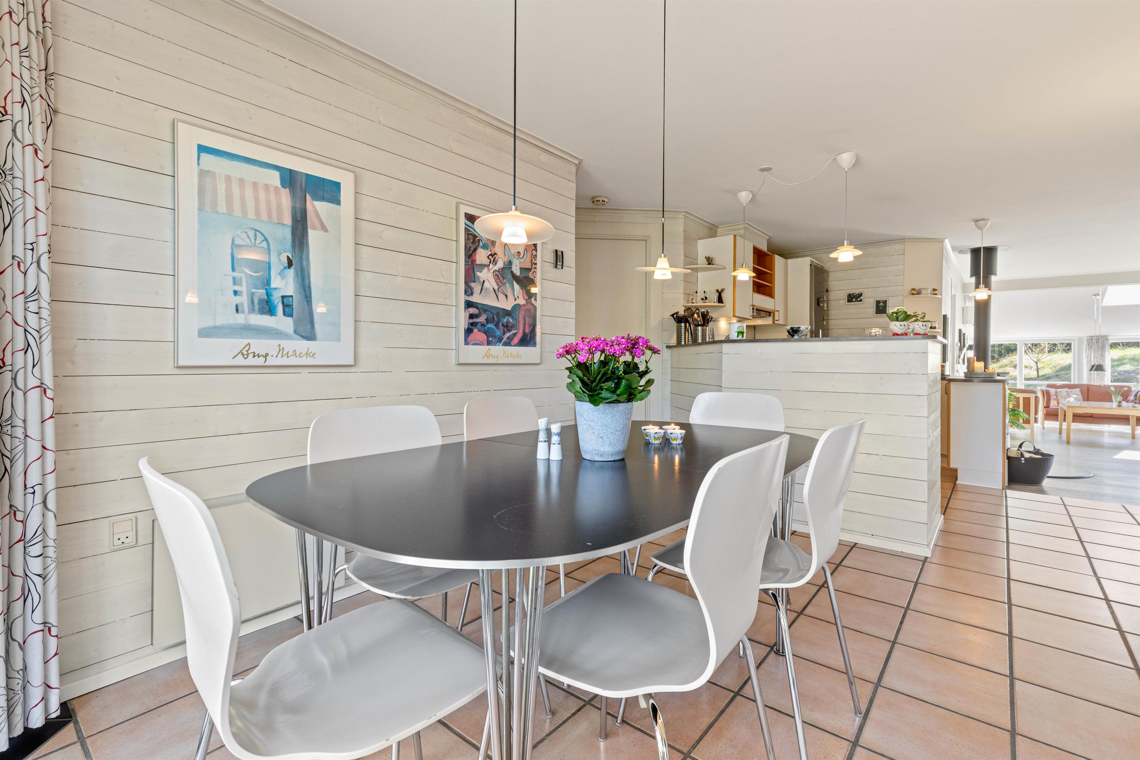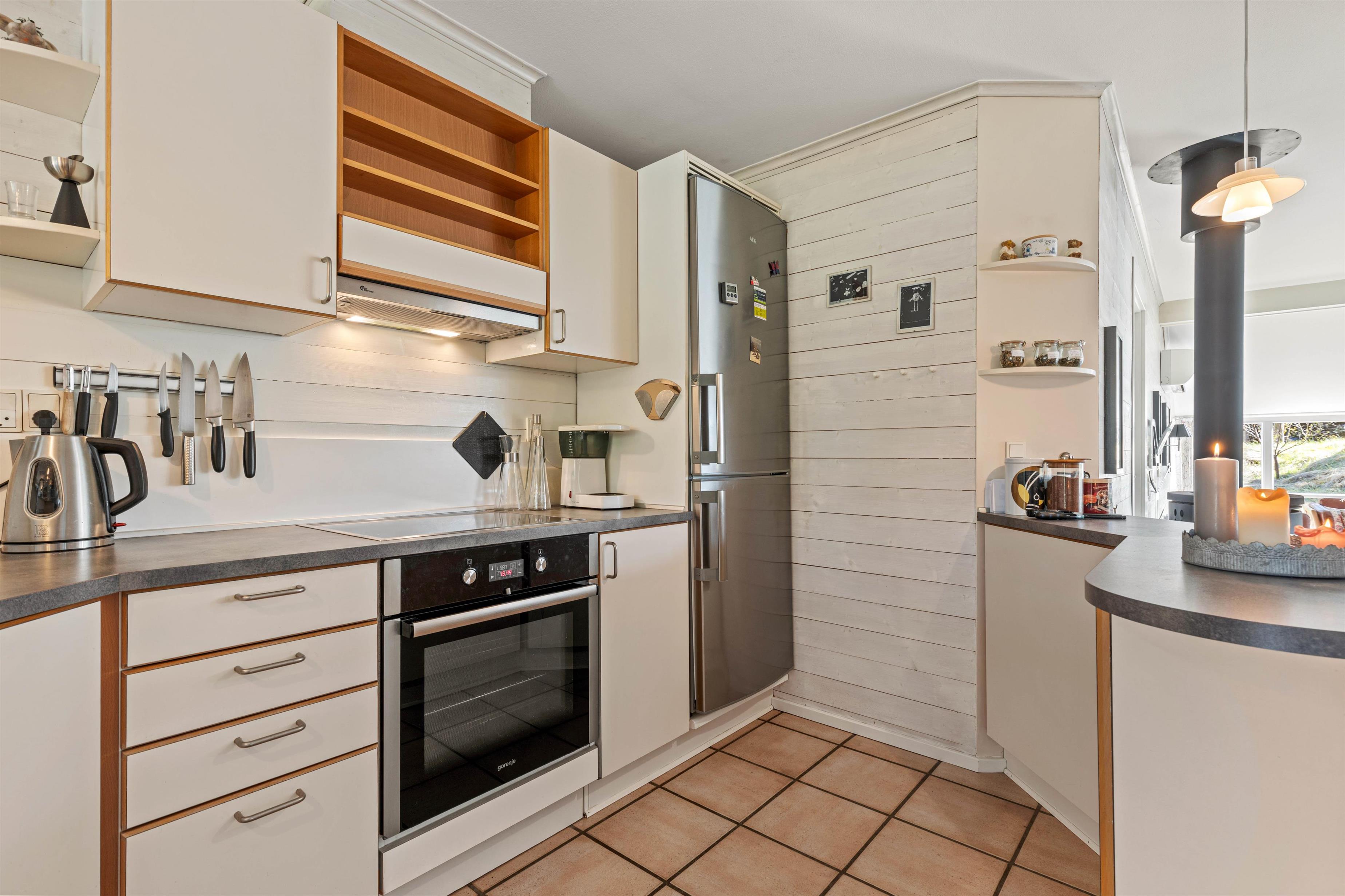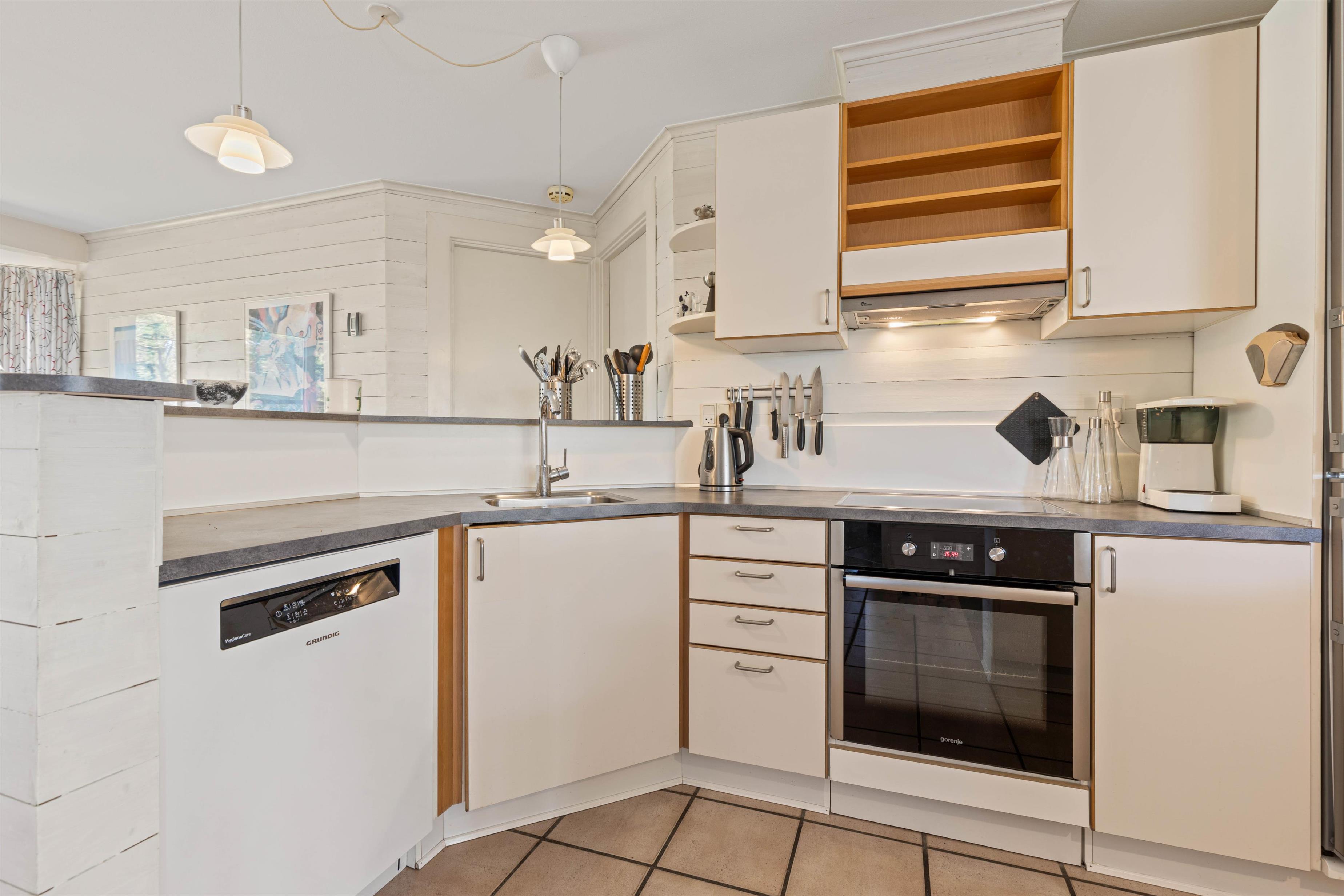 Køkkenet i dette lyse og venlige hus er åbent og ligger mellem stuen og spiseafdelingen. Det er udstyret med opvaskemaskine, så I kan nyde ferien, mens det praktiske arbejde bliver overtaget. Ud over de tre soveværelser med dobbeltsenge, er der et værelse med sovesofa, skrivebord og fjernsyn - perfekt til børn og teenagere.