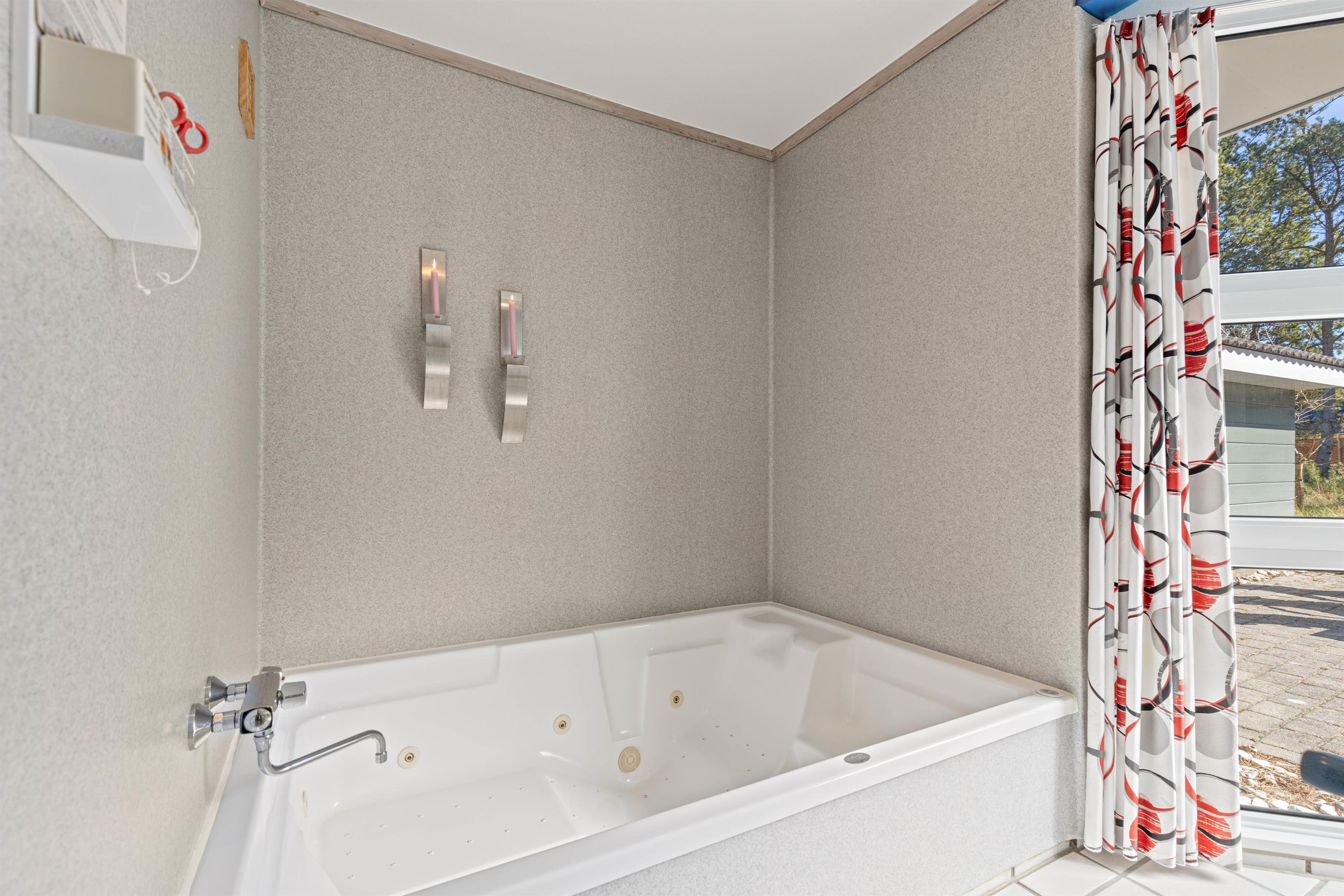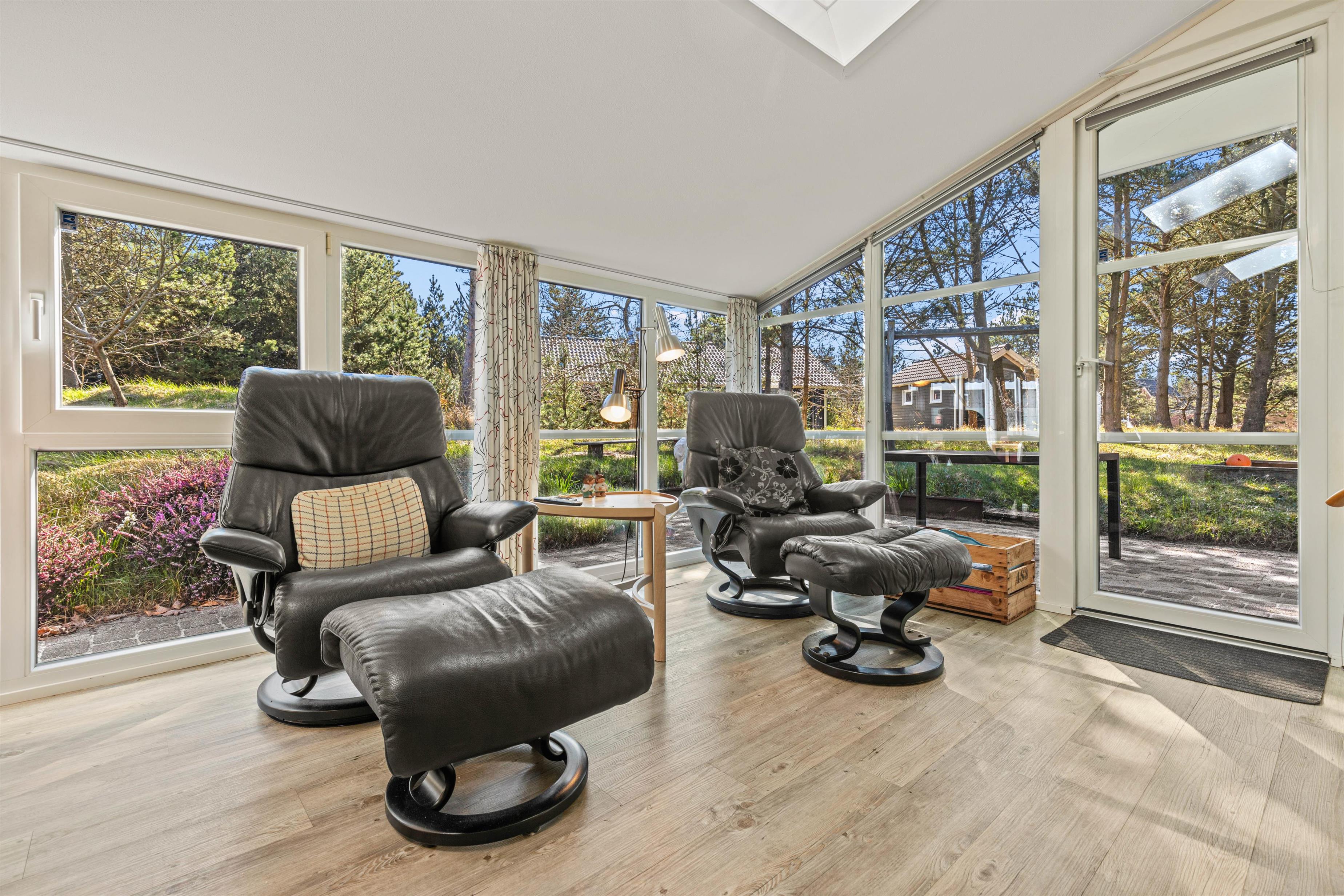 Både opholdsstuen og badeværelset er udstyret med gulvvarme, og den energibesparende varmepumpe sørger for, at I til hver en tid har en passende temperatur. Det store badeværelse er en oplevelse i sig selv, det fungerer både som wellness, fittness og opholdsrum! Wc og bruser er separate, til gengæld er her både motionscykel og bordfodbold. Imens I træner på cyklen kan I gennem det store vinduesparti nyde udsigten i det grønne. Rigtigt skønt er det, efter en lang spadseretur i skoven eller på stranden er det, at tænde stearinlys, trække gardiner for og så rigtigt hygge og blive gennemvarmet i sauna og spabad.