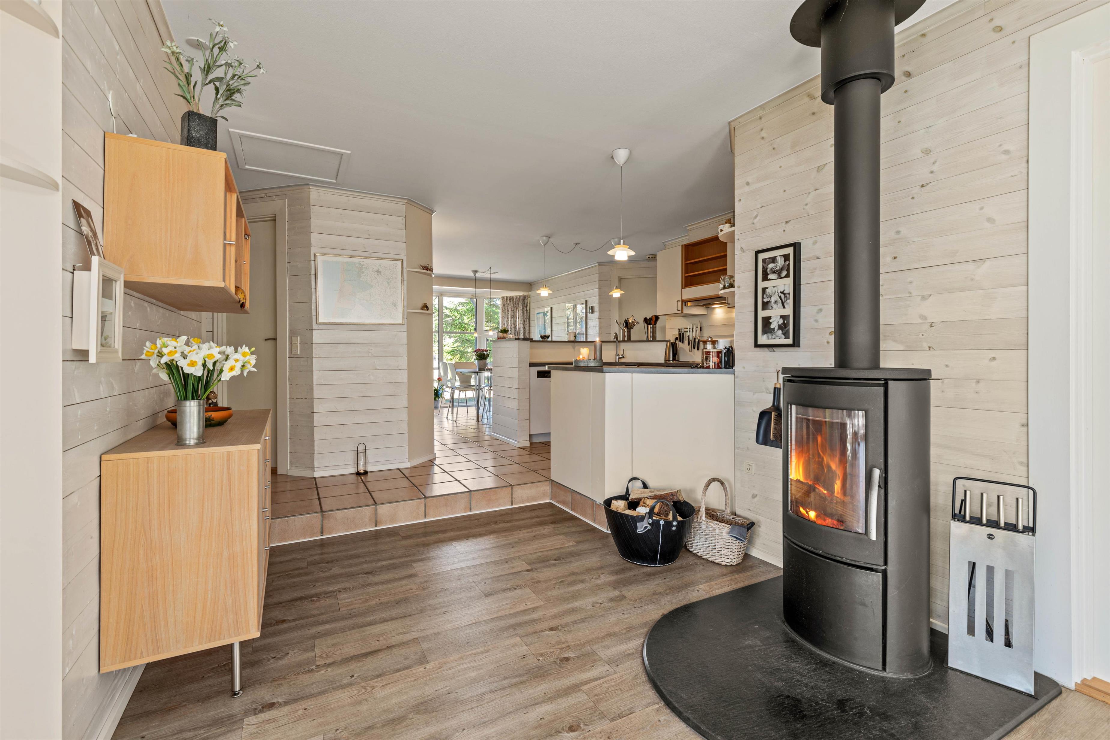 Huset hjerte er den åbne stue, som næsten fungerer som udestue med sine mange vinduer. Her har I en flot udsigt fra sofaen, så I selv på de kølige og regnfulde dage kan nyde naturen, mens brændeovnens knitren spreder hyggelig feriestemning og masser af varme.