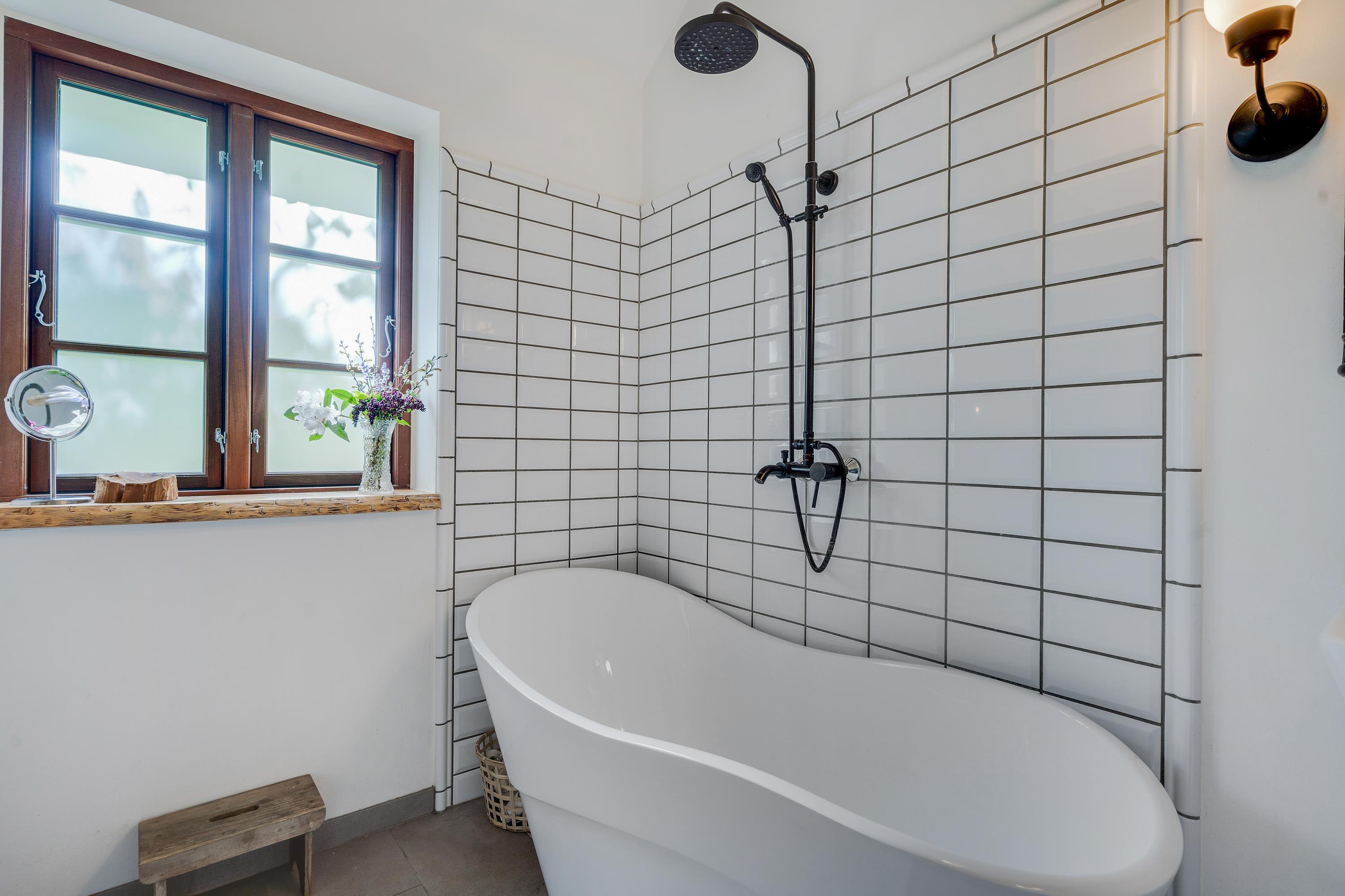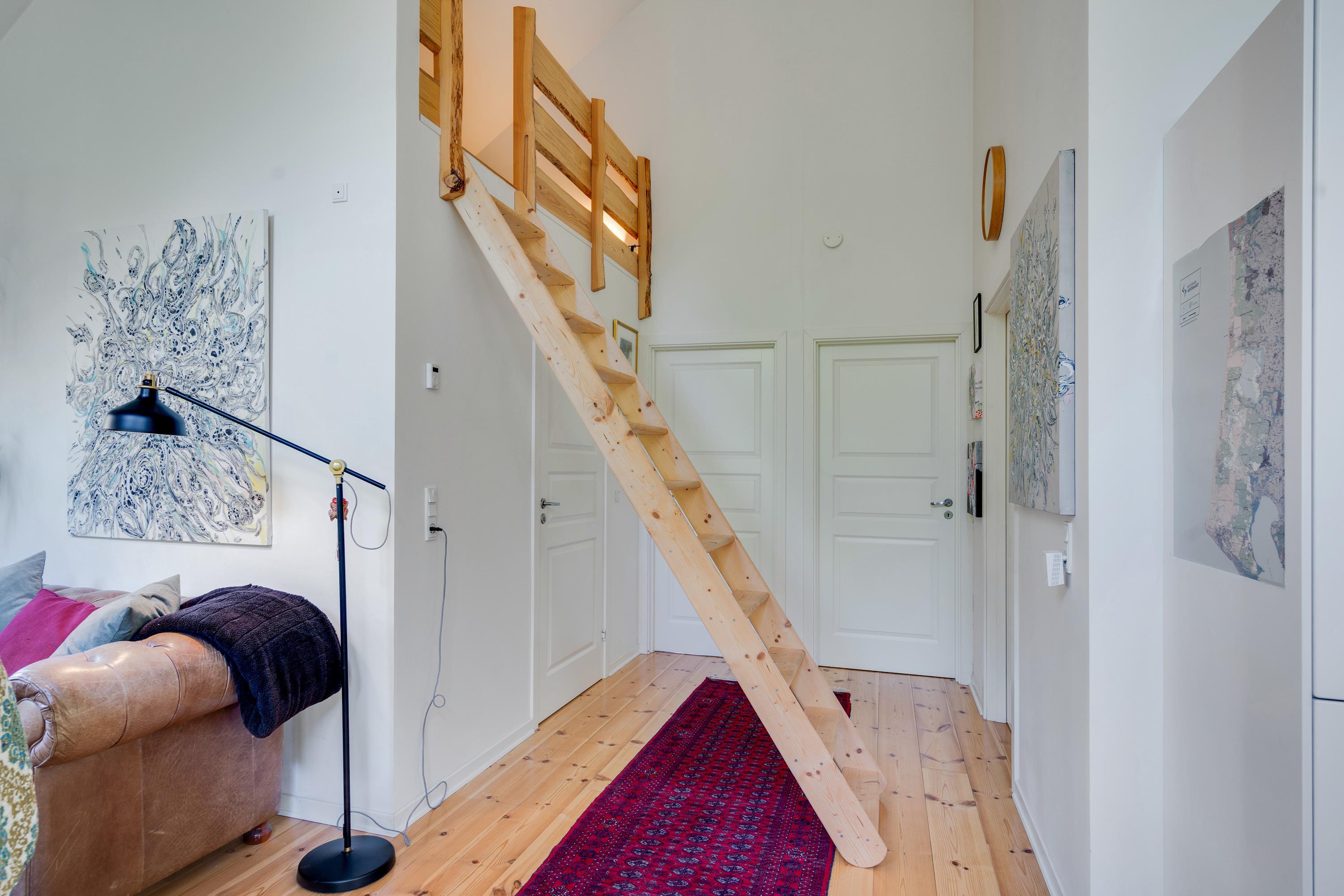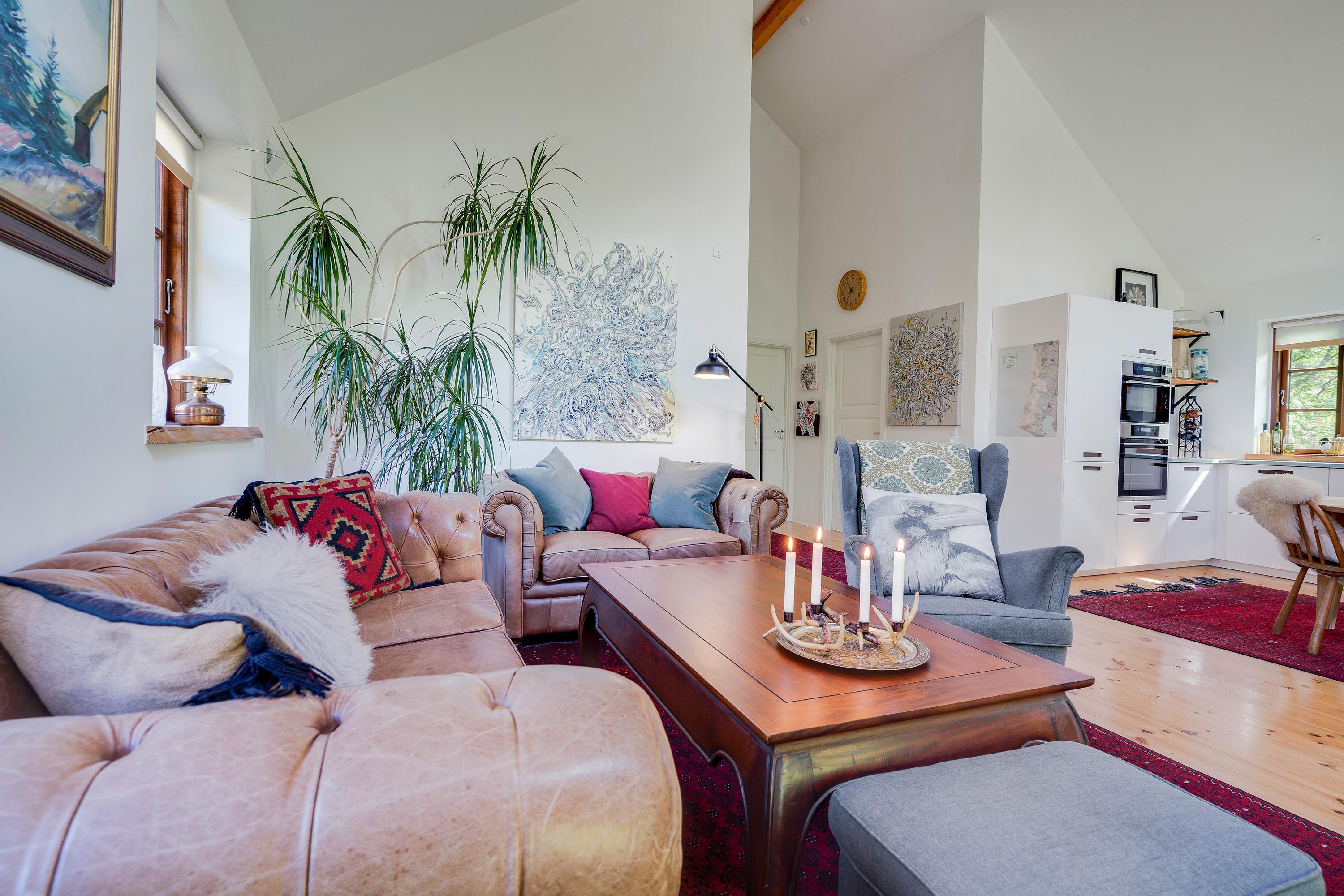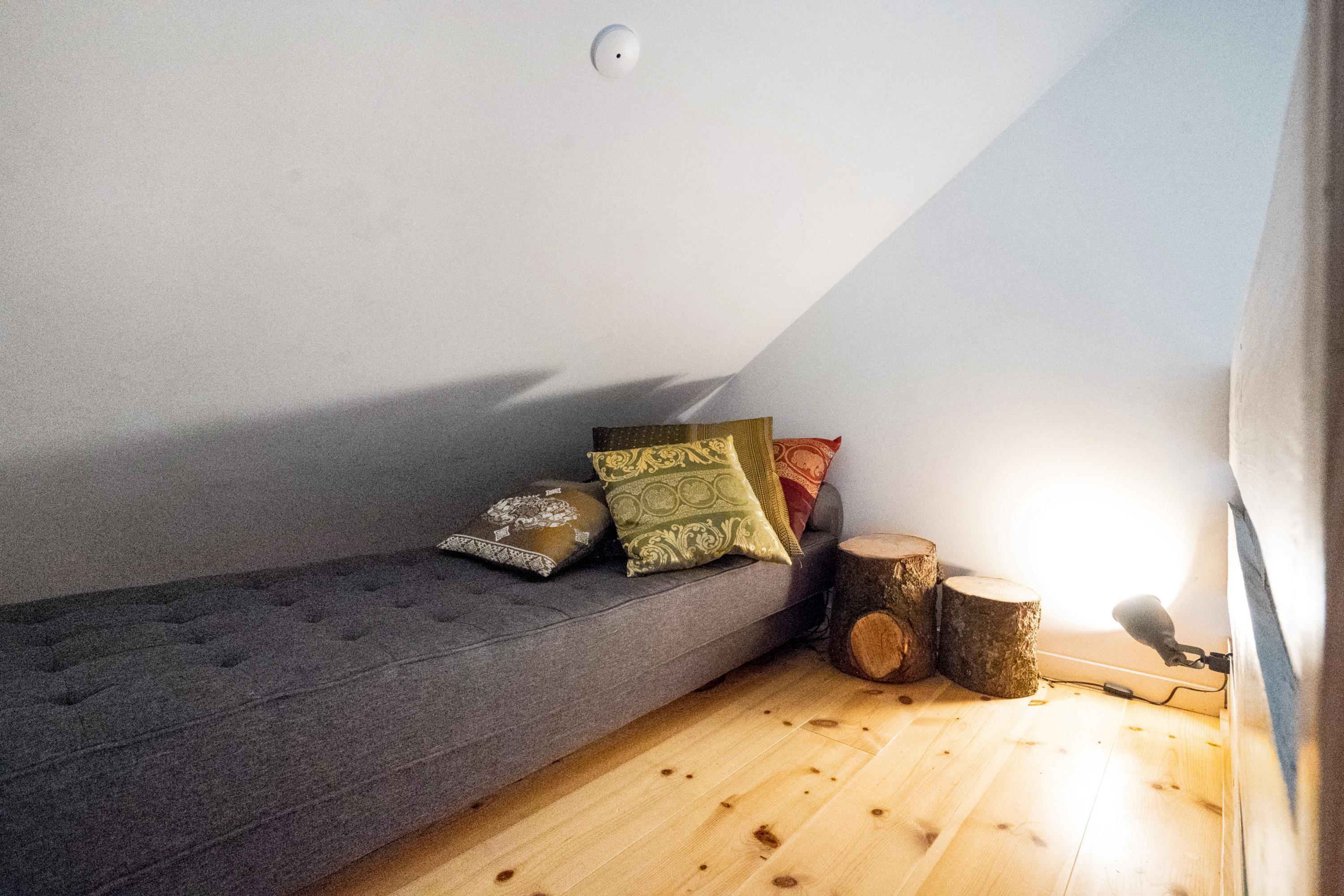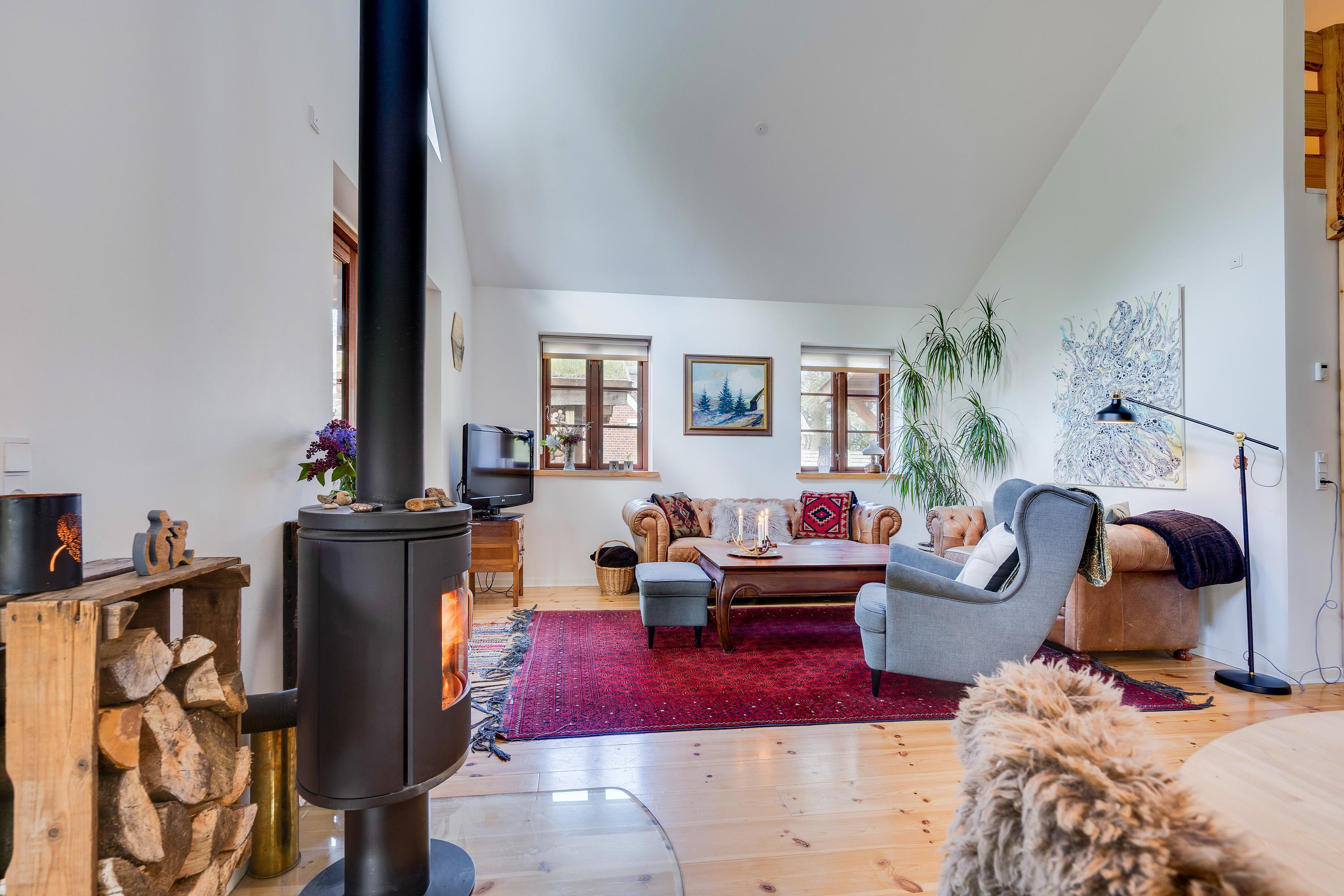 Rummelig atmosfære med brændeovn, badekar og hems