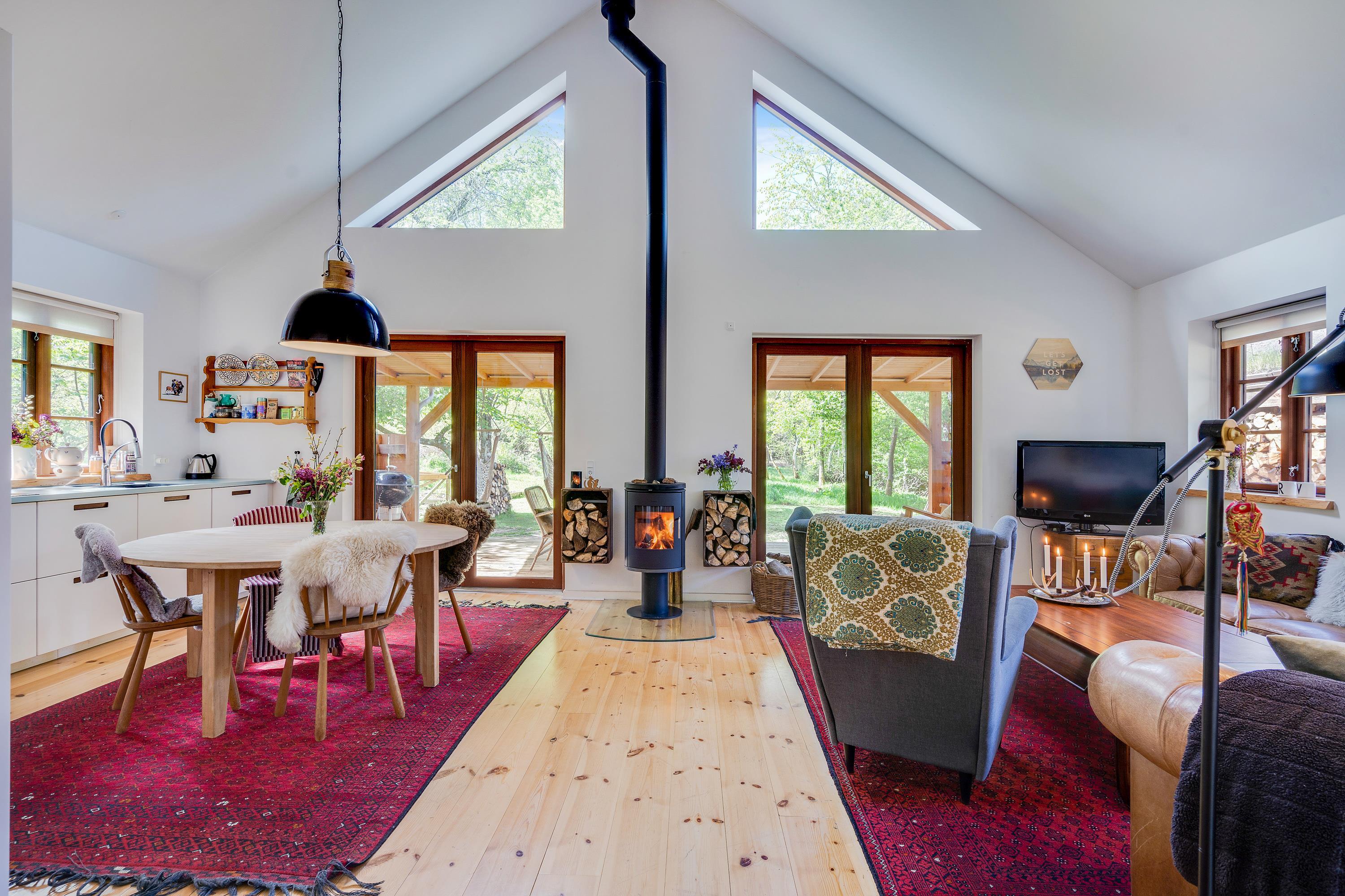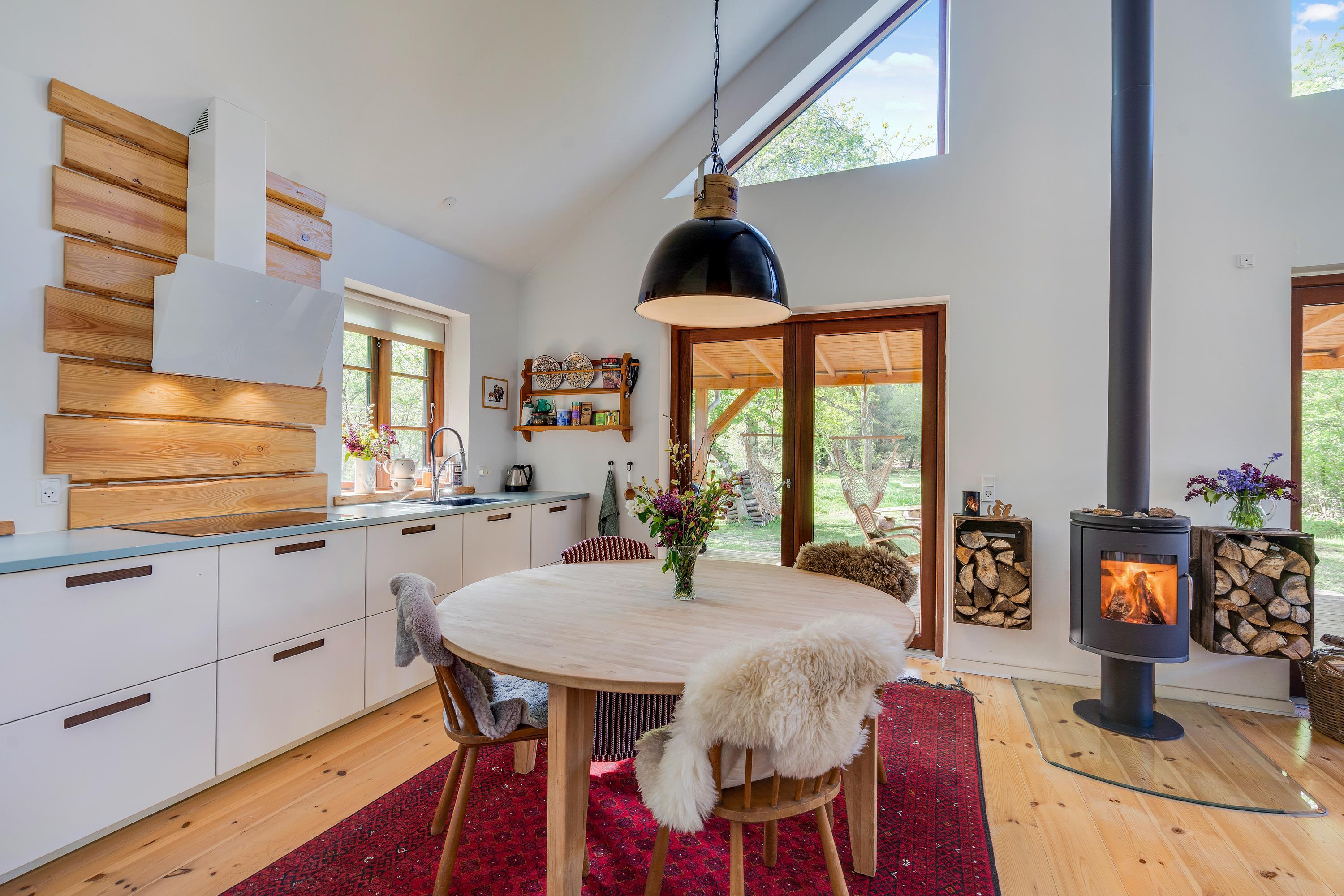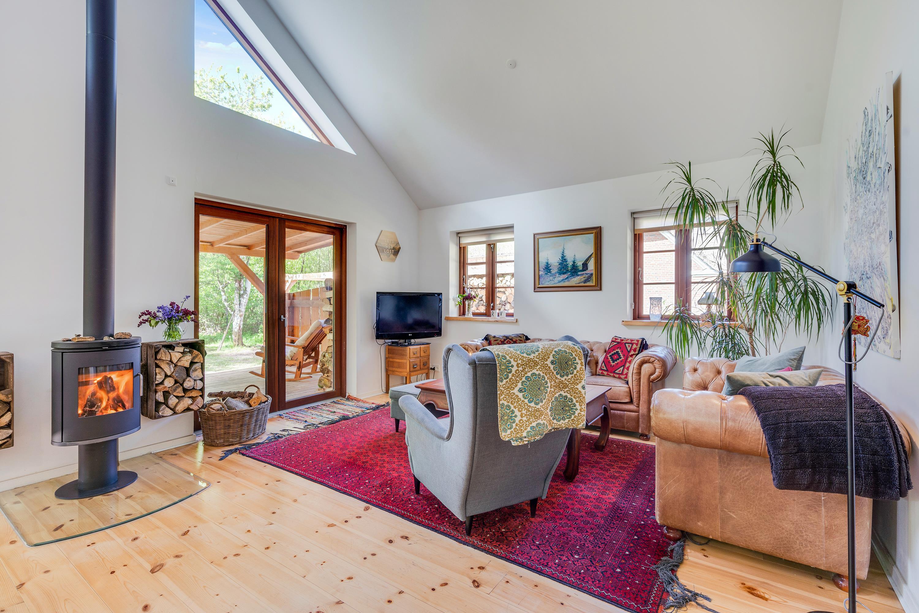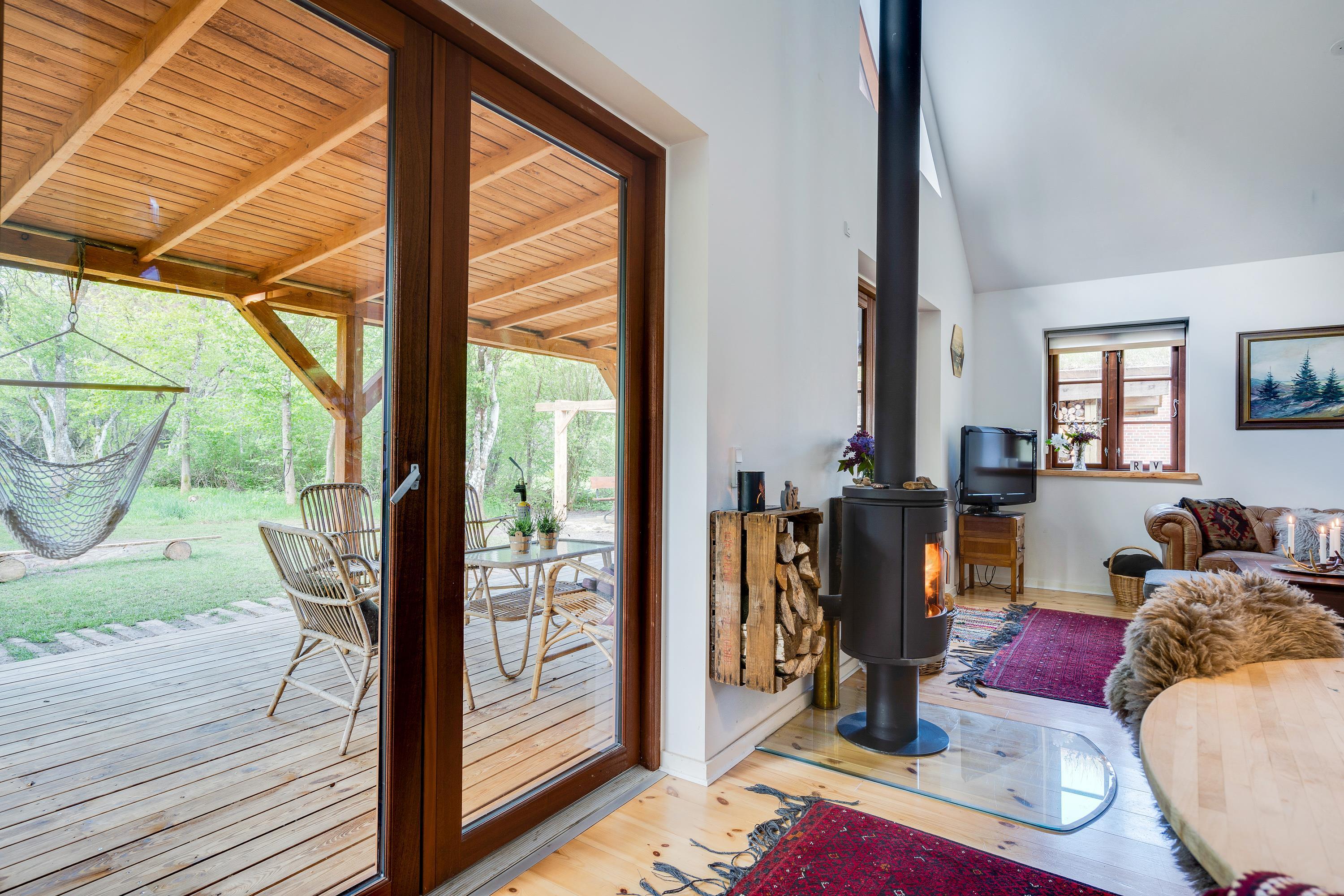 Ferieboligens hjerte er det åbne opholdsrum (med gulvvarme), der kombinerer stue og køkkenalrum i ét samlet rum. Her står desuden sommerhusets brændeovn, som altid sørger for god ferieatmosfære. Fra opholdsrummet har I den fineste udsigt ud til det grønne skovområde gennem de store vinduespartier.