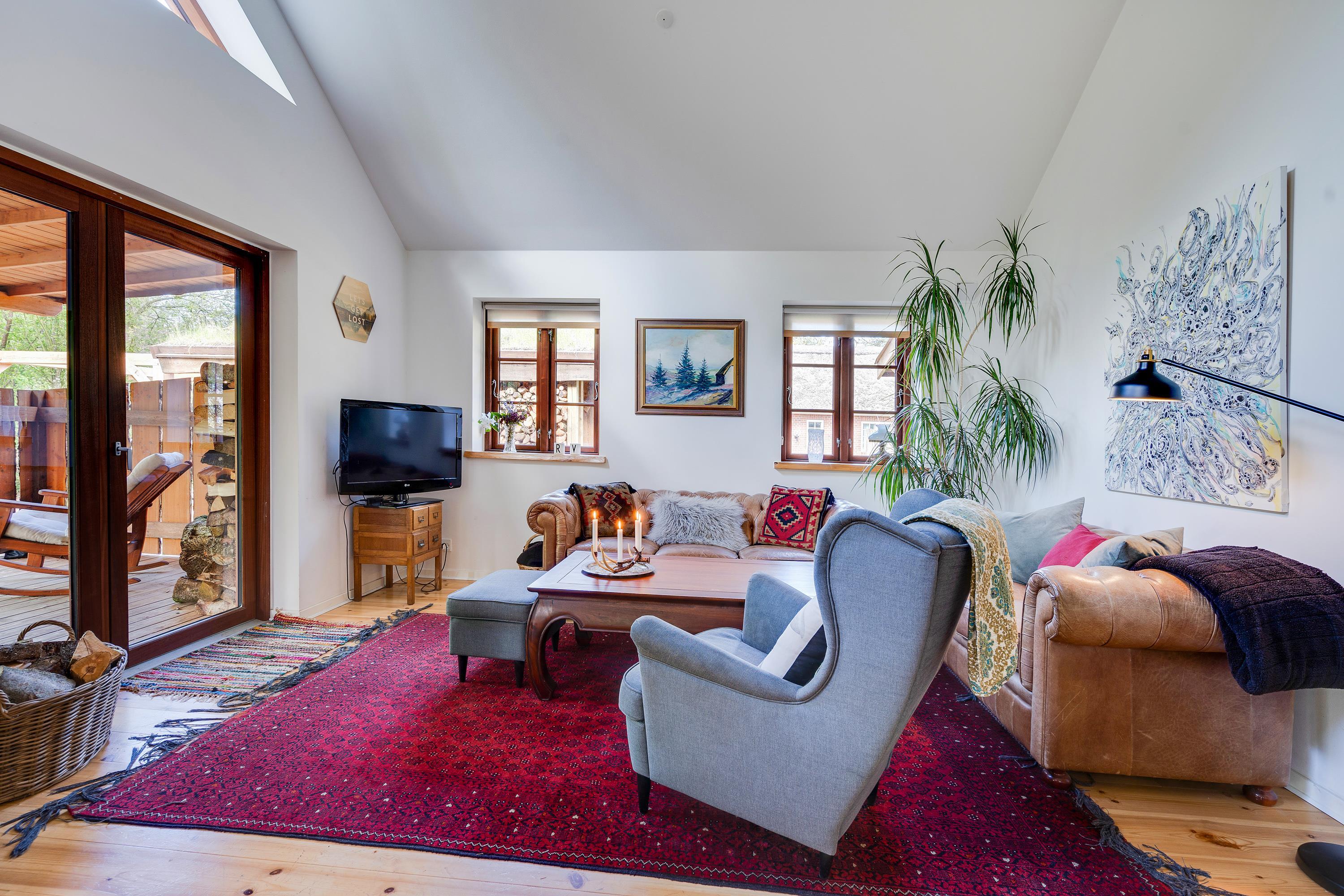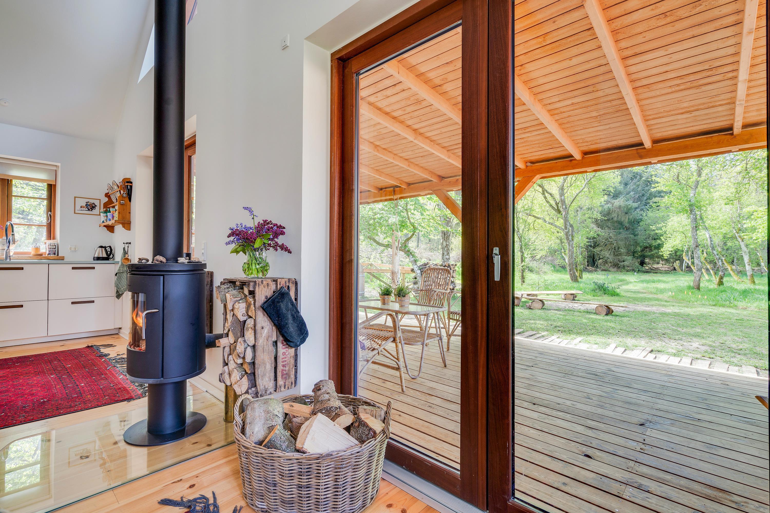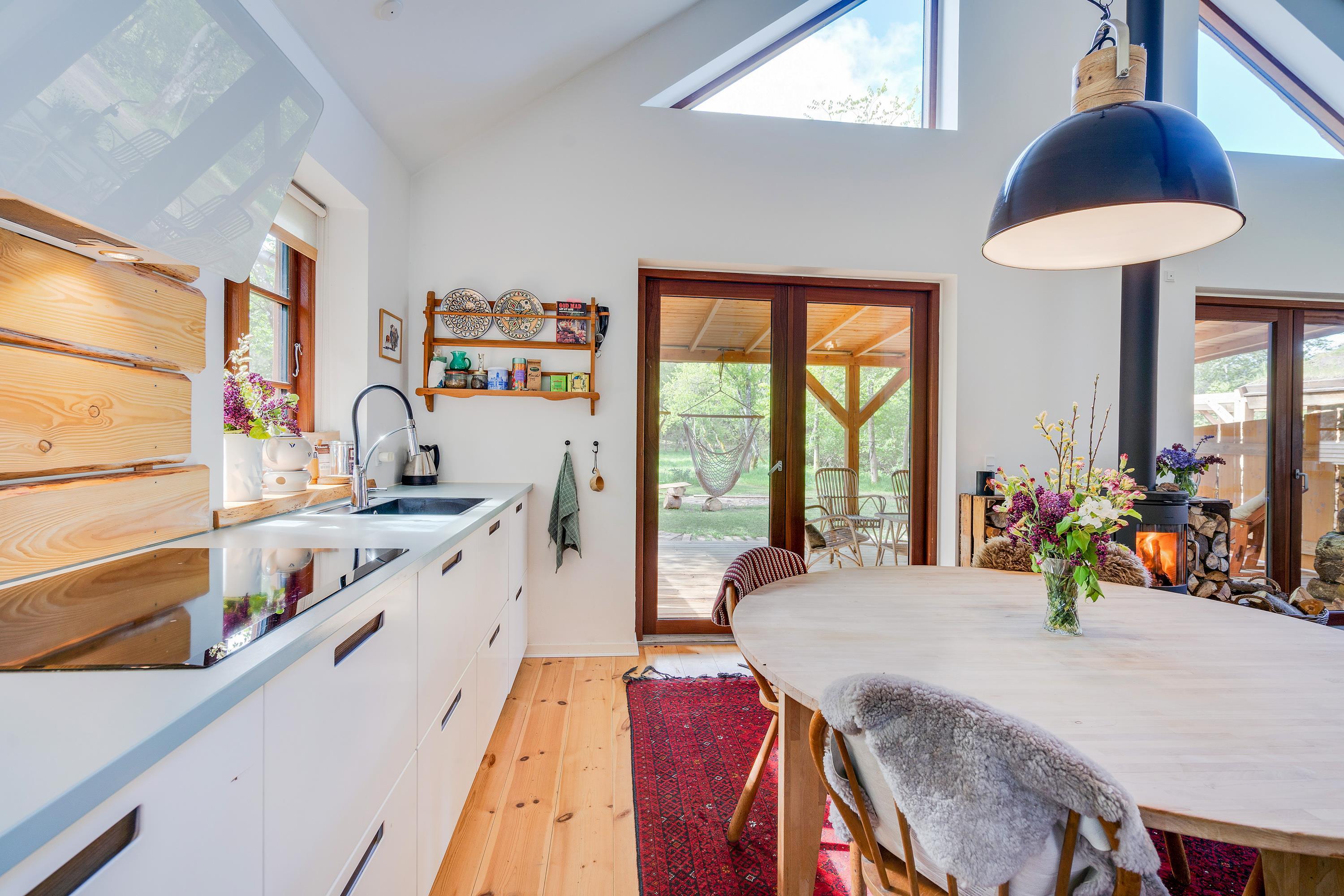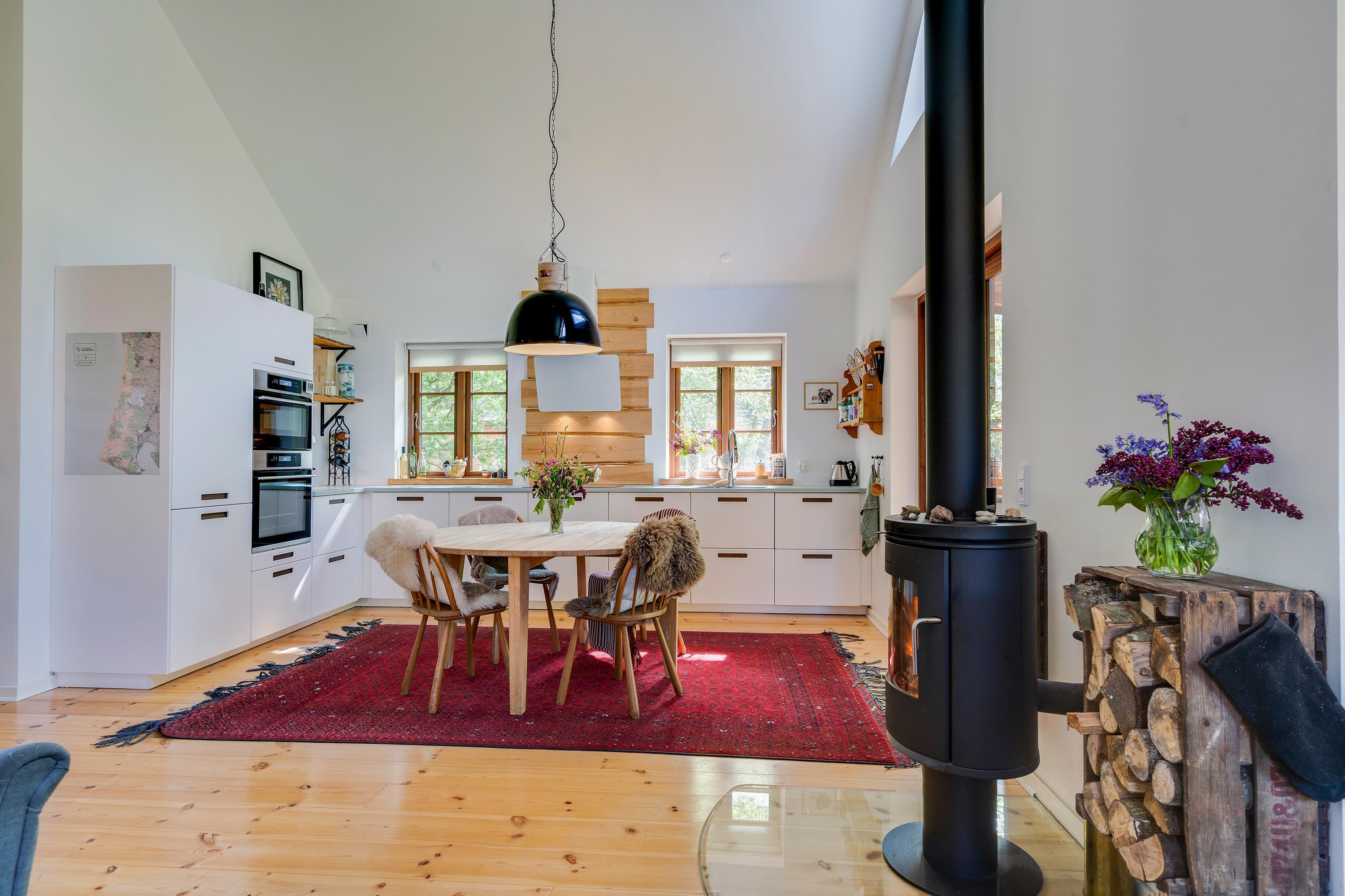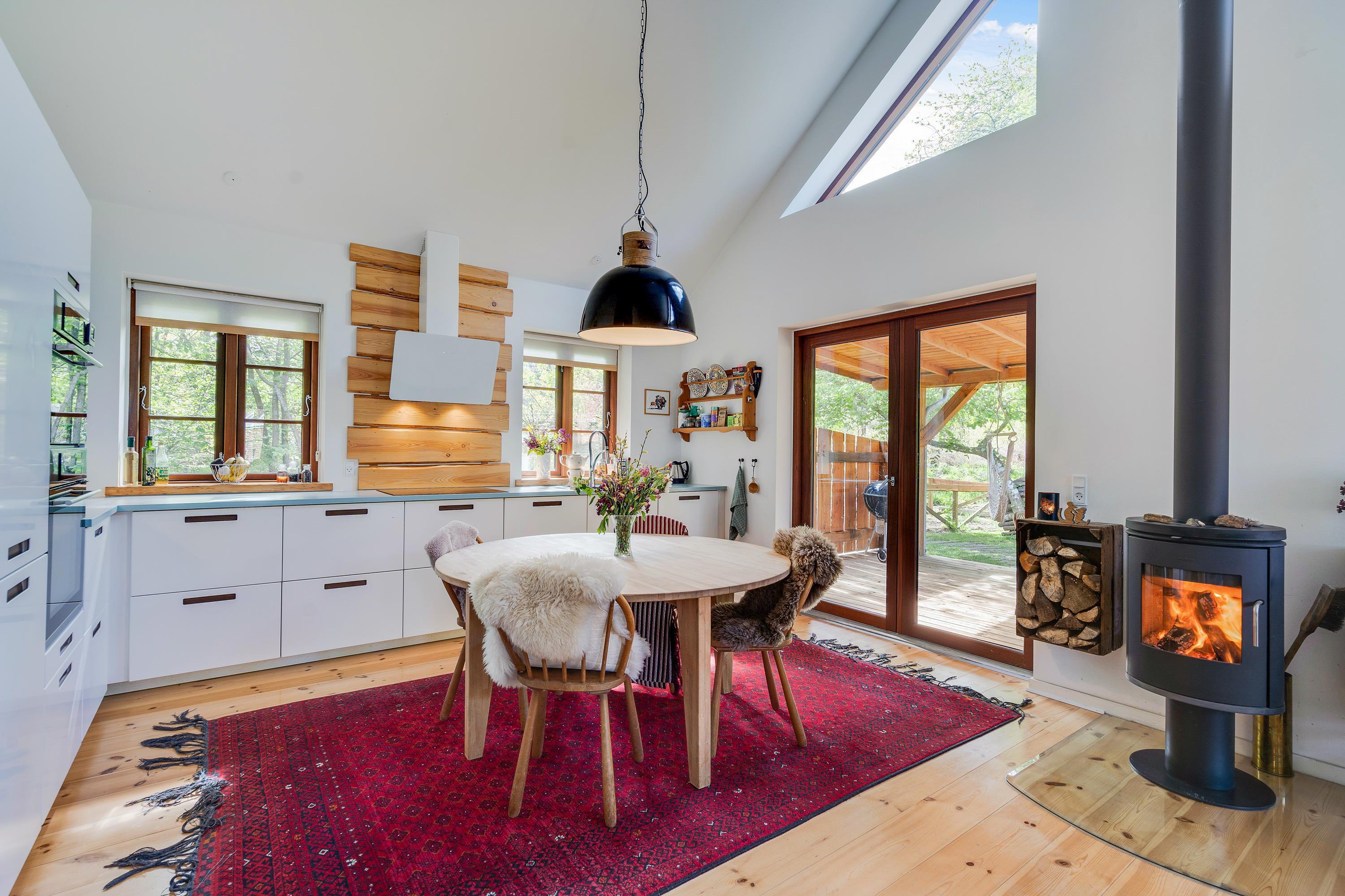 Ferieboligens hjerte er det åbne opholdsrum (med gulvvarme), der kombinerer stue og køkkenalrum i ét samlet rum. Her står desuden sommerhusets brændeovn, som altid sørger for god ferieatmosfære. Fra opholdsrummet har I den fineste udsigt ud til det grønne skovområde gennem de store vinduespartier.