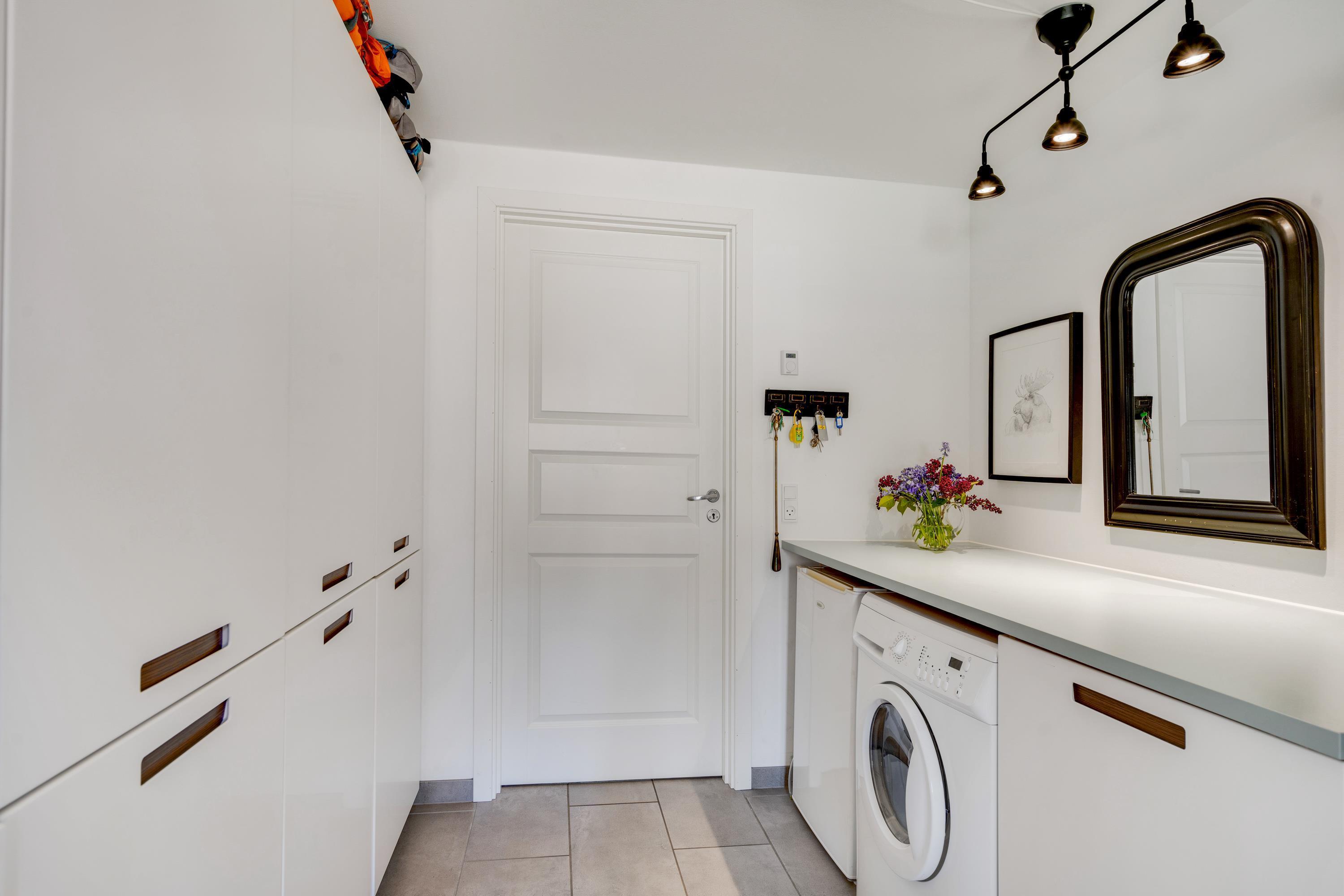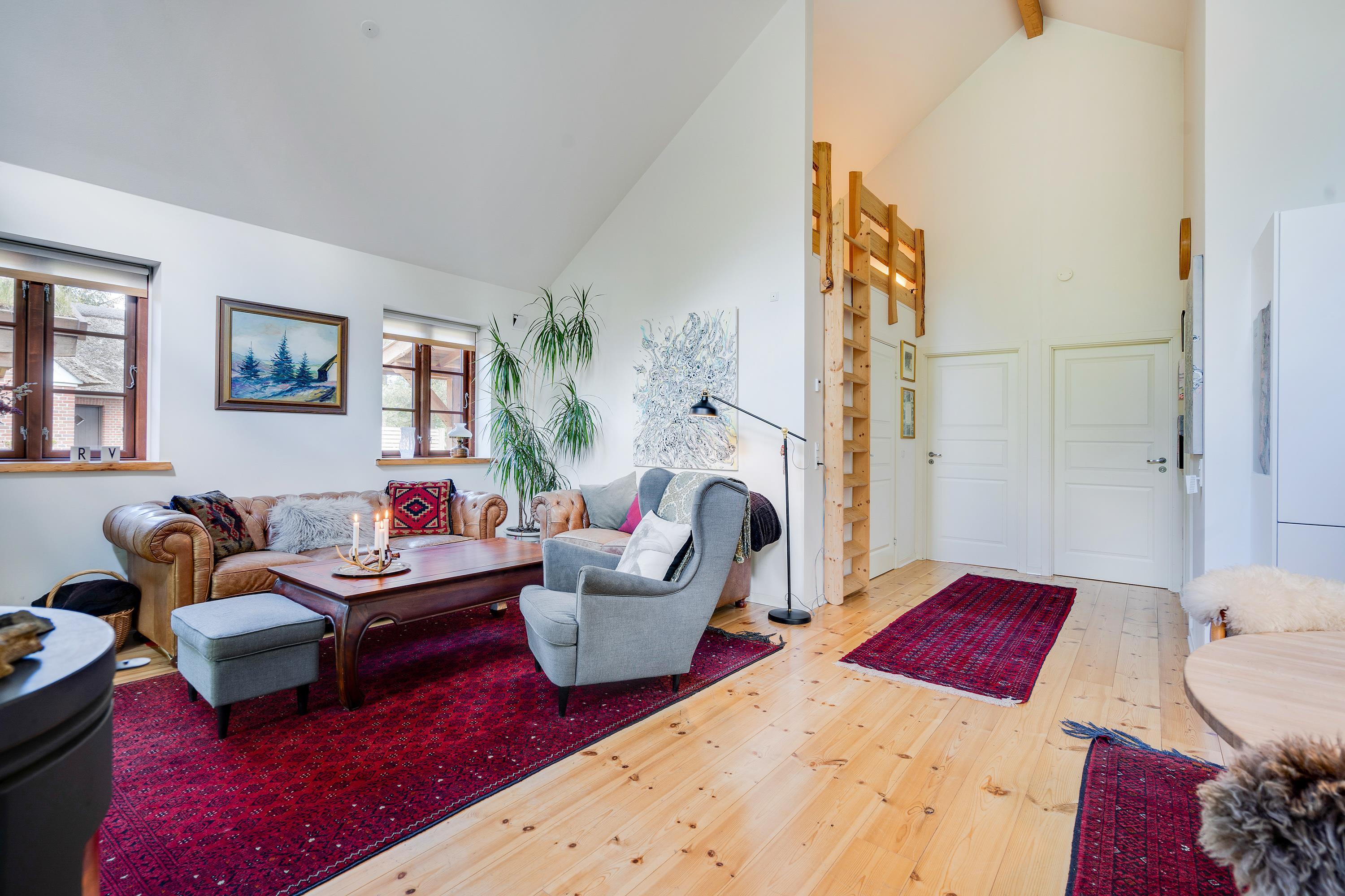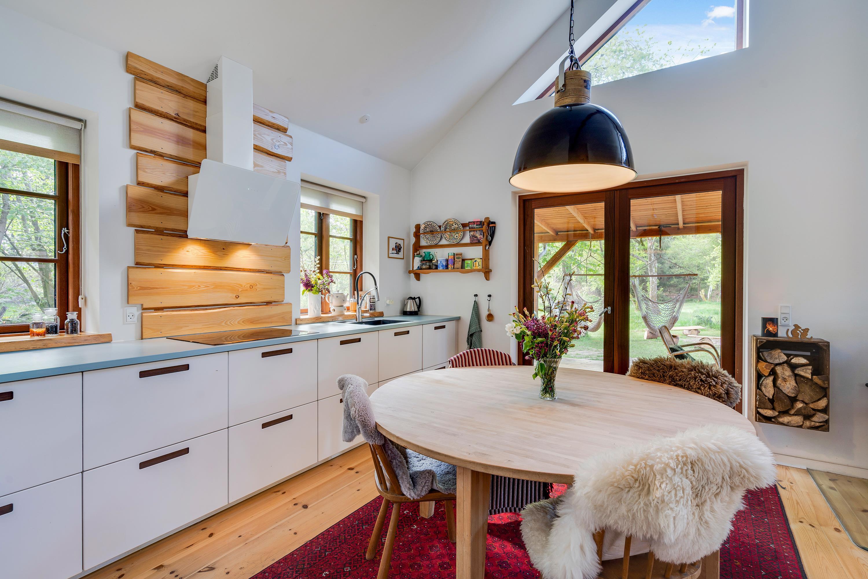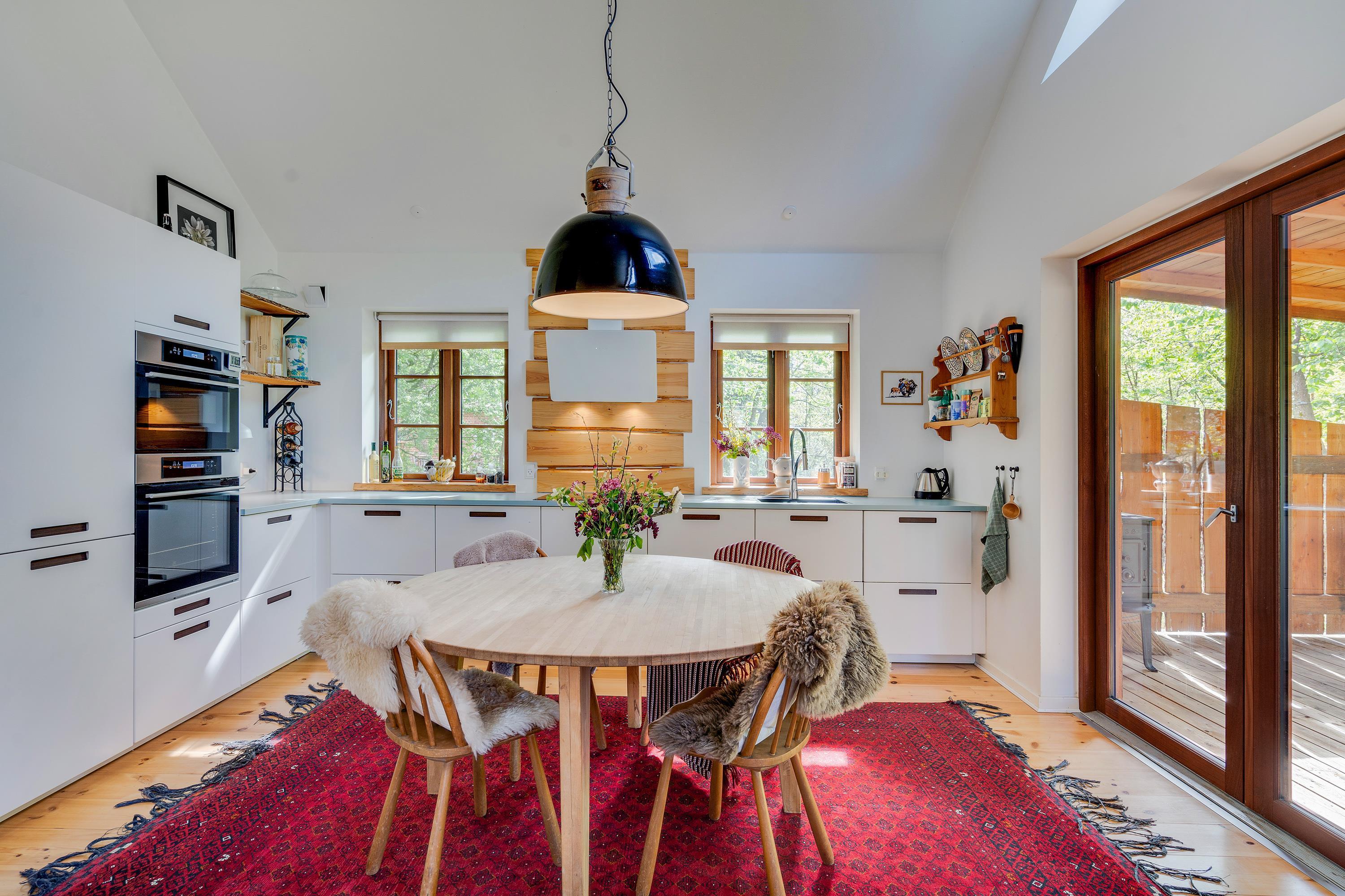 Ferieboligens hjerte er det åbne opholdsrum (med gulvvarme), der kombinerer stue og køkkenalrum i ét samlet rum. Her står desuden sommerhusets brændeovn, som altid sørger for god ferieatmosfære. Fra opholdsrummet har I den fineste udsigt ud til det grønne skovområde gennem de store vinduespartier.