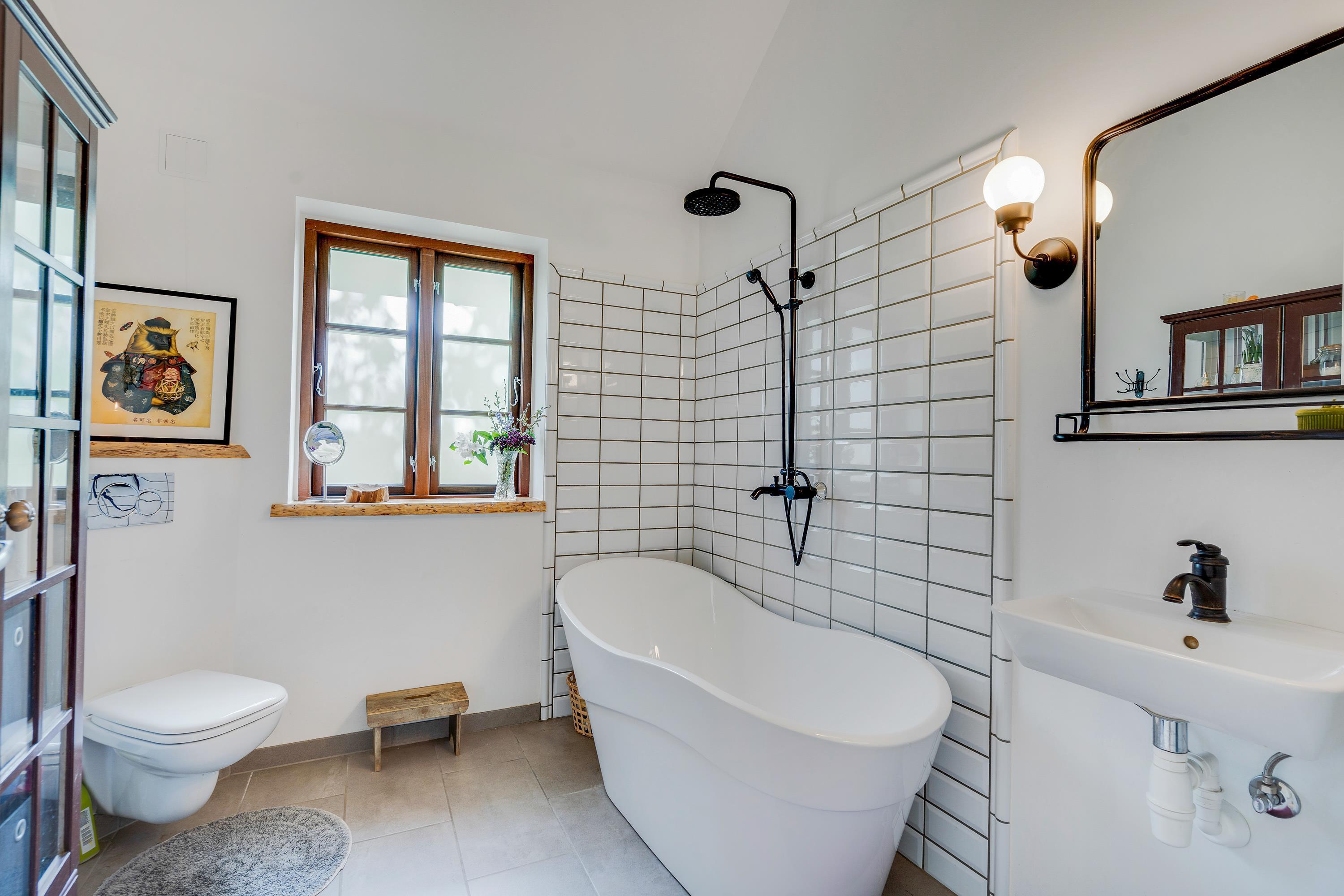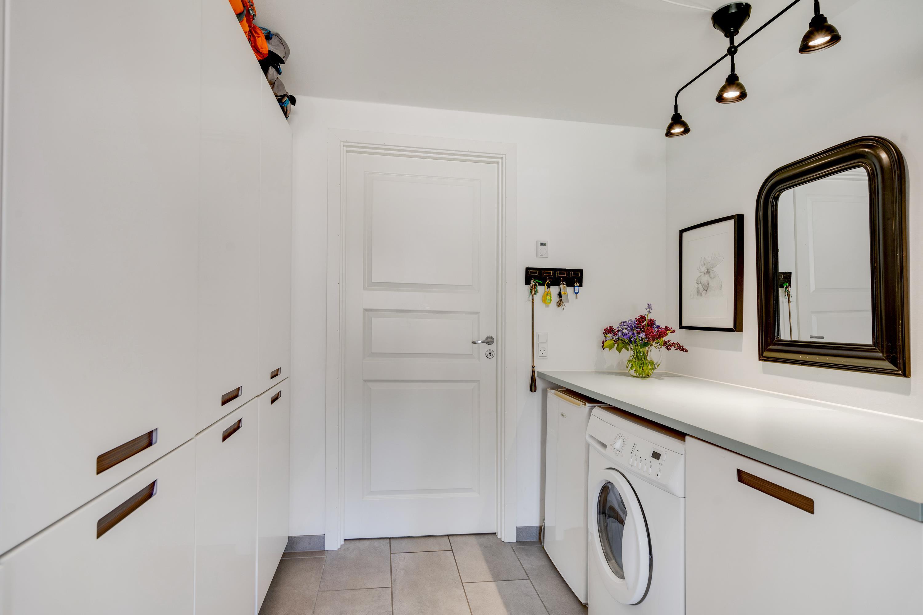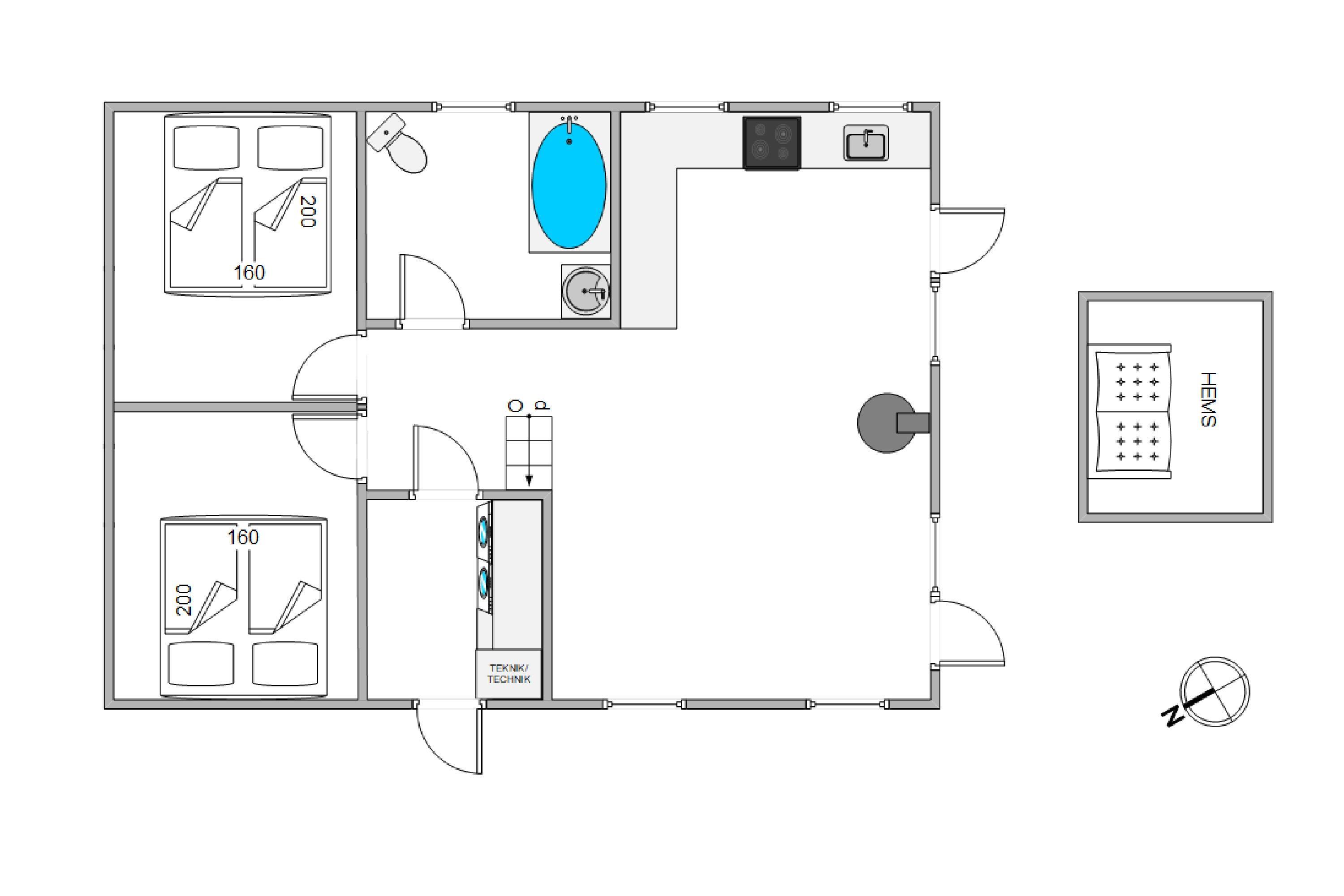 Badeværelset er udstyret med badekar, og der er både opvaskemaskine, vaskemaskine og tørretumbler i sommerhuset. Ud over 2 soveværelser med dobbeltsenge er der en hems med enkeltseng.