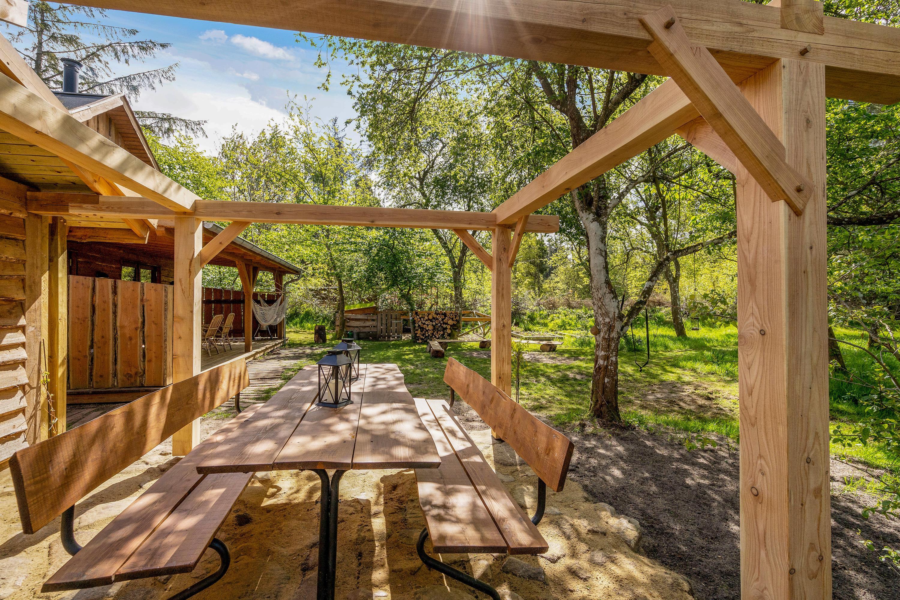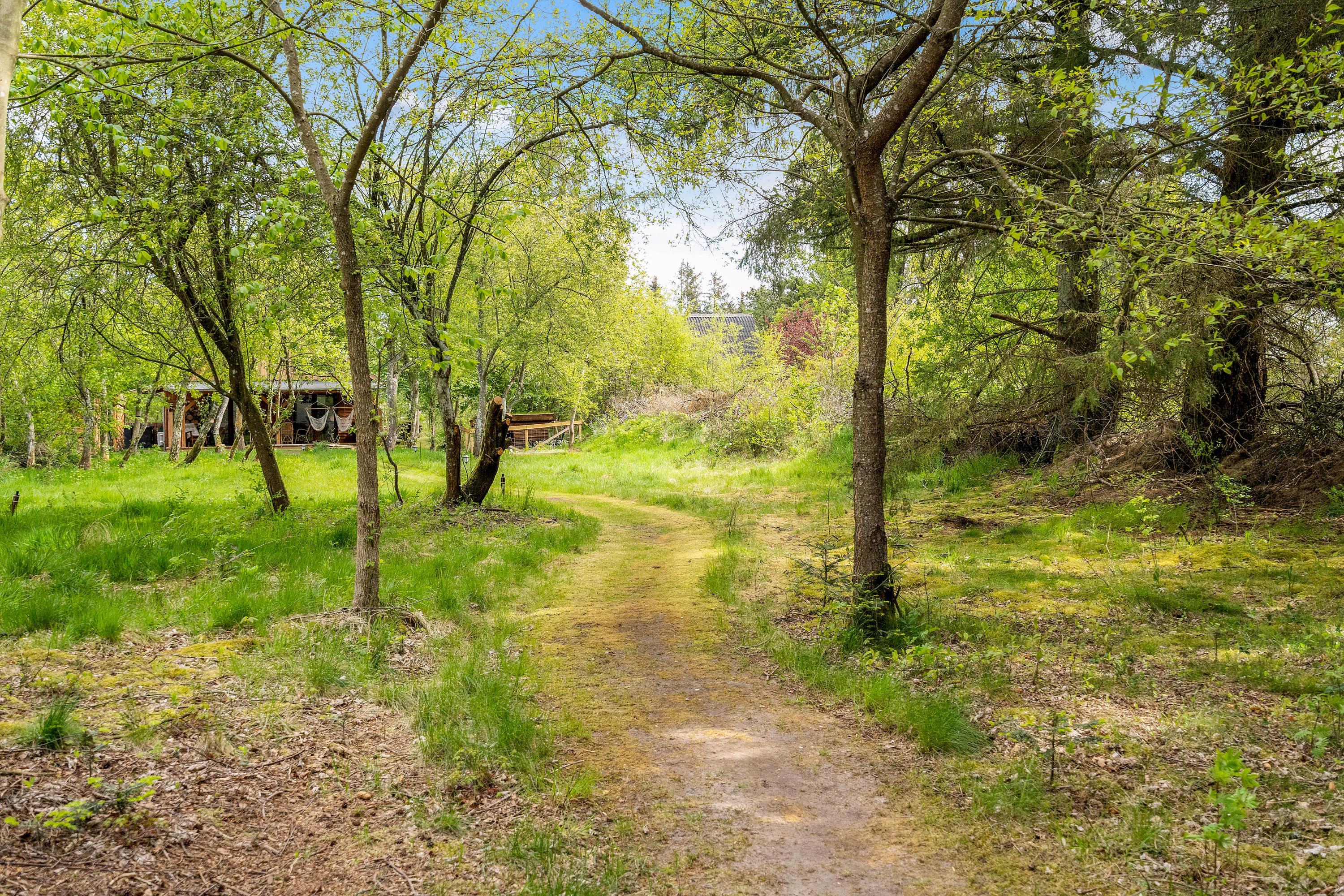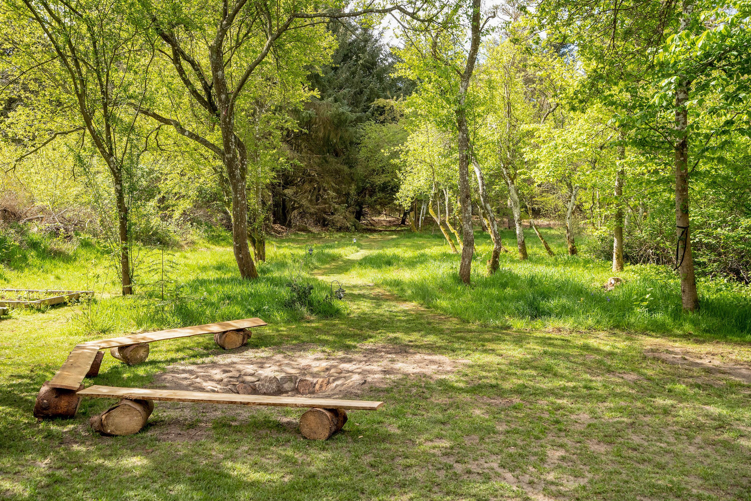 Ugeneret beliggenhed midt i skoven – med gode terrasser, bålplads og hundegård