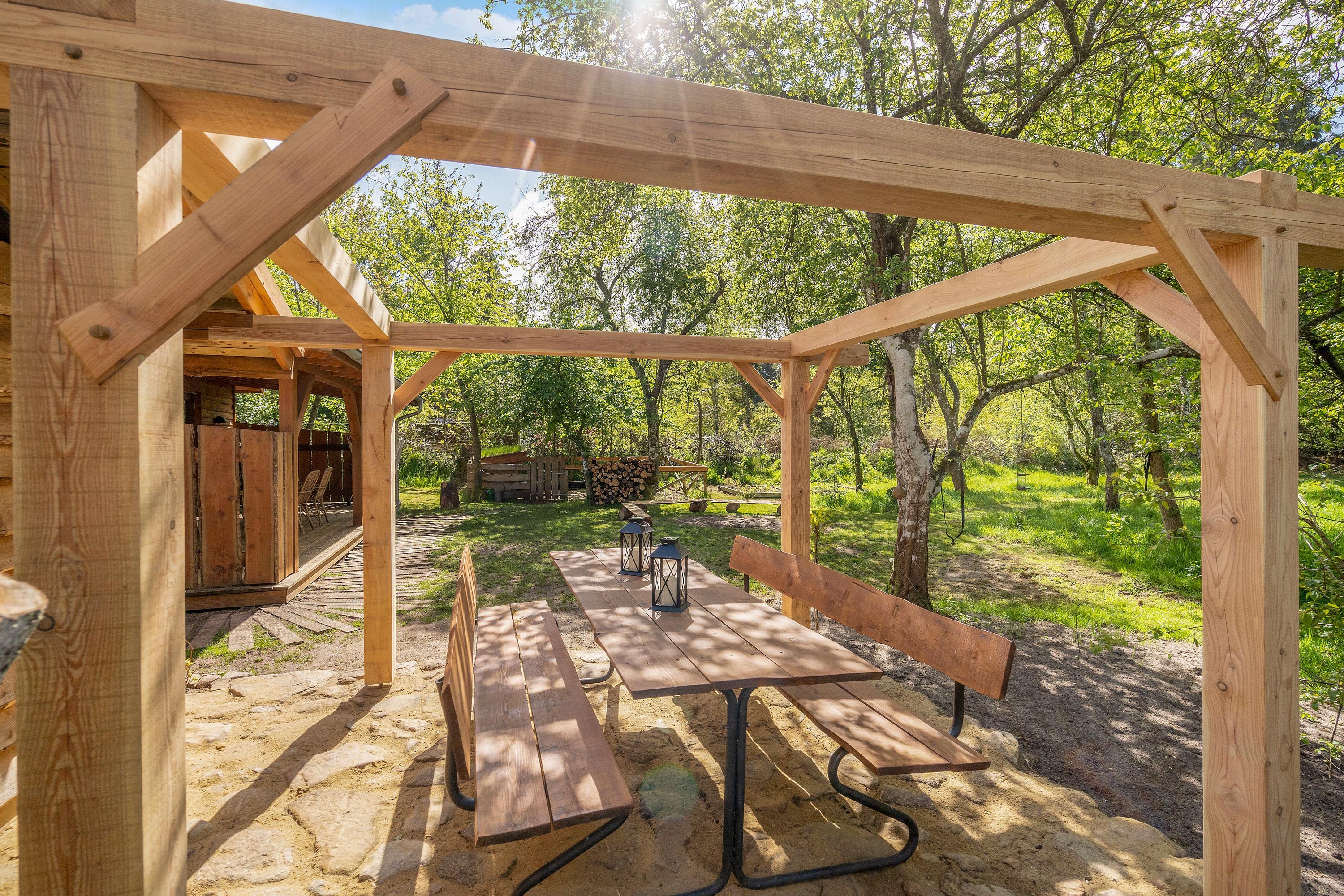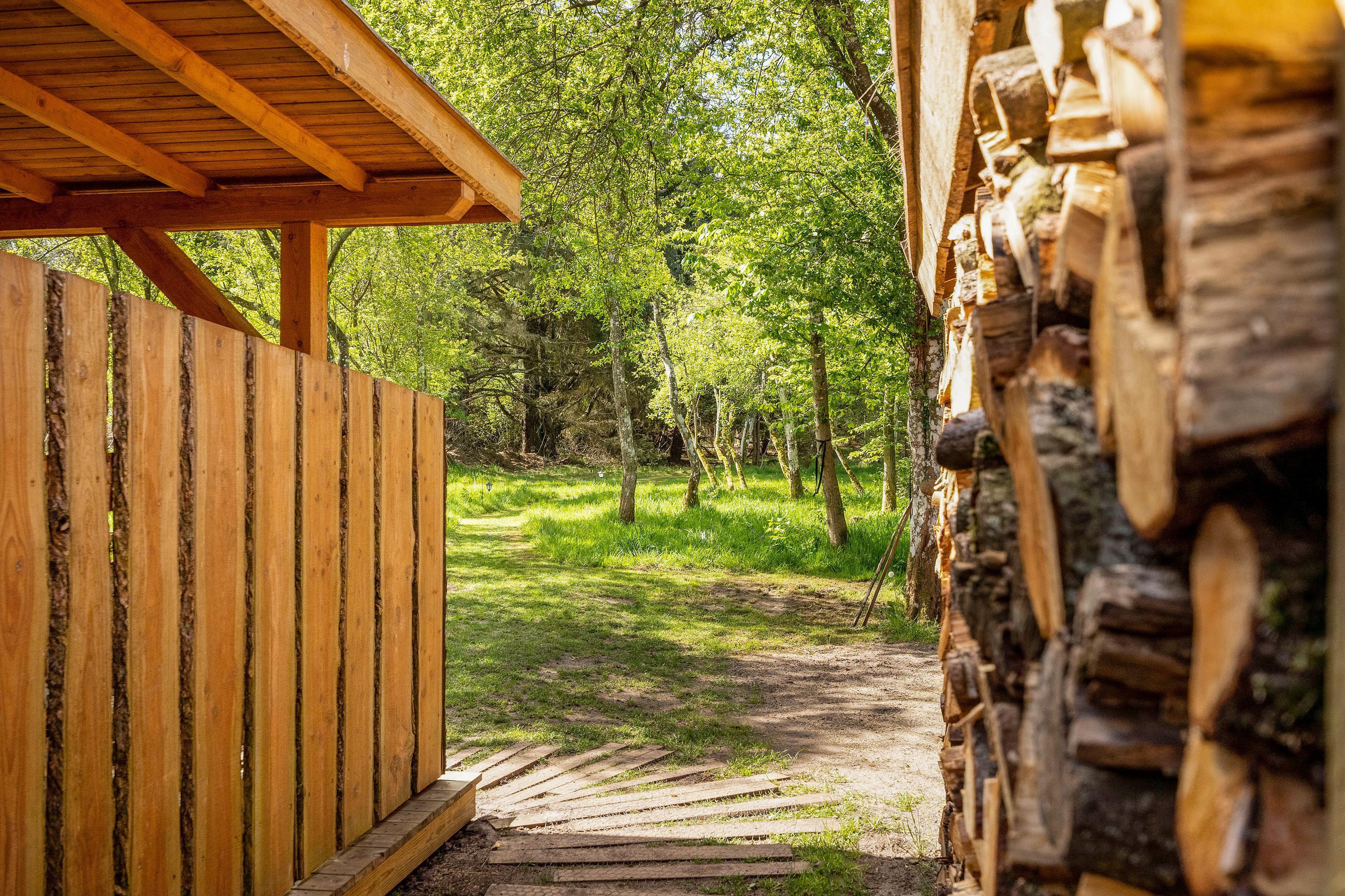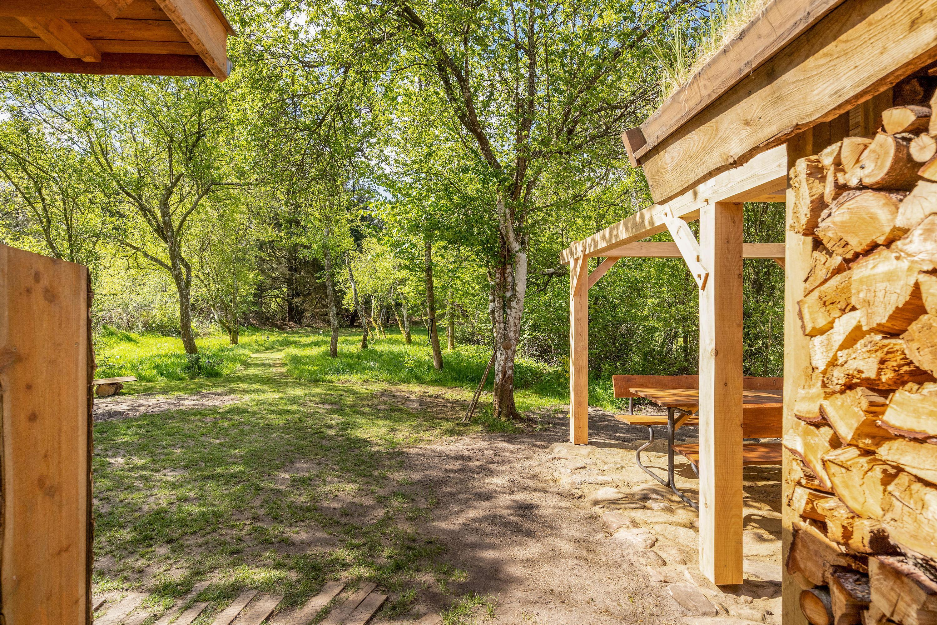 Ugeneret beliggenhed midt i skoven – med gode terrasser, bålplads og hundegård