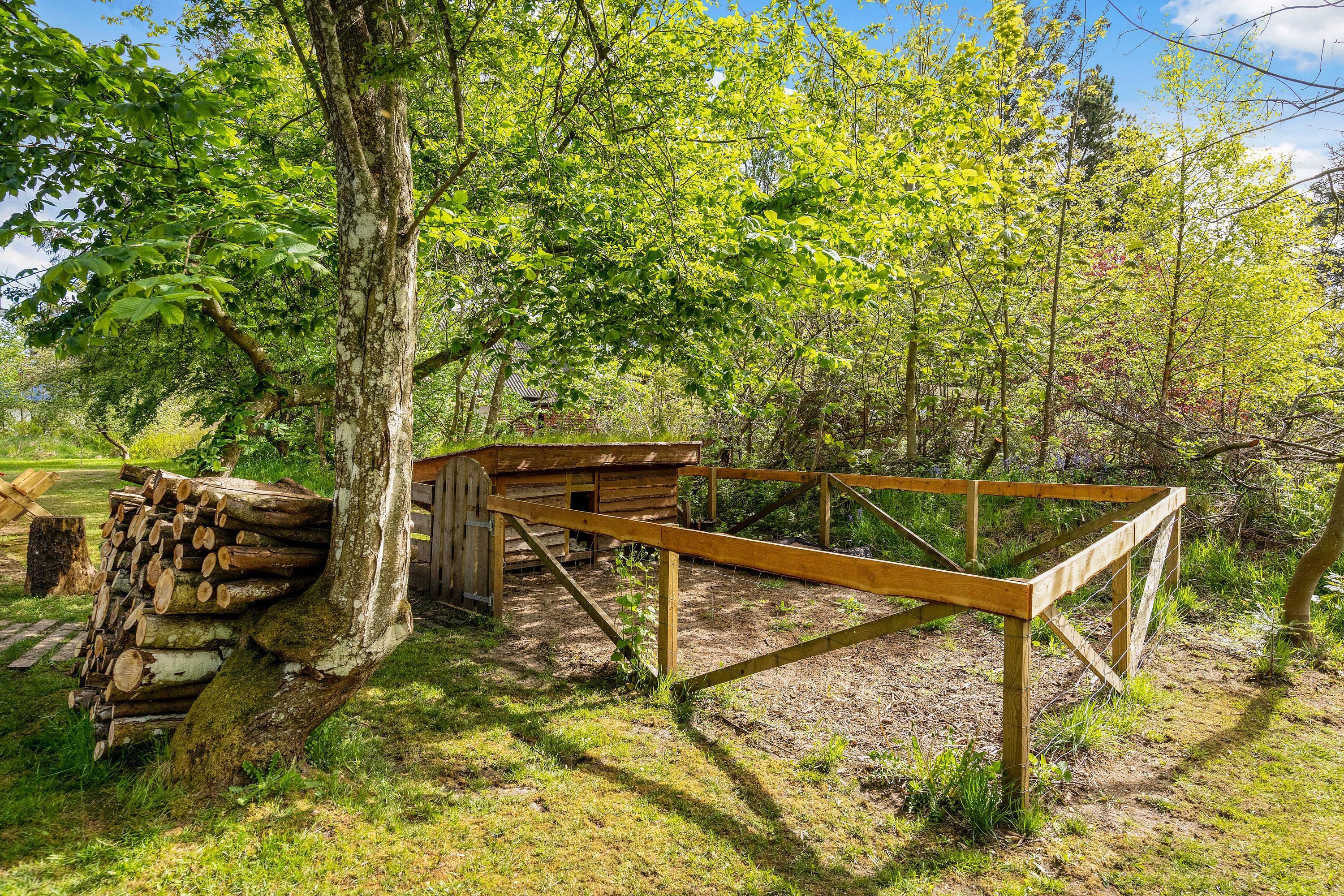 Den sydvendte terrasse med overdækning og afskærmning er en særlig perle, der inviterer til lange aftener i det fri, uanset vejret. For dem, der elsker hyggelige sammenkomster, tilbyder grunden en bålplads, hvor I kan nyde stjernetrunkede nætter omkring ildens skær. Selv jeres kæledyr er der tænkt på med en rummelig hundegård, så alle i familien kan nyde ferien fuldt ud.