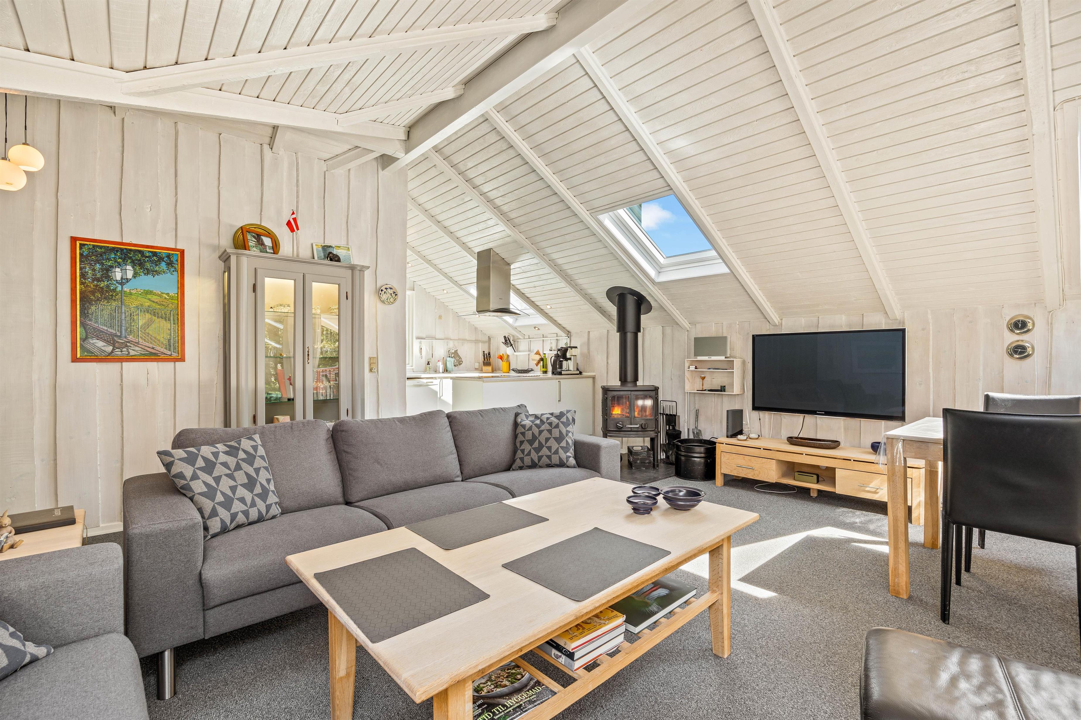 Sommerhuset opvarmes af en varmepumpe, som både er godt for miljøet og indeklimaet. Når hyggen skal helt til tops, kan I tænde op i brændeovnen og nyde varmen fra de dansende flammer, mens sommerhusstemningen spreder sig.