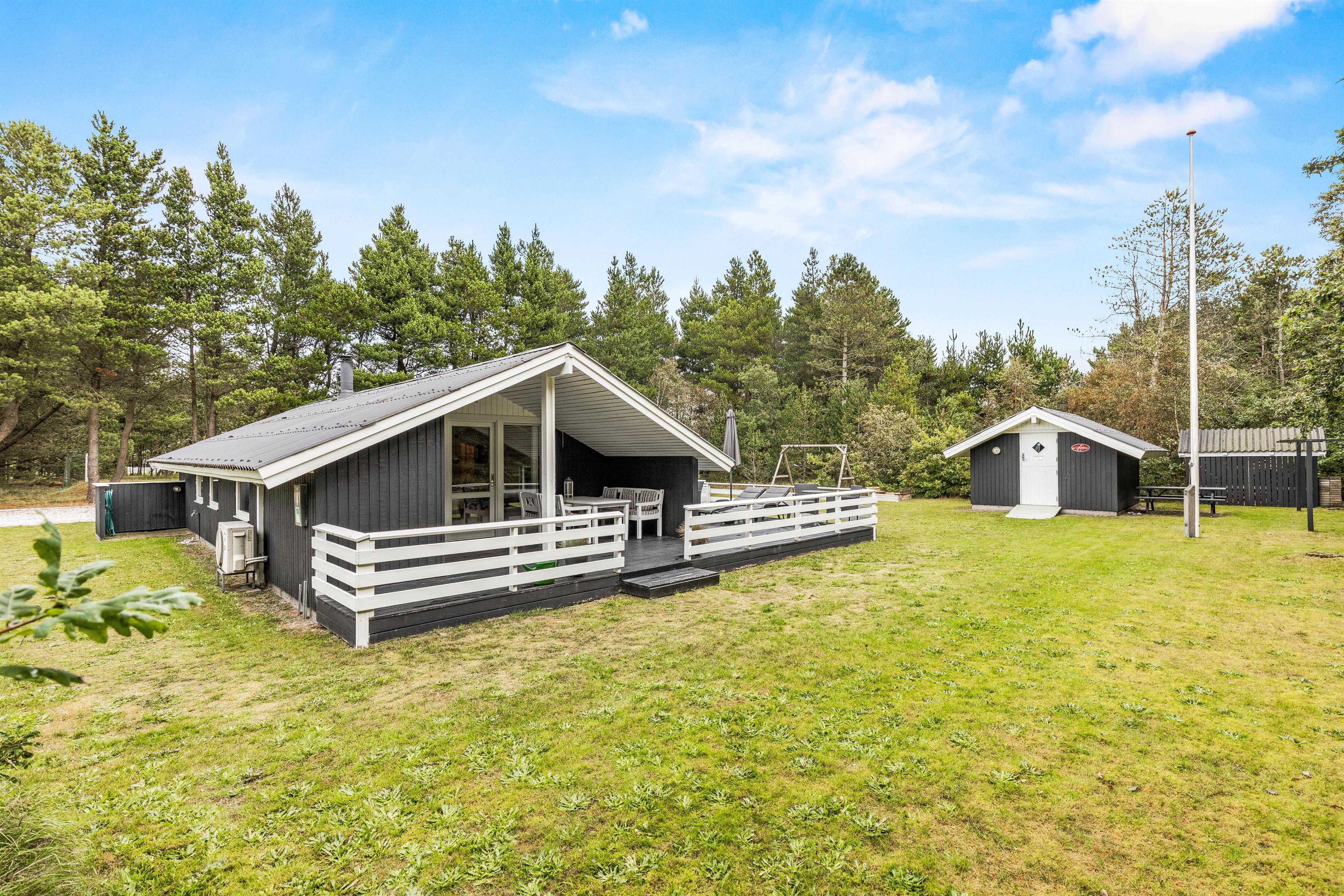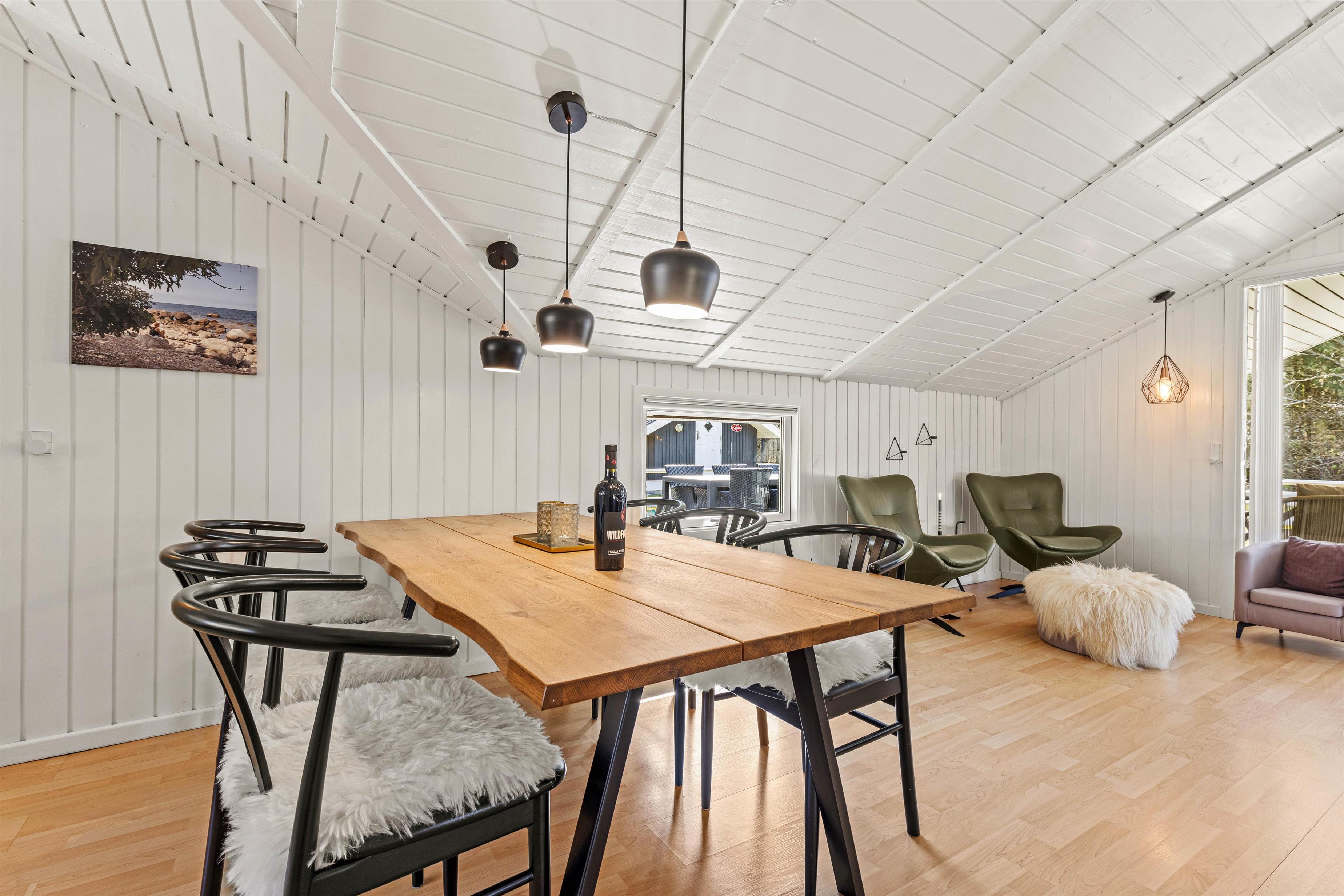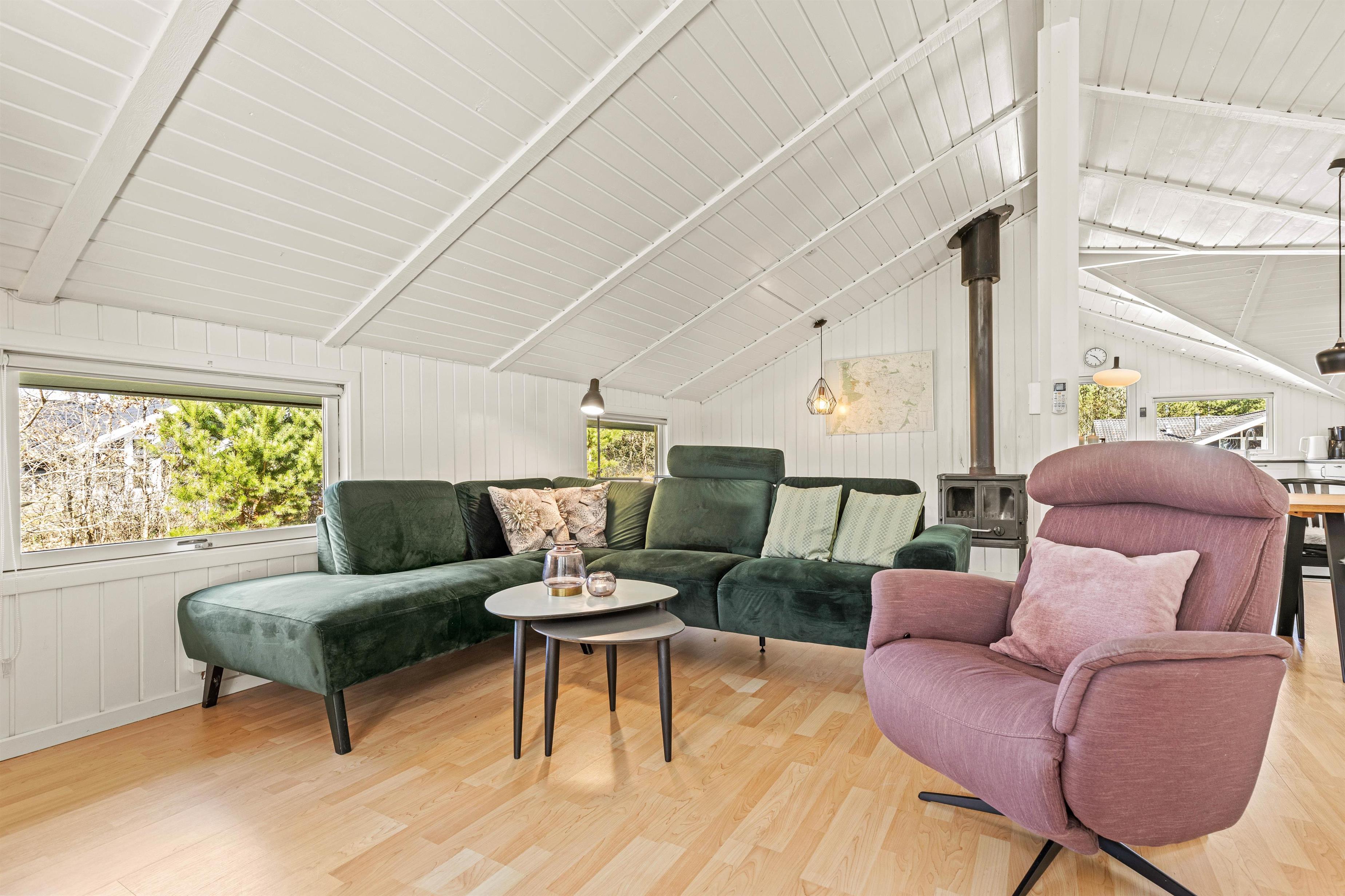 Den hyggeskabende brændeovn er nærmest et ”must” for den rigtige feriestemning i den koldere årstid. For energirigtig behageligt indeklima sørger varmepumpen naturligvis. Sommerhuset er udstyret med Chromecast, så I kan nyde jeres yndlingsfilm og -serier på ferien.