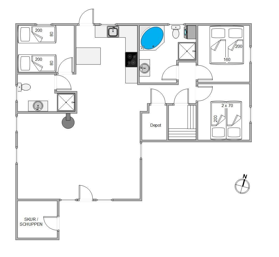 Husets lyse og hyggelige stue og køkken er i 2019 blevet renoveret. I det største af de 2 badeværelser er der mulighed for ekstra afslapning og hygge – tænd op i spaen og nyd det varme boblende vand.
