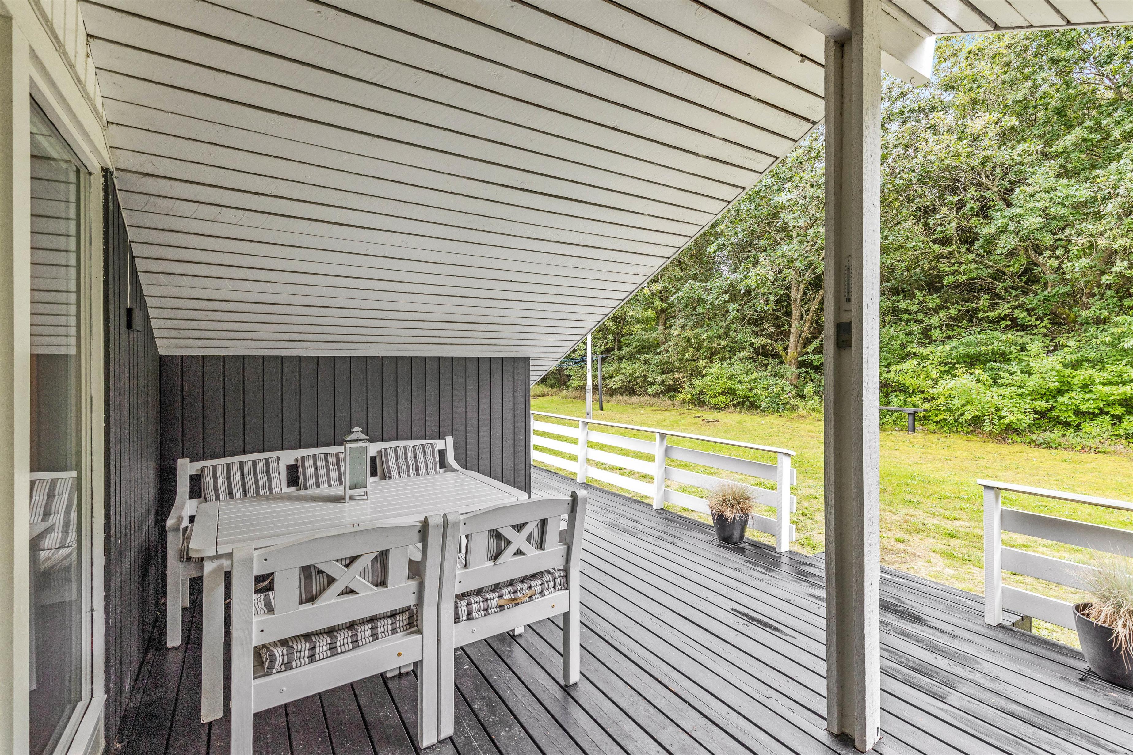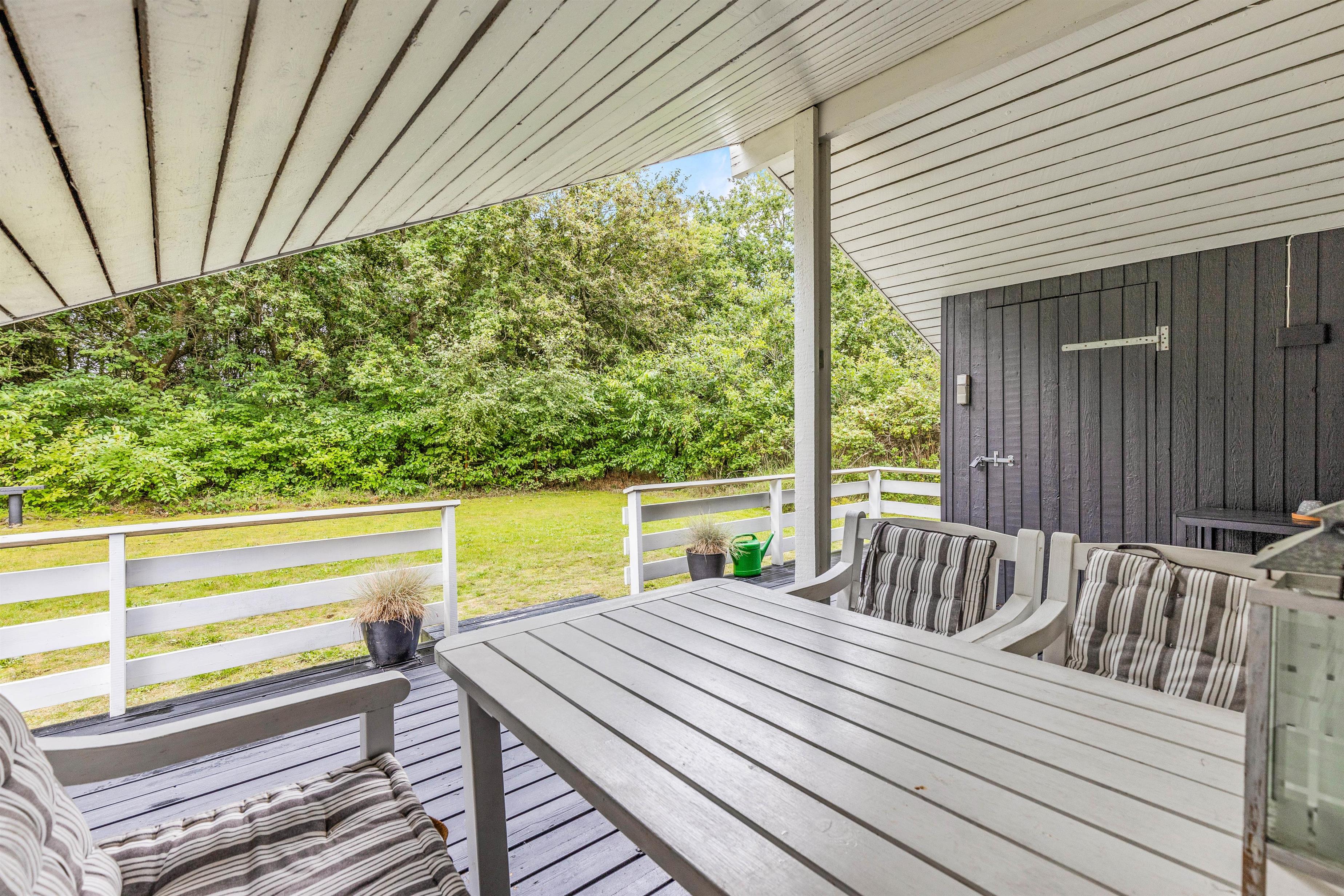 Fra stuen er der direkte udgang til den delvist overdækkede terrasse. Her kan I nyde dagens første kop kaffe men også finde sammen om aftenen og nyde lidt grillmad.