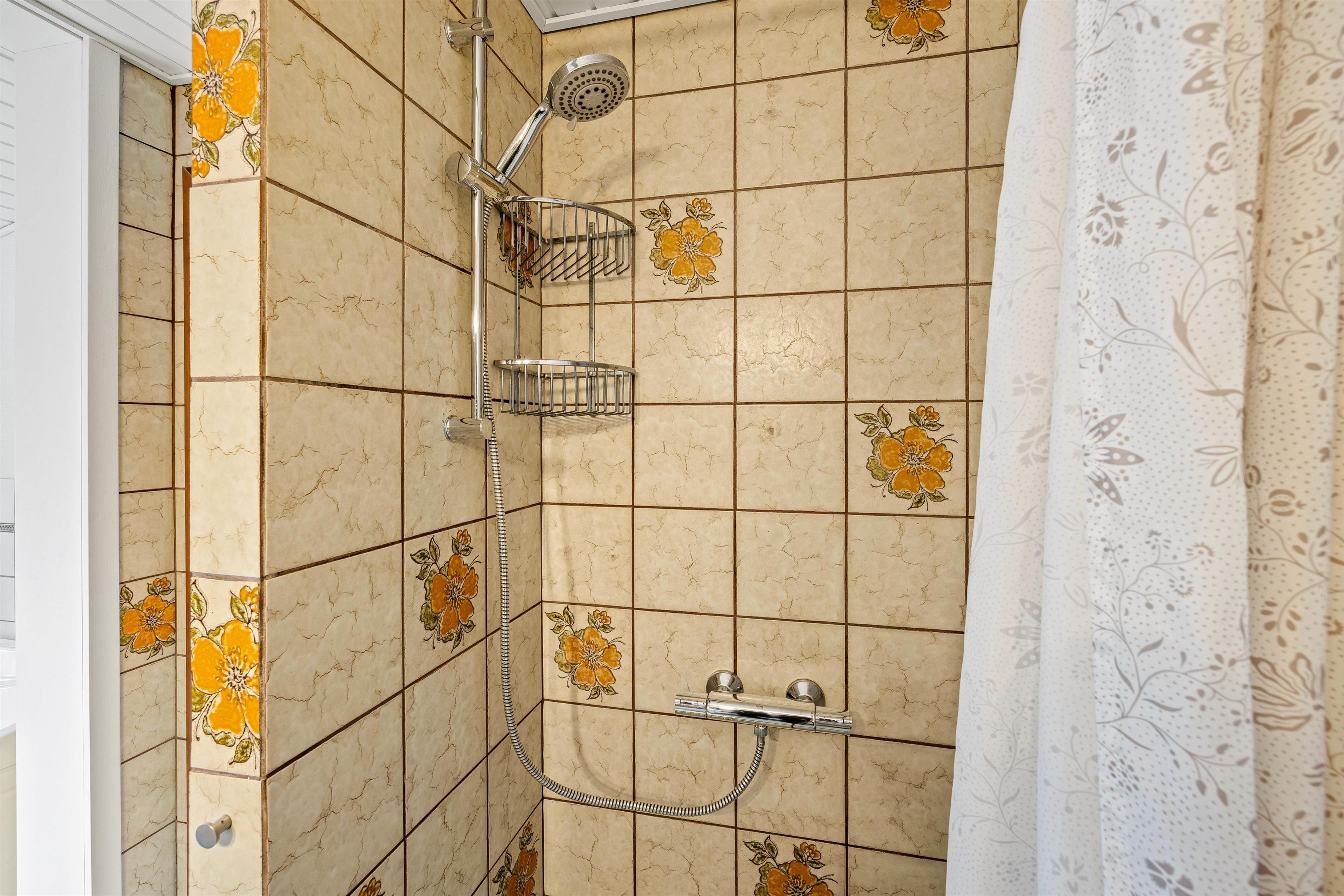 Badeværelset er indrettet med behagelig gulvvarme, hvor I kan nyde en afslappende stund i tømmespaen eller saunaen efter en dag med sjove mountainbike-oplevelser i Blåbjerg Plantage. For at sikre et bekvemt ophold er der også en vaskemaskine til rådighed, så I nemt kan holde garderoben opdateret gennem hele ferien.