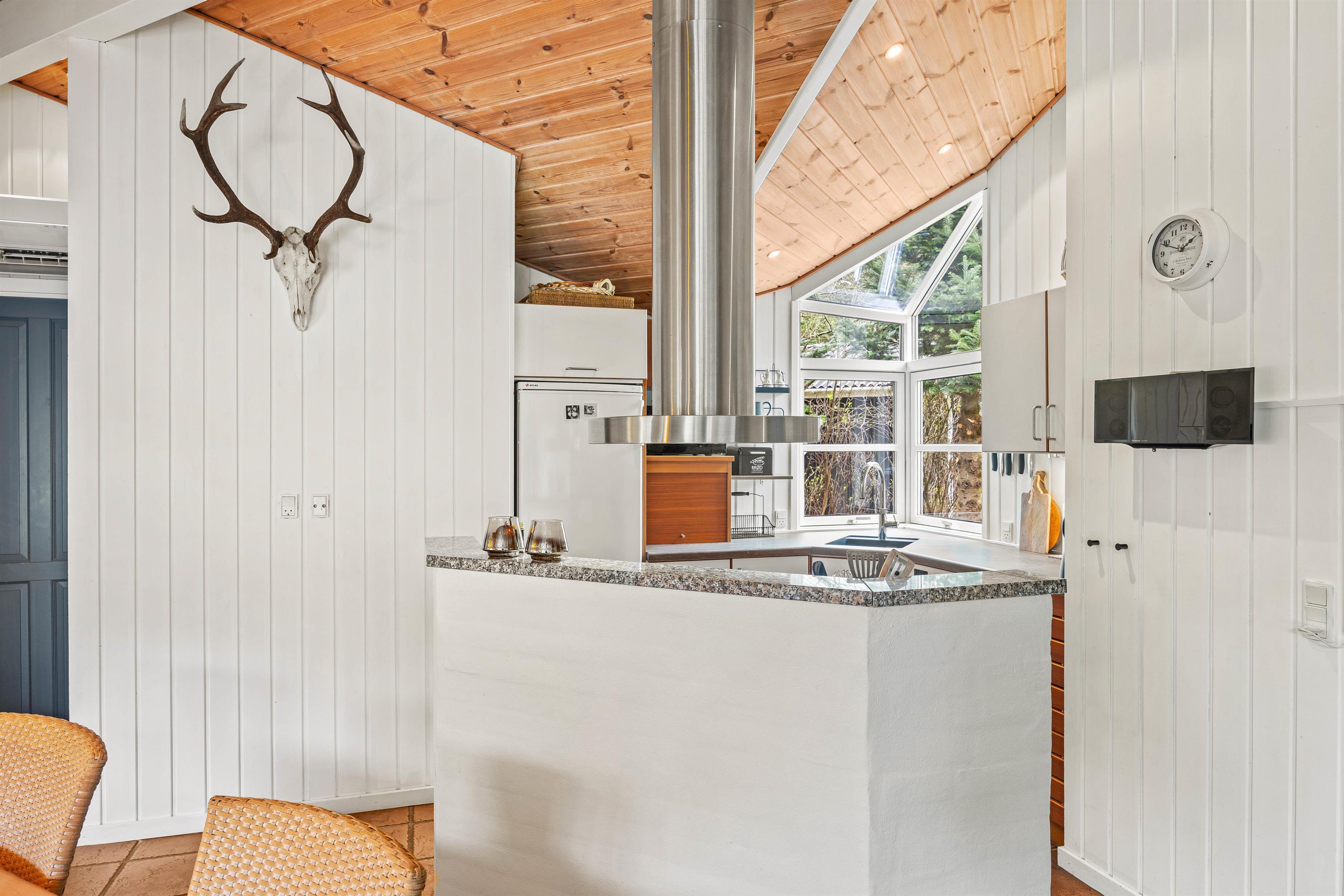Den rummelige stue er indrettet med en behagelig stor sofa, hvor hele familien kan samles til afslappende stunder- mens I lytter til knitren fra feriehusets brændeovn. Det åbne køkken, der ligger i direkte forlængelse af stuen, skaber en hyggelig atmosfære, hvor madlavning bliver til fællesskab, mens andre måske nyder et kortspil ved spisebordet. I det tilstødende rum kan I også afholde turneringer i bordfodbold og spille om hvem, der laver aftensmaden.