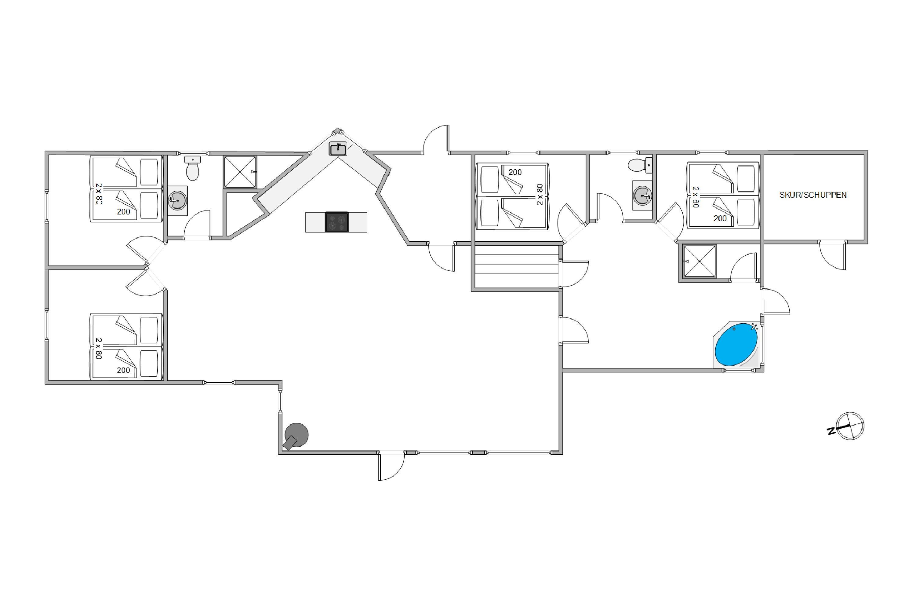Med fire hyggelige soveværelser, alle indrettet med komfortable dobbeltsenge, er der rigeligt med plads til hele familien eller en gruppe venner. Efter en god nats søvn kan I vågne op og forberede jer på en dag fyldt med spændende oplevelser i det nærliggende område. Og når I vender tilbage efter en dag fyldt med eventyr i Houstrups betagende natur, vil I sætte pris på både sauna og spa, hvor I kan lade stress og bekymringer forsvinde i ren afslapning.