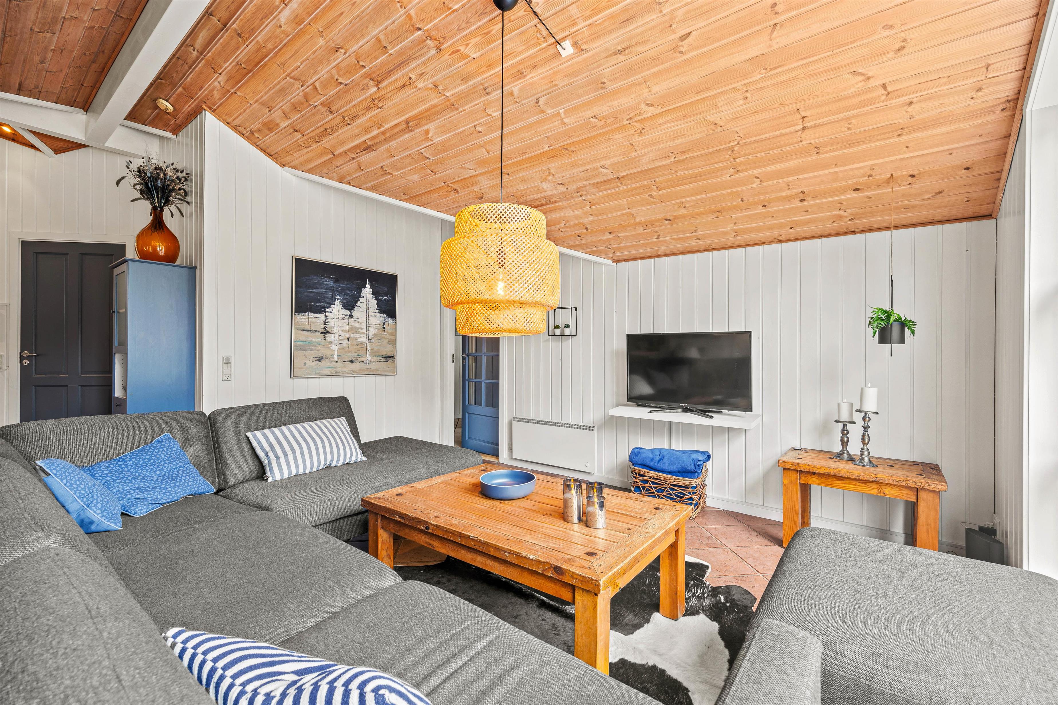 Med masser af naturligt lys og højt til loftet skaber sommerhusets indretning en følelse af luftighed og rummelighed, hvilket gør det til det ideelle sted for både mennesker og hunde at slappe af og nyde hinandens selskab.