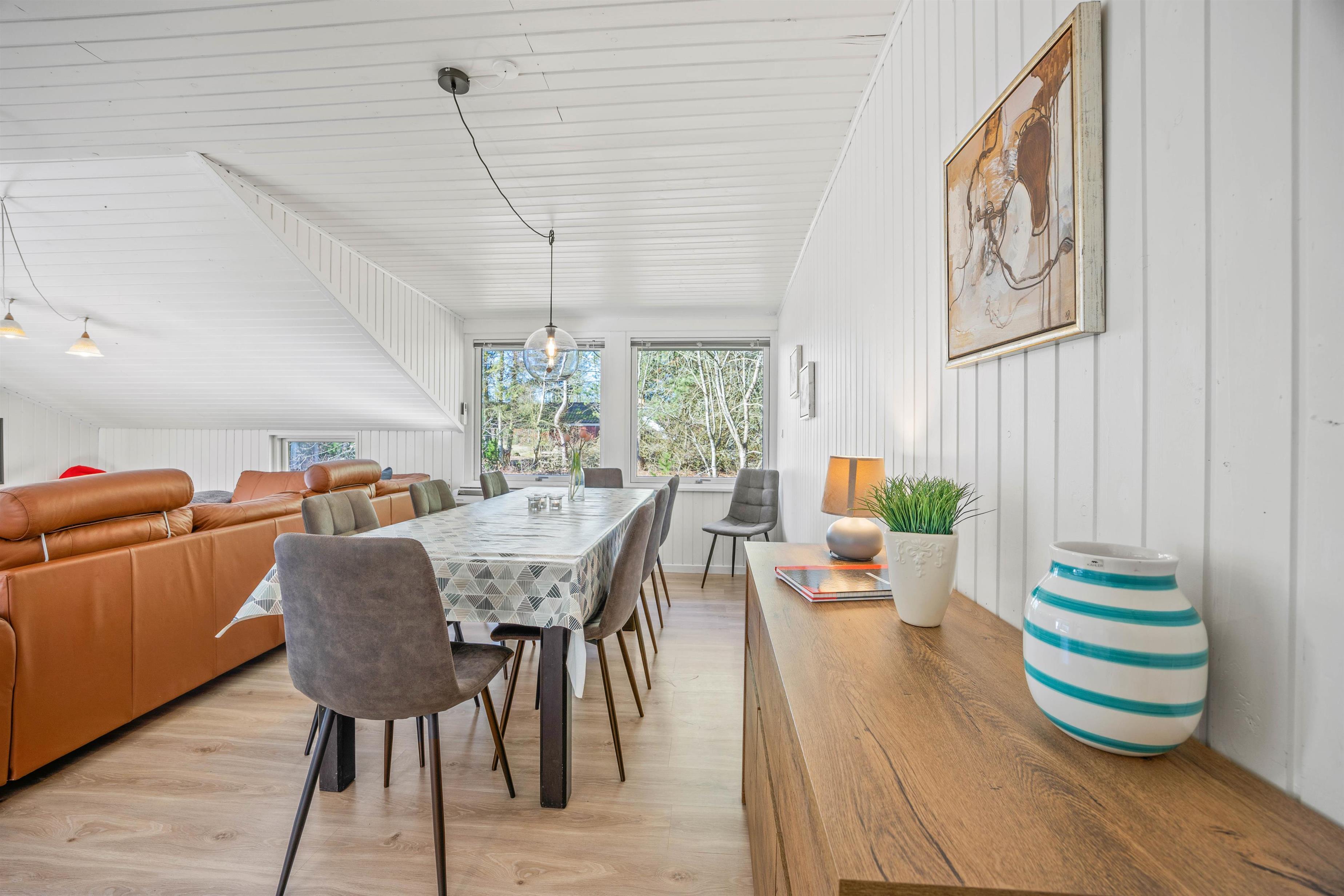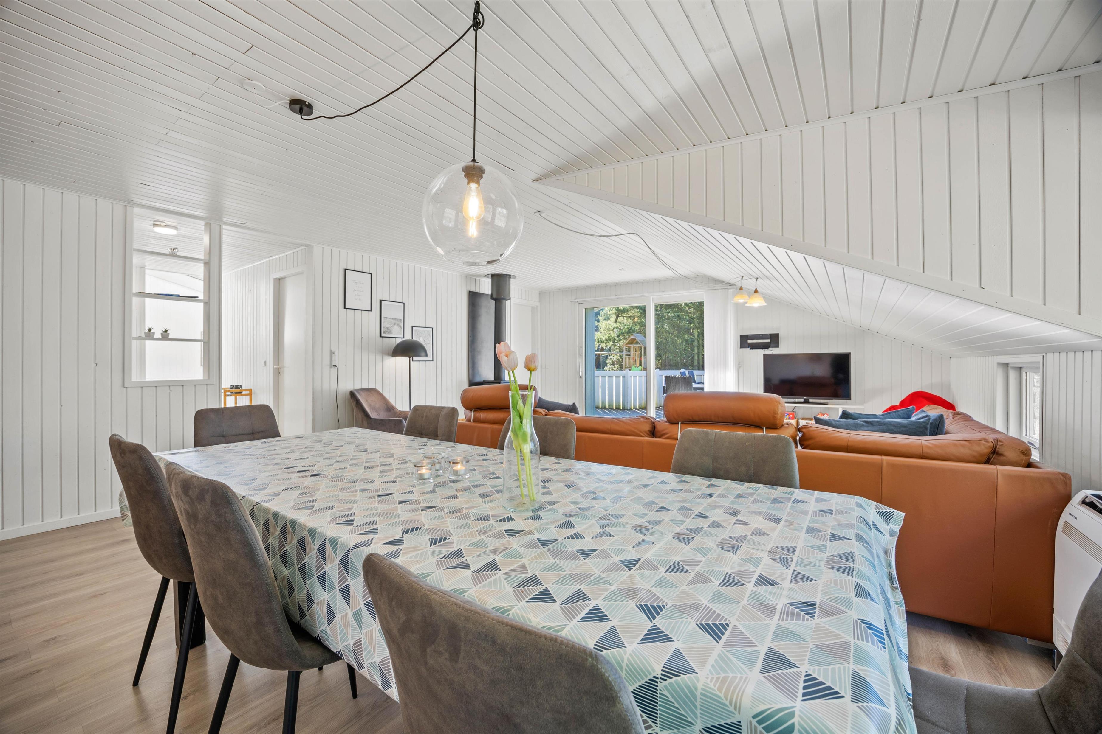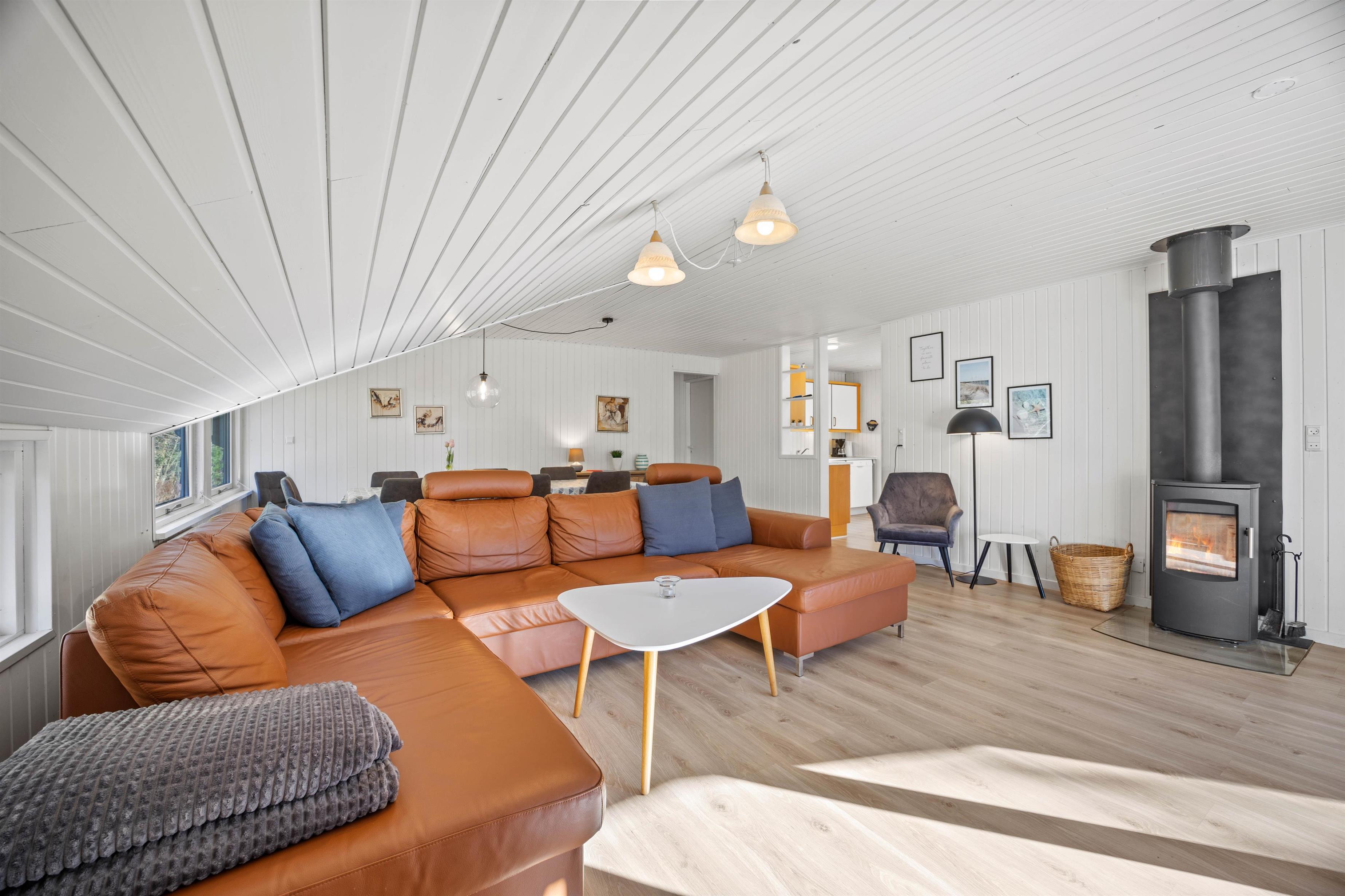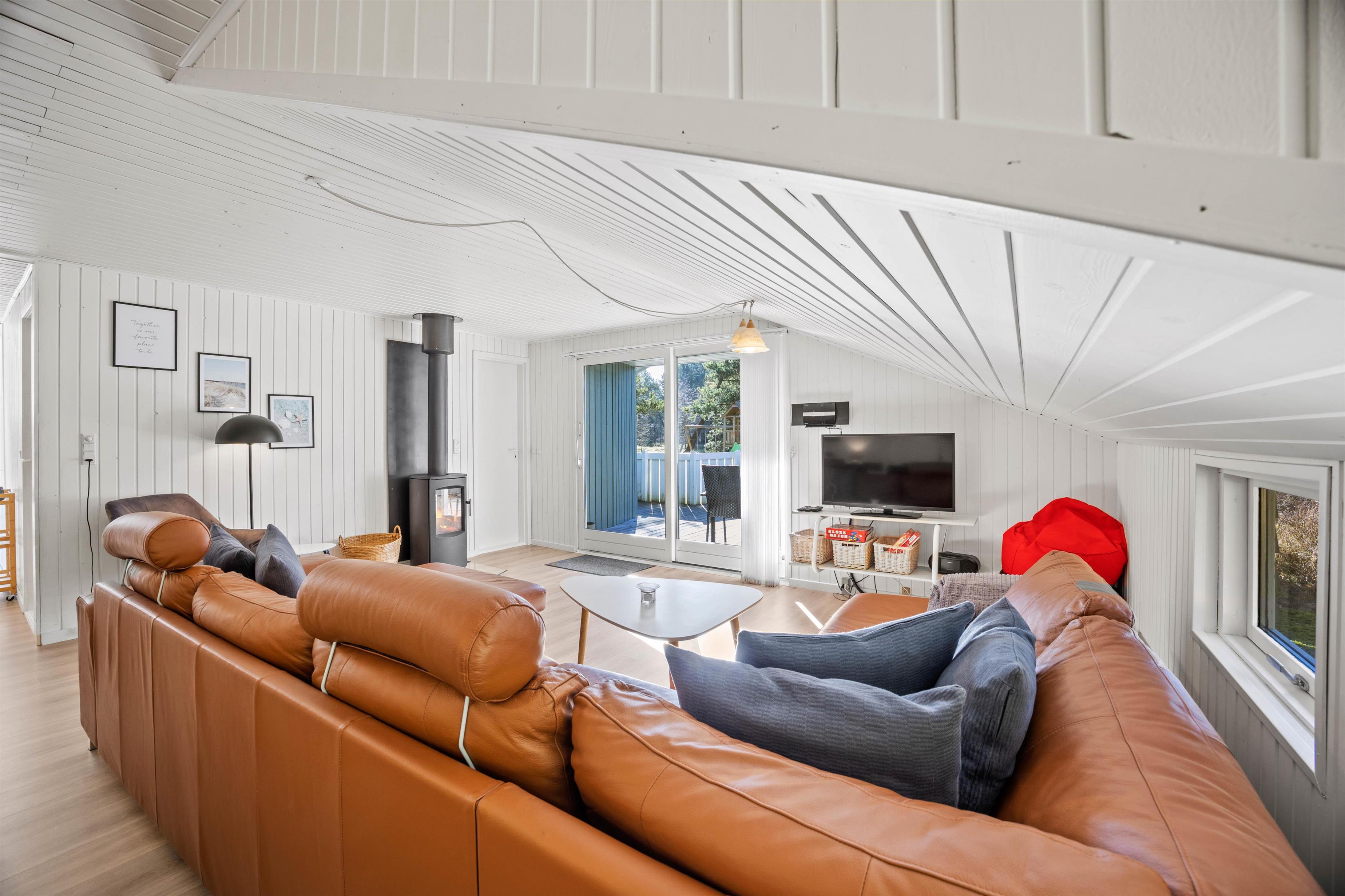 Til hyggelige feriestunder og dejligt samvær kan familierne samle sig i sommerhusets opholdsrum. Her kan I spille hyggelige brætspil eller se en god film i tv’et. Skal der skrues ekstra op for hyggen, kan I tænde op i brændeovnen, der også sørger for ekstra varme i sommerhuset, der ellers opvarmes af en energivenlig varmepumpe.