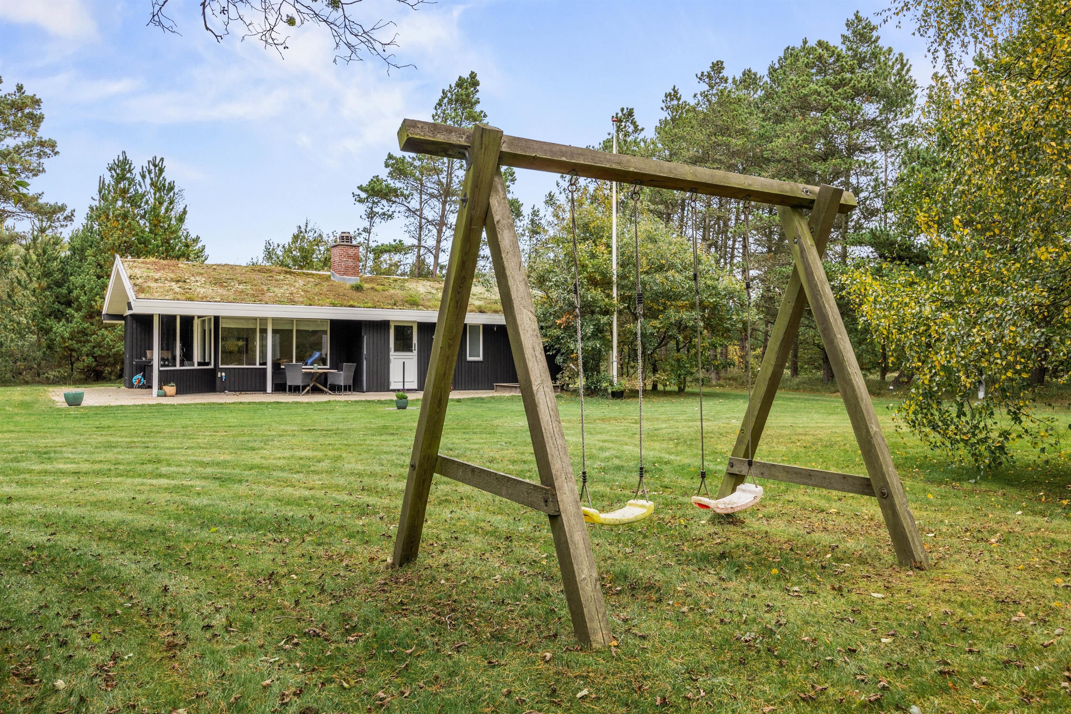 Fra den hyggelige spisestue kommer I ud på terrassen, som næsten fortsætter rundt om hele huset. På den store græsplæne med gynge og sandkasse samt 2 små fodboldmål, er der plads til masser af boldspil og leg for børnene, og I kan nemt holde øje med dem fra havestolene, mens I læser en bog eller nyder et glas vin i solen.