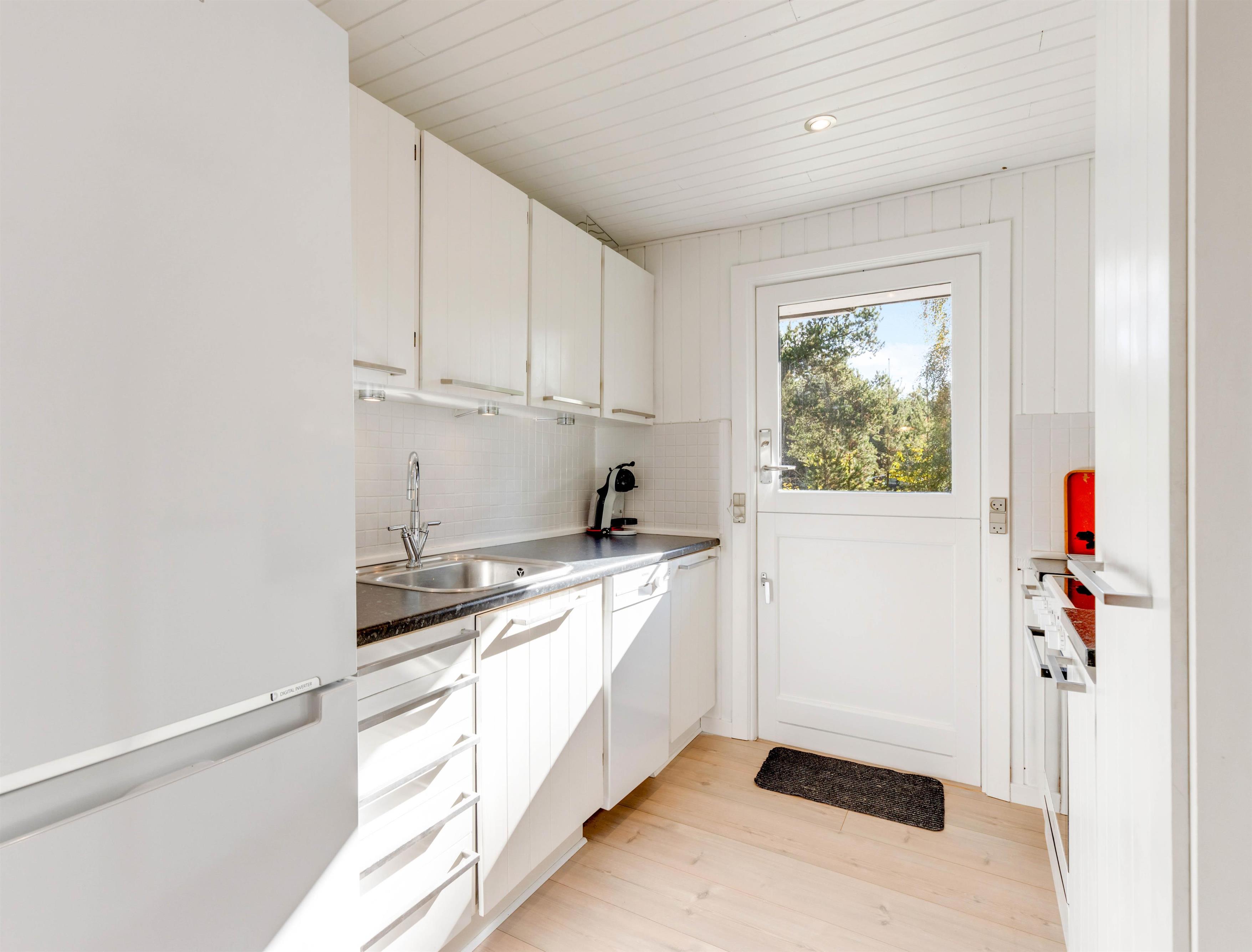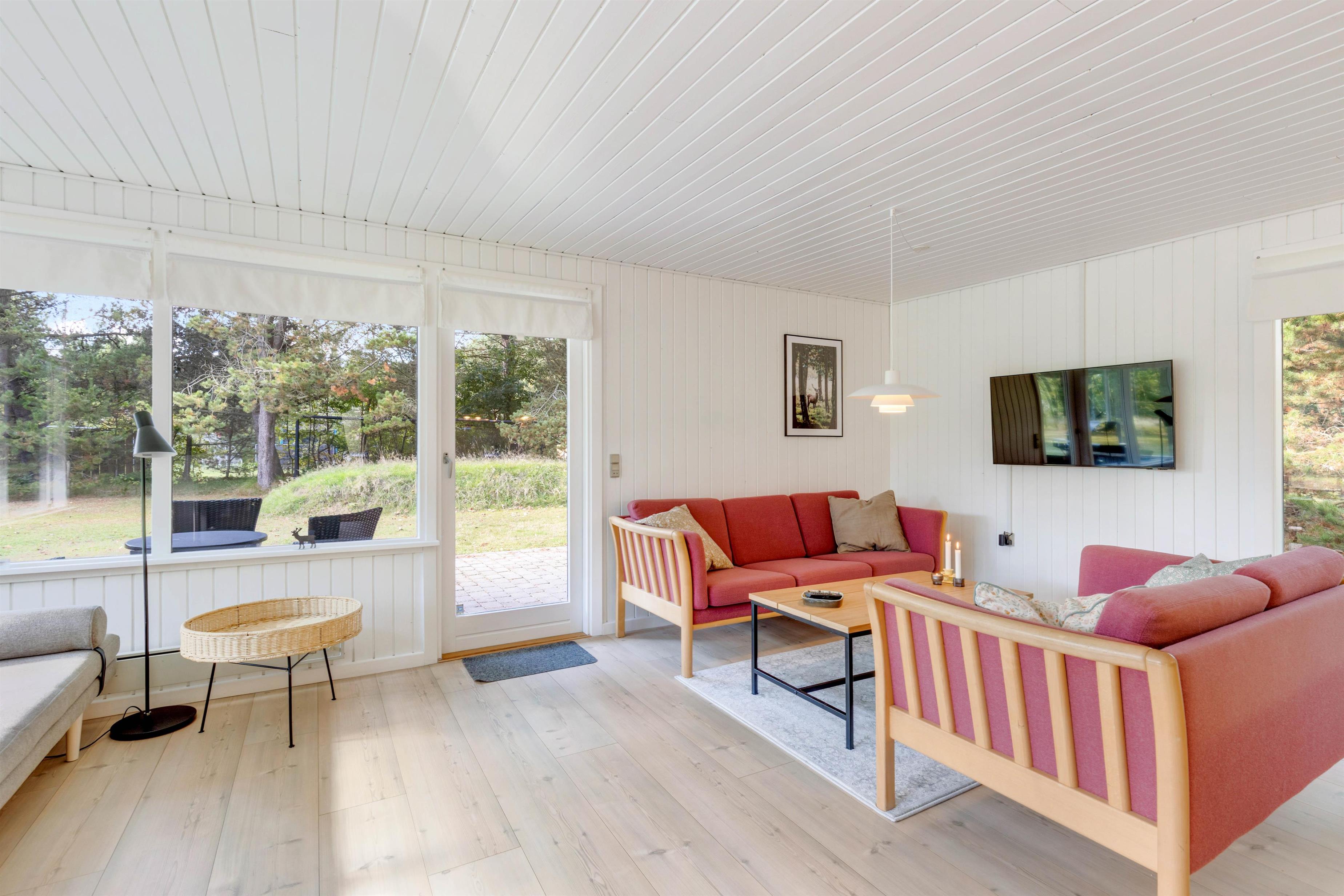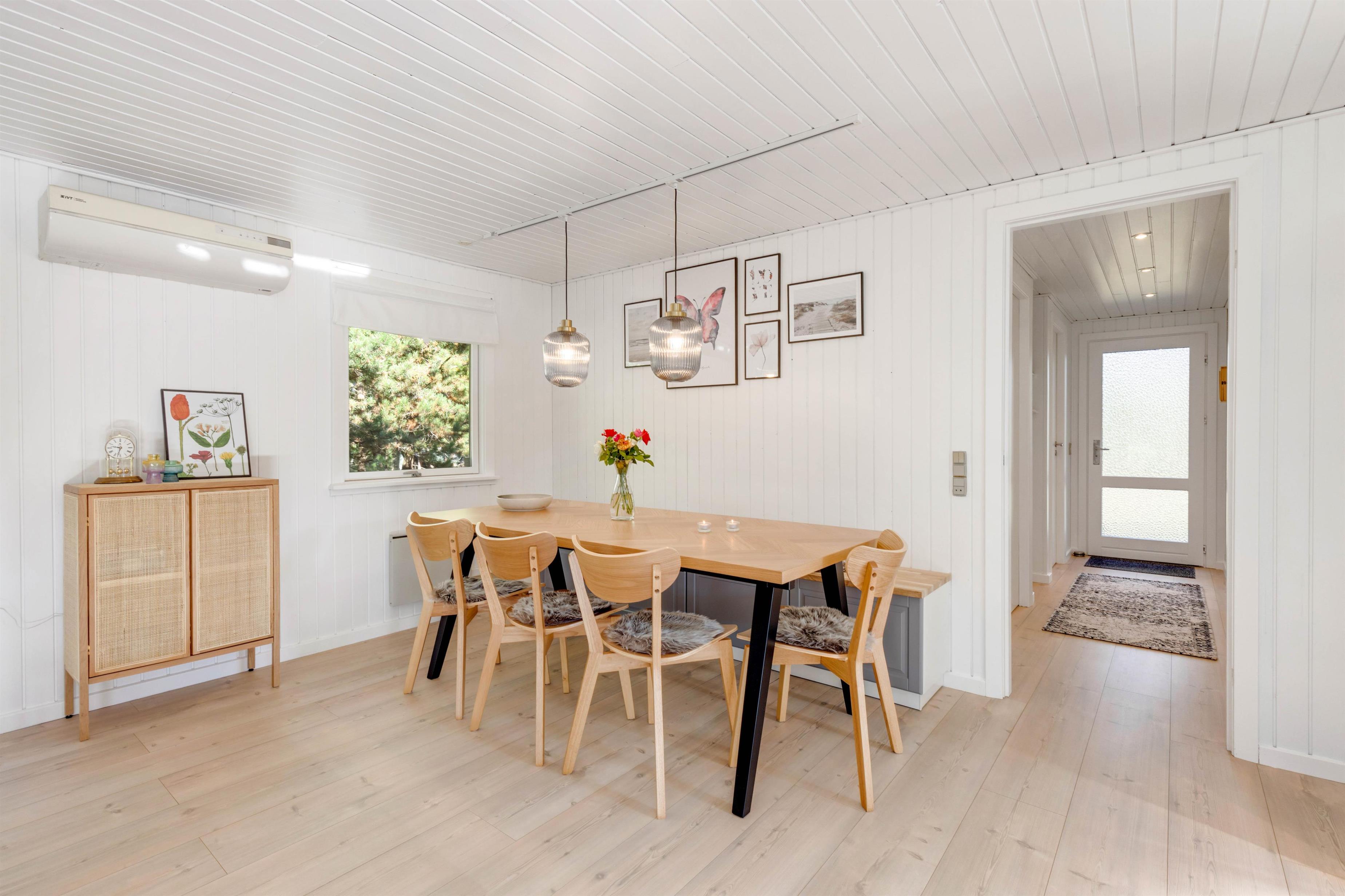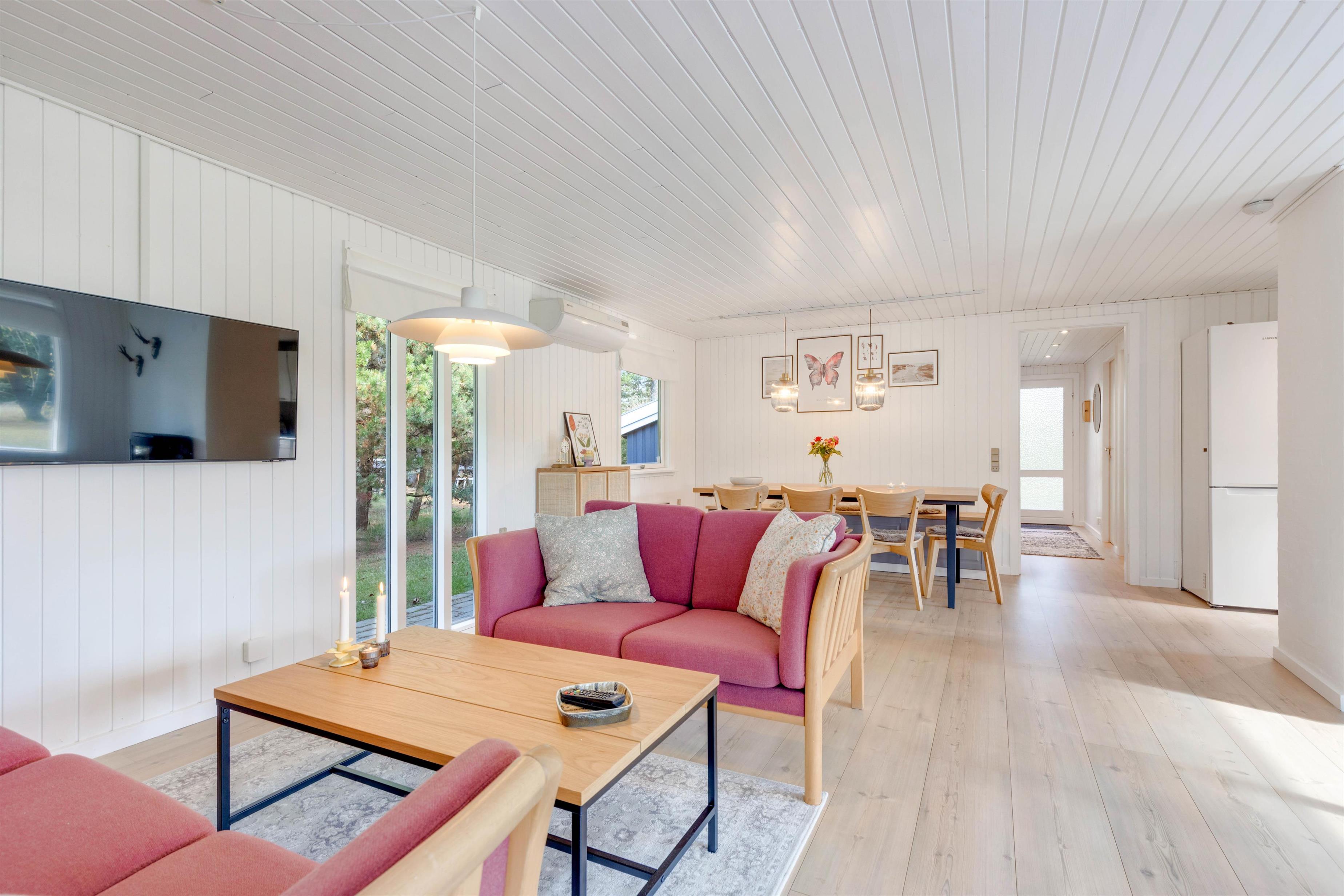 I spisestuen er der masser af hyggekroge, og her finder I også en brændeovn, så I kan gøre ferien ekstra hyggelig. I køkkenet kan der tilberedes lækre måltider, mens børnene ser fjernsyn i sofahjørnet, og efter aftensmaden klarer opvaskemaskinen arbejdet for jer.
