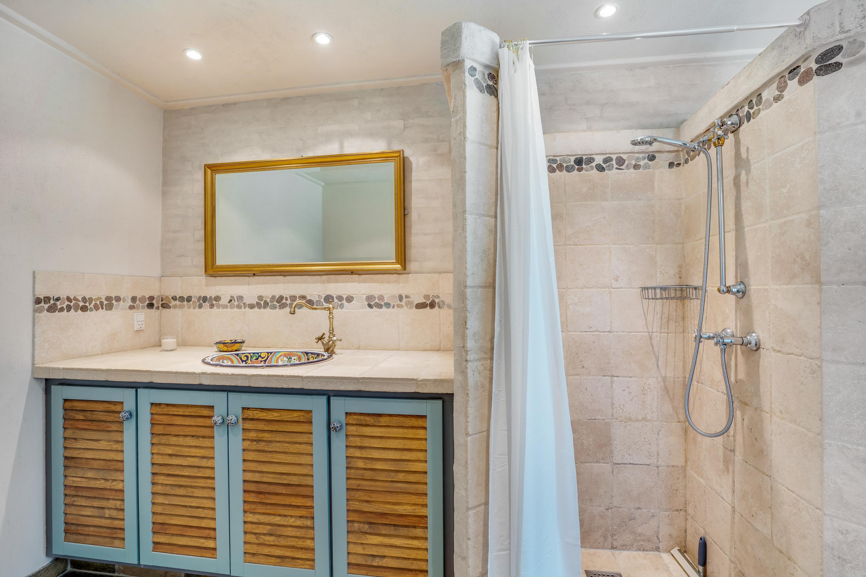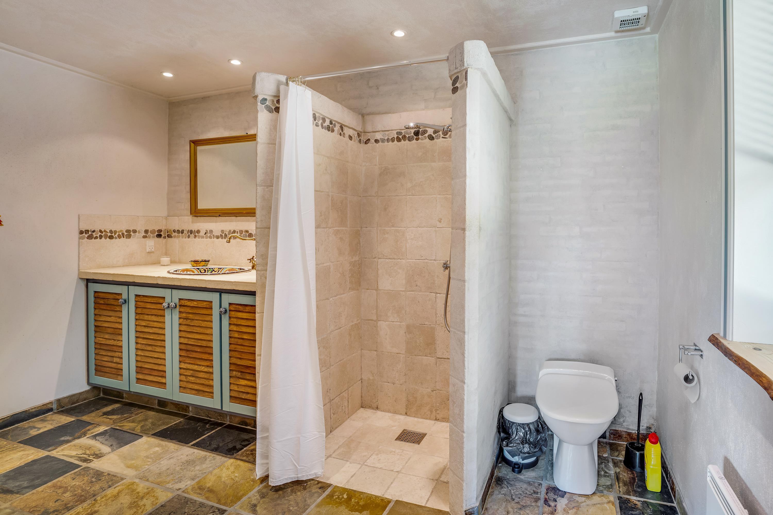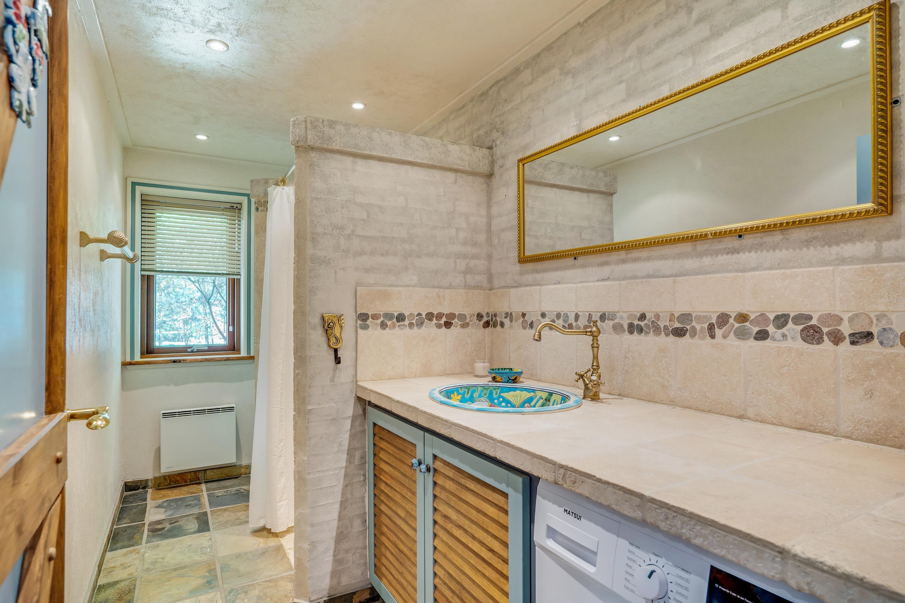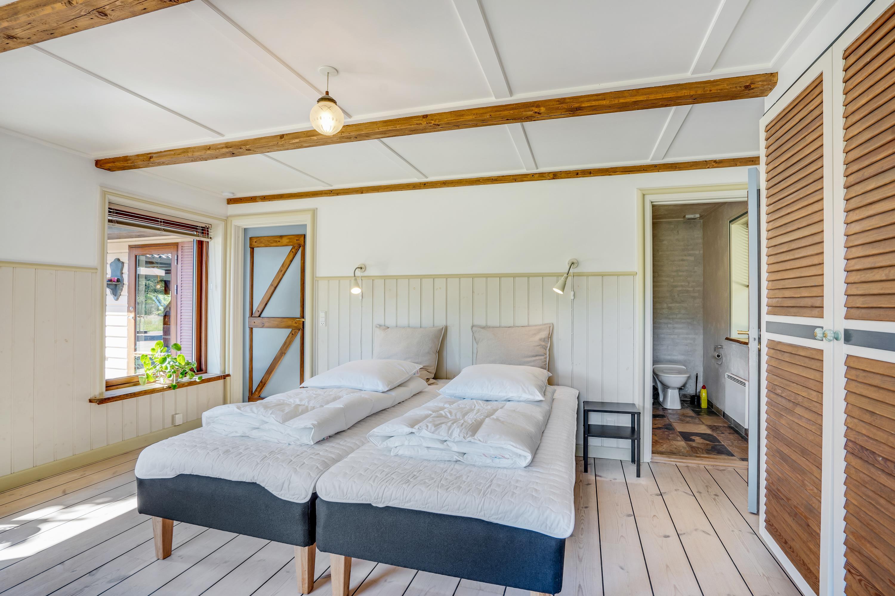 De to store soveværelser er smagfuldt indrettet med nye, brede, bekvemme senge. Det ene har eget badeværelse, Smart TV og direkte udgang til en af den store træterrasses hyggelige læhjørner. Det andet soveværelse har et lille skrivebord, og på det andet badeværelse findes husets vaskemaskine.