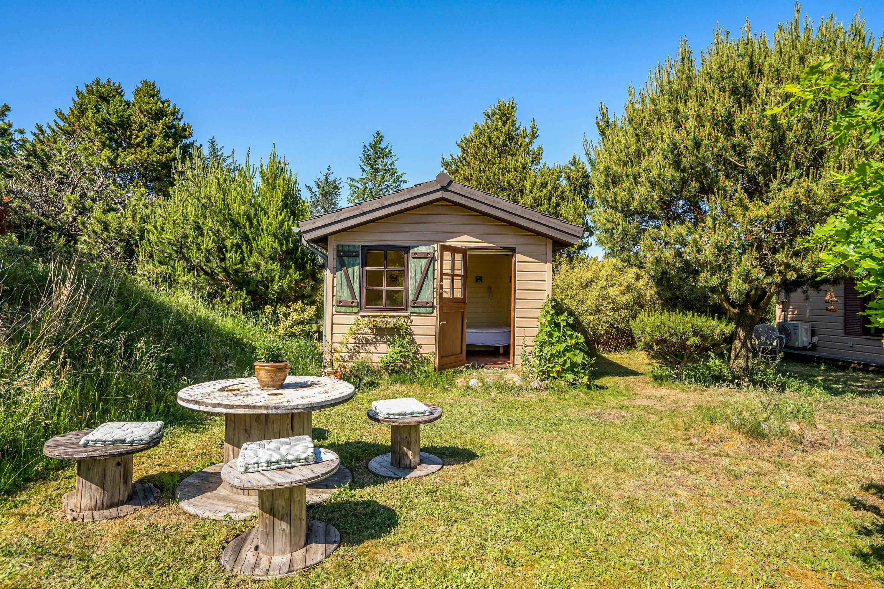 Gæstehytten har 2 gode, brede senge og er opvarmet/isoleret, så det kan benyttes til overnatning og ophold året rundt. Foran gæstehytten er indrettet en hyggekrog med rustikke havemøbler i genbrugstræ.