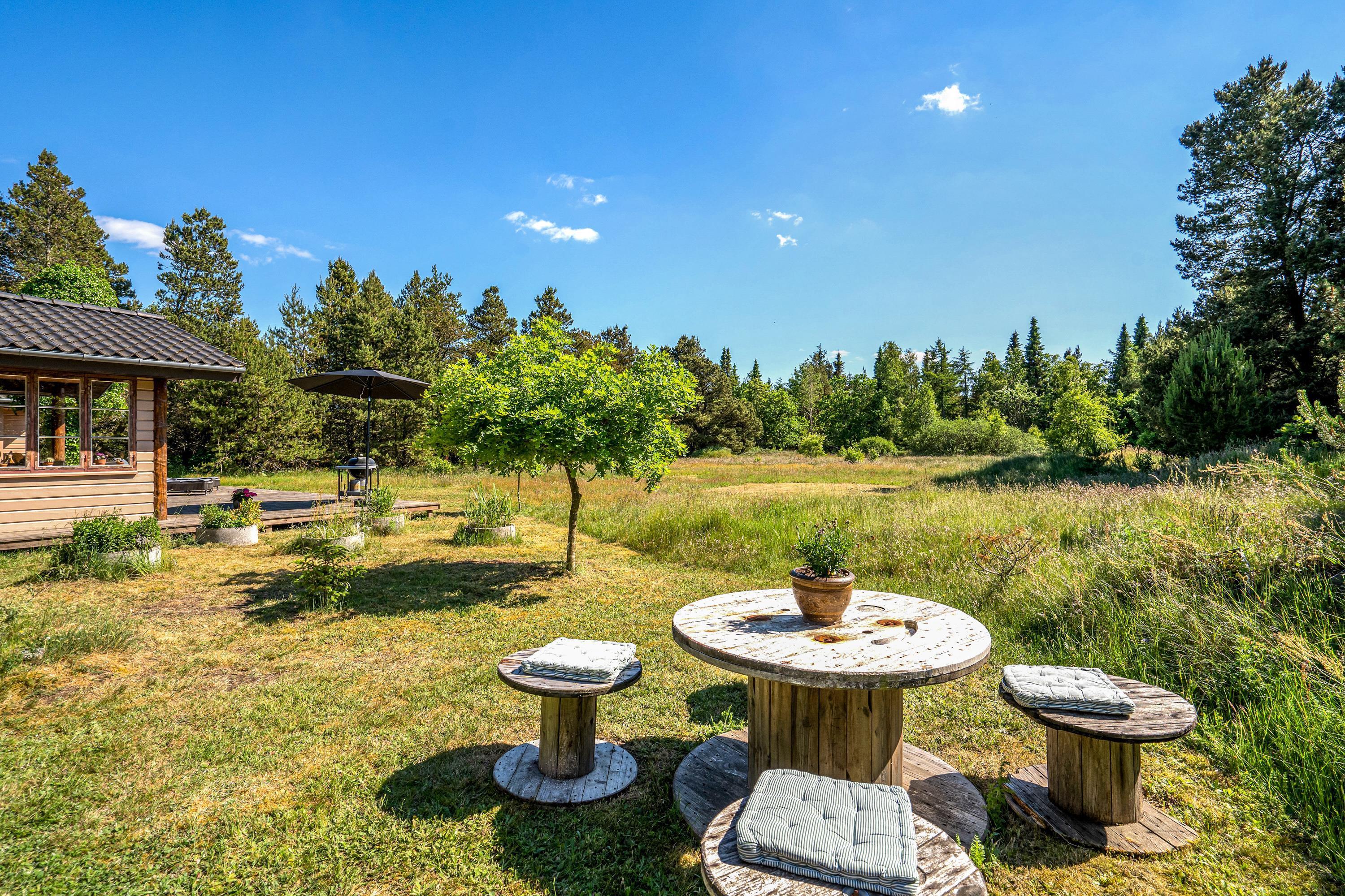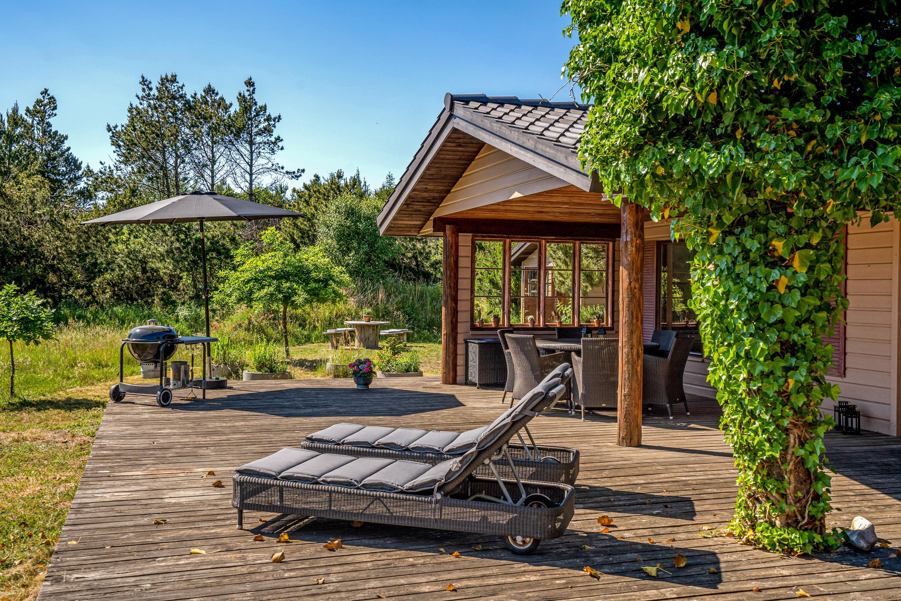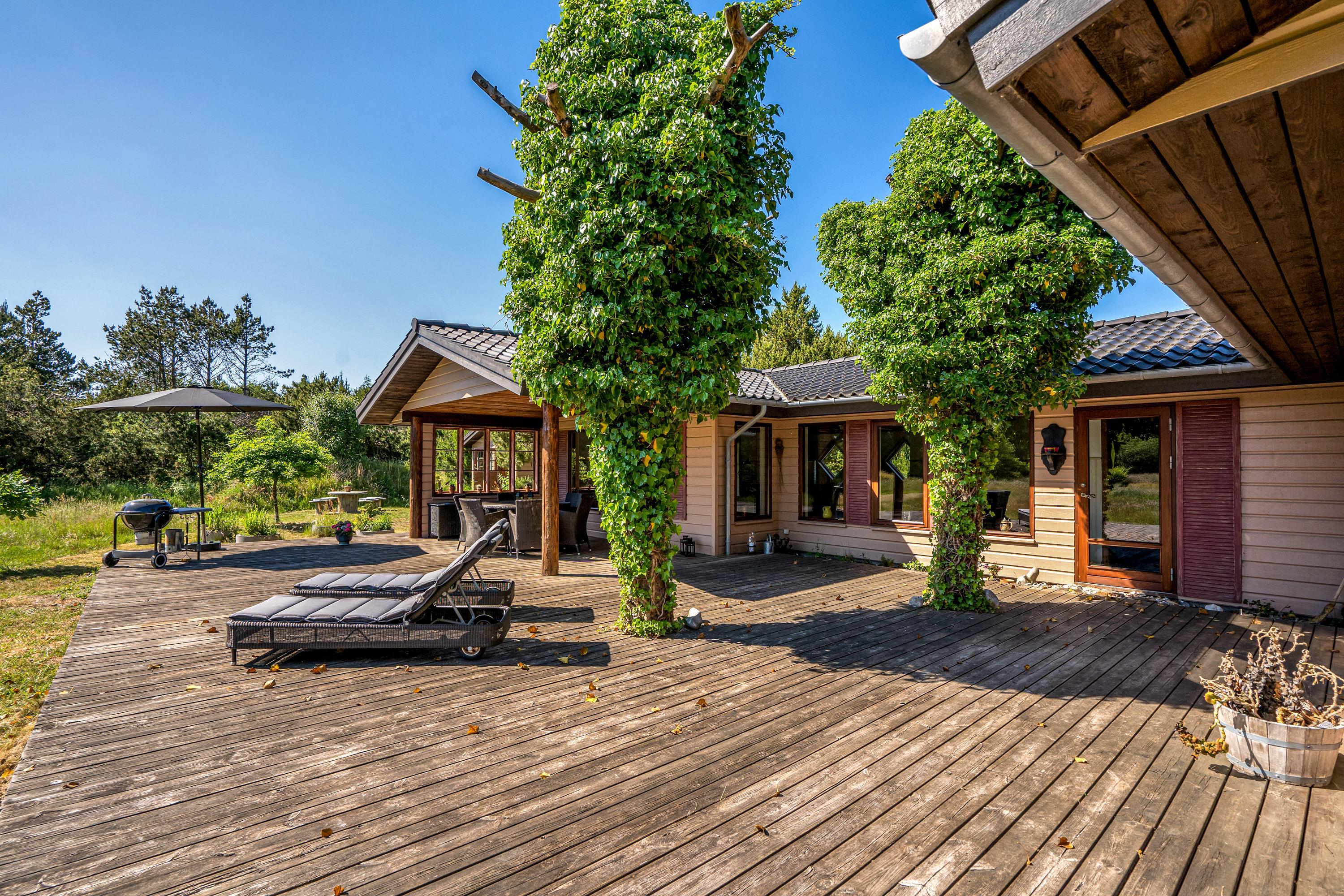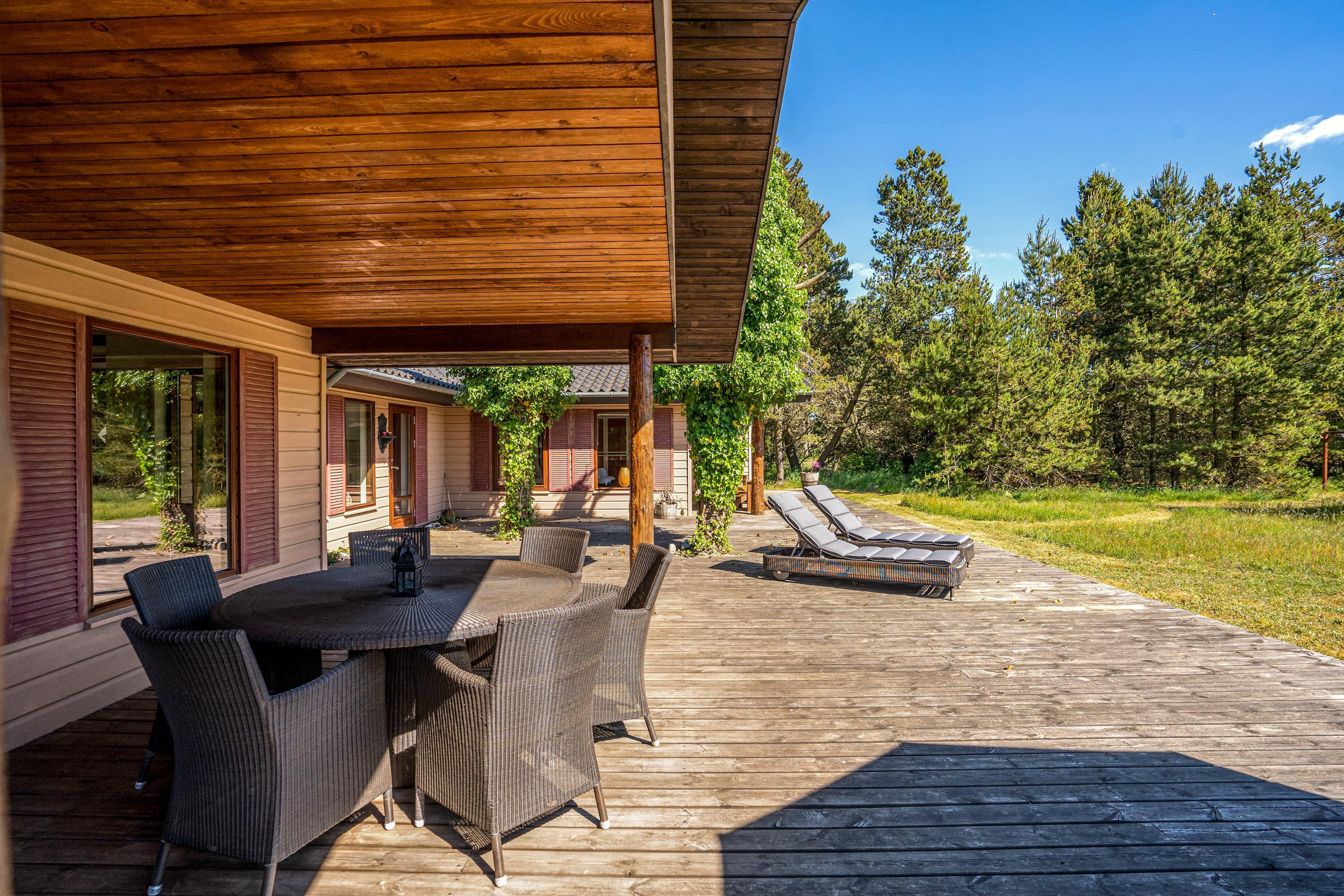 Den 90 m2 store sydvendte træterrasse med hele to overdækkende lækroge forlænger sæsonen med flere måneder, og I vil nyde at opleve naturen fra terrassen både dag og aften, forår, sommer og efterår. I sommerhalvåret kan I gøre brug af den udendørs bruser sammen med saunaen, som kan bruges hele året - begge står i haven. Gode stisystemer indbyder til lange ture i området – måske en frisk 2,5 kilometers travetur til stranden, eller en frisk cykeltur i skoven, hvor du måske vil udfordre dig selv på et af Danmarks bedste MTB-spor her i Blåbjerg Plantage.