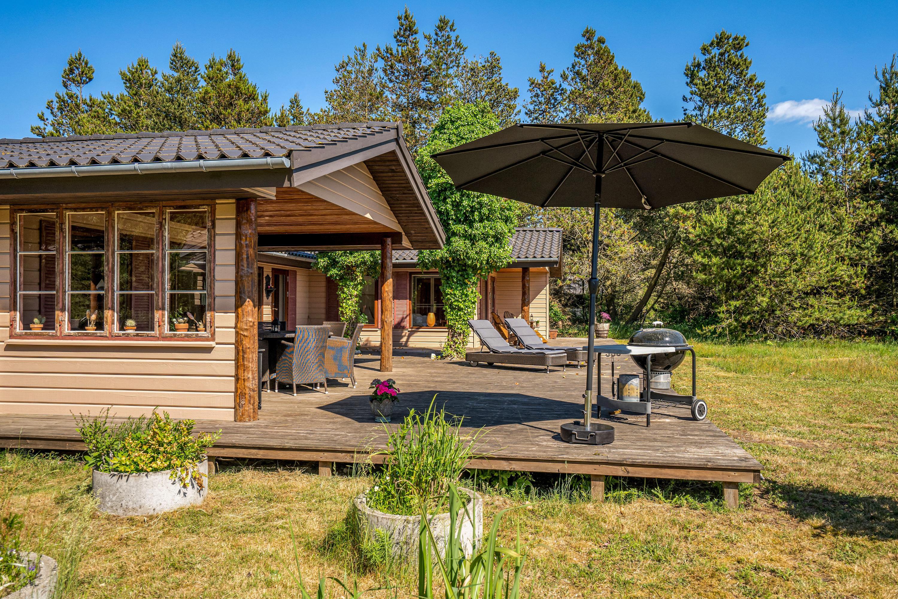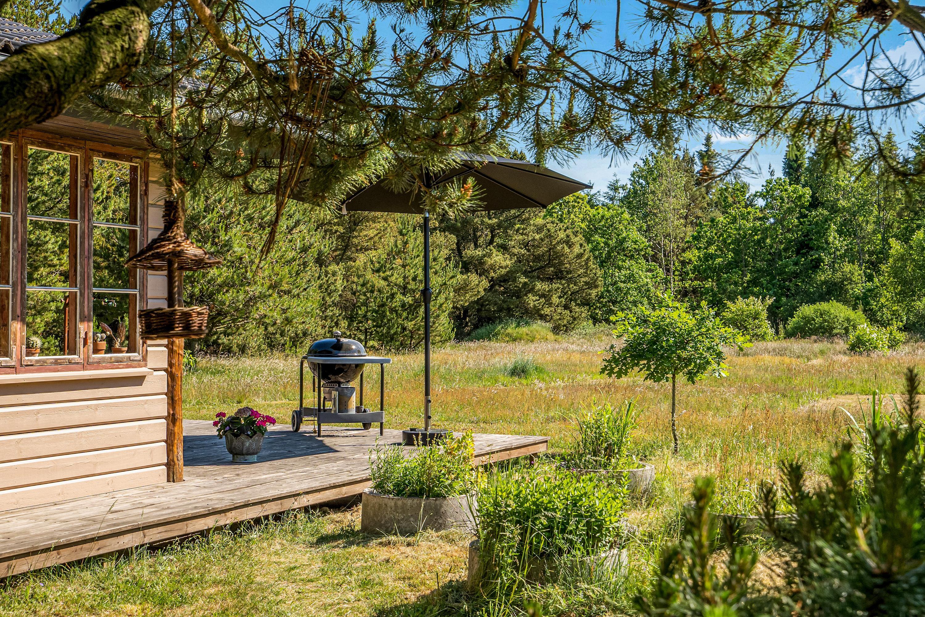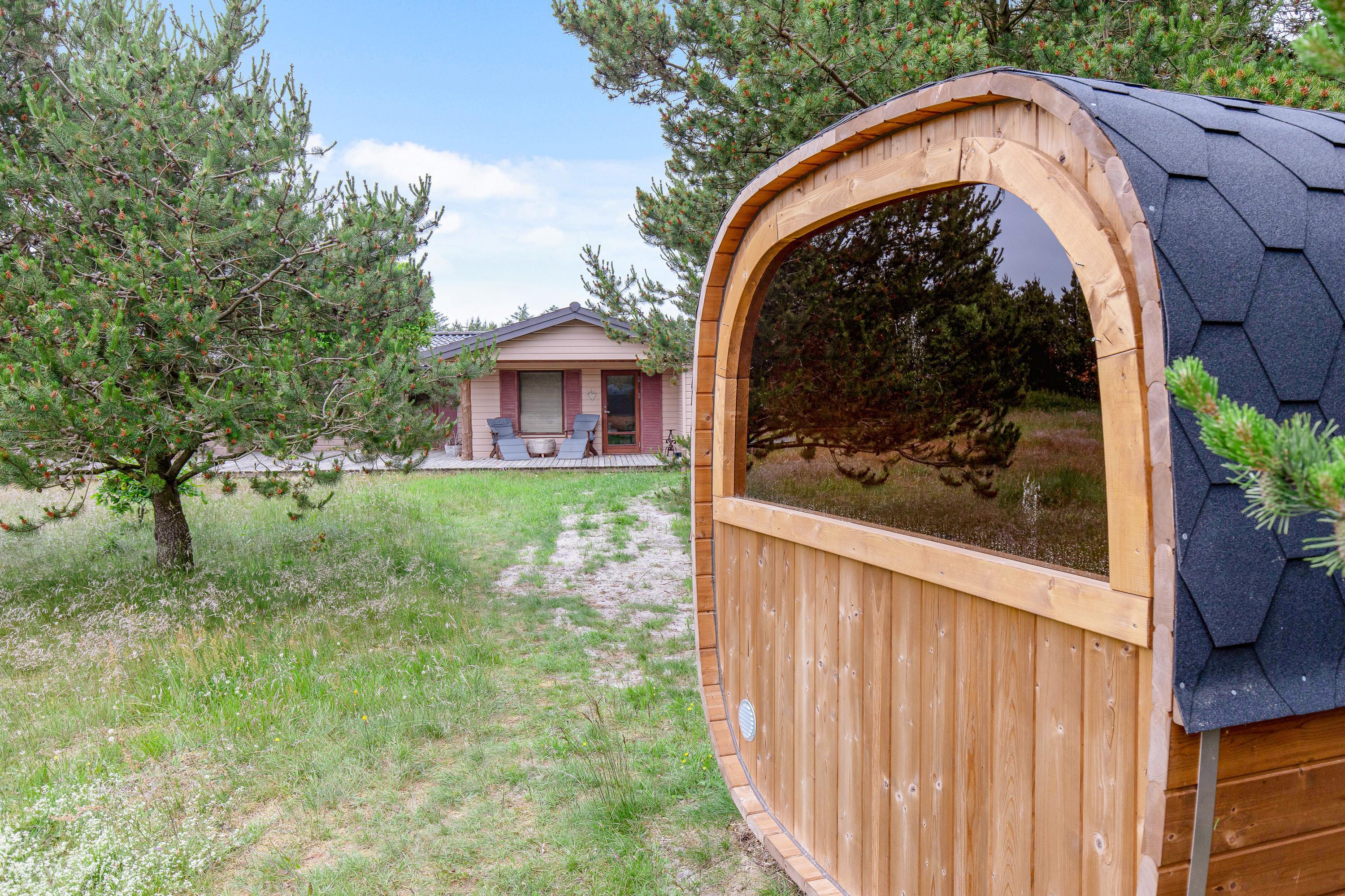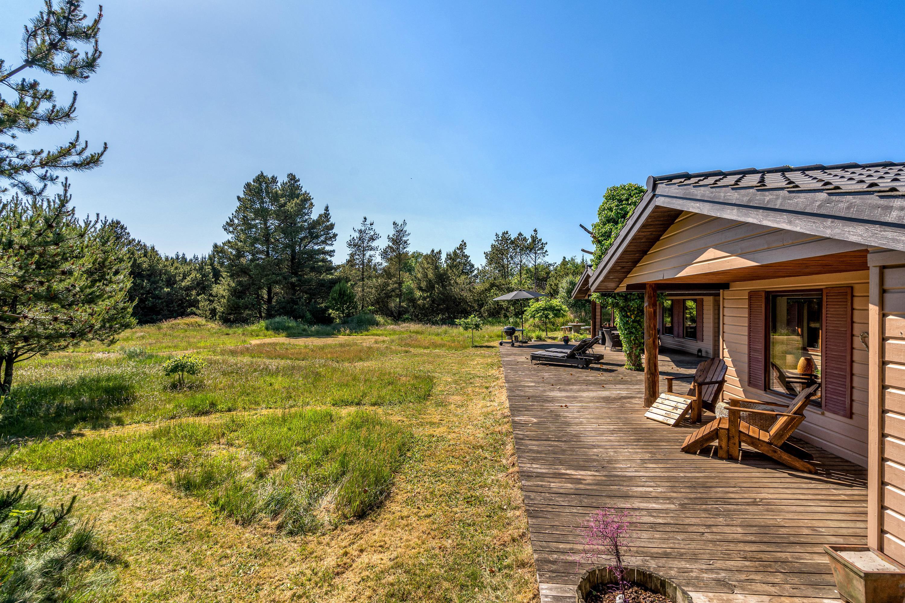 Den 90 m2 store sydvendte træterrasse med hele to overdækkende lækroge forlænger sæsonen med flere måneder, og I vil nyde at opleve naturen fra terrassen både dag og aften, forår, sommer og efterår. I sommerhalvåret kan I gøre brug af den udendørs bruser sammen med saunaen, som kan bruges hele året - begge står i haven. Gode stisystemer indbyder til lange ture i området – måske en frisk 2,5 kilometers travetur til stranden, eller en frisk cykeltur i skoven, hvor du måske vil udfordre dig selv på et af Danmarks bedste MTB-spor her i Blåbjerg Plantage.