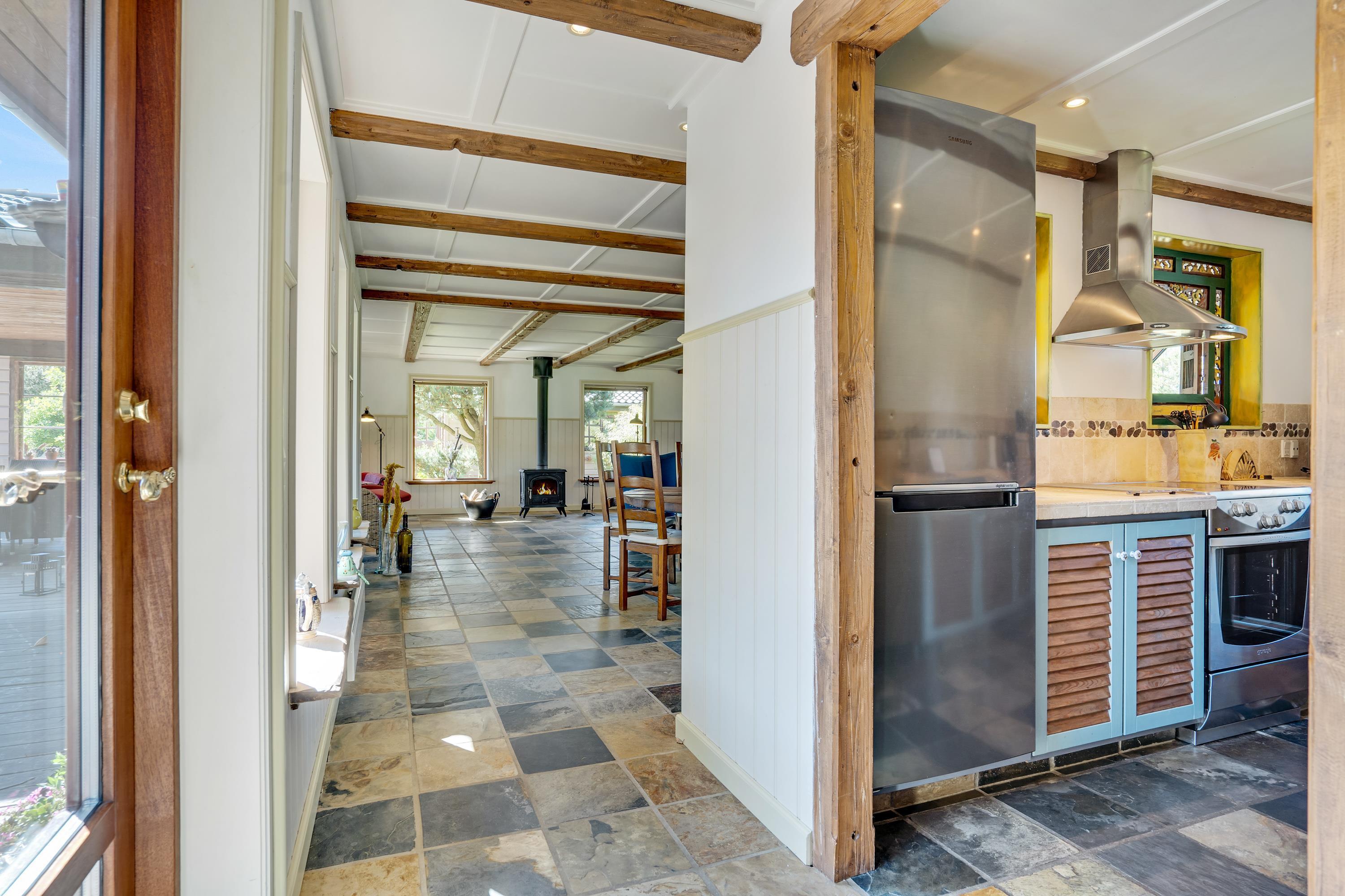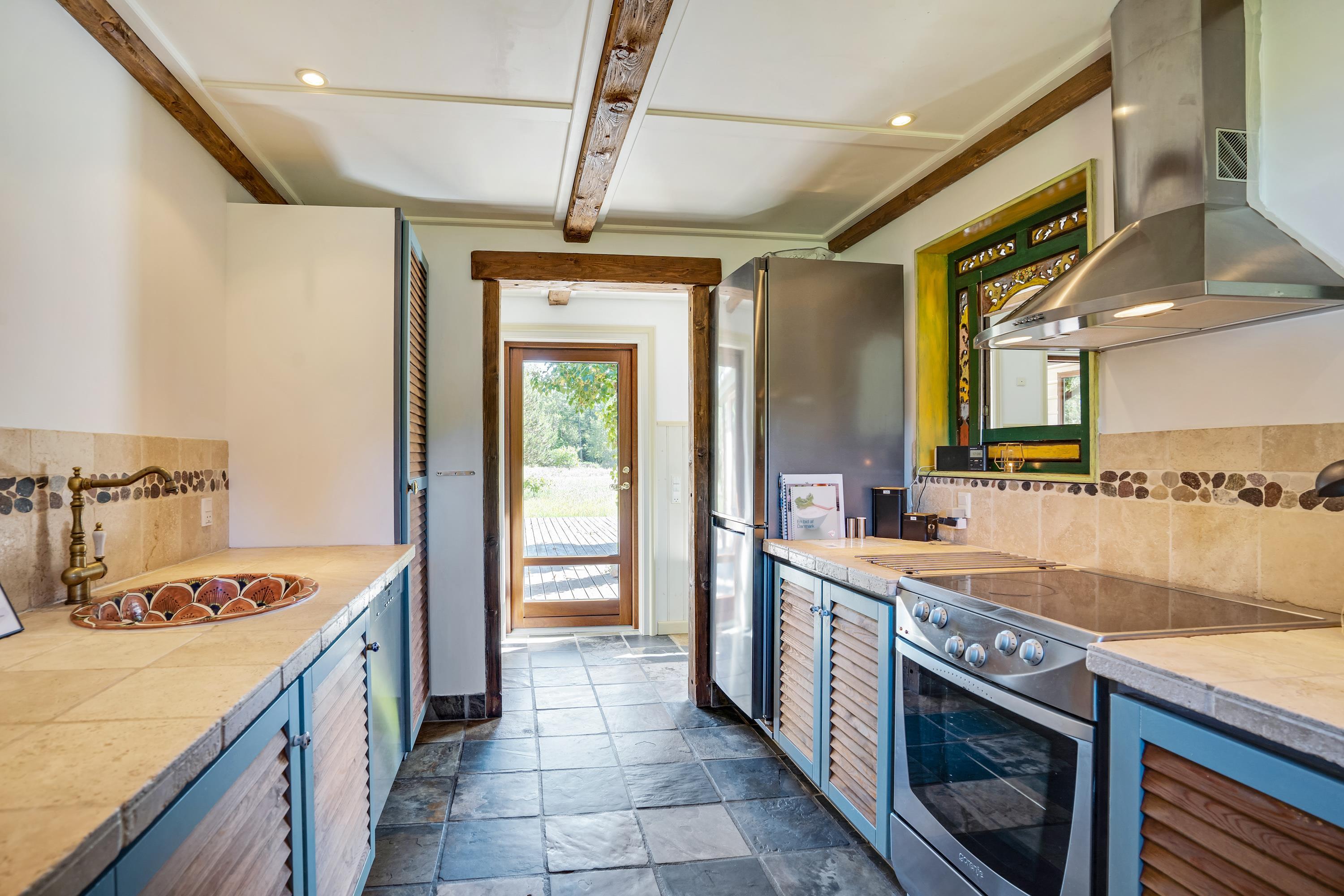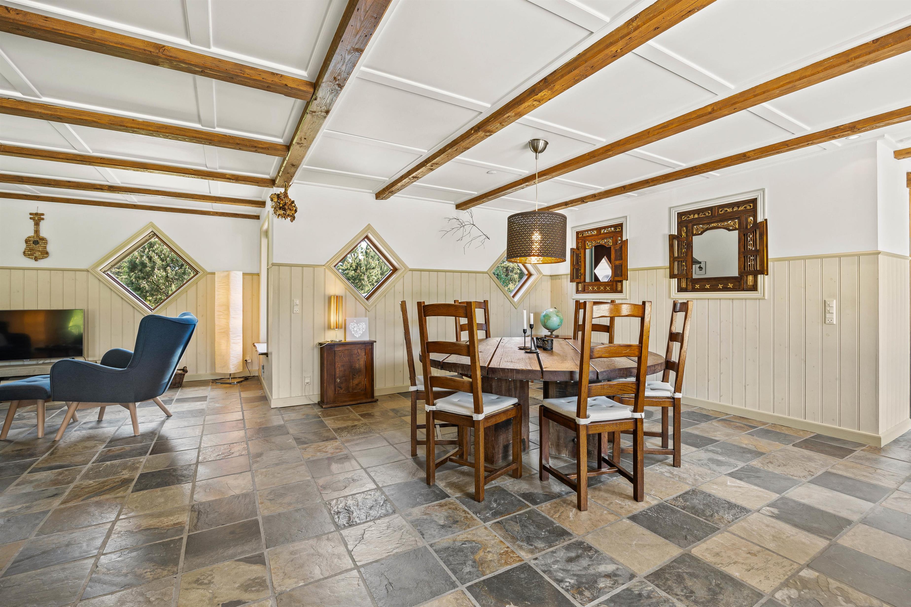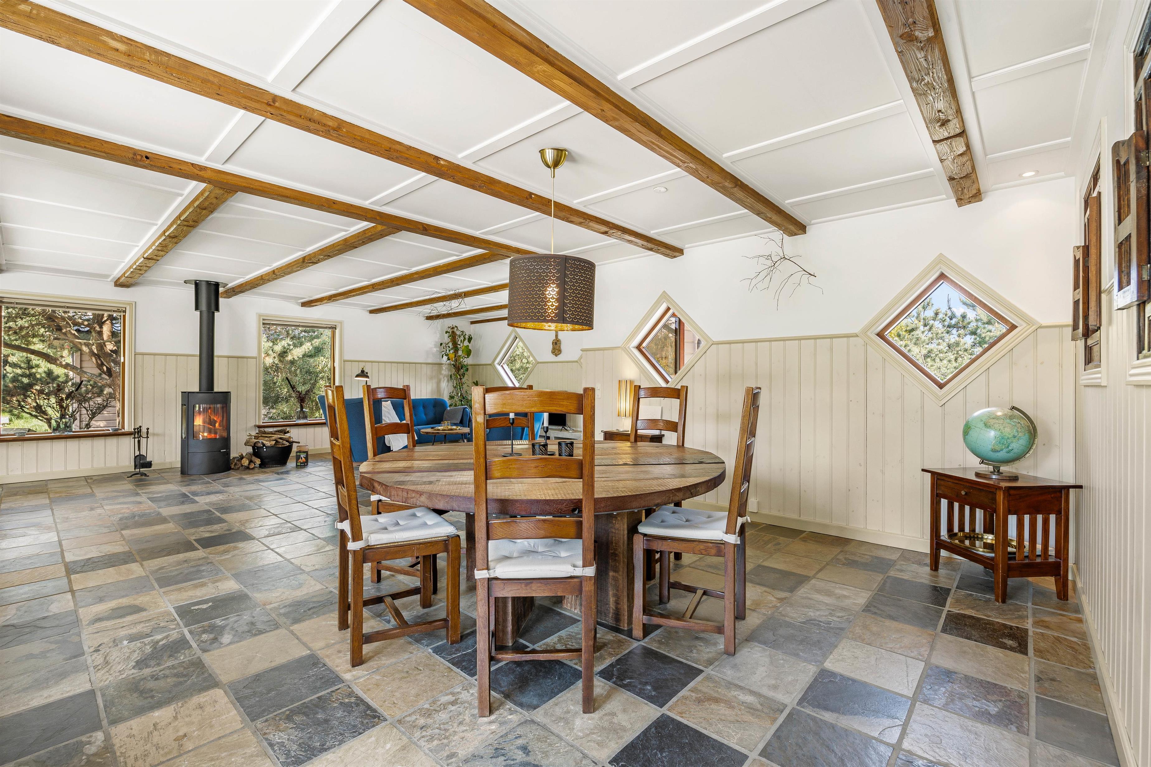 Midt i huset finder du et hyggeligt køkken med adgang til terrassen og med kig til stuen, som rummer et stort rundt spisebord, sofahyggekrog med Smart TV samt bibliotekshjørne med brændeovn, hvor du kan nyde en bog, den knitrende ild og udsigten over den store naturgrund.