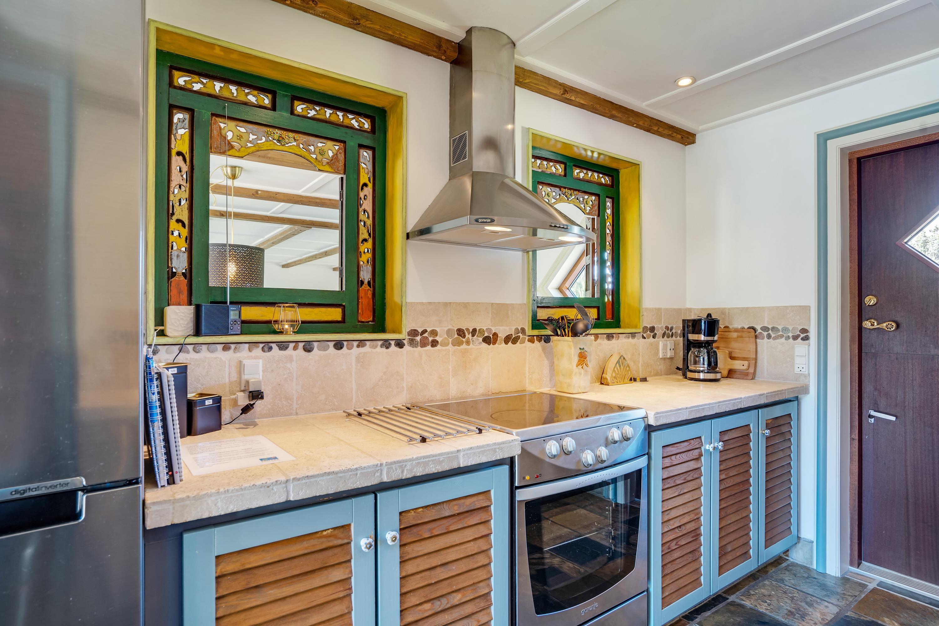 Det 142 m2 store hus er indrettet i smagfuld sydeuropæisk stil, bl.a. med synlige loftsbjælker og gulv af naturskiffer (gulvvarme) i køkken, stue og gang. Værelserne har fyrretræsgulv lagt som skibsplanker. Der er god af skabsplads til alle gæster.