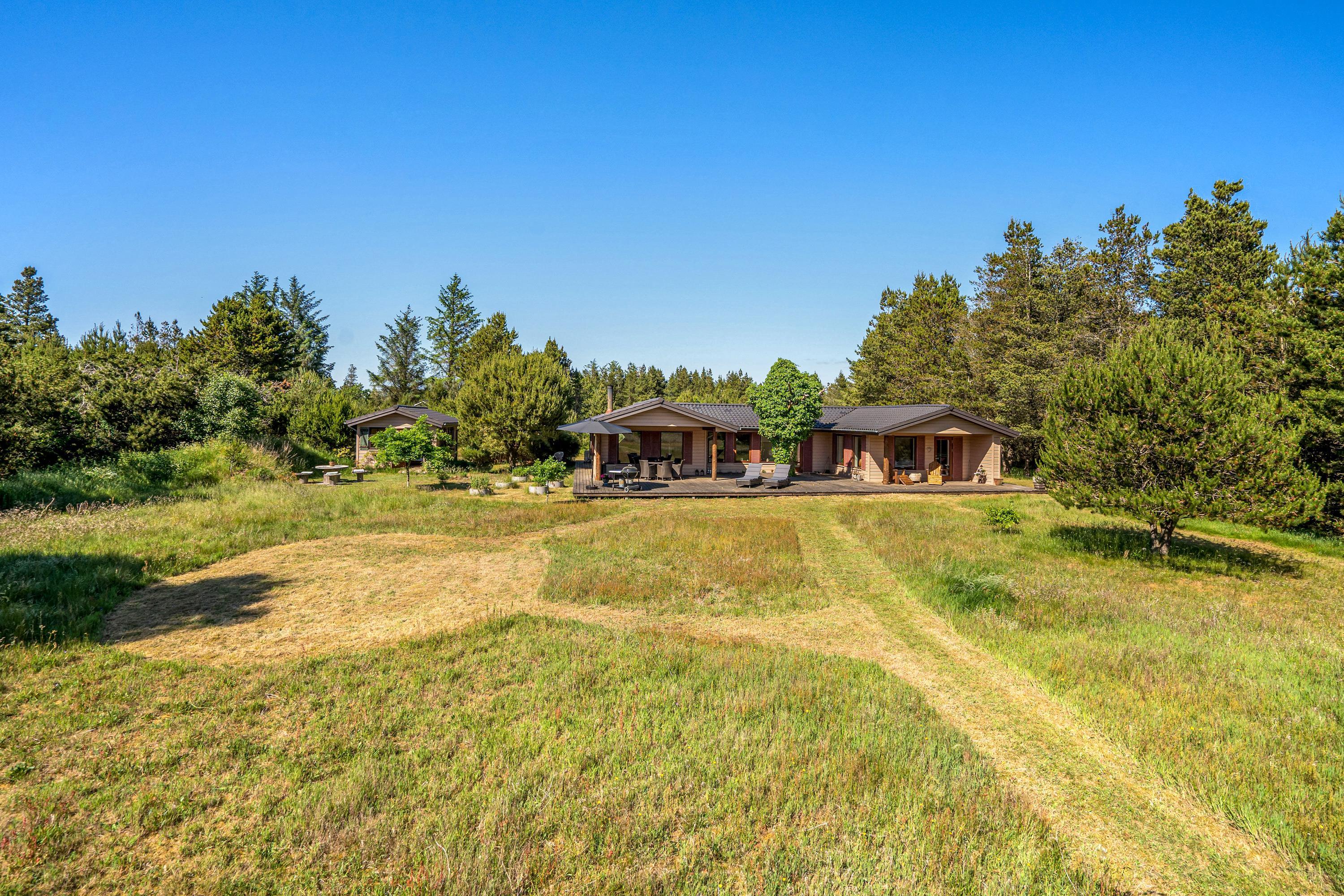 Fra sommerhuset på Sdr. Skovvej 5 er der kun 10 minutter i bil til butikker og gode spisesteder fx i Henne eller Nymindegab, og spiller du golf, kører mountainbike, rider eller har lyst til en tur i badeland, så har du også disse muligheder inden for 10 minutter, ligesom der generelt i området er masser af interessante udflugtsmål for hele familien. I stuens hyggelige bibliotekshjørne finder du generel information om området, samt kort og luftfotos over skønne vandrestier, bl.a. direkte fra huset gennem skov og uberørt klitlandskab til havet.