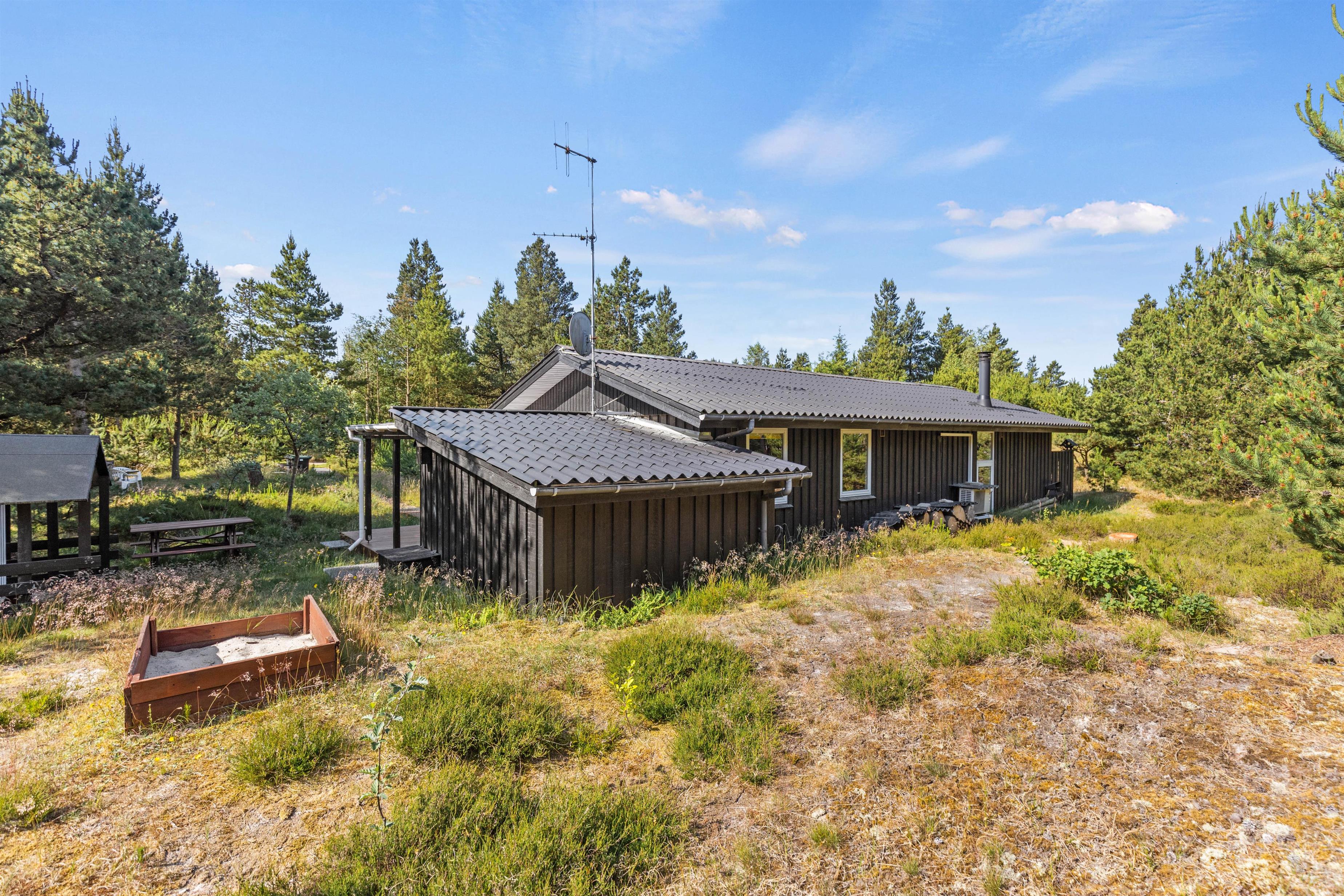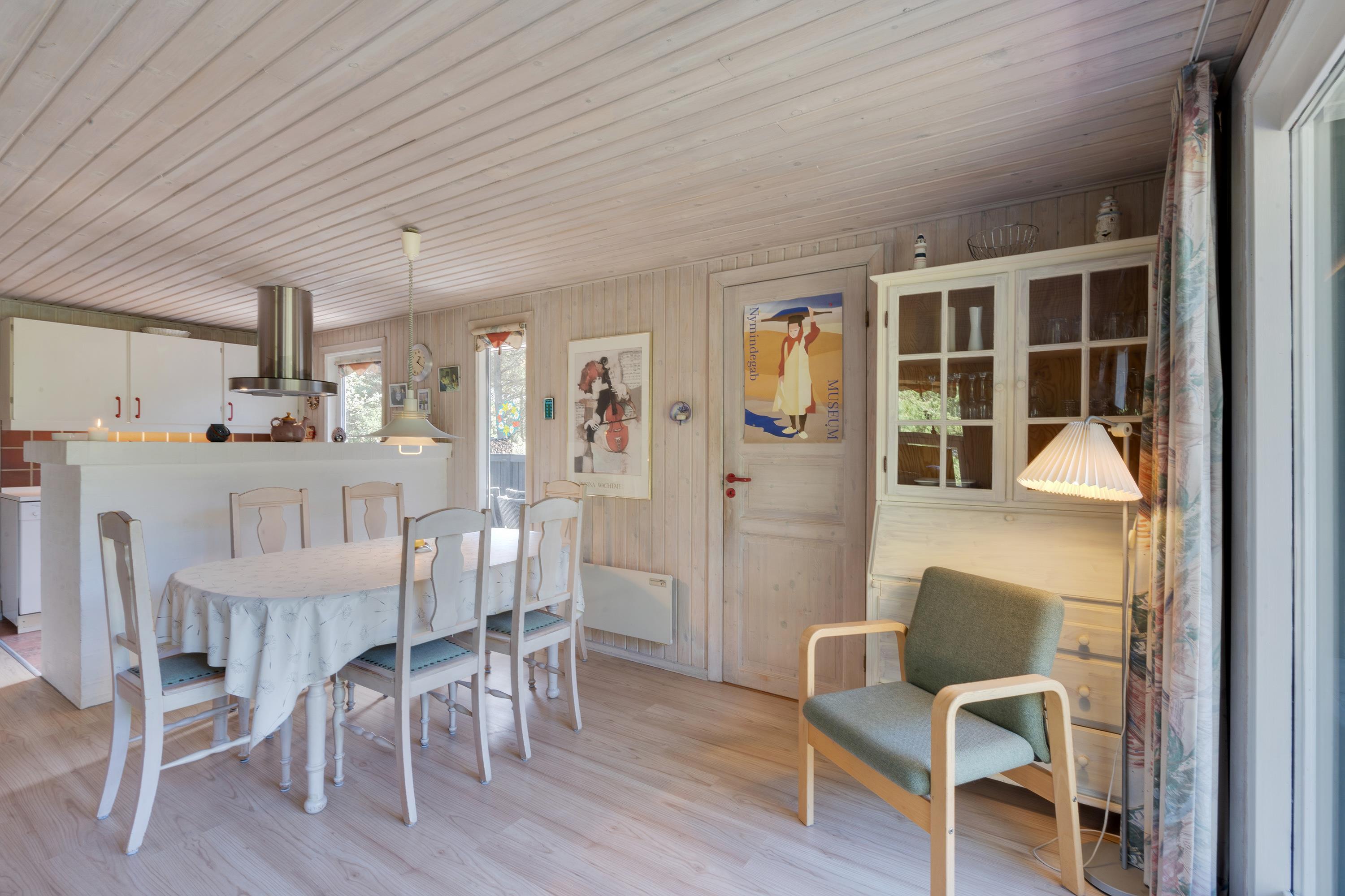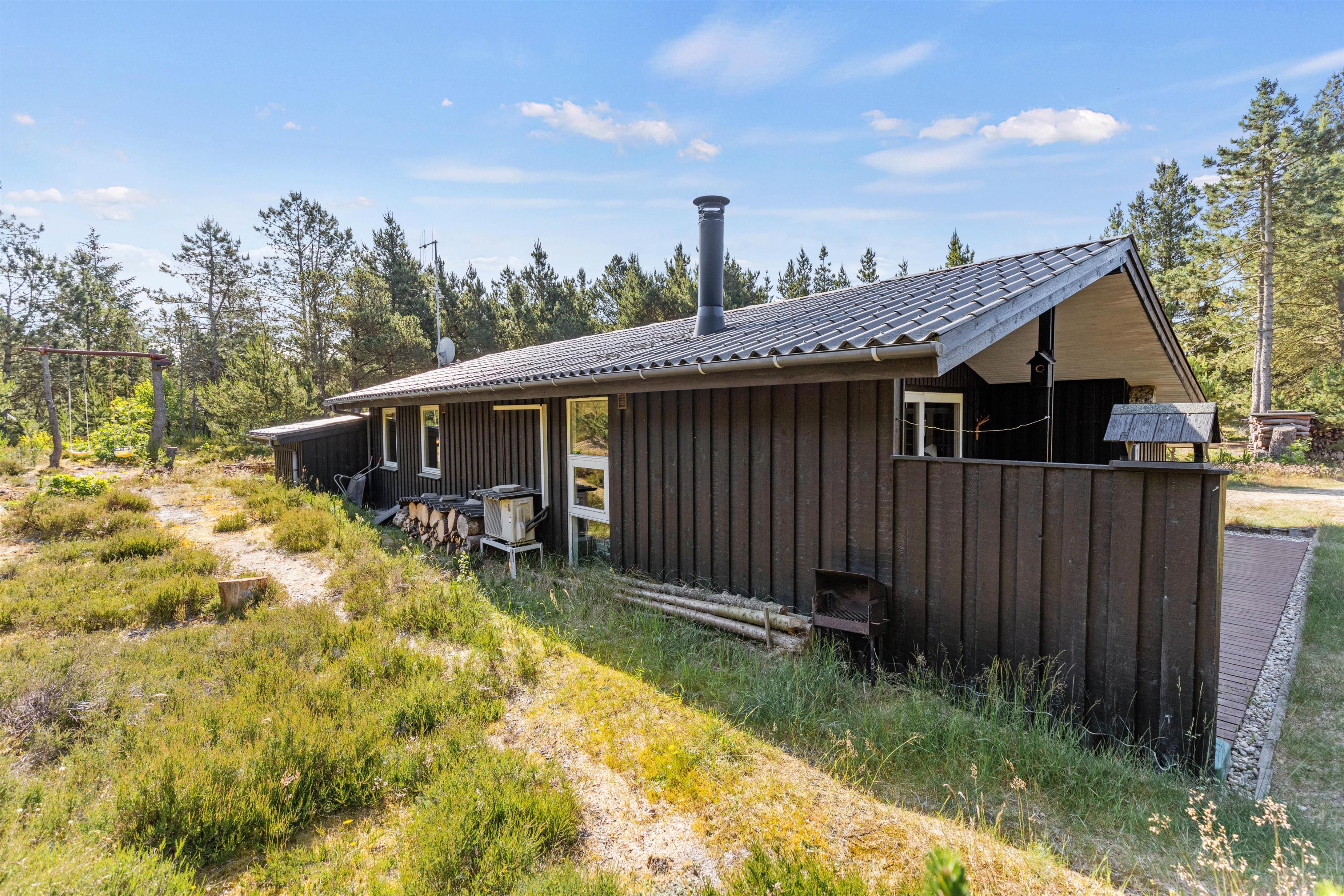 Det hyggelige sommerhus i Houstrup ligger ikke langt fra Blåbjerg Plantage, som indbyder til mange gåture og cykelture på de snoede vandrestier gennem naturen. Efter en dag i den friske luft kan hele familien slappe af i det venligt indrettede opholdsrum, som ud over stuen med det store sofahjørne og den hyggelige brændeovn også indeholder både spiseafdeling og et veludstyret køkken.