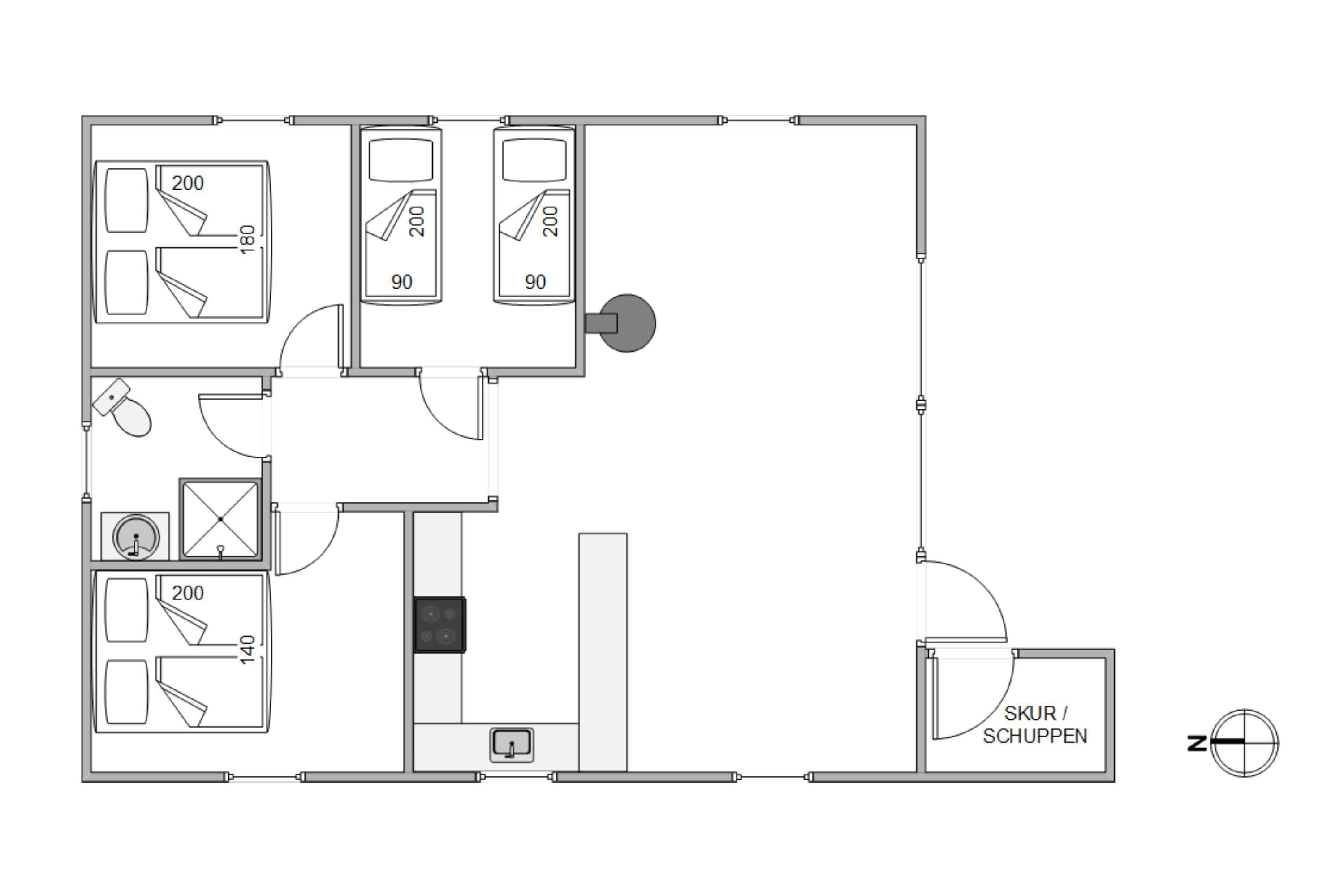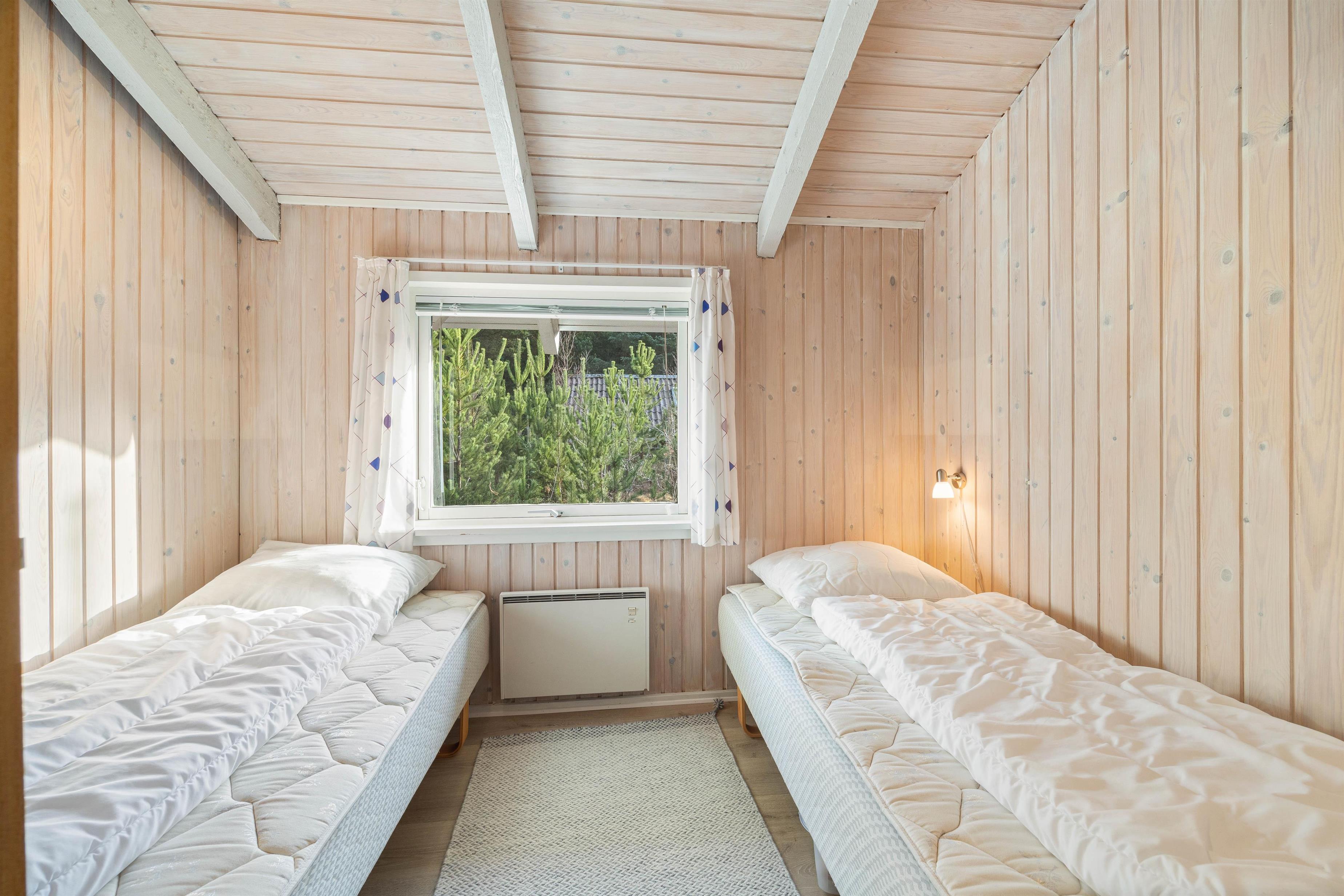 Sommerhuset har tre soveværelser med sengepladser til 5 personer. I det ene af værelserne er en 180x200 dobbeltseng, i det andet er sengen 140x200 og i det tredje værelse finder I 2 enkeltsenge. Alle værelser ligger ud til gangen, hvor I også finder badeværelset, der selvfølgelig har gulvvarme, så I ikke kommer til at fryse fødderne.