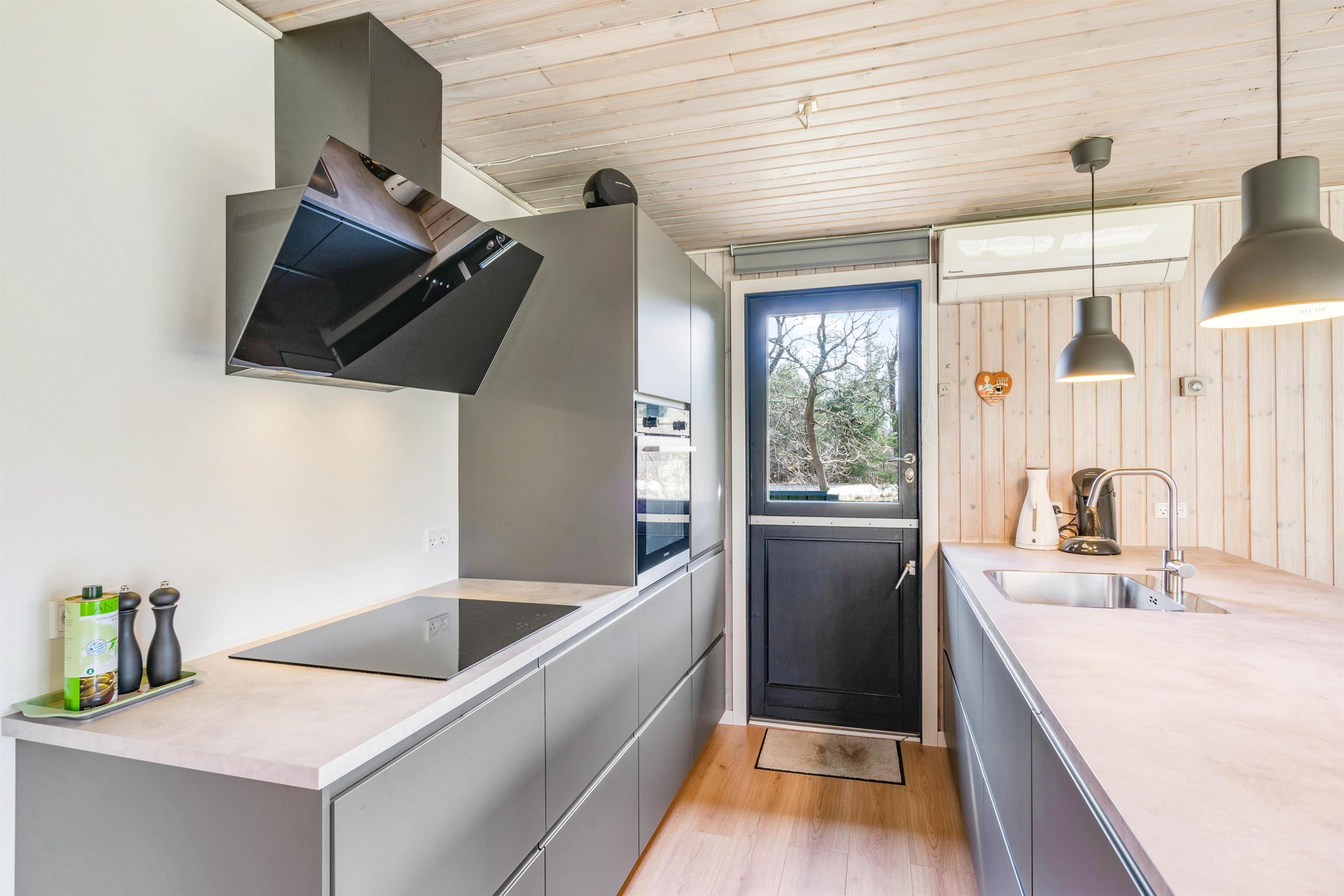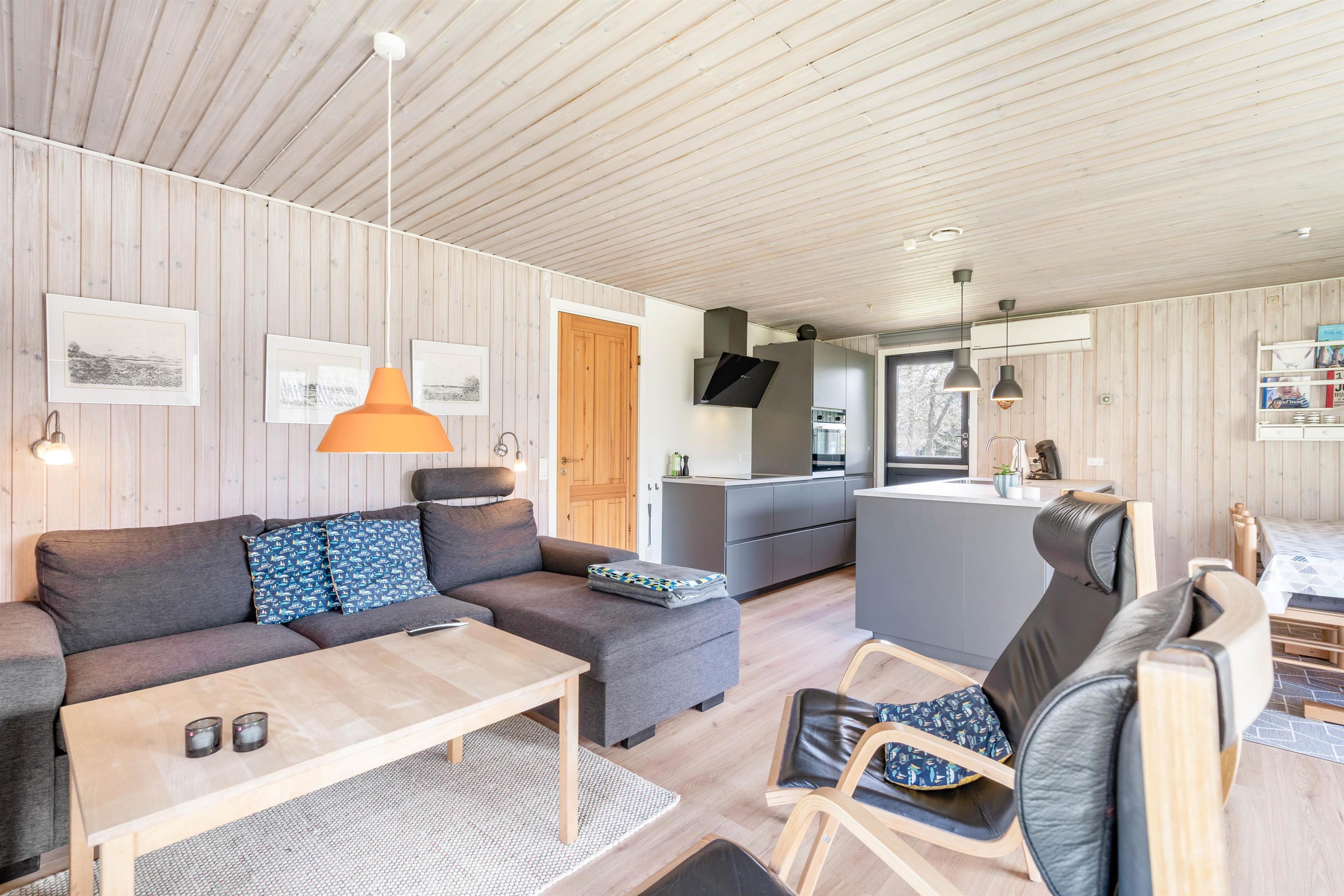 Brændeovnen sørger både for god stemning og dejlig varme i sommerhuset – og ellers er der en energivenlig varmepumpe i feriehuset, der sikrer, at I altid har et godt indeklima på ferien. Desuden er der også både en vaskemaskine og en opvaskemaskine, der hjælper jer med det praktiske husarbejde.