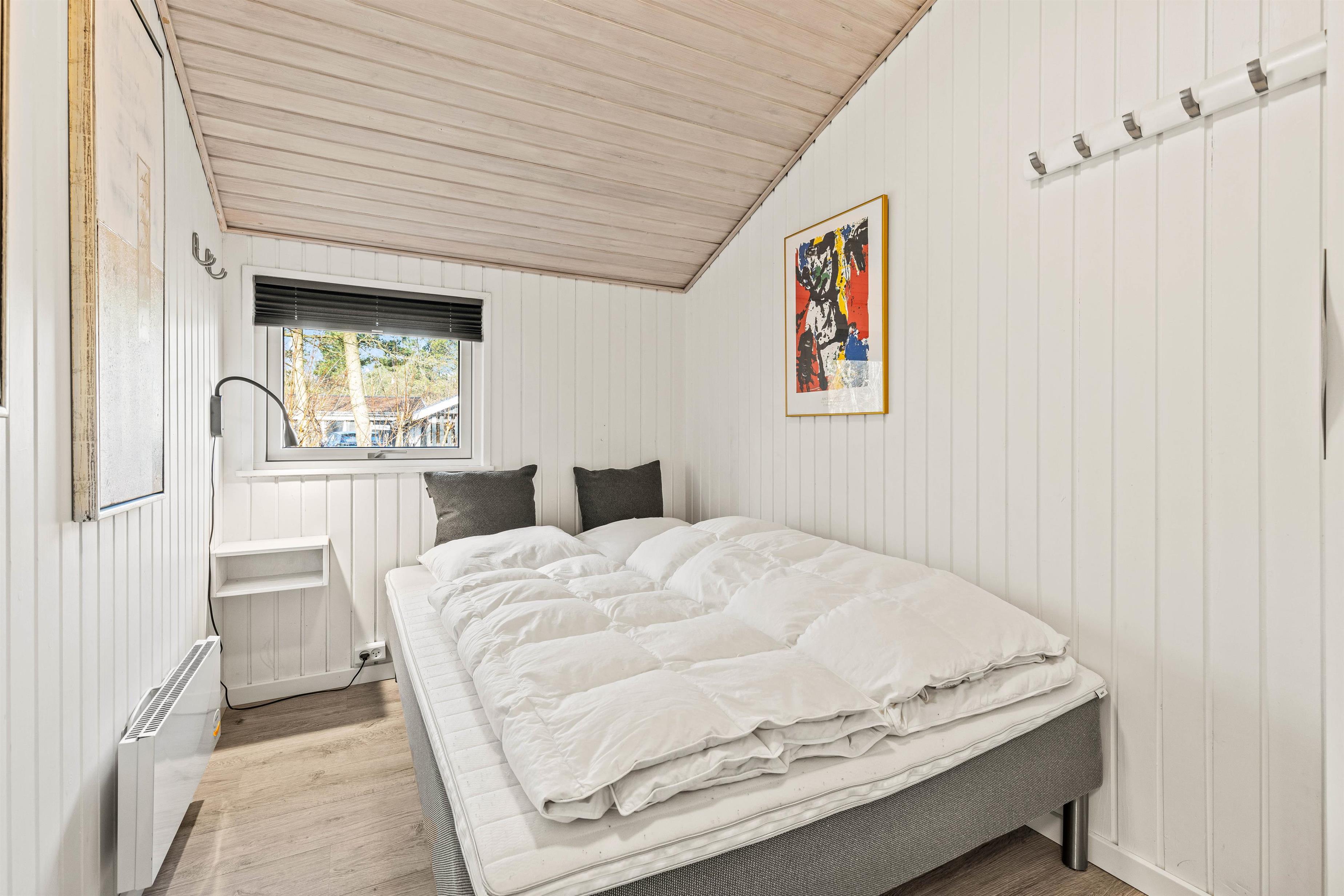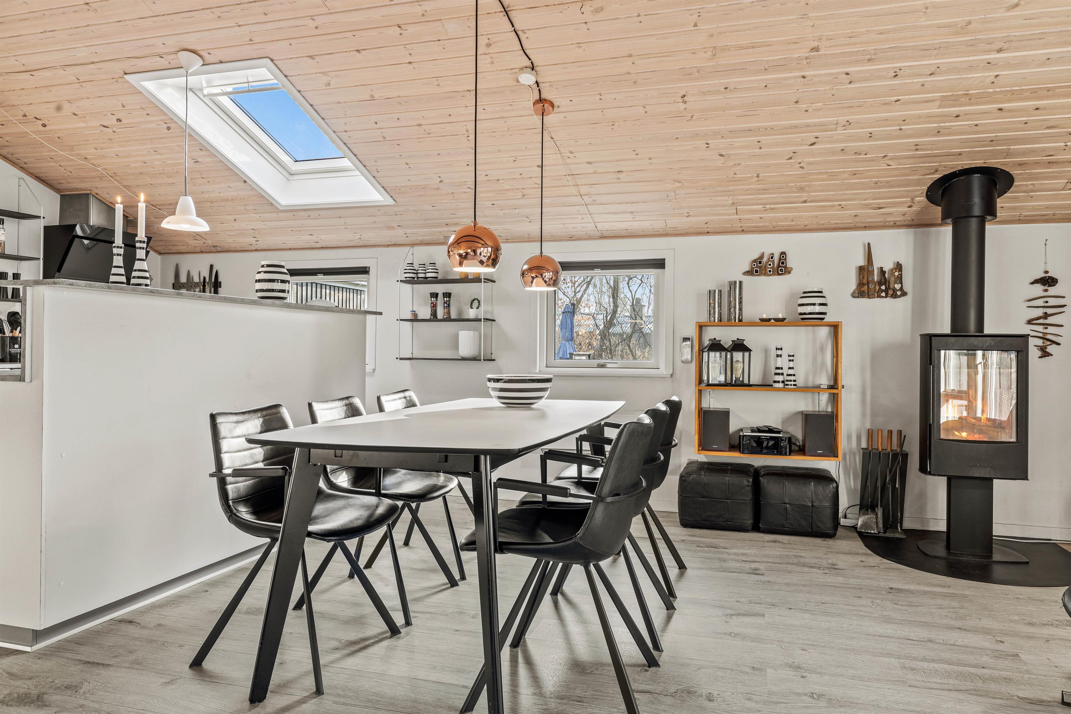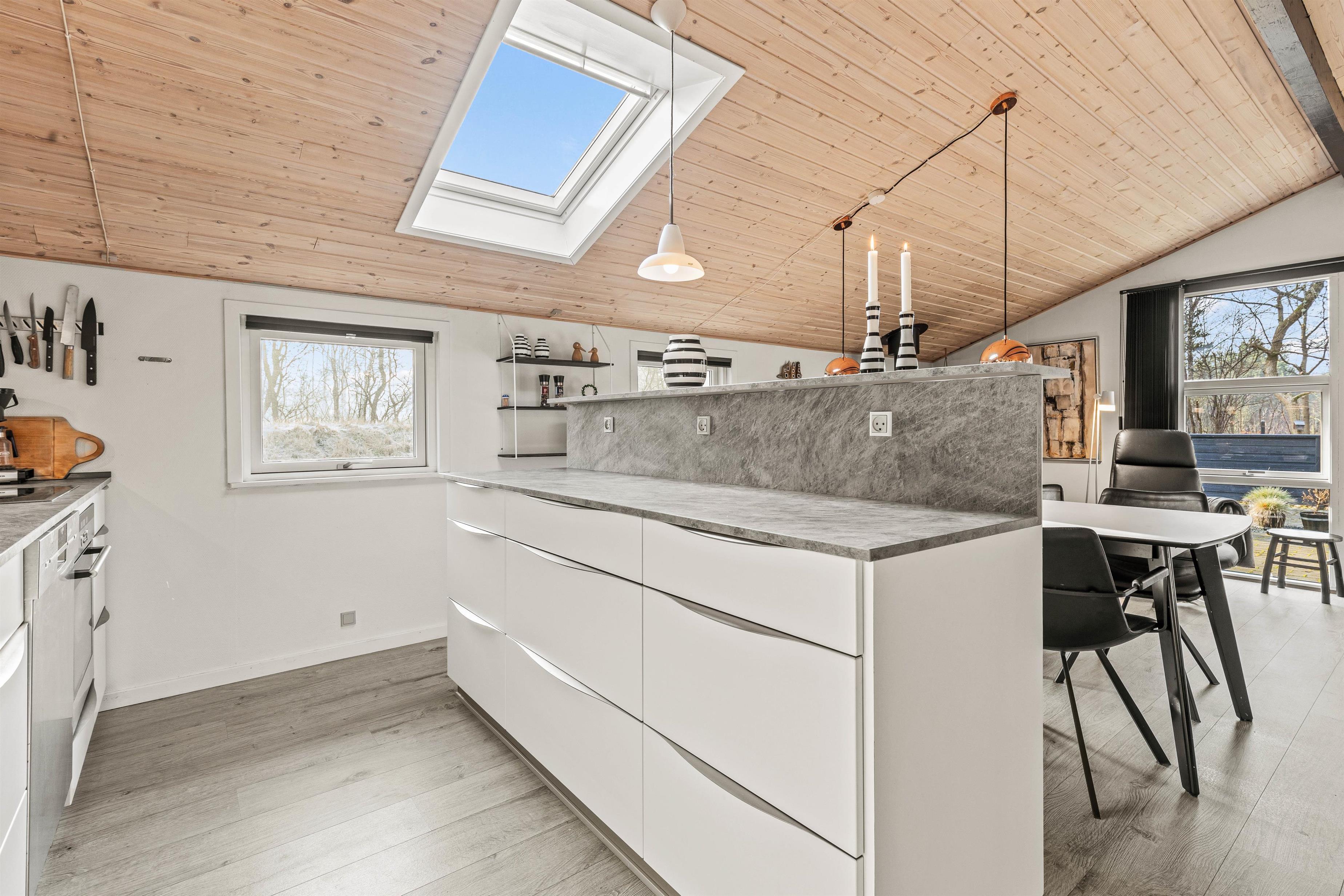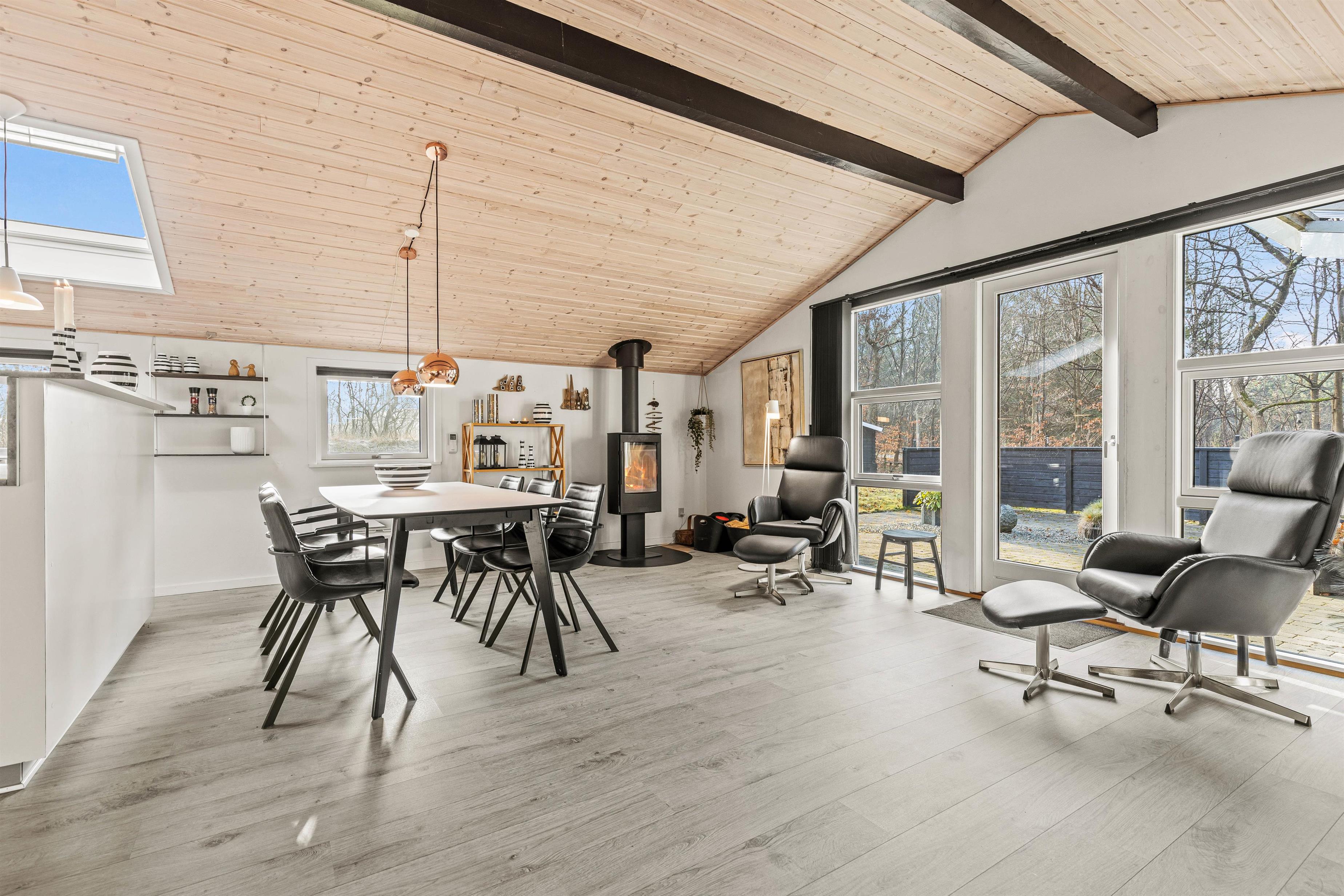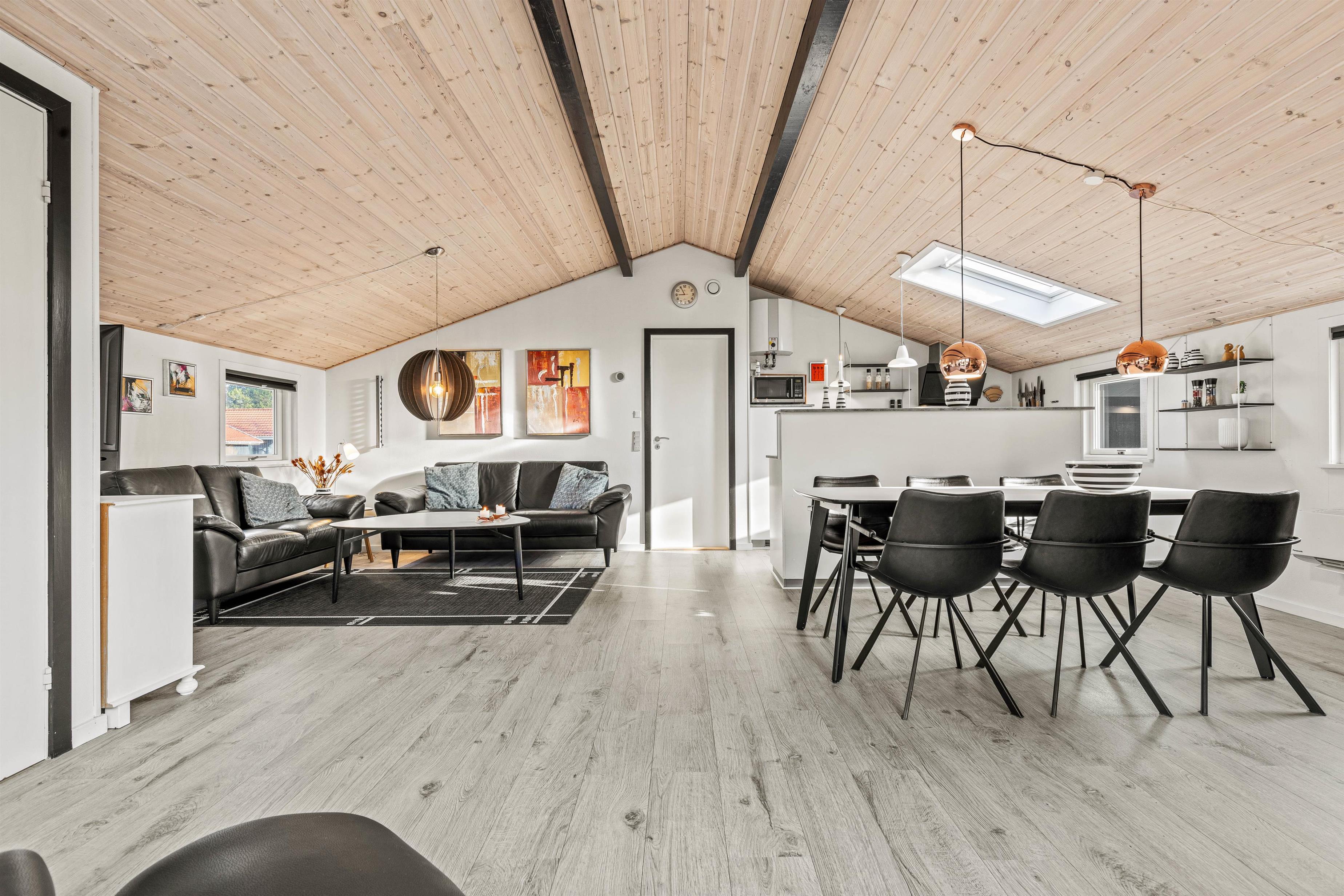 De lyse trælofter kombineret med de hvide vægge gør omgivelserne indbydende og imødekommende, og her er det helt sikkert, at I vil føle jer hjemme fra start af. På de i alt 96 m² er der rigtig god plads til maks 5 personer.