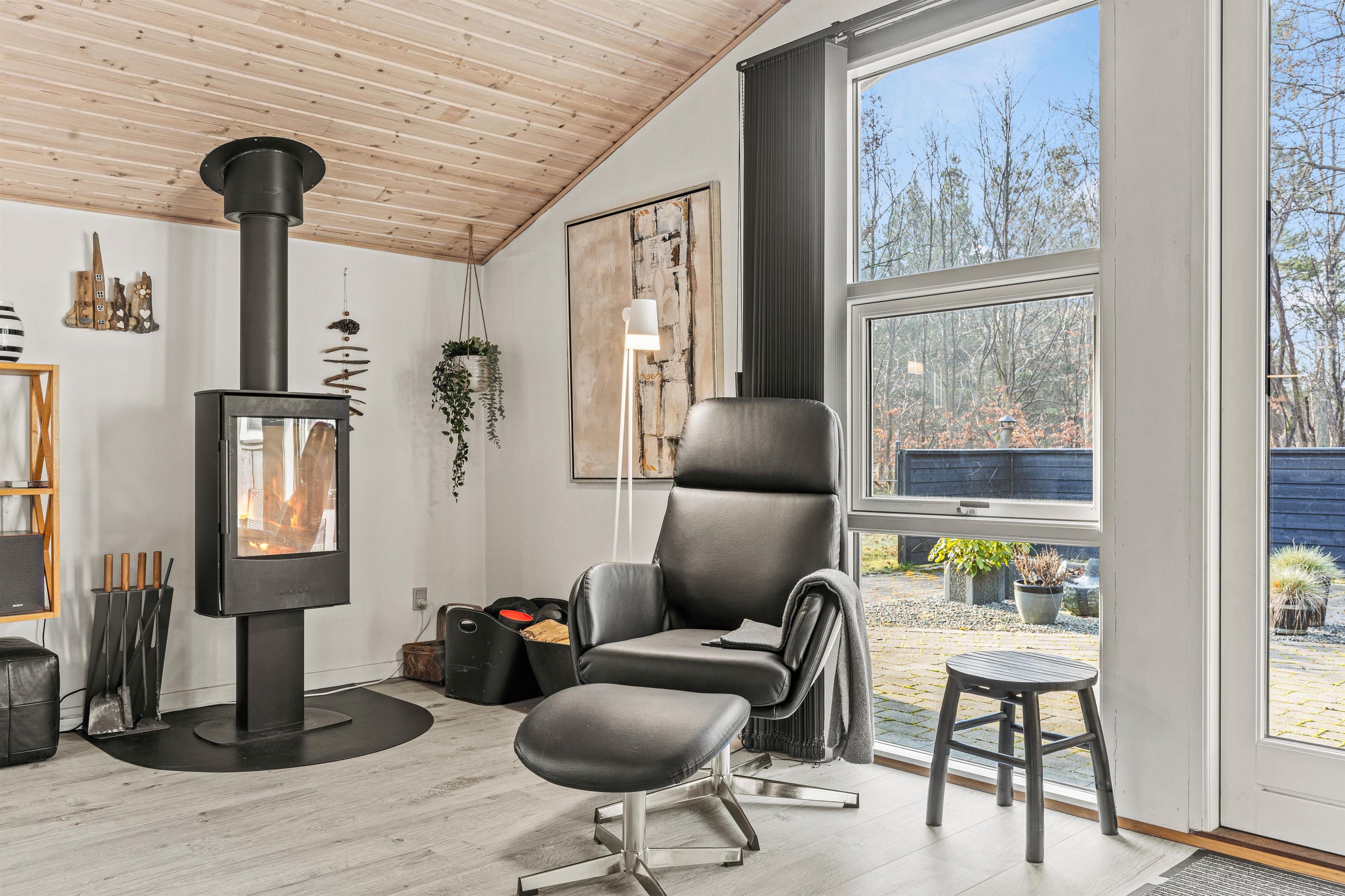Den venlige indretning og de afdæmpede farver komplimenterer hinanden godt, og over alt i huset hersker en afslappende atmosfære. Når det skal være ekstra hyggeligt, kan I tænde op i brændeovnen i det kombinerede køkken- og stuerum og lytte til de knitrende flammer, mens I slapper af på sofaen.