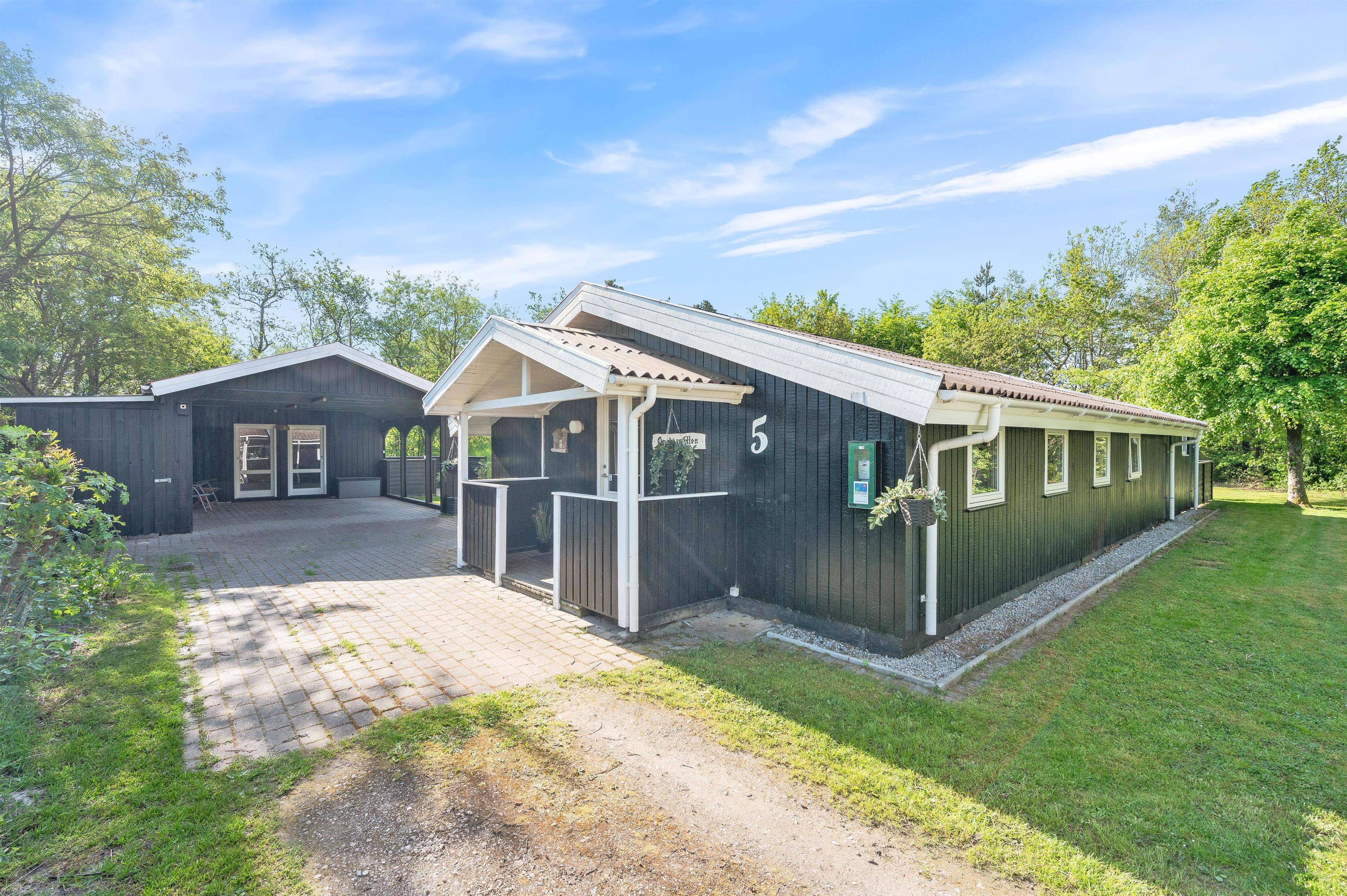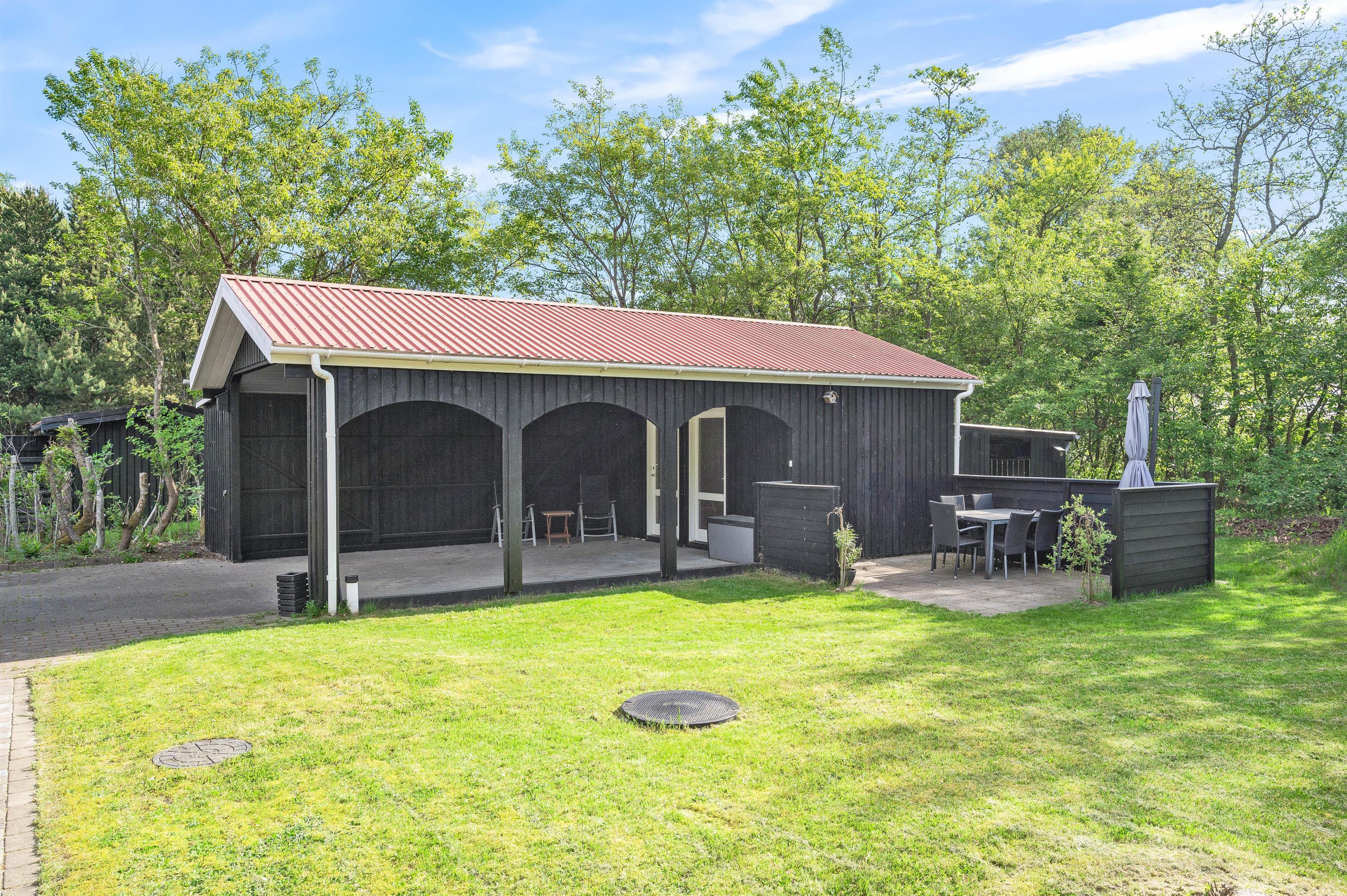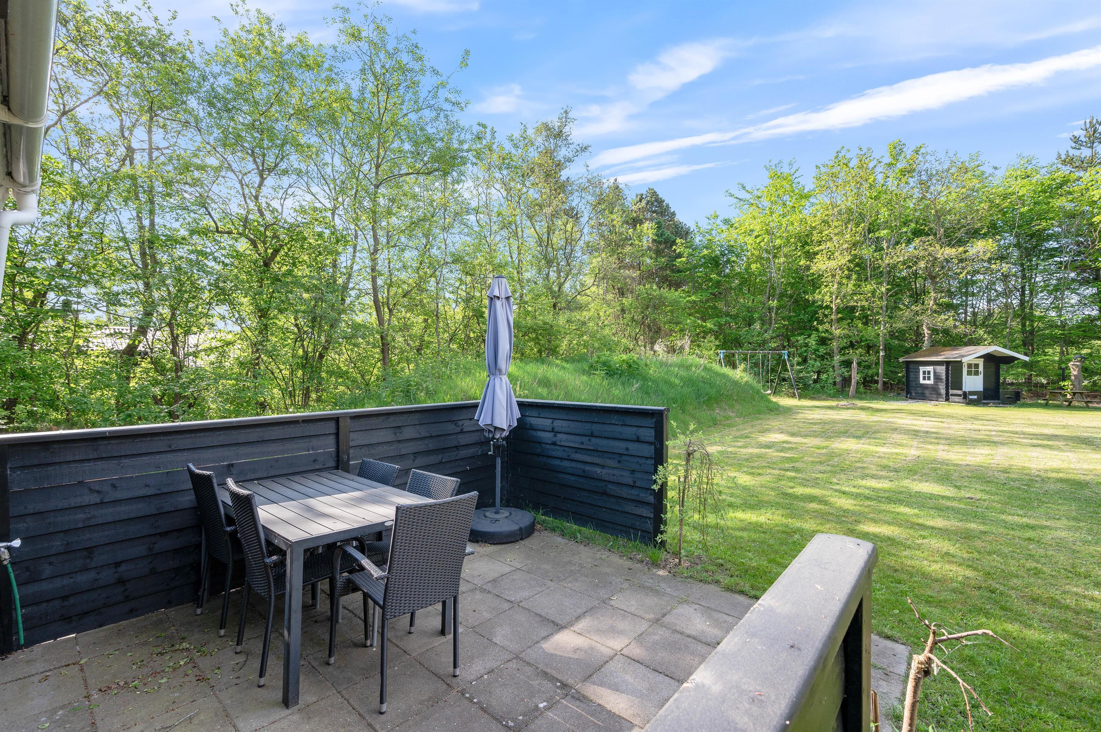 Feriehjemmet er omgivet af en stor græsplæne, som er perfekt til leg og boldspil. Og til de mindste feriegæster er der lavet et lille legehjørne mellem træerne med gyngestativ og legehus, hvor de kan få mange gode timer til at gå.