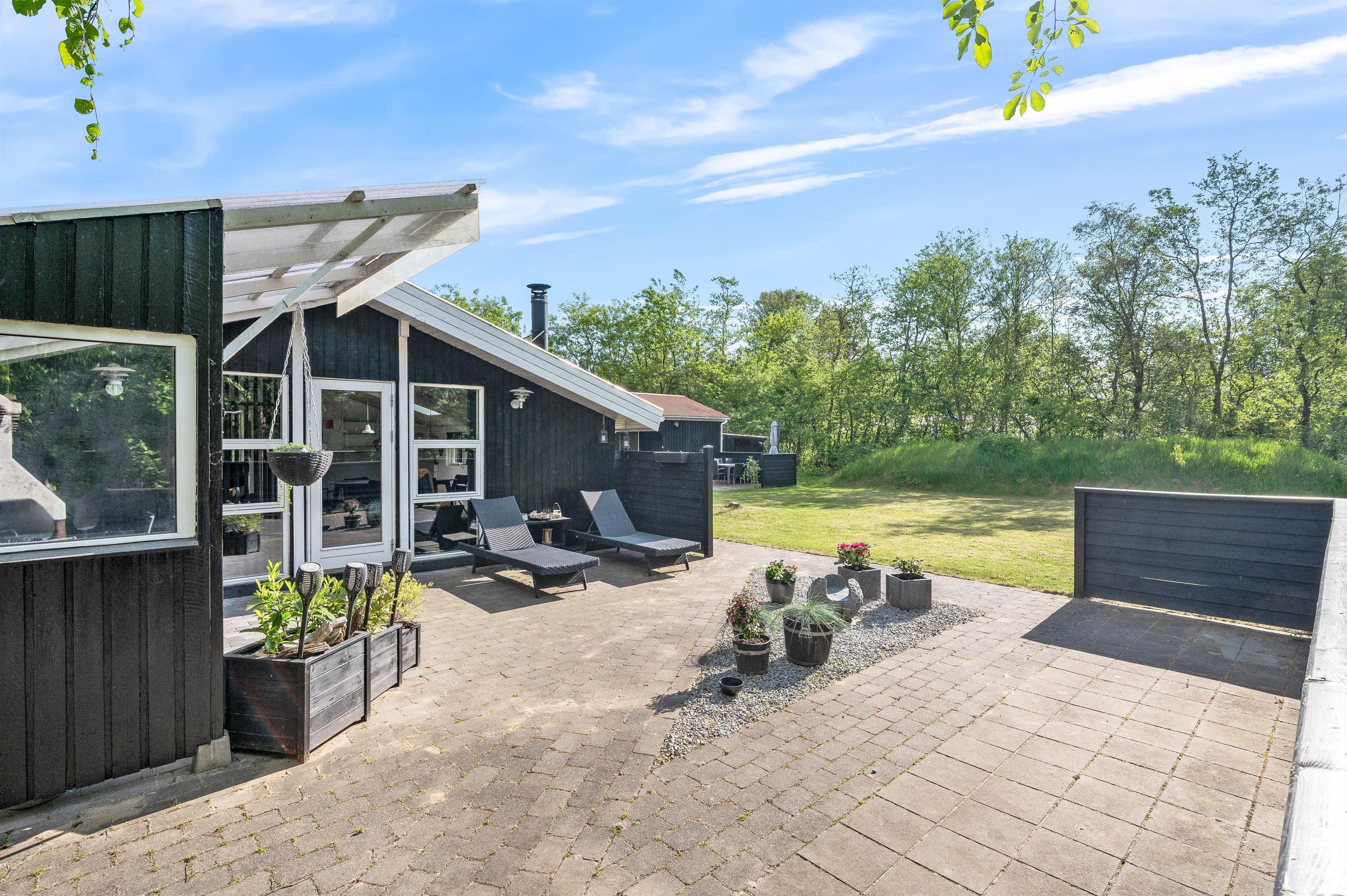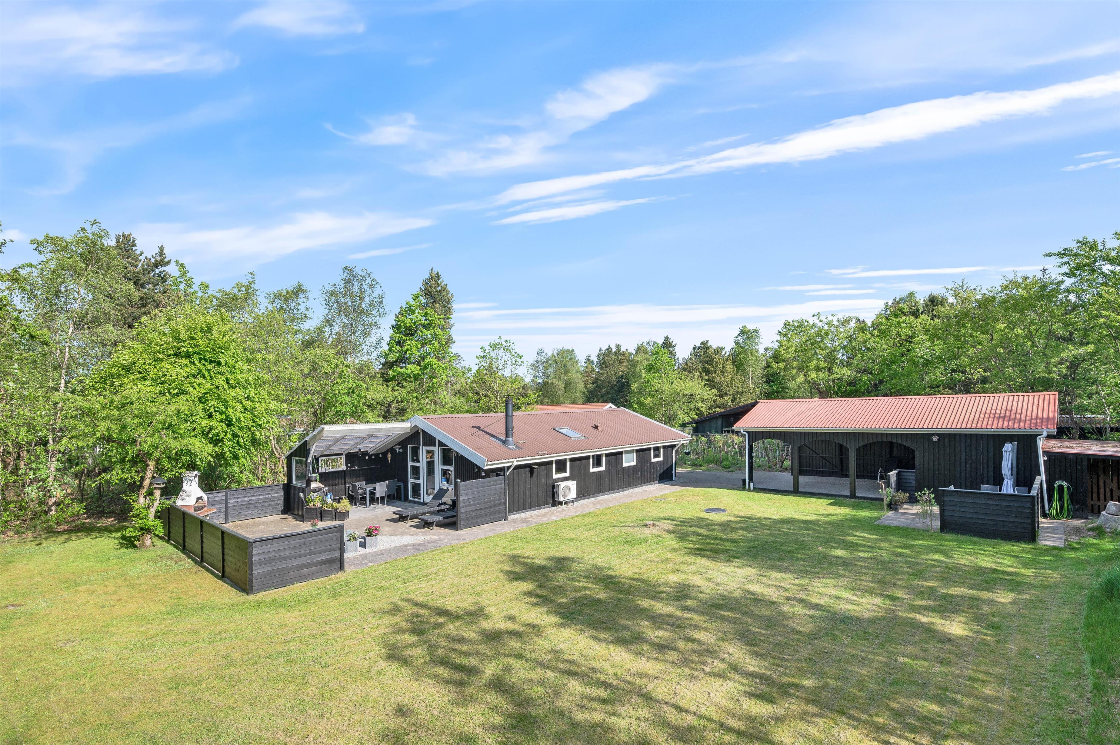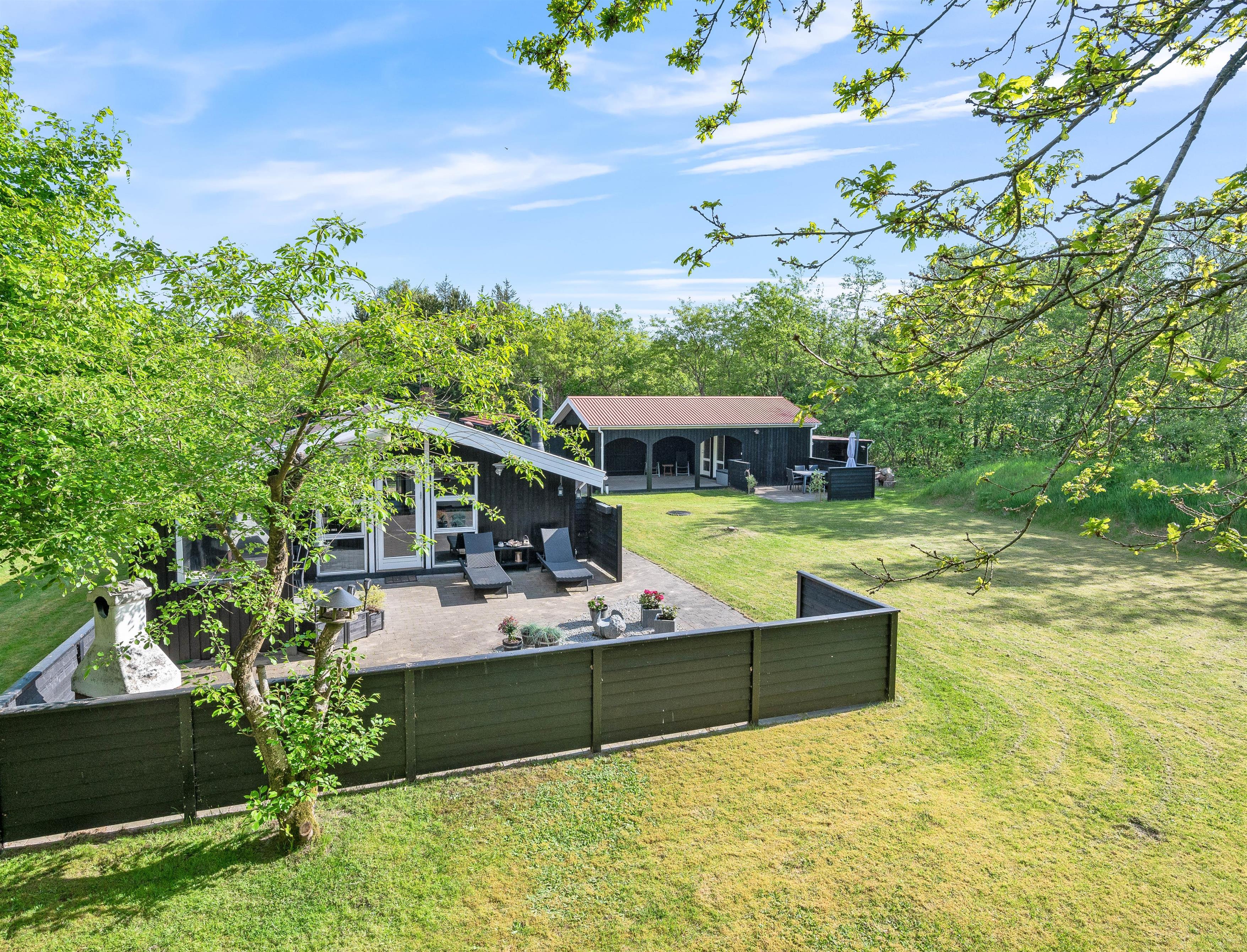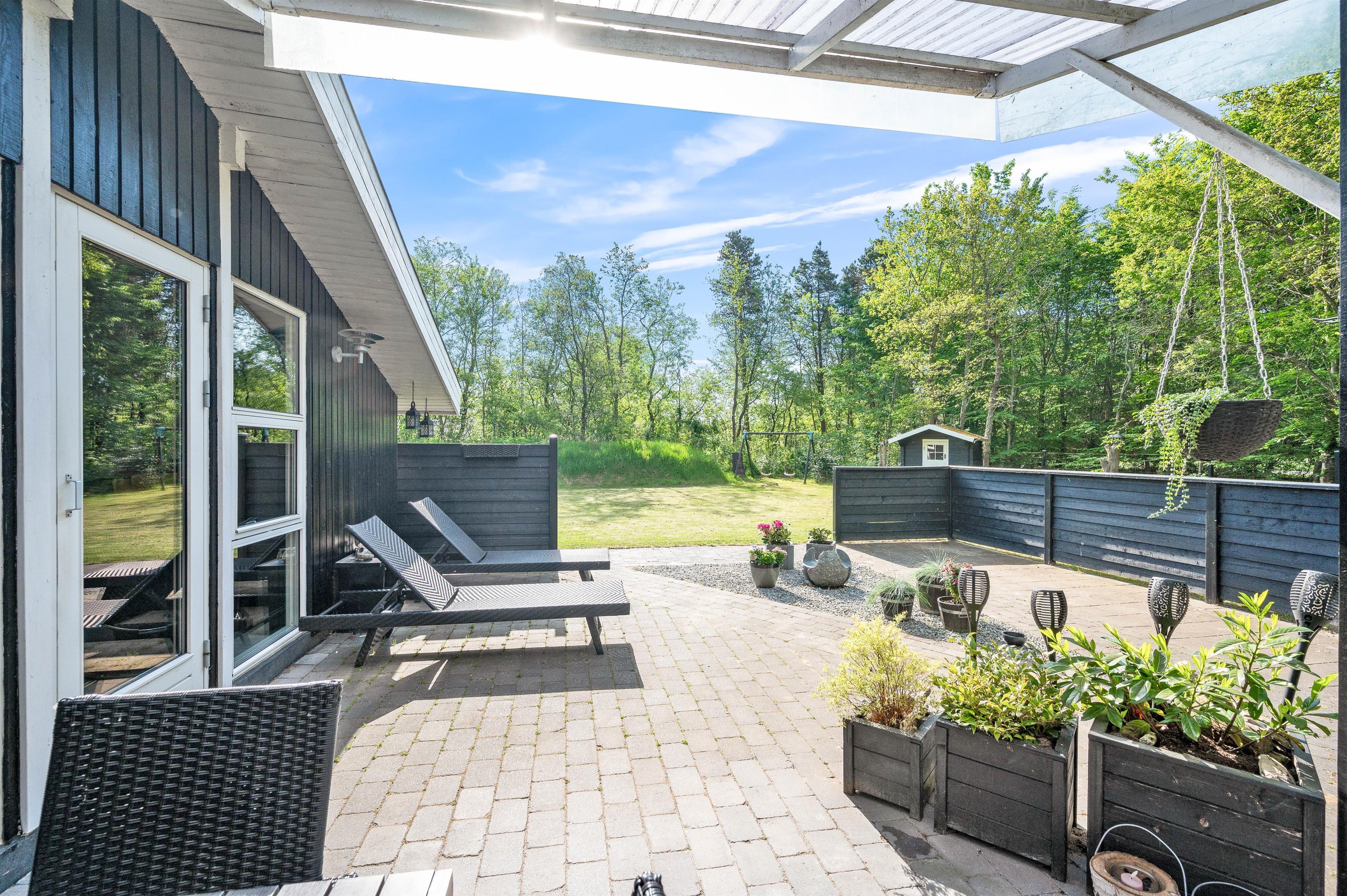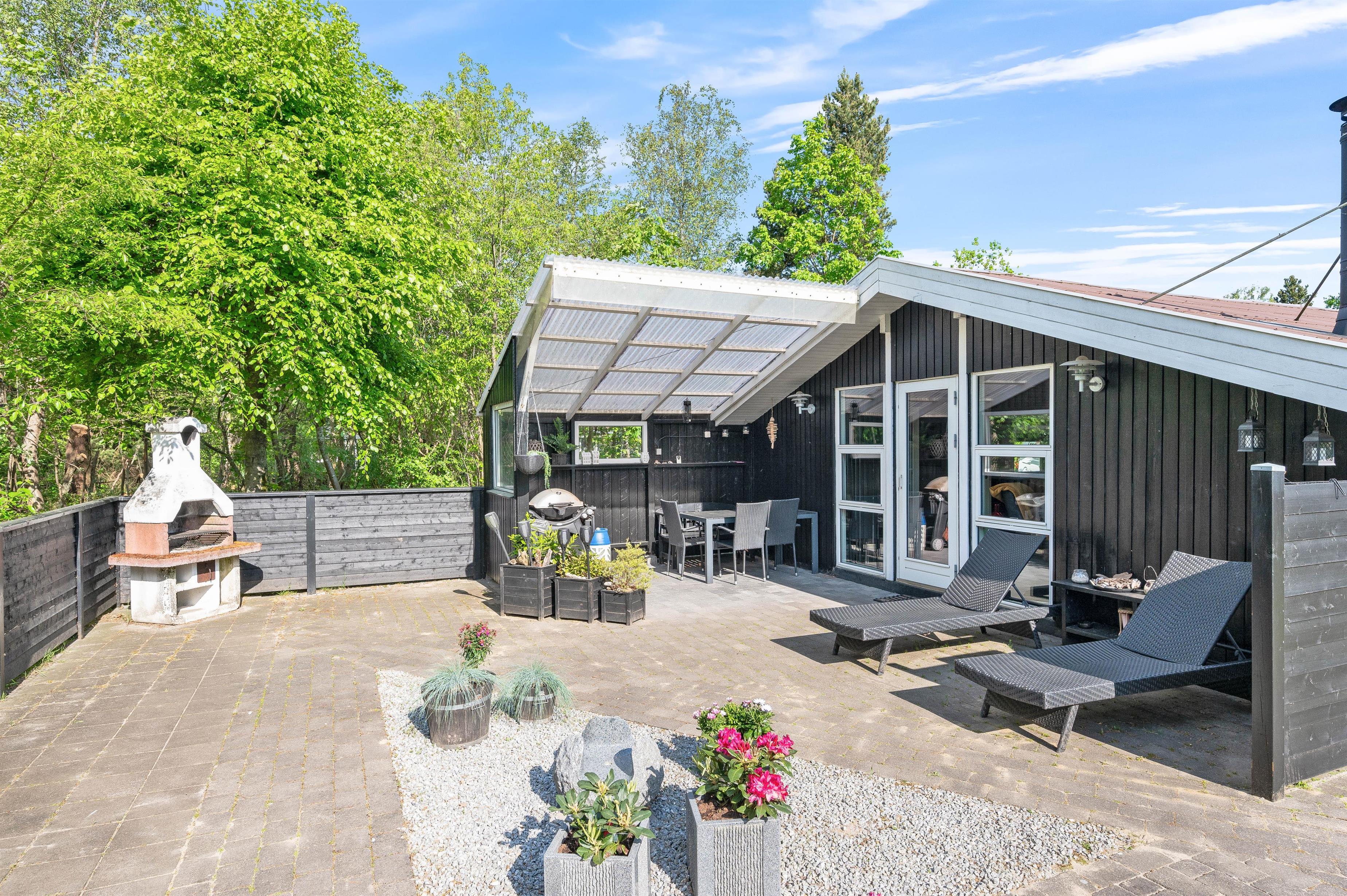 Huset ligger i de smukkeste omgivelser, omkranset af skovens høje træer, som både afskærmer, giver læ og gør beliggenheden helt fredfyldt og ugeneret. Den åbne terrasse er indhegnet, så børnene kan få lov til at lege udenfor, mens I tilbereder aftenens måltid i køkkenet - og på en lun sommeraften står både kul- og gasgrill selvfølgelig klar til jer.