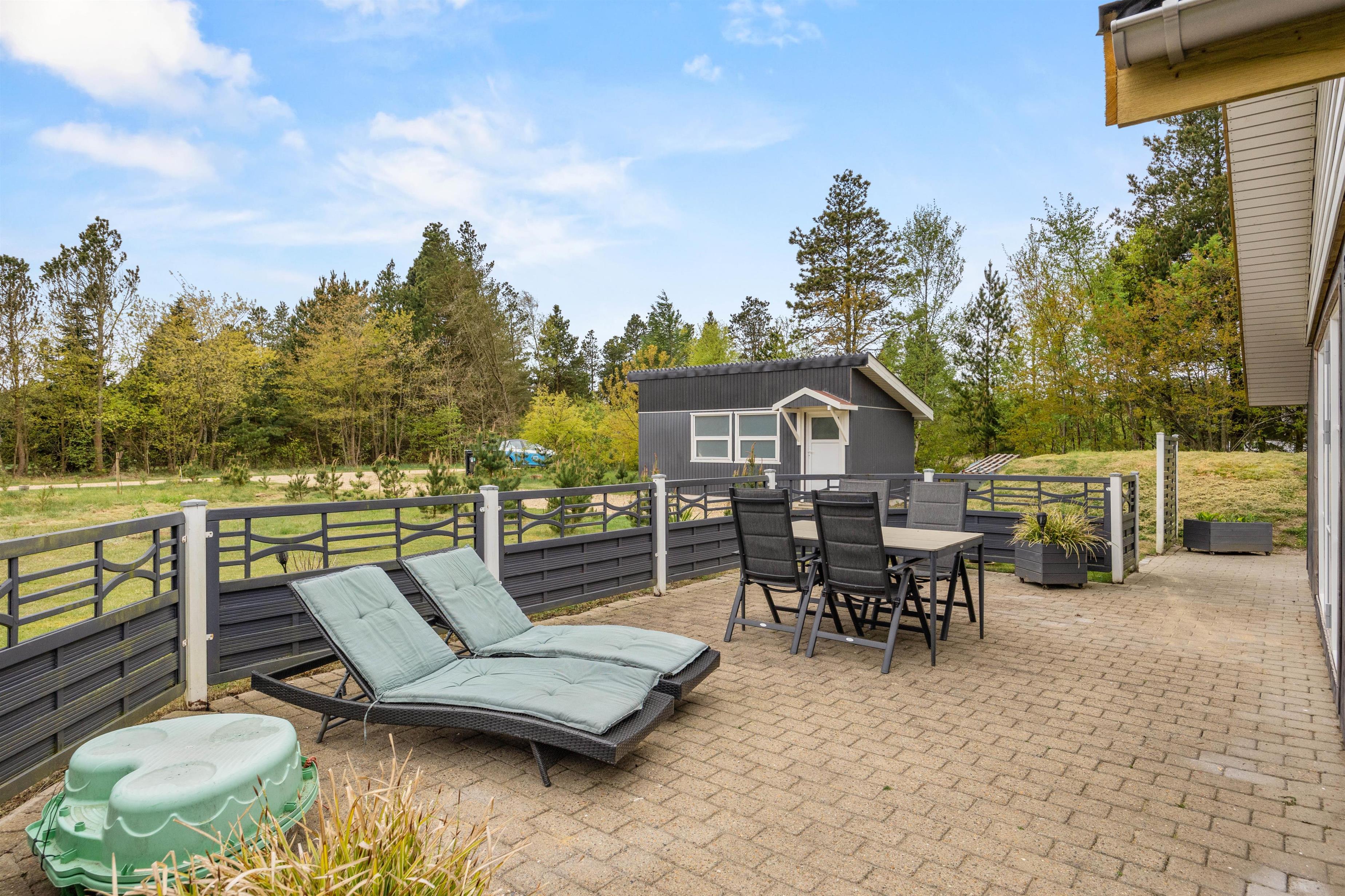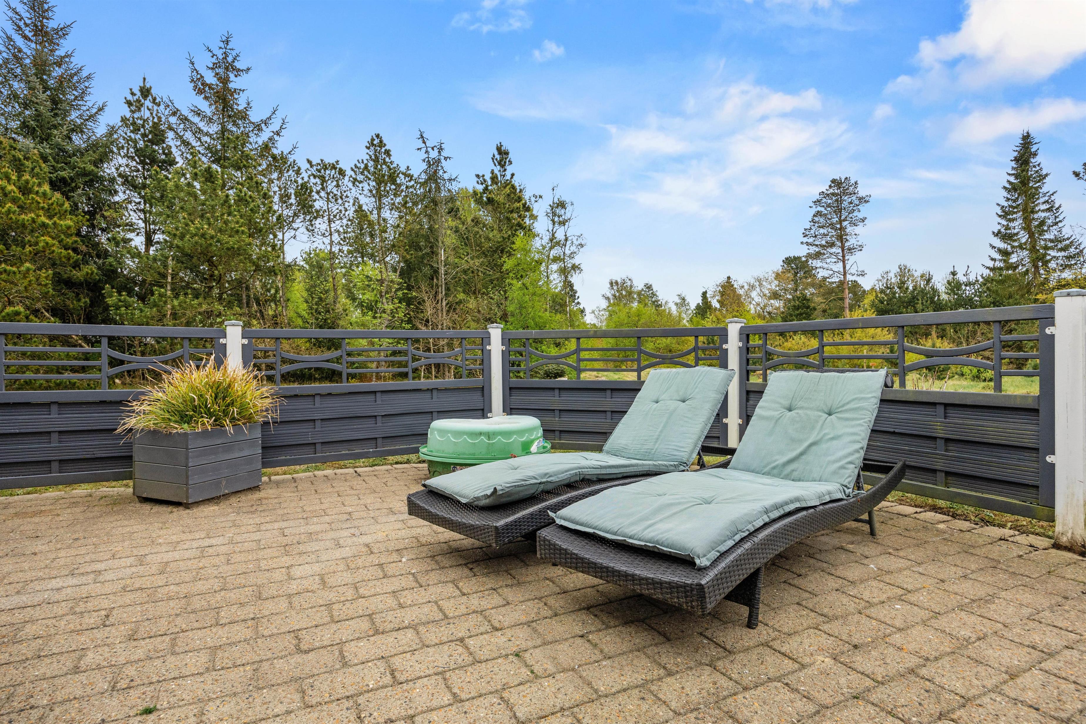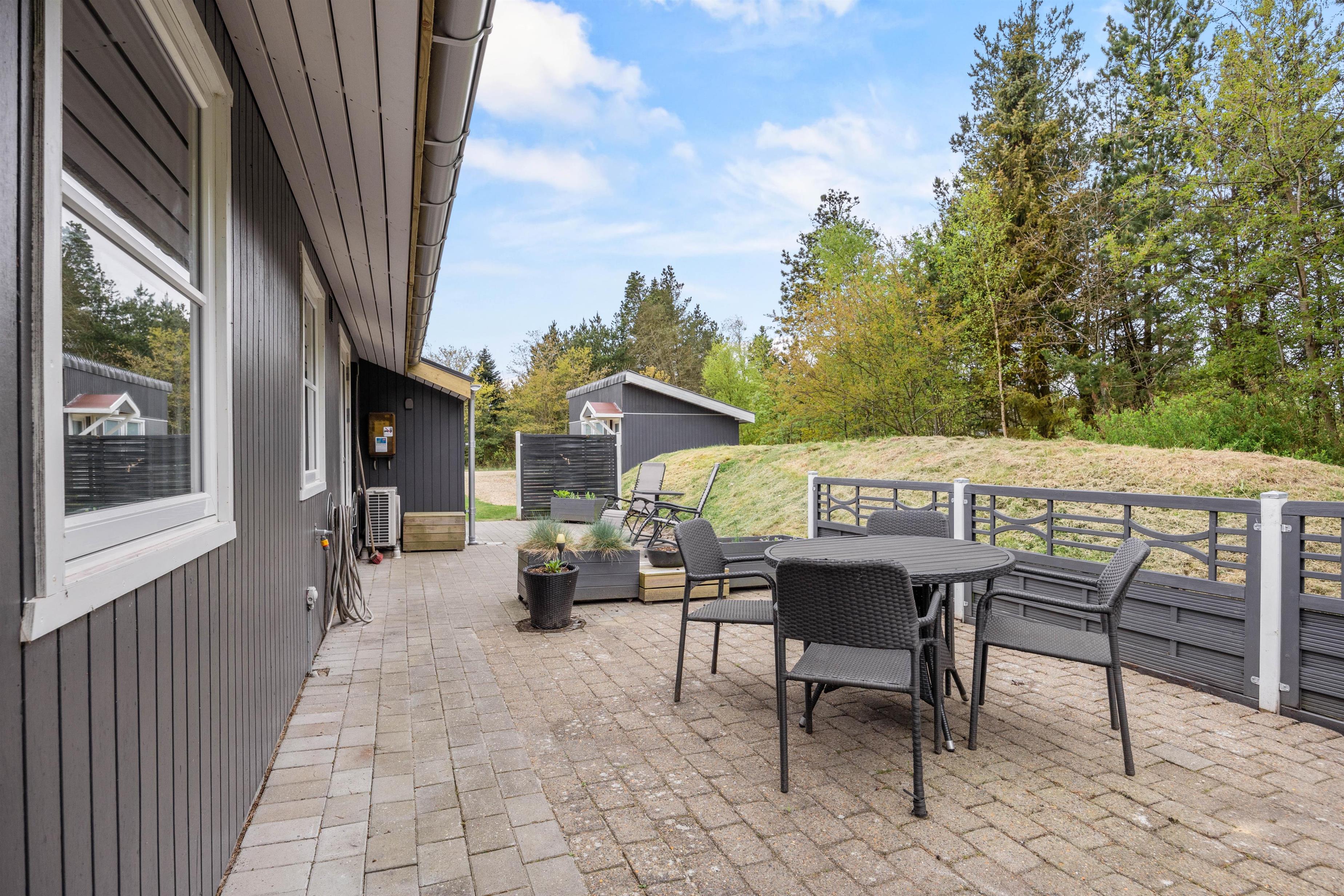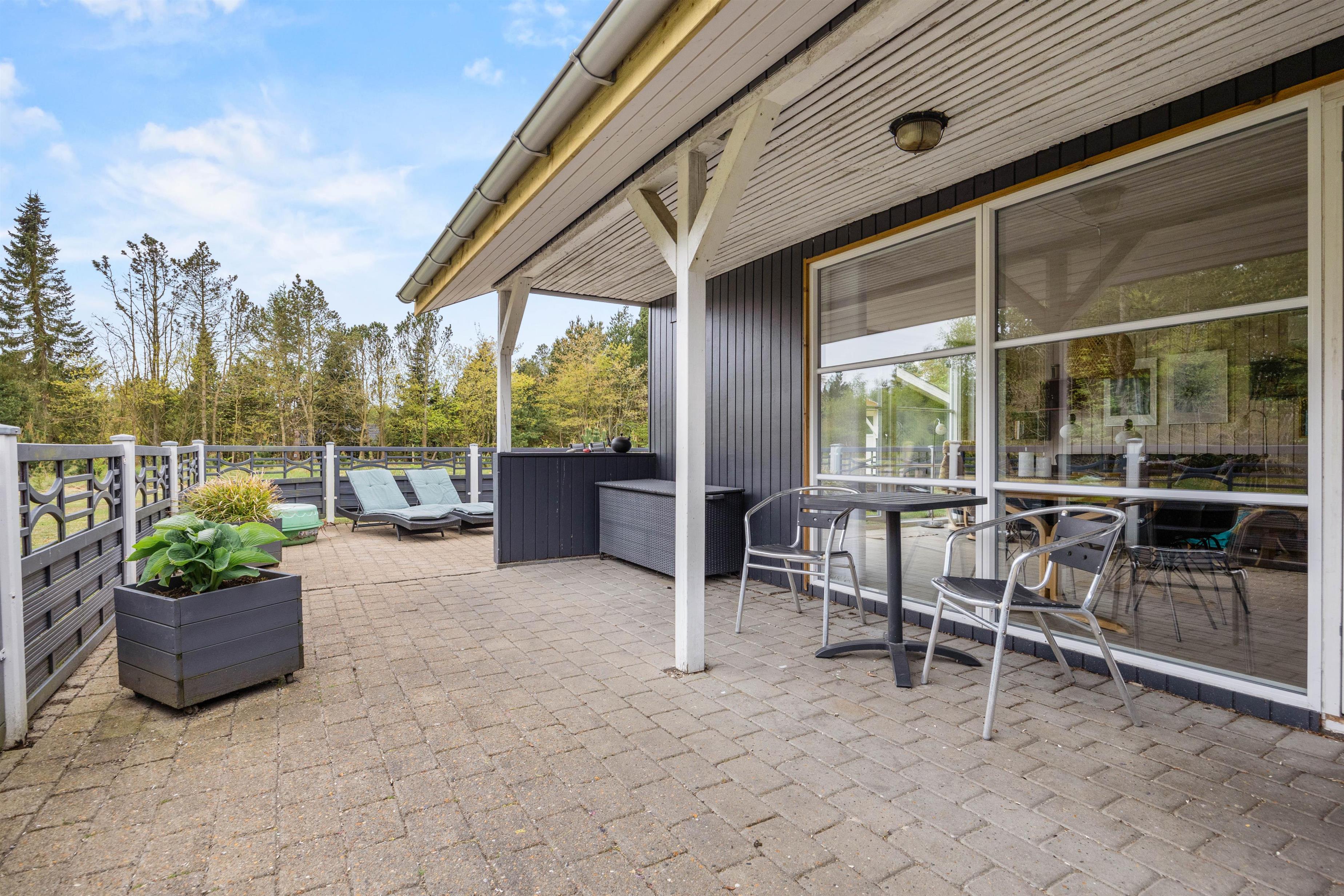 Udendørs venter jer en skøn terrasse, hvor der står havemøbler og liggestole klar til jer. Her kan I sætte jer godt til rette og slappe af på en optimal plads i solen. Den overdækkede terrasse giver også mulighed for at nyde udelivet uanset vejret. På de lune ferieaftener kan I samles på terrassen for at tilberede aftenens middag på sommerhusets grill.