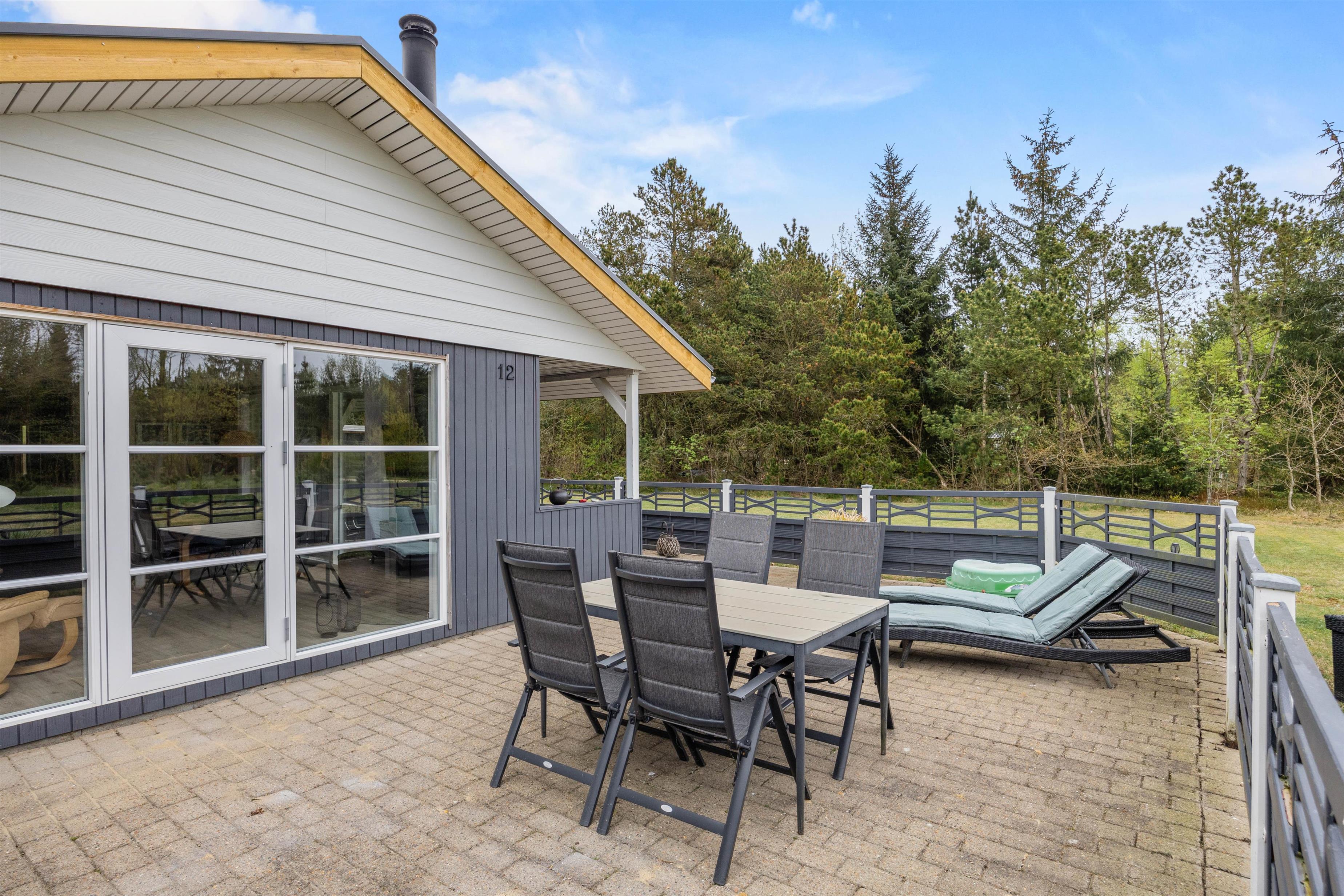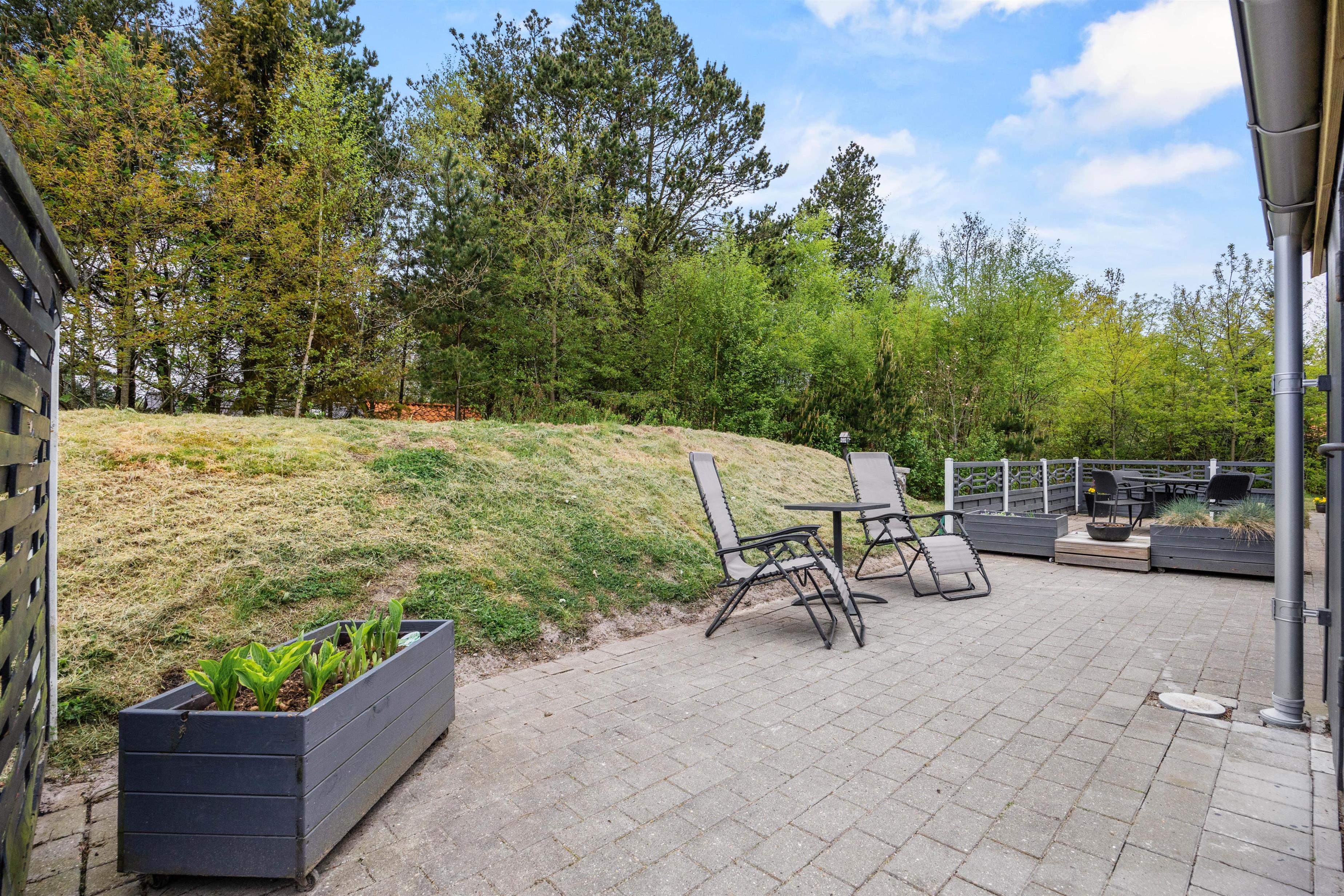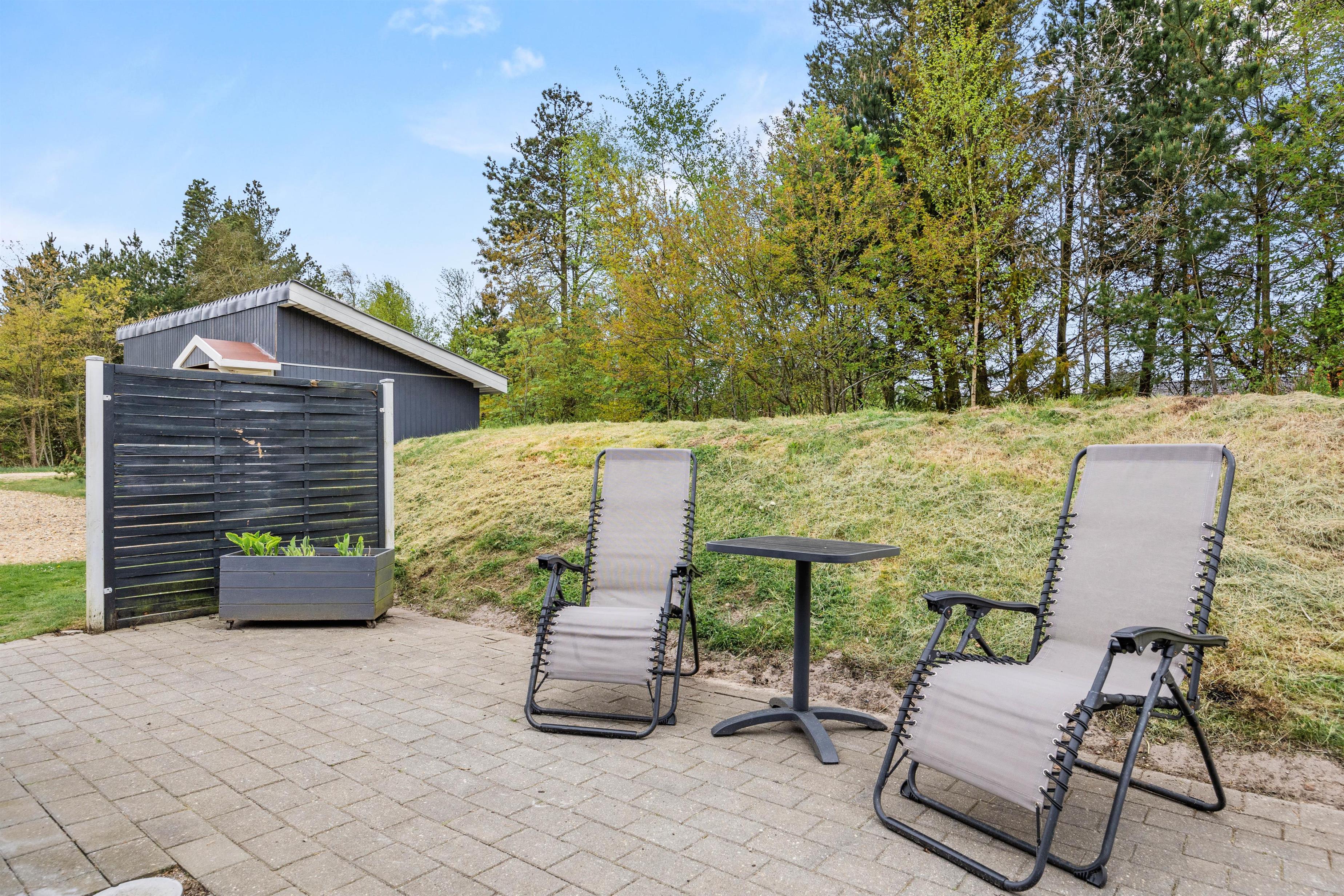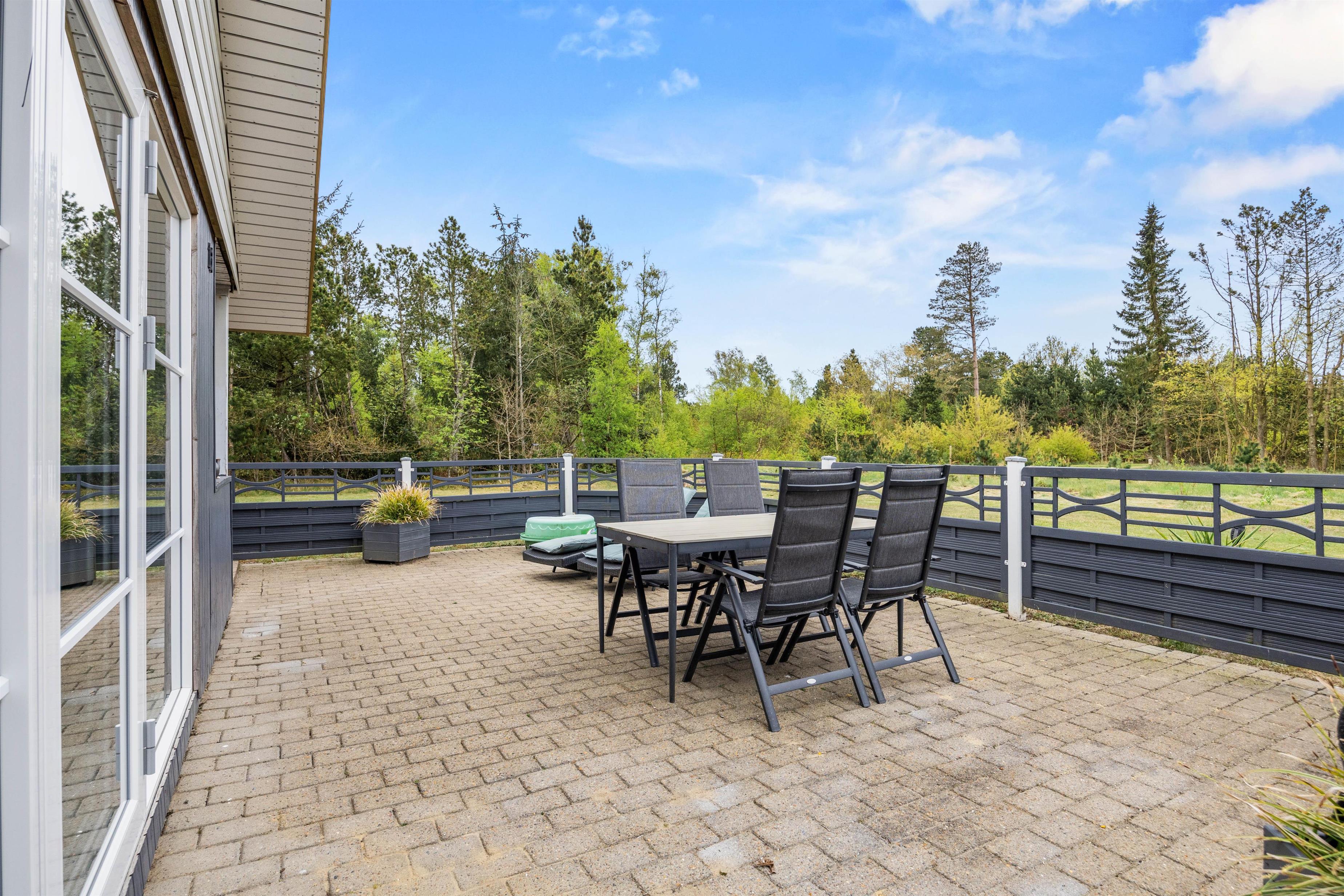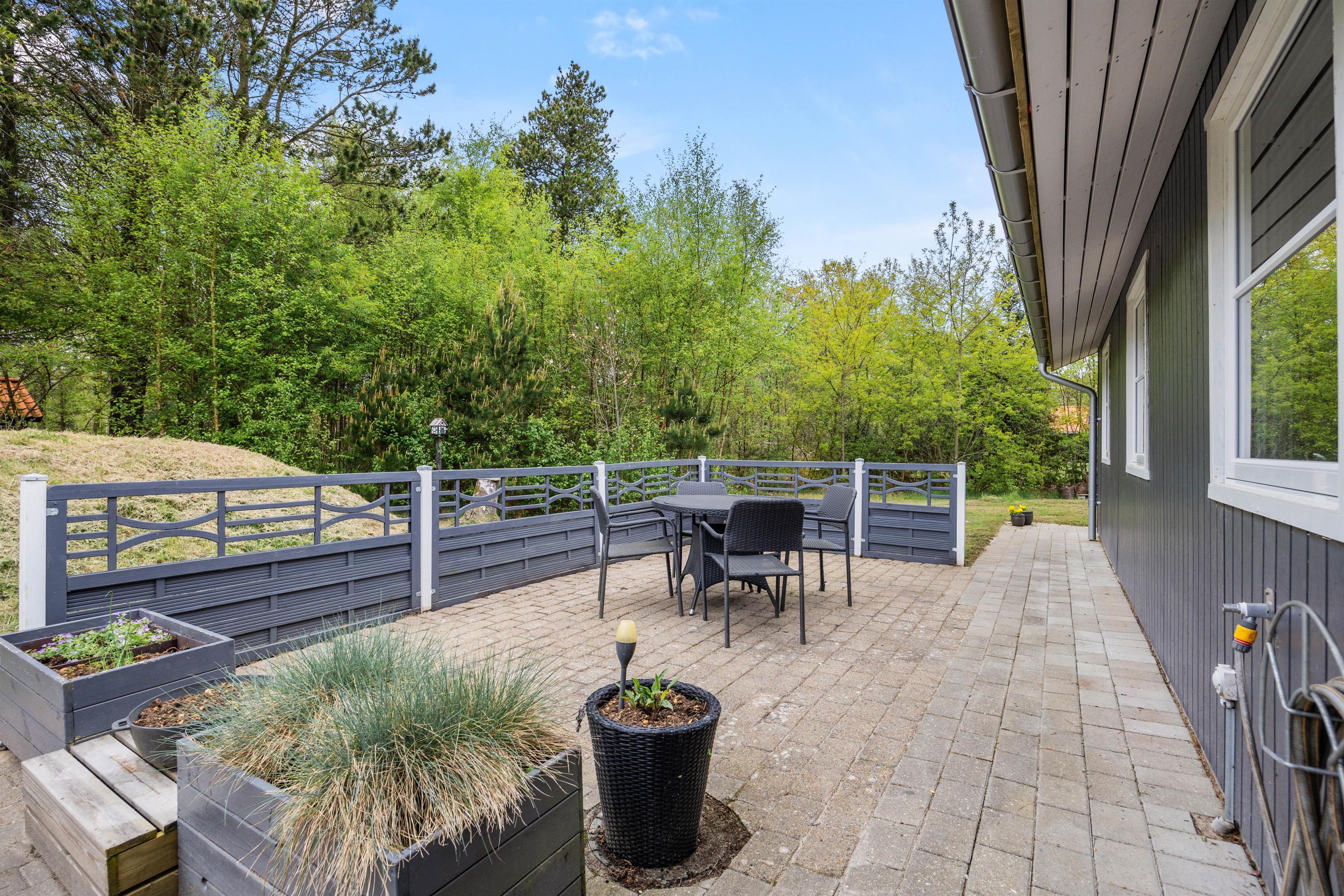 Udendørs venter jer en skøn terrasse, hvor der står havemøbler og liggestole klar til jer. Her kan I sætte jer godt til rette og slappe af på en optimal plads i solen. Den overdækkede terrasse giver også mulighed for at nyde udelivet uanset vejret. På de lune ferieaftener kan I samles på terrassen for at tilberede aftenens middag på sommerhusets grill.