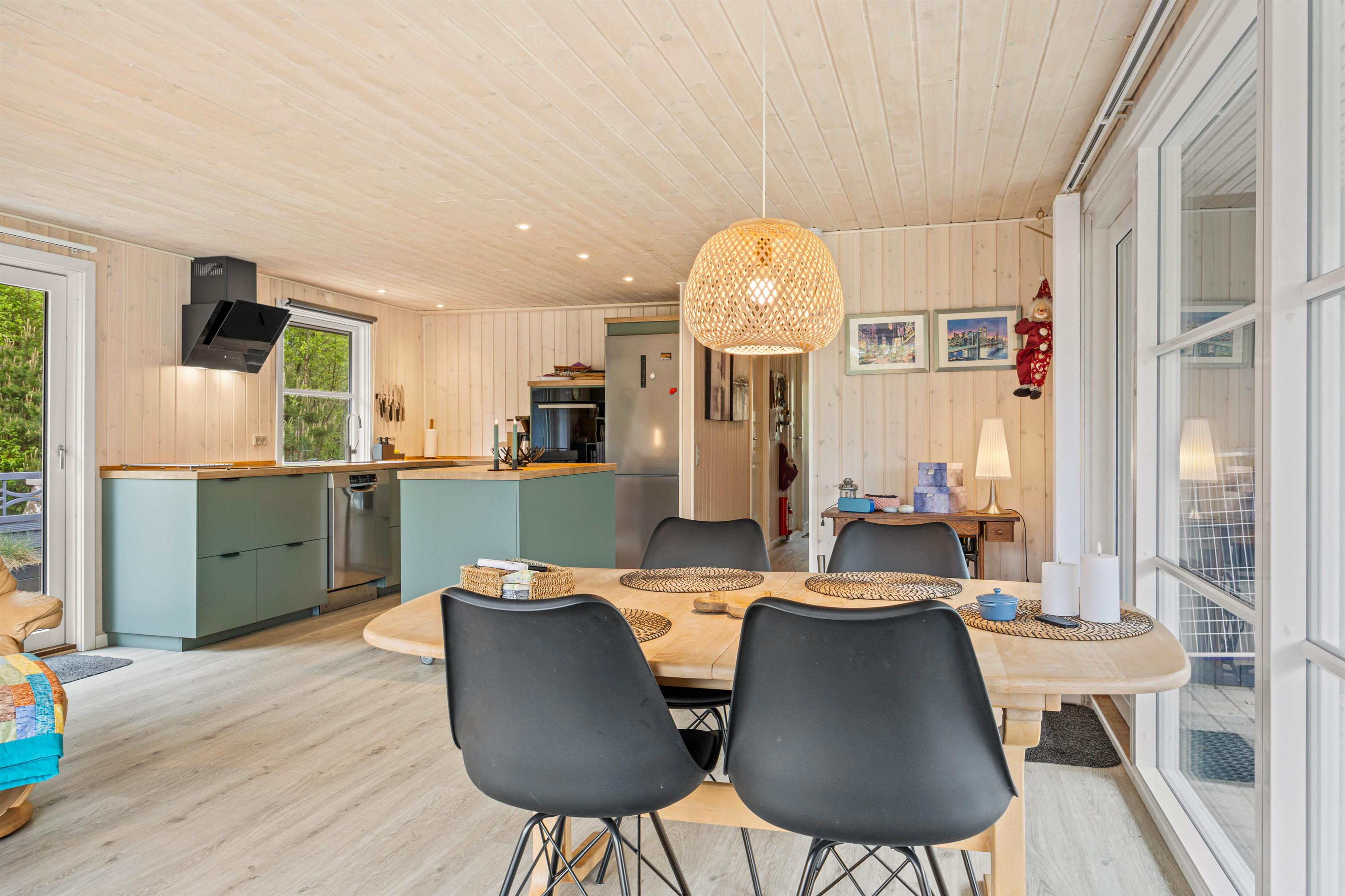 Sommerhuset på Anders Lyhnesvej 12 i Houstrup byder inden for med sin hyggelige indretning, og der kommer ikke til at gå lang tid fra jeres ankomst, til at I føler jer hjemme her! Sommerhusets hjerte er alrummet, der forener køkken, stue og spisestue. Køkkenet er blevet renoveret i 2025, så står top tunet med alt der er nødvendigt til et lækkert måltid. I kommer helt sikkert til at tilbringe en stor del af jeres ferie her, hvor I kan samles til madlavning, film og spil, mens brændeovnen knitrer i baggrunden og fuldender feriestemningen.