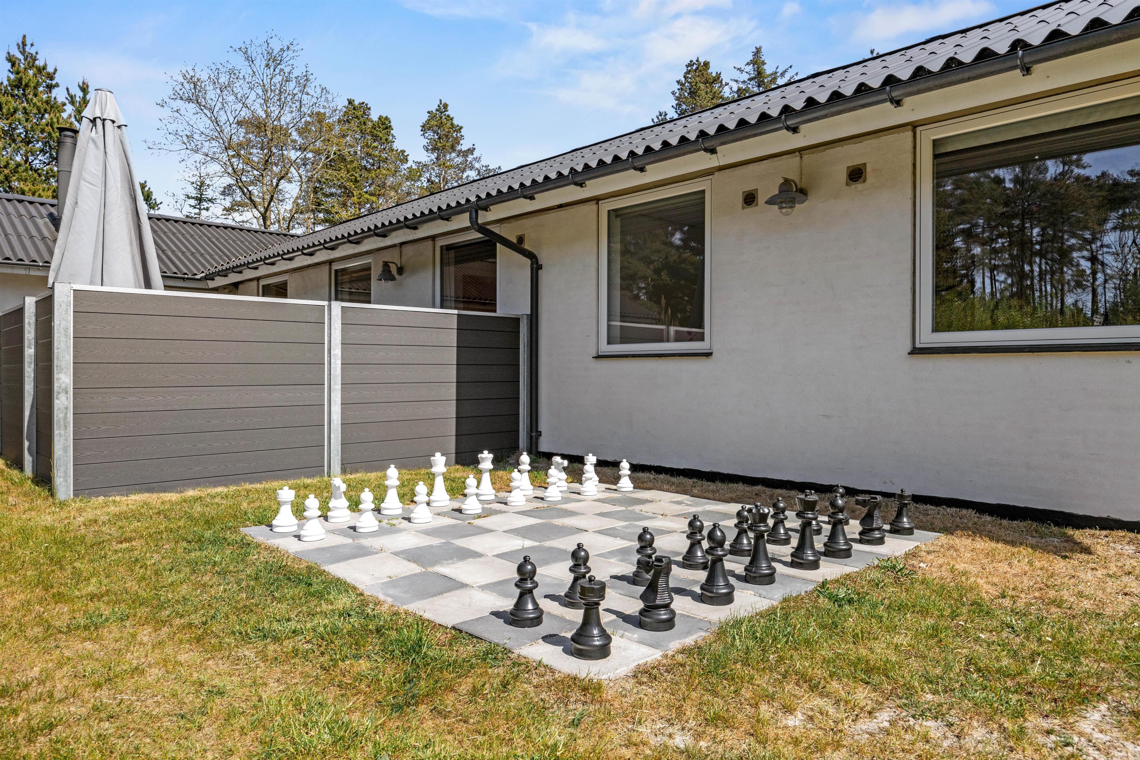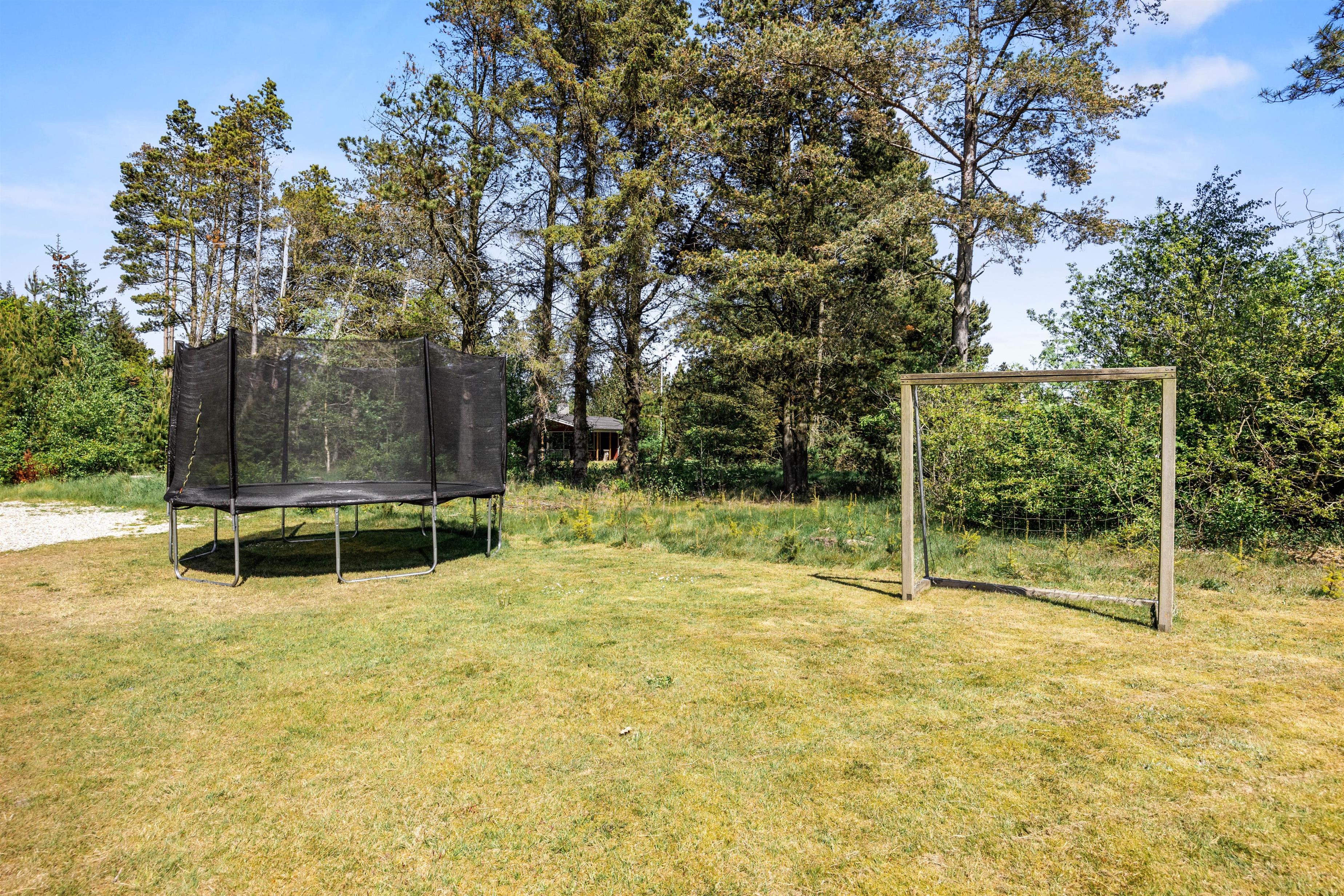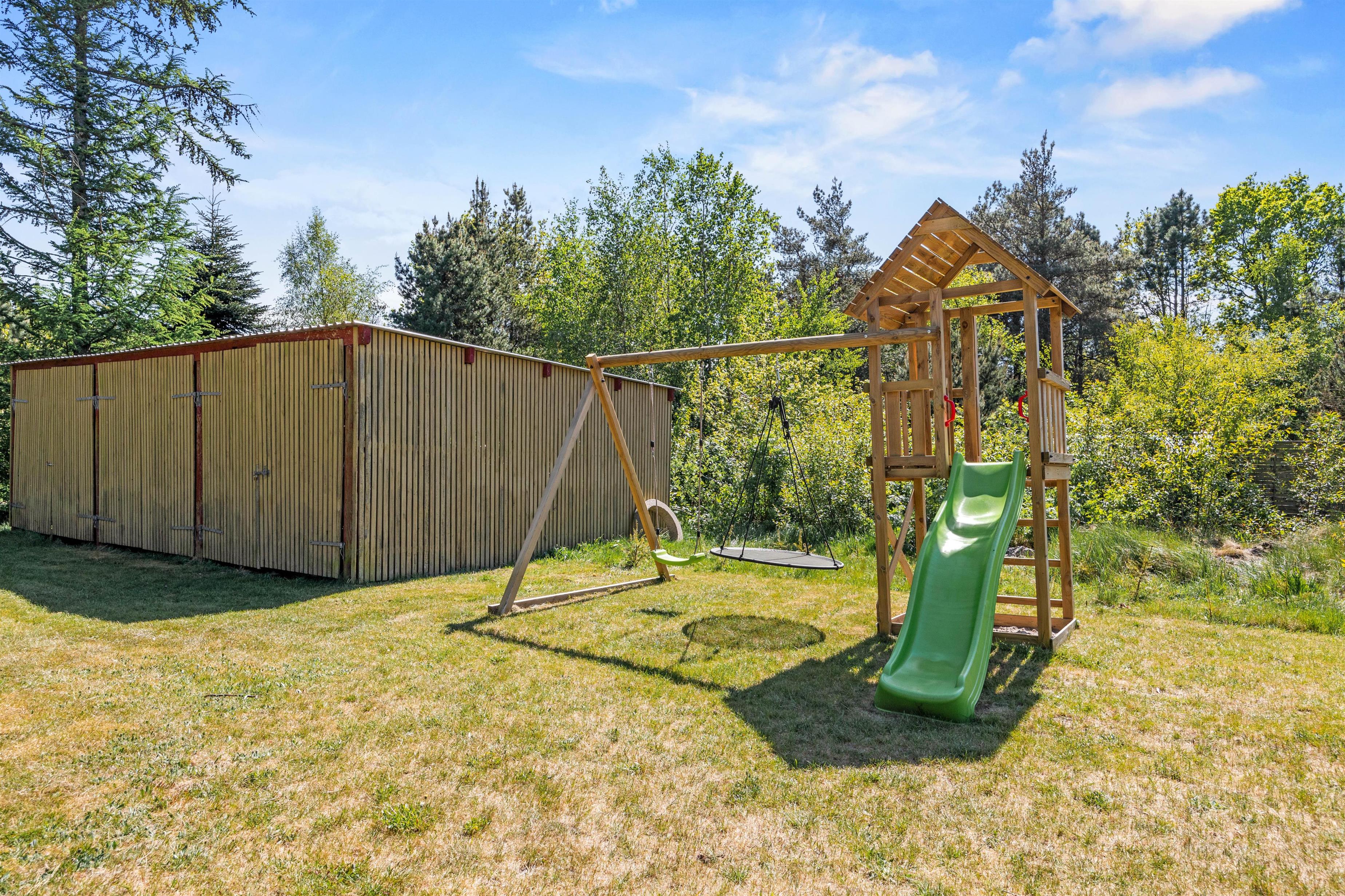 Sommerhusets enorme grund på 2321 kvadratmeter giver plads til leg og afslapning. Her kan børnene more sig i haven med gyngen, legestativet og trampolinen, mens de voksne nyder en god bog eller podcast på den overdækkede terrasse. Her er havemøbler og en grill til rådighed og der er lagt op til hyggelige grillaftener. Med en beliggenhed kun 2000 meter fra havet, er det muligt at bruge jeres feriedage på de skønne strande i nærheden.